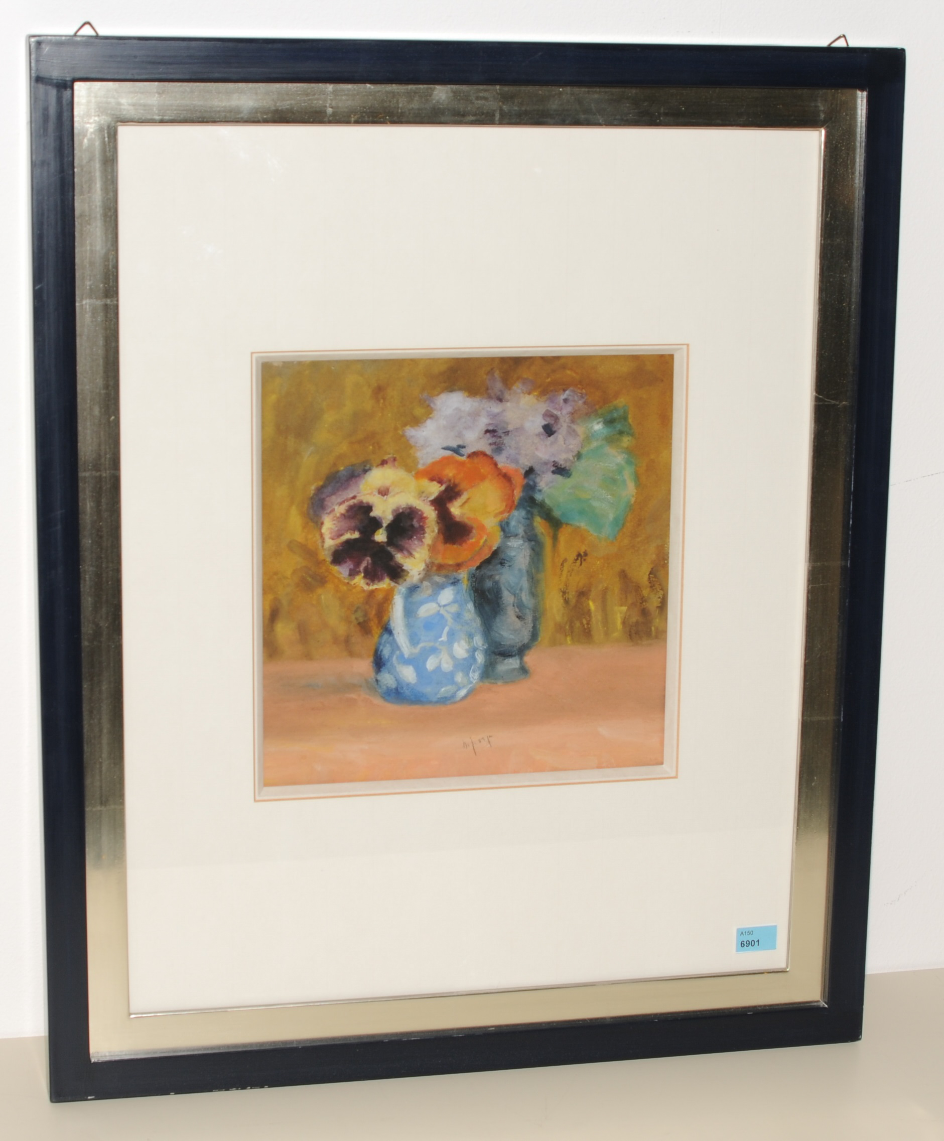 Zwei Blumenvasen mit Veilchen. Gouache auf Papier. Unten mittig unleserlich signiert. Blattgrösse 24,3x23,6 cm. Gerahmt.