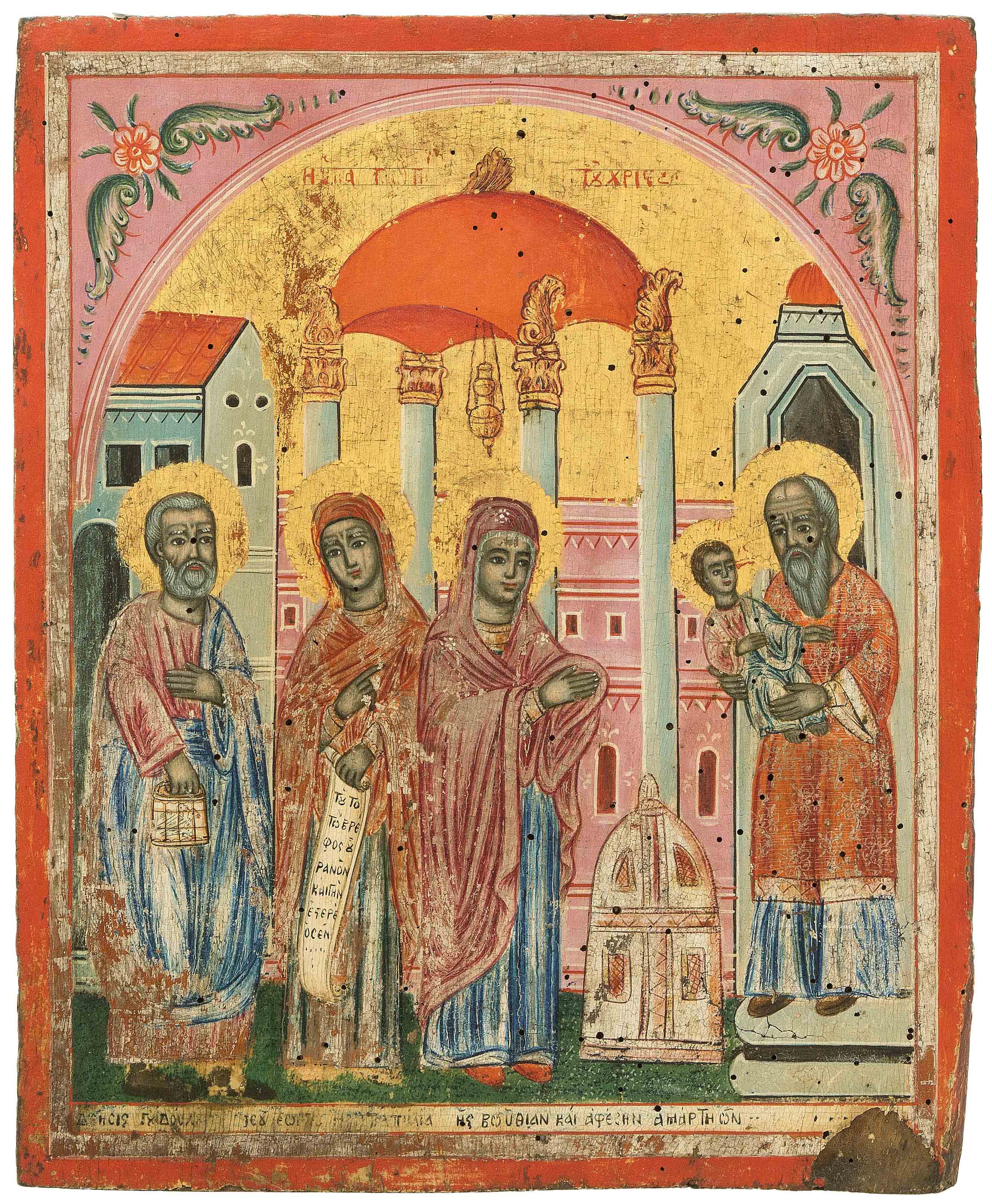 Griechisch, 19.Jh. Tempera über Kreidegrund auf Holz. Unter Arkade auf Goldgrund Darstellung der Gottesmutter, die Simeon ihren Sohn übergeben hat. Ihr folgen die Prophetin Anna sowie der Hl. Joseph mit 2 Opfertauben in einem Käfig. Im Hintergrund Architekturkulisse. In den oberen Zwickeln Blütenmotive. 37x30,5 cm.