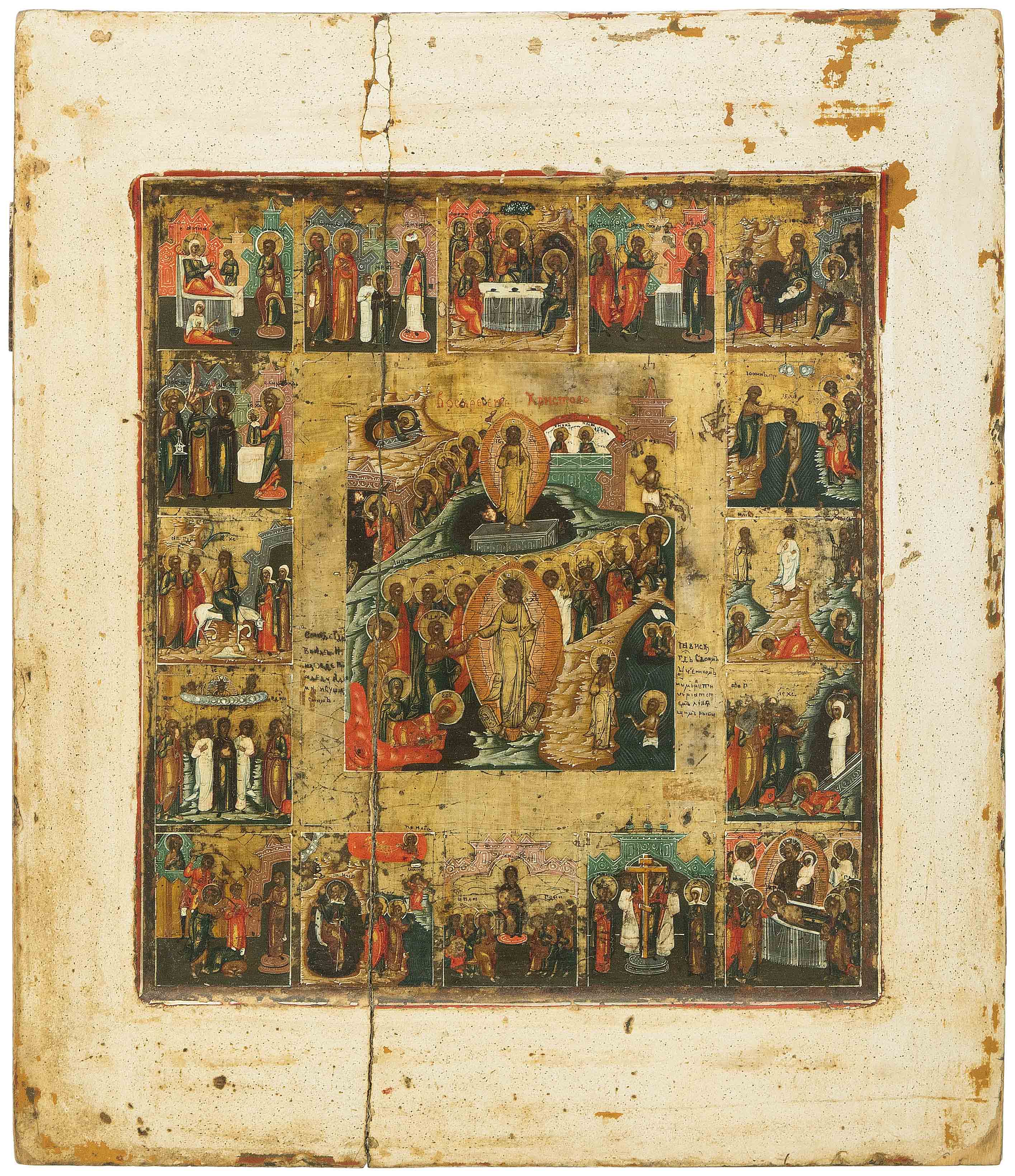 Russisch, um 1800. Tempera über Kreidegrund auf Holz. Im vertieften Mittelfeld Darstellungen auf Goldgrund. Im Zentrum Höllenfahrt und Auferstehung Christi, umgeben von 16 Festtagsszenen. 36x30,5 cm.