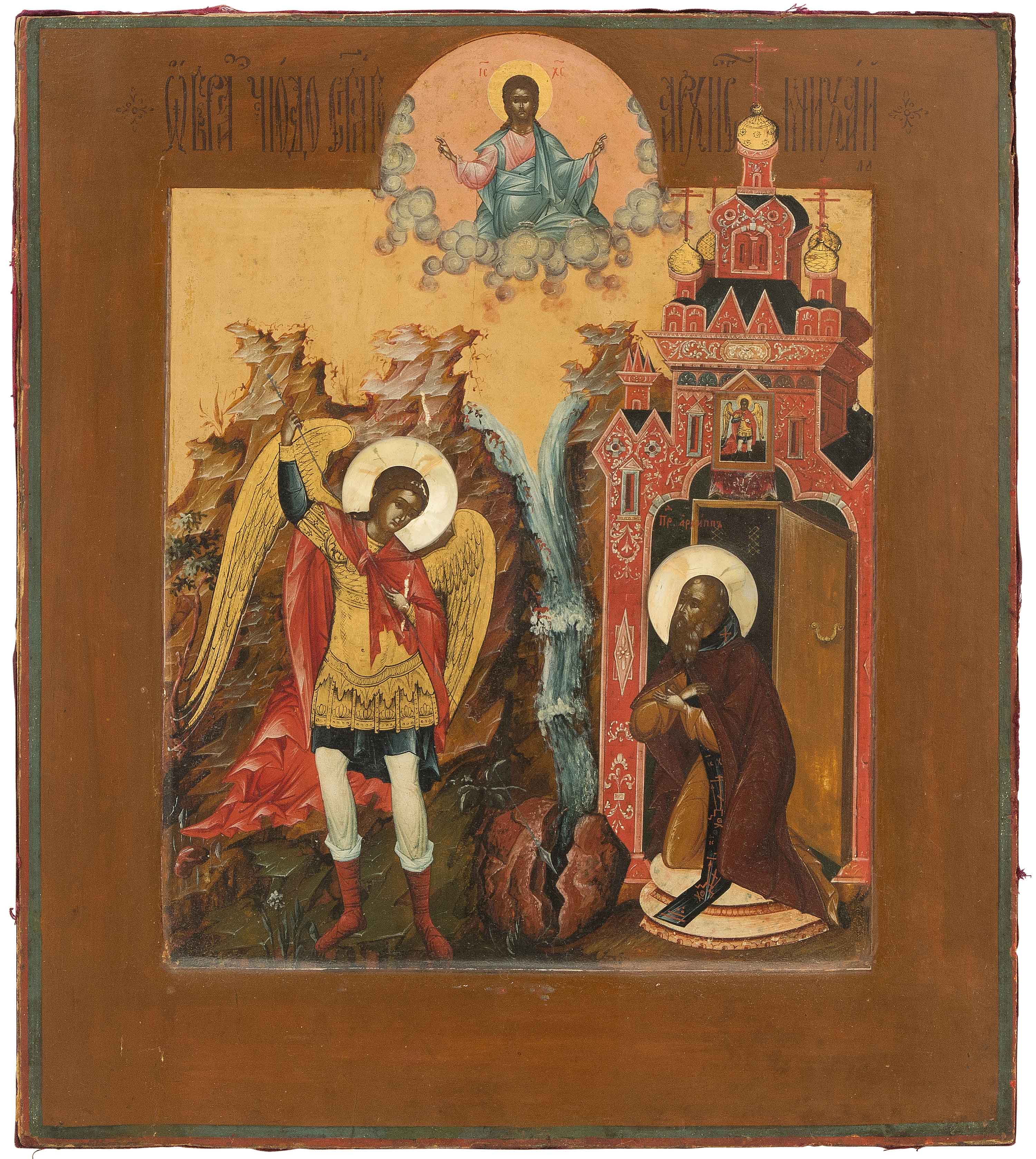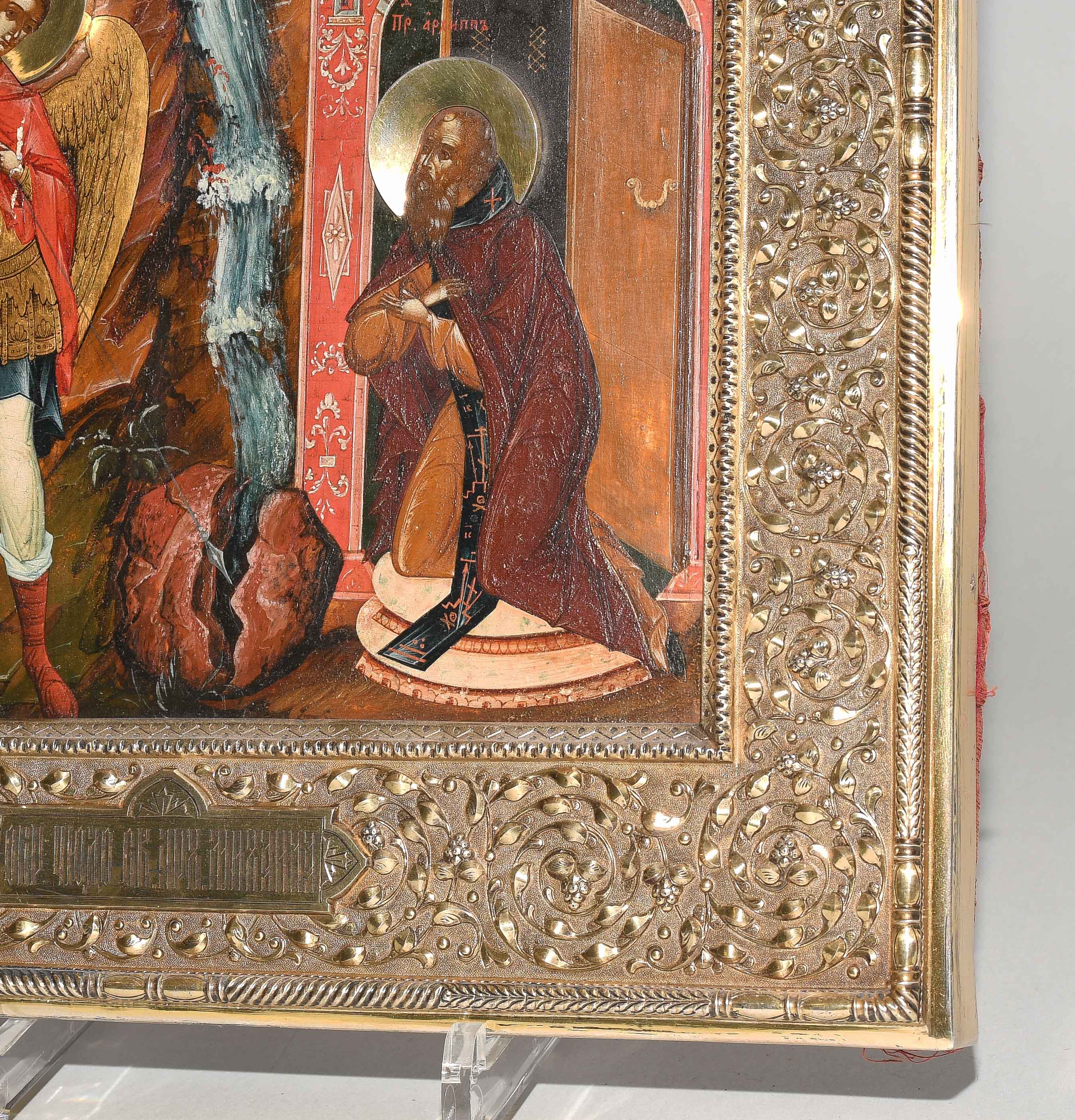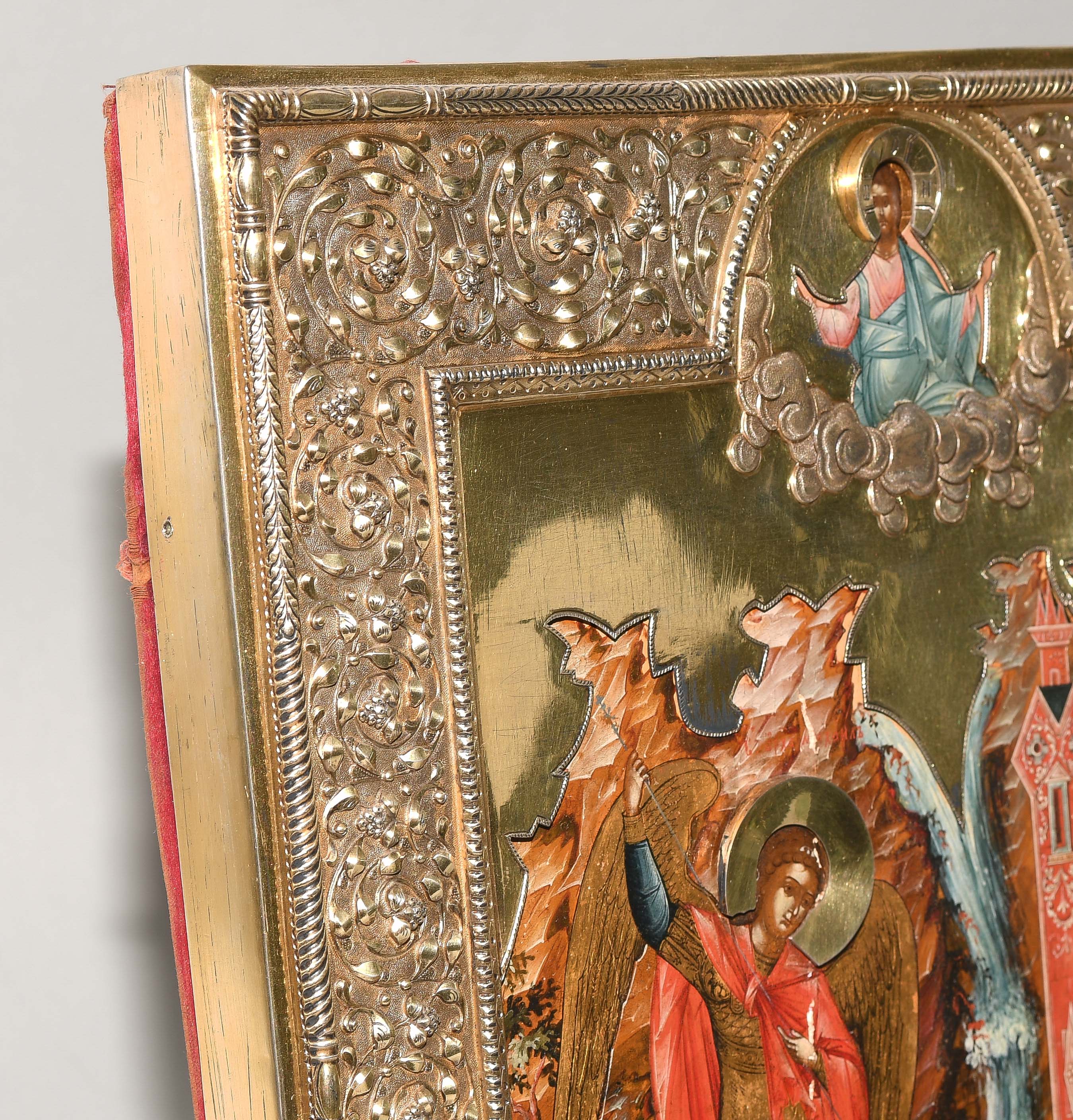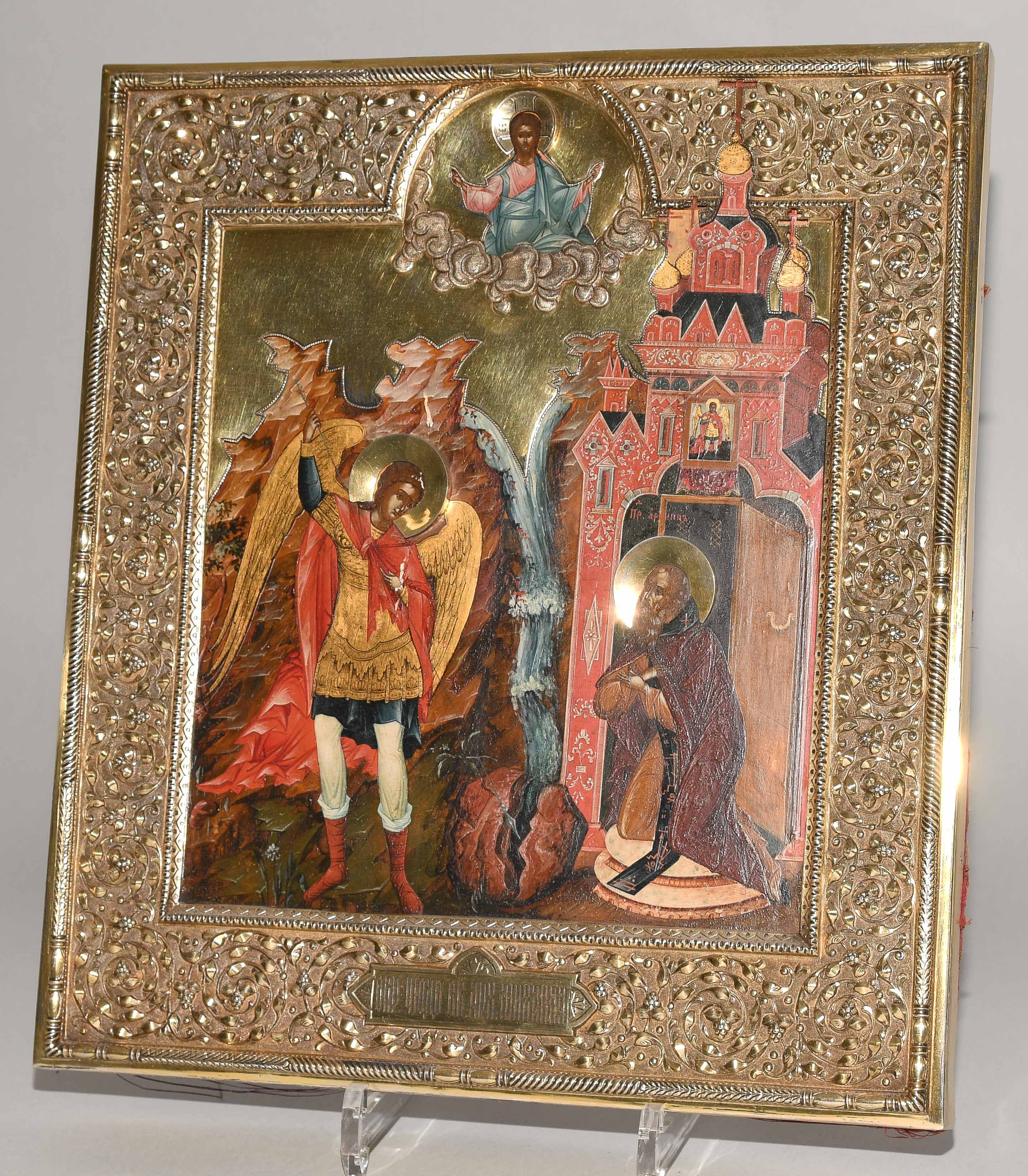 Russisch, 19./20.Jh. (1) Ikone. Schule von Palech, um 1800. Tempera über Kreidegrund auf Holz. Rechts Darstellung des heiligen Mönchs Archippos, vor der Kirche kniend. Links Erzengel Michael, mit seinem Stab einen Felsen spaltend. Im Hintergrund zerklüftete Felsen. In der oberen Bildmitte erscheint Christus Pantokrator über Wolkenband. (2) Basma. Silber, vergoldet. Moskau, 1908–17. Marke "1. MA" (kyrill.) des 1. Moskauer Artels (1908–17). Reicher floraler Reliefdekor. 35,5x31,5 cm.