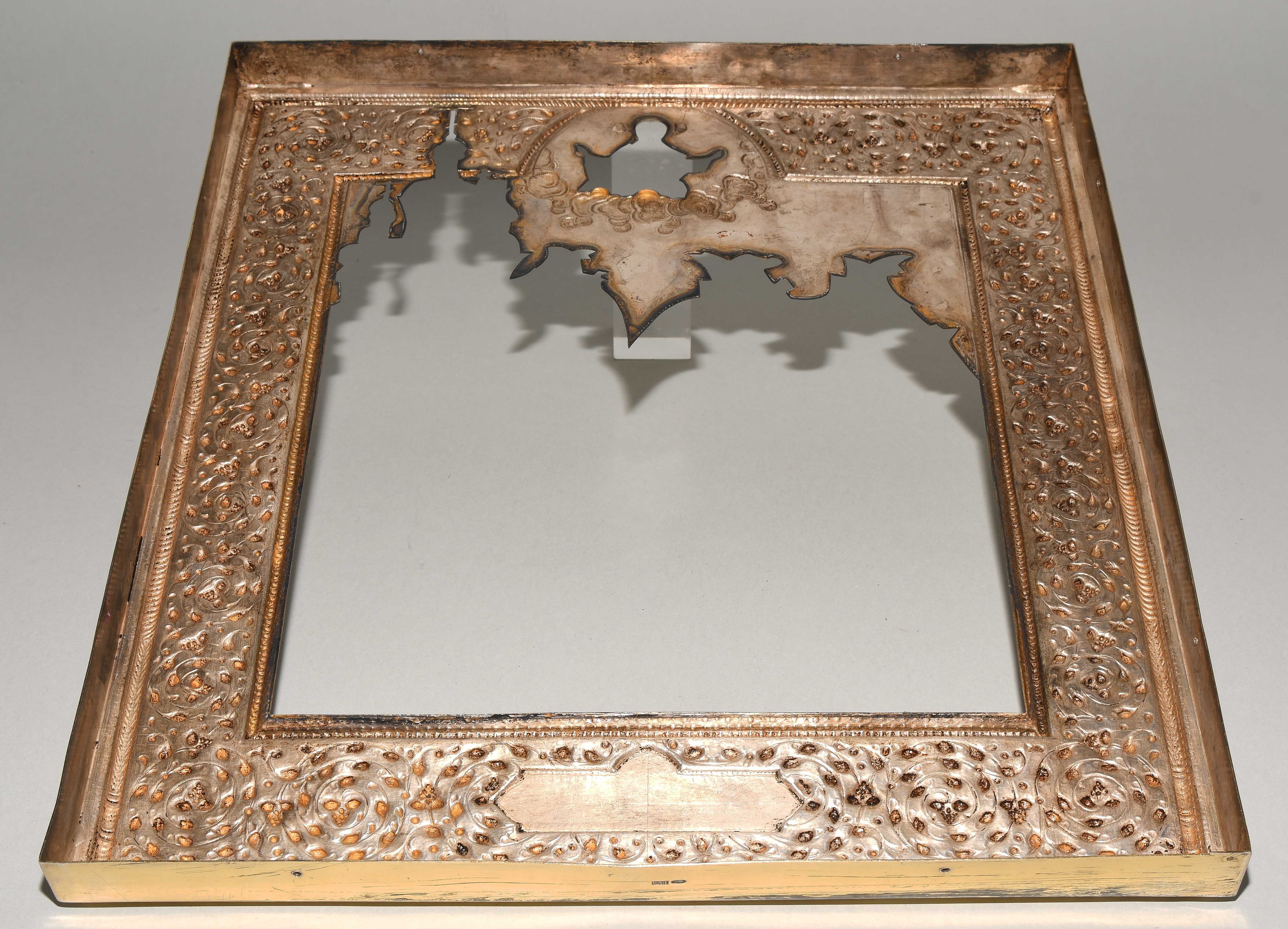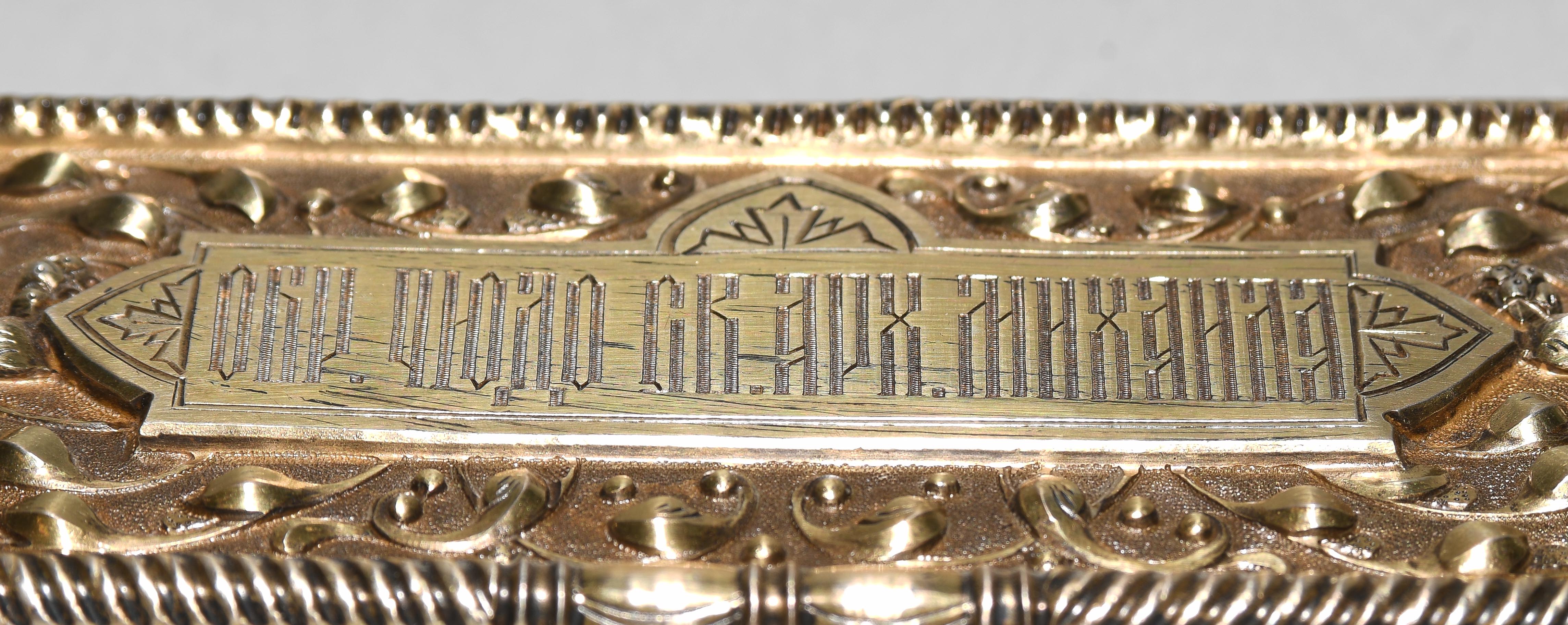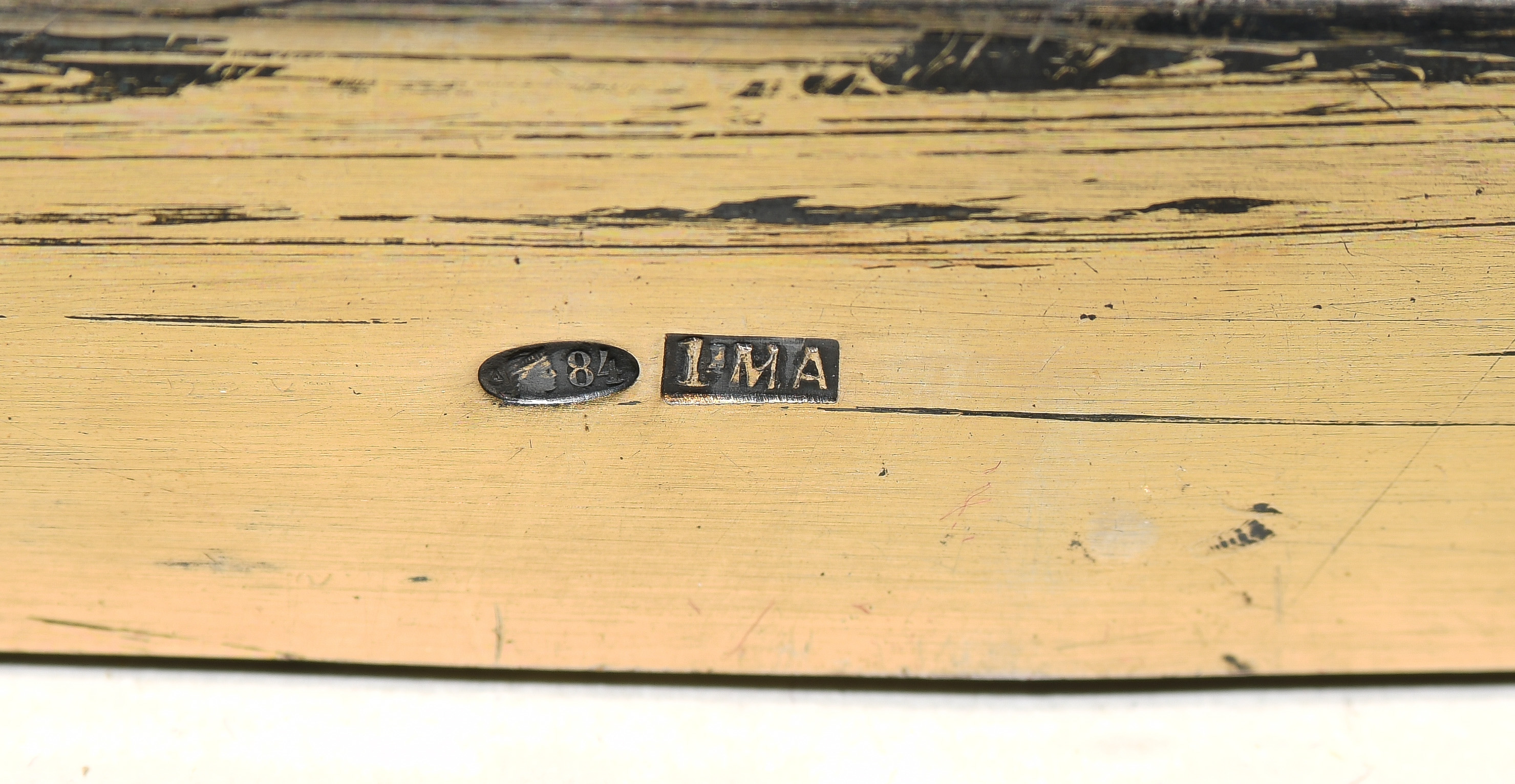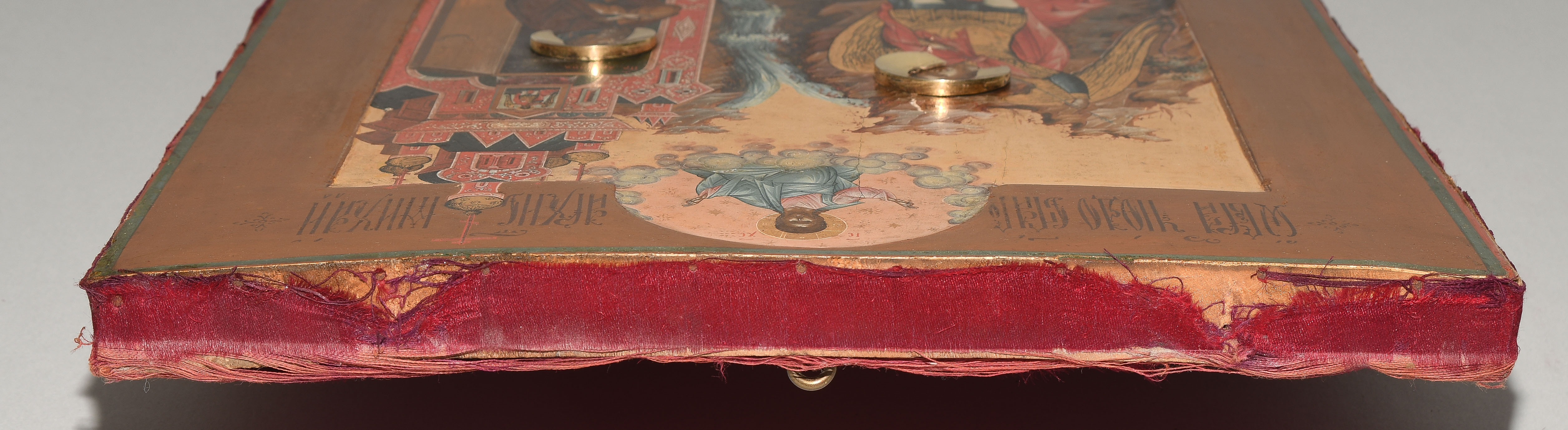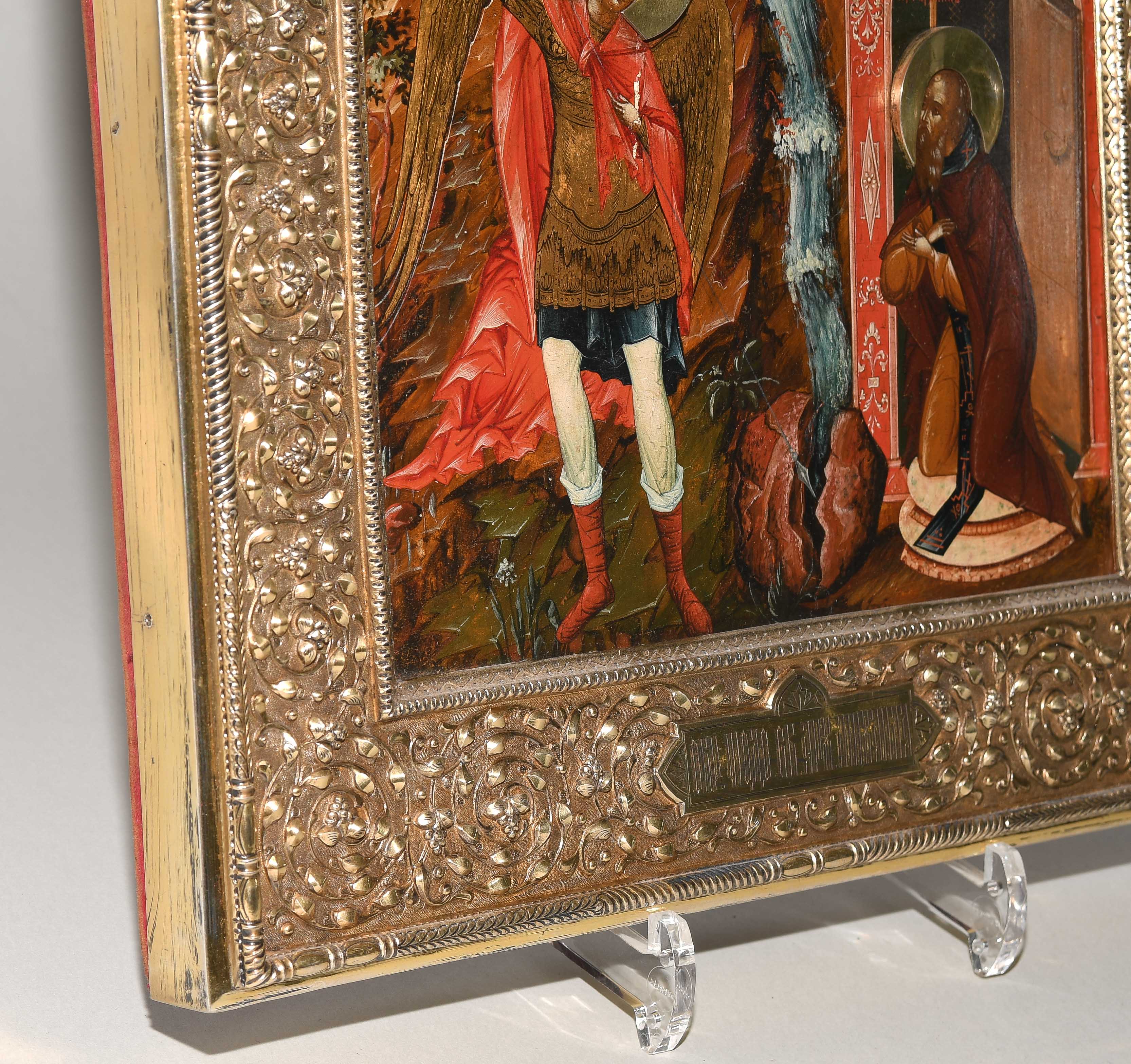Russisch, 19./20.Jh. (1) Ikone. Schule von Palech, um 1800. Tempera über Kreidegrund auf Holz. Rechts Darstellung des heiligen Mönchs Archippos, vor der Kirche kniend. Links Erzengel Michael, mit seinem Stab einen Felsen spaltend. Im Hintergrund zerklüftete Felsen. In der oberen Bildmitte erscheint Christus Pantokrator über Wolkenband. (2) Basma. Silber, vergoldet. Moskau, 1908–17. Marke "1. MA" (kyrill.) des 1. Moskauer Artels (1908–17). Reicher floraler Reliefdekor. 35,5x31,5 cm.
