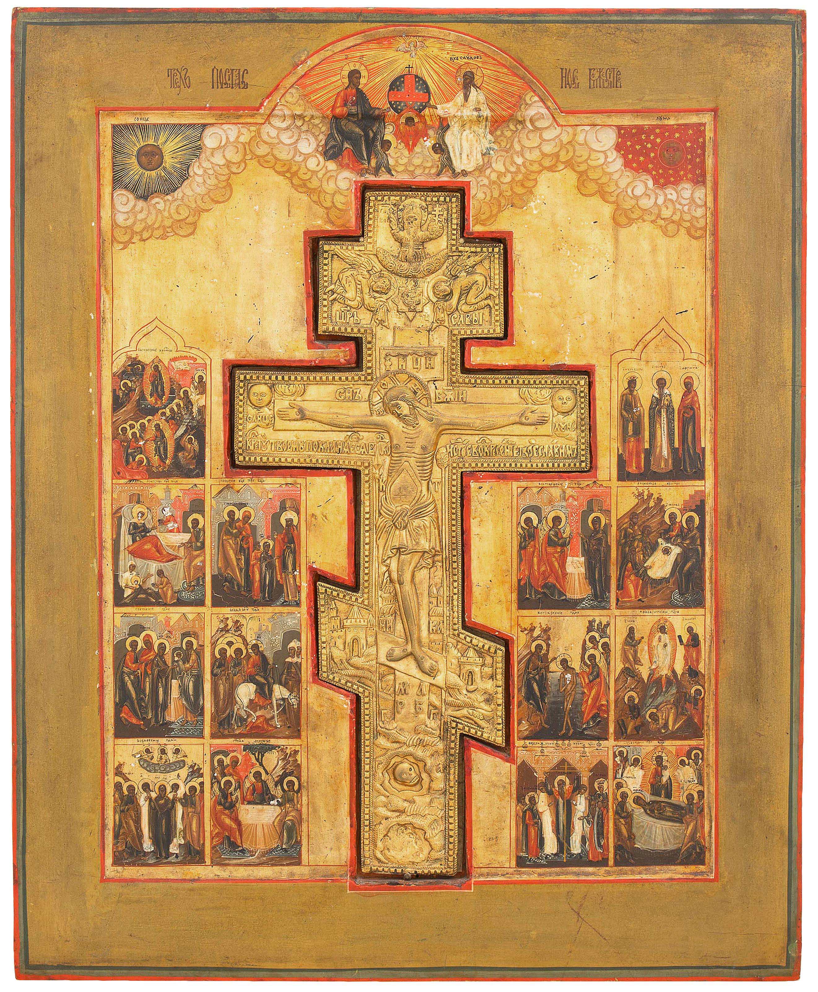 Russisch, um 1800. Tempera über Kreidegrund auf Holz. Goldgrund. Im Zentrum des vertieften Mittelfelds eingelegtes Kreuz aus Bronze, vergoldet. Reliefierte Darstellung des Gekreuzigten über dem Schädel Adams. Auf dem oberen Querbalken 2 adorierende Engel. Darüber Gottvater und Hl. Geist-Taube. Das Kreuz wird von je 7 Festtagsszenen auf Goldgrund flankiert. In der Mitte des oberen Bildrands ist die Hl. Dreifaltigkeit über Wolkenband wiedergegeben, in den Ecken Sonne und Mond. 53x43,5 cm.
