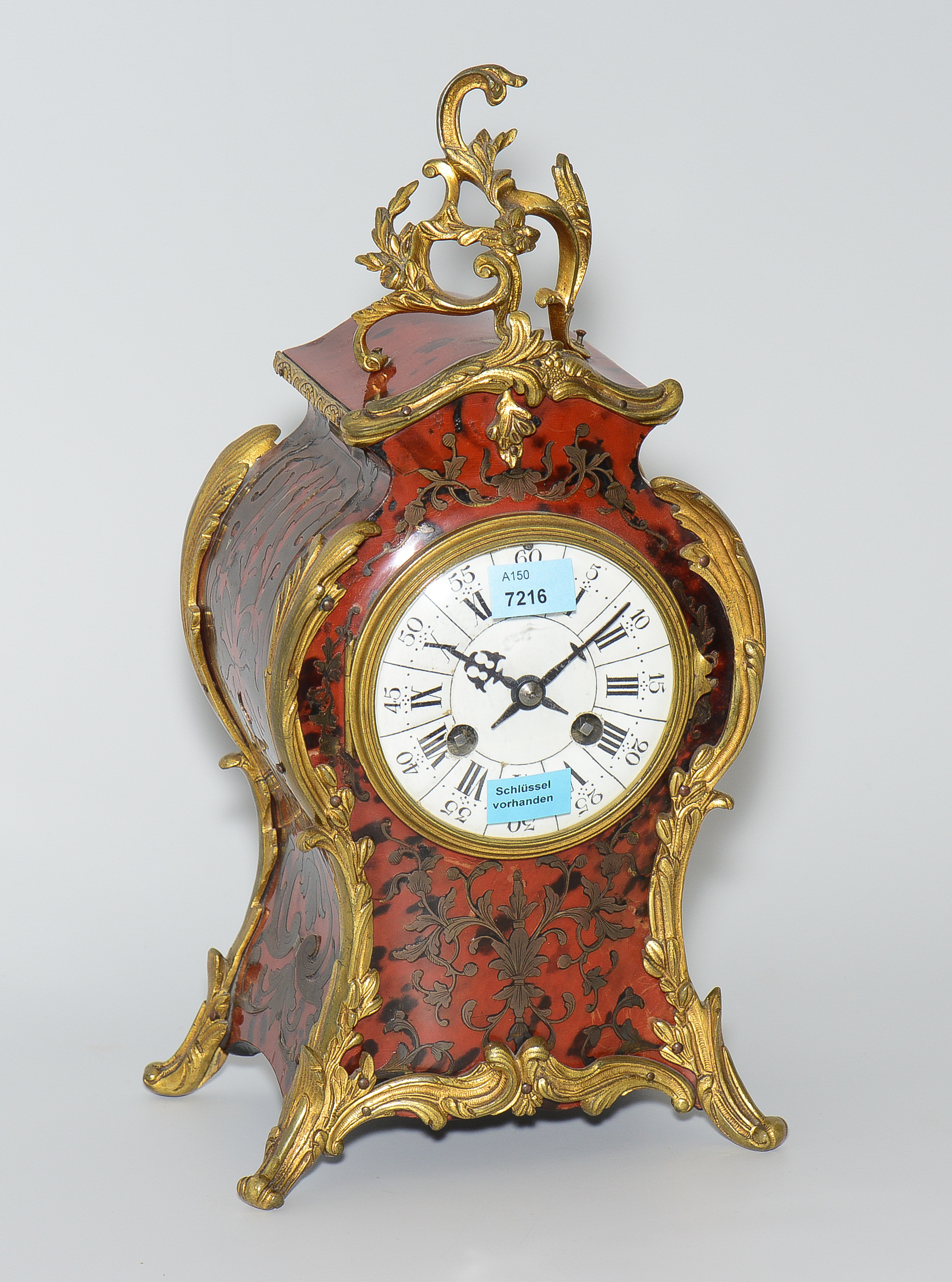Frankreich, 19.Jh. Rotes Boullegehäuse. Konturen mit Bronzeappliken versehen. Florale Zierapplike aus Bronze als Krönung. Verglastes Ziffertürchen in Bronzefassung. Emailzifferblatt mit römischen Stunden- und arabischen Minutenzahlen. Ankerwerk mit Hinterpendel an Federaufhängung. Stunden- und Halbstundenschlag auf Tonfeder. Zu revidieren. Aufzugsfeder gebrochen. Pendel fehlt. 33x17 cm.