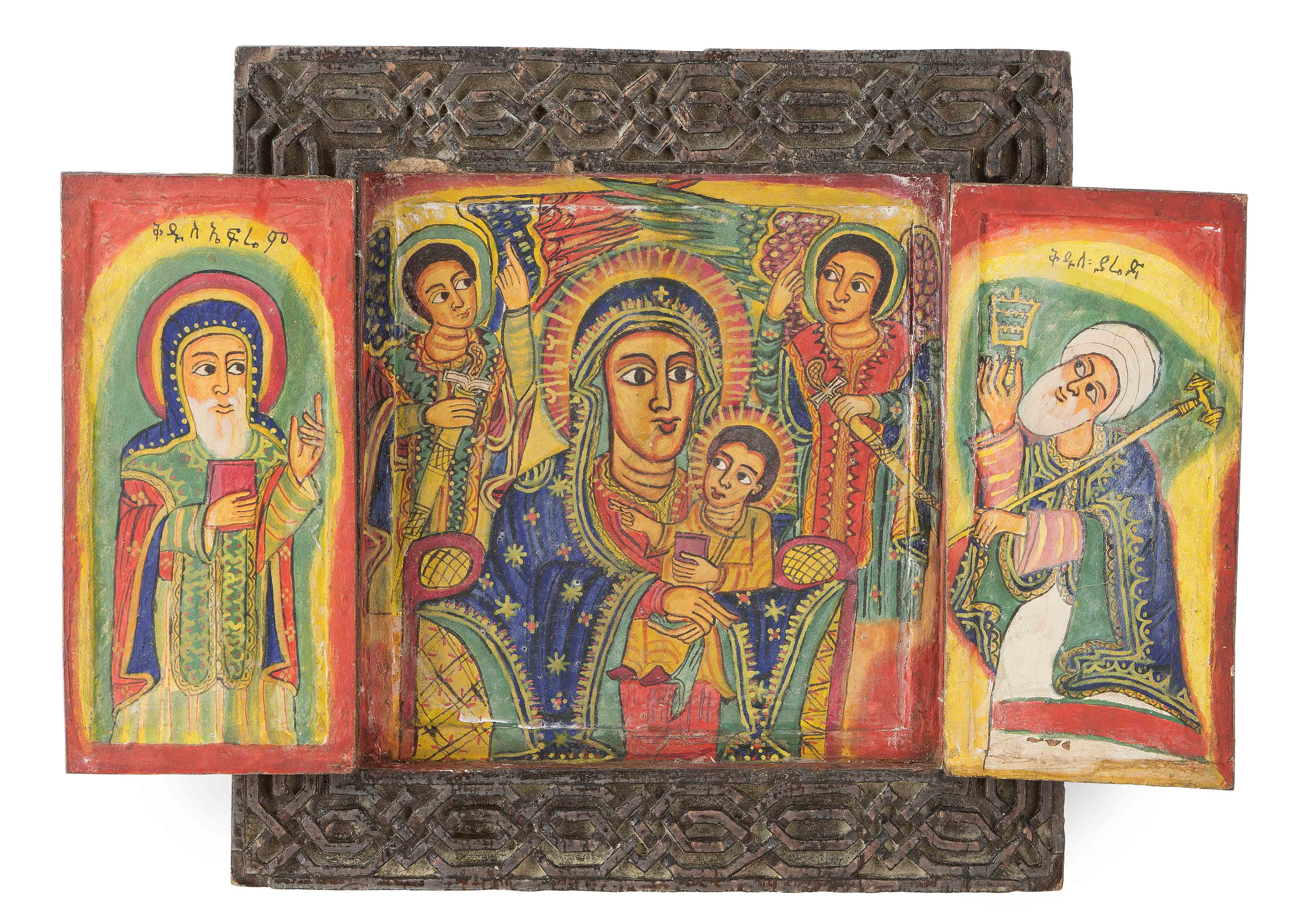 Äthiopien, 20.Jh. Farbige Malerei über Kreidegrund auf Holz. In der vertieften Mitteltafel Darstellung der Gottesmutter mit Kind, begleitet von 2 Engeln. Auf den Flügeln je 1 (äthiopischer?) Heiliger. Umrandung und Aussenseiten reich mit Kreuzmotiven und Flechtbandornamentik beschnitzt. 34,5x47 cm (offen).