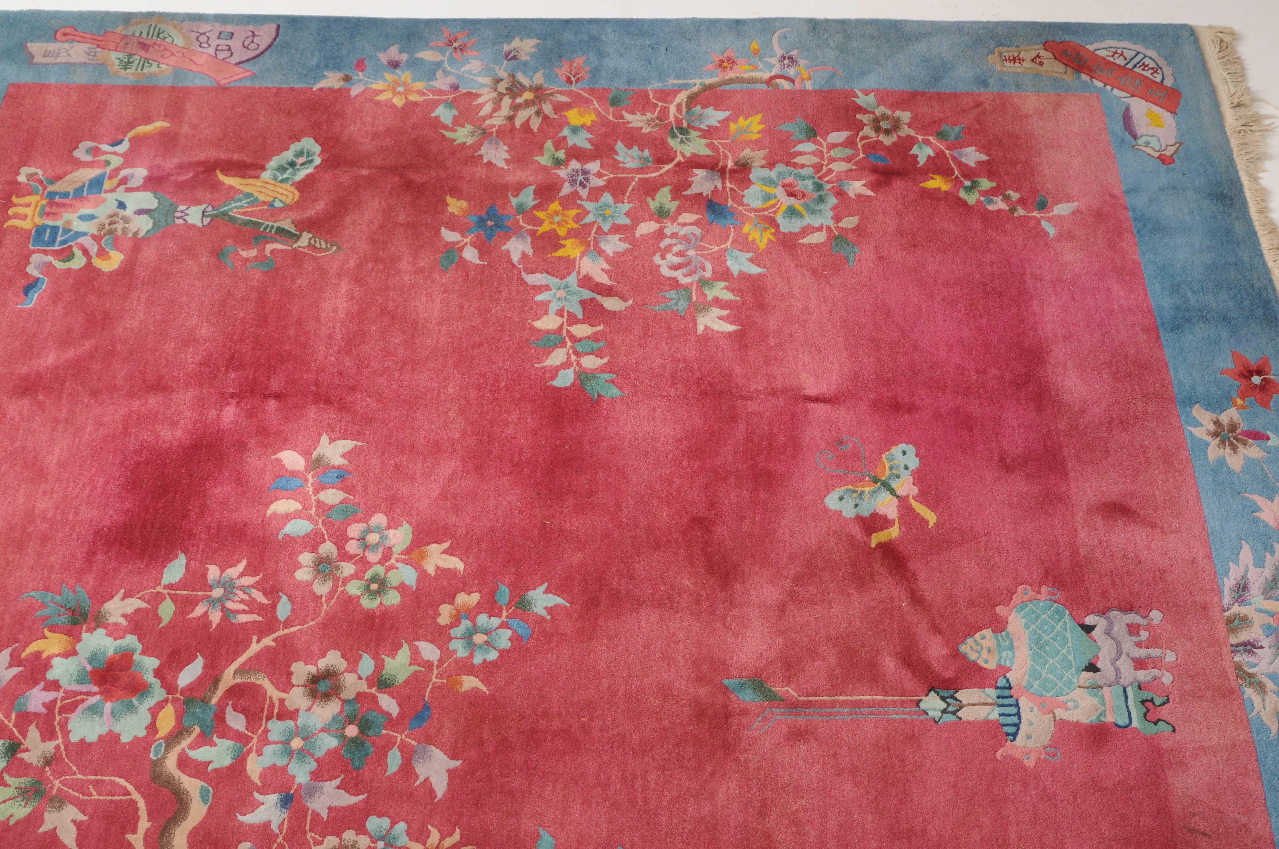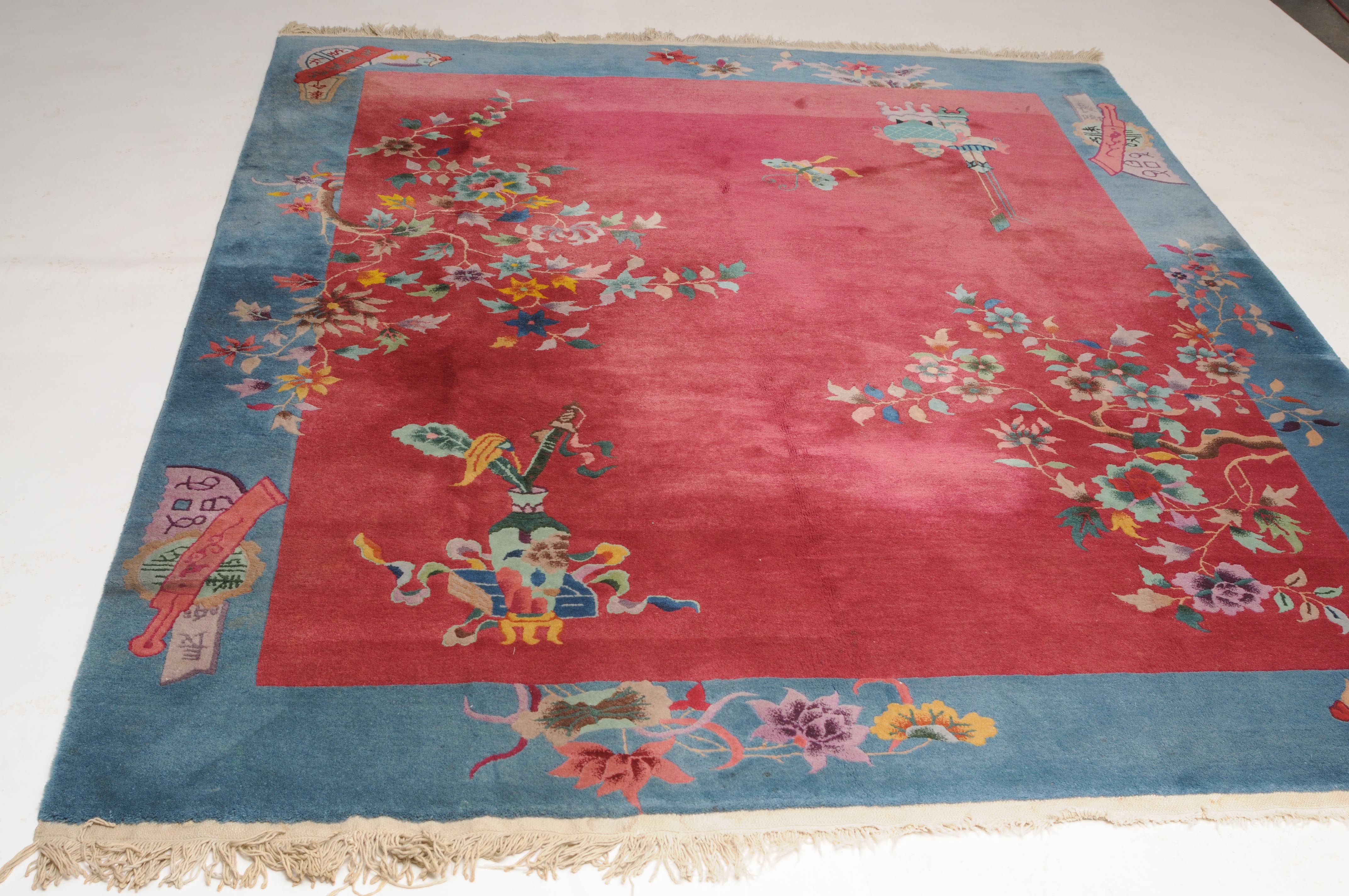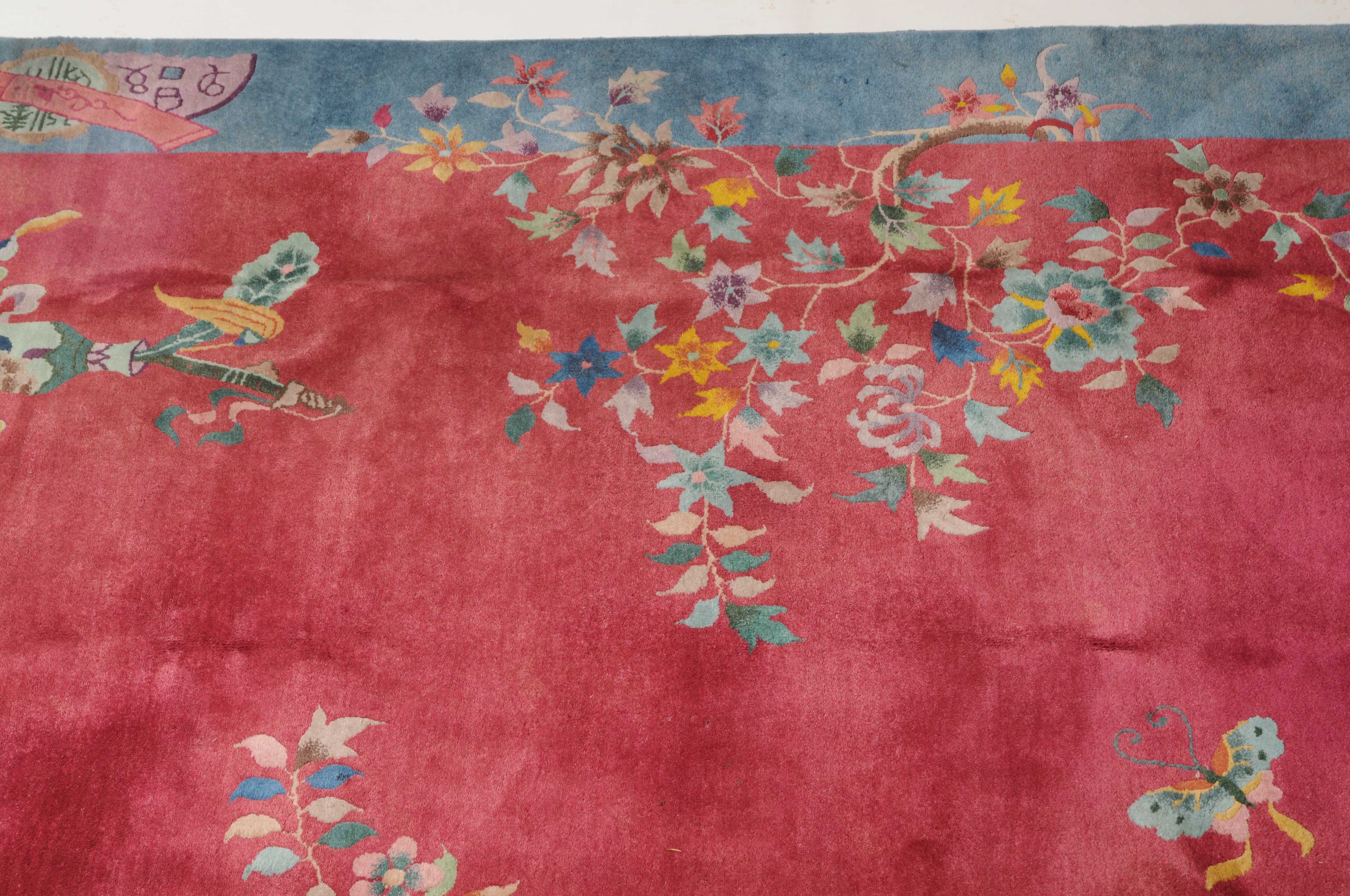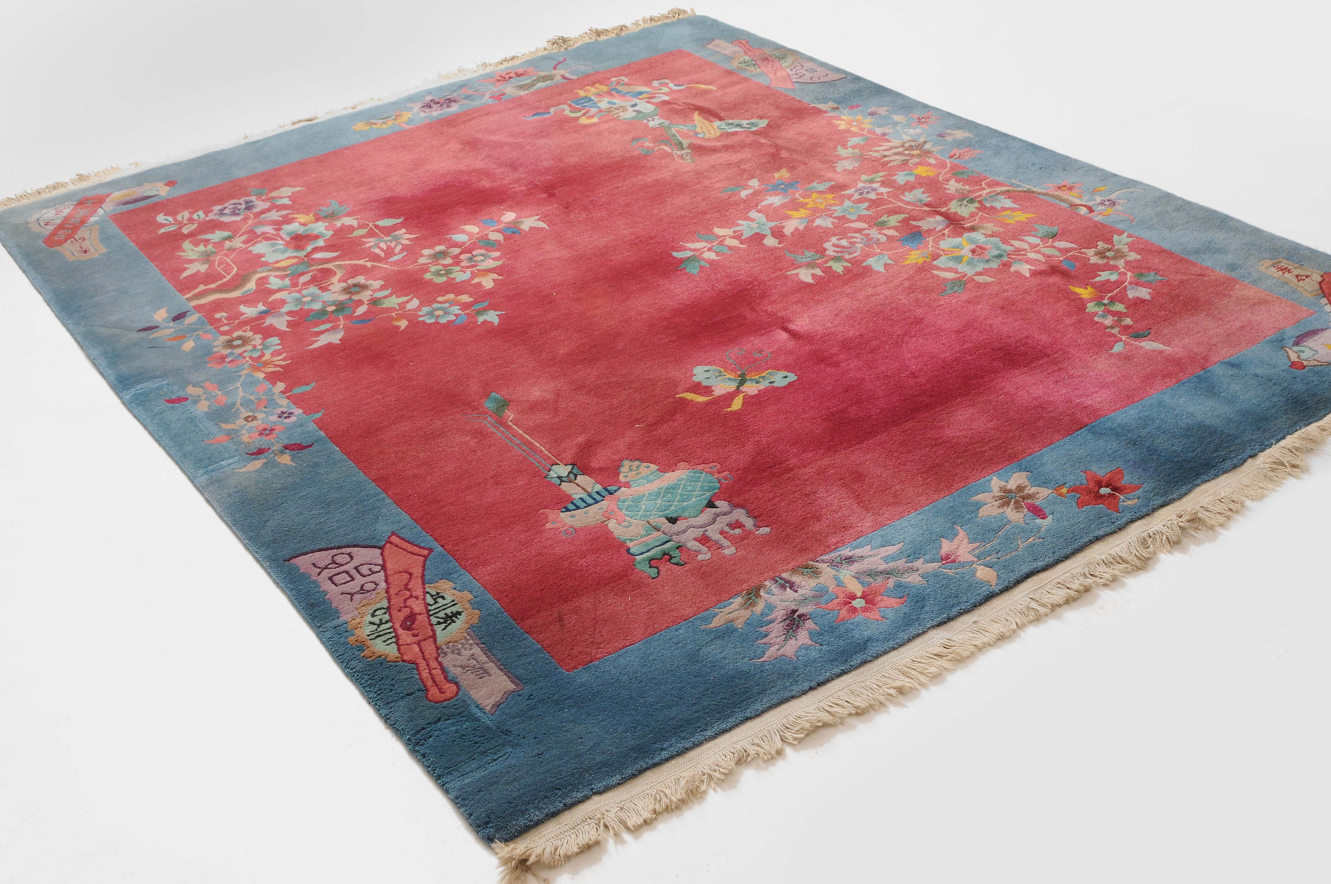 China, um 1950. Mit Blättern und Blüten besetzte Äste ragen seitlich in den tiefroten Grund hinein, der im Inneren mit Tischen und einem Schmetterling dekoriert ist. Die hellblaue breite Bordüre ist mit Schwertern, dekorativen Blüten und weiteren chinesischen Symbolen belegt. Gute Erhaltung. 202x247 cm (ft. 6.7x8.2).