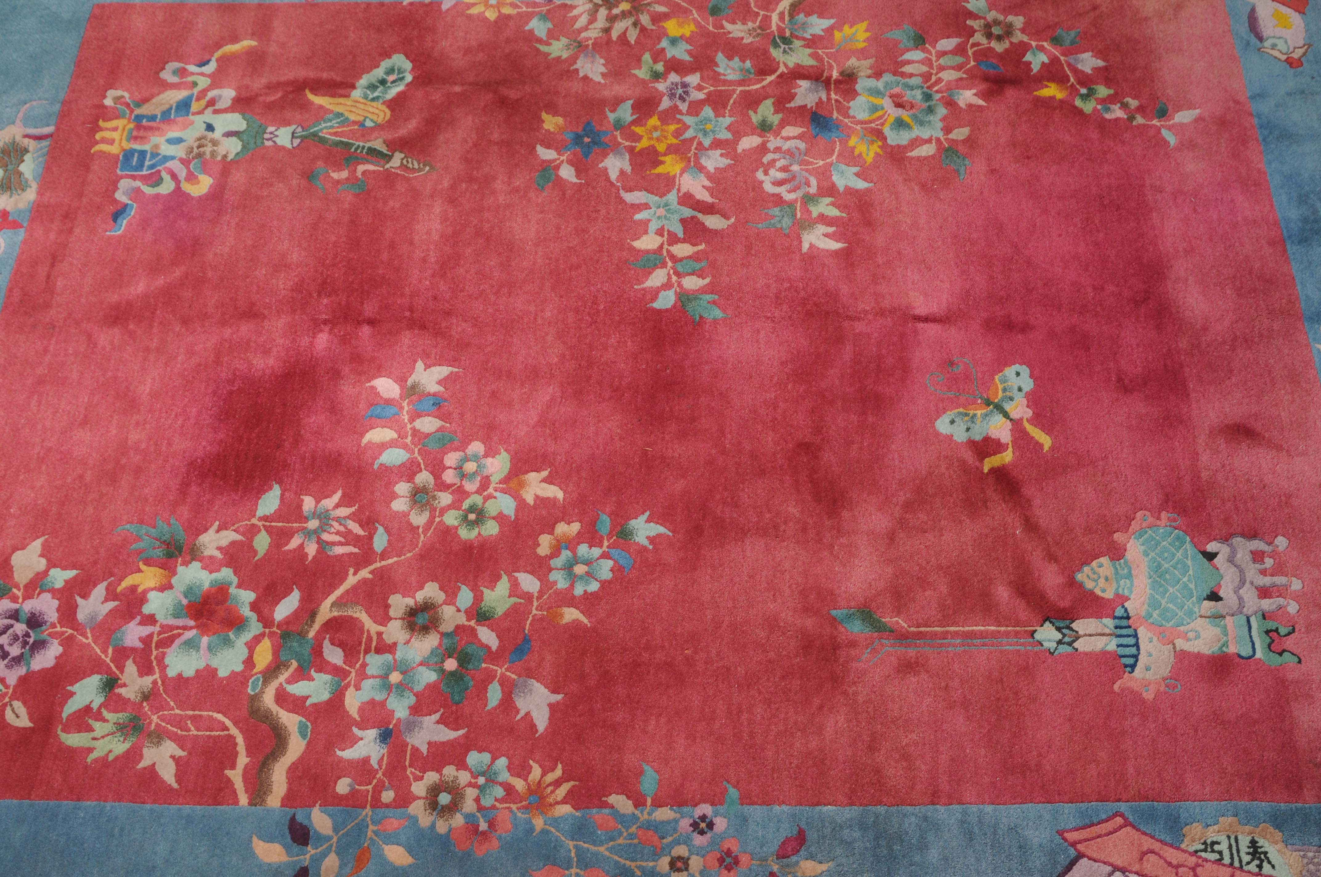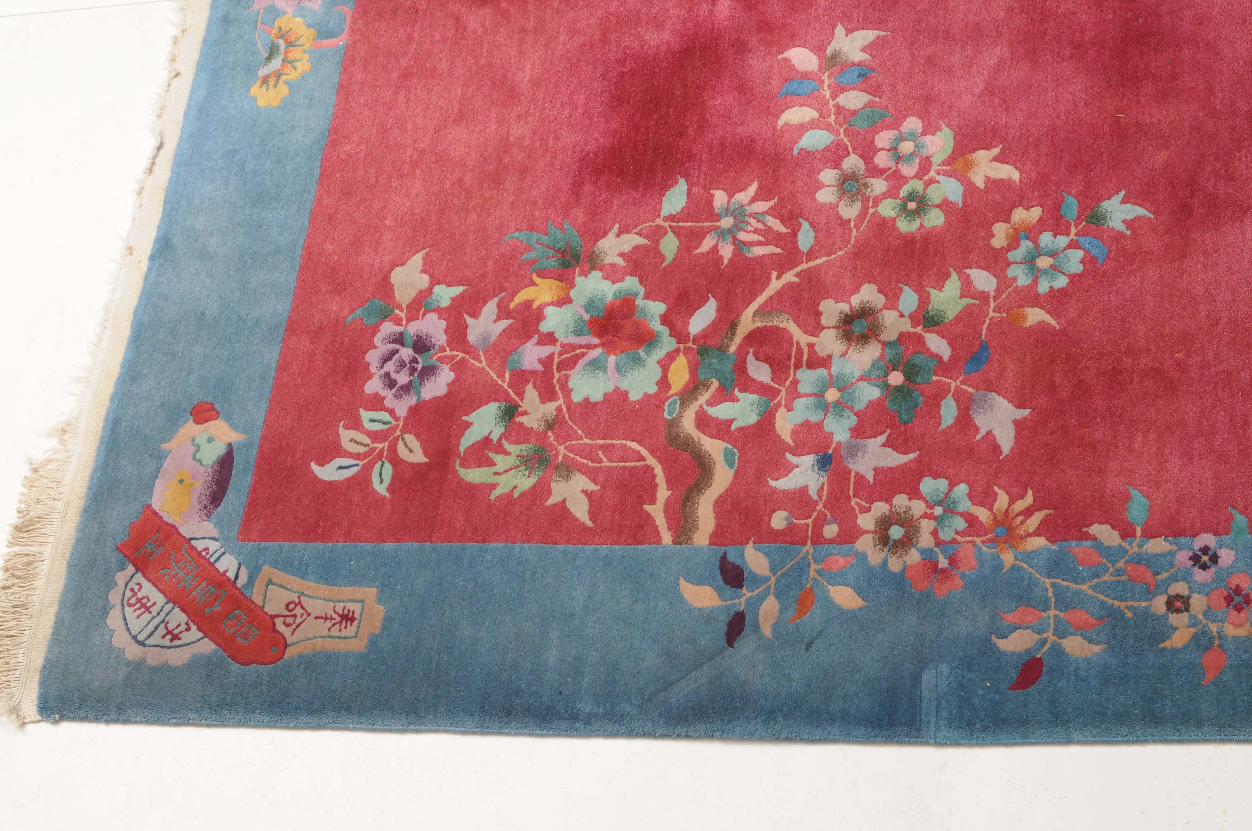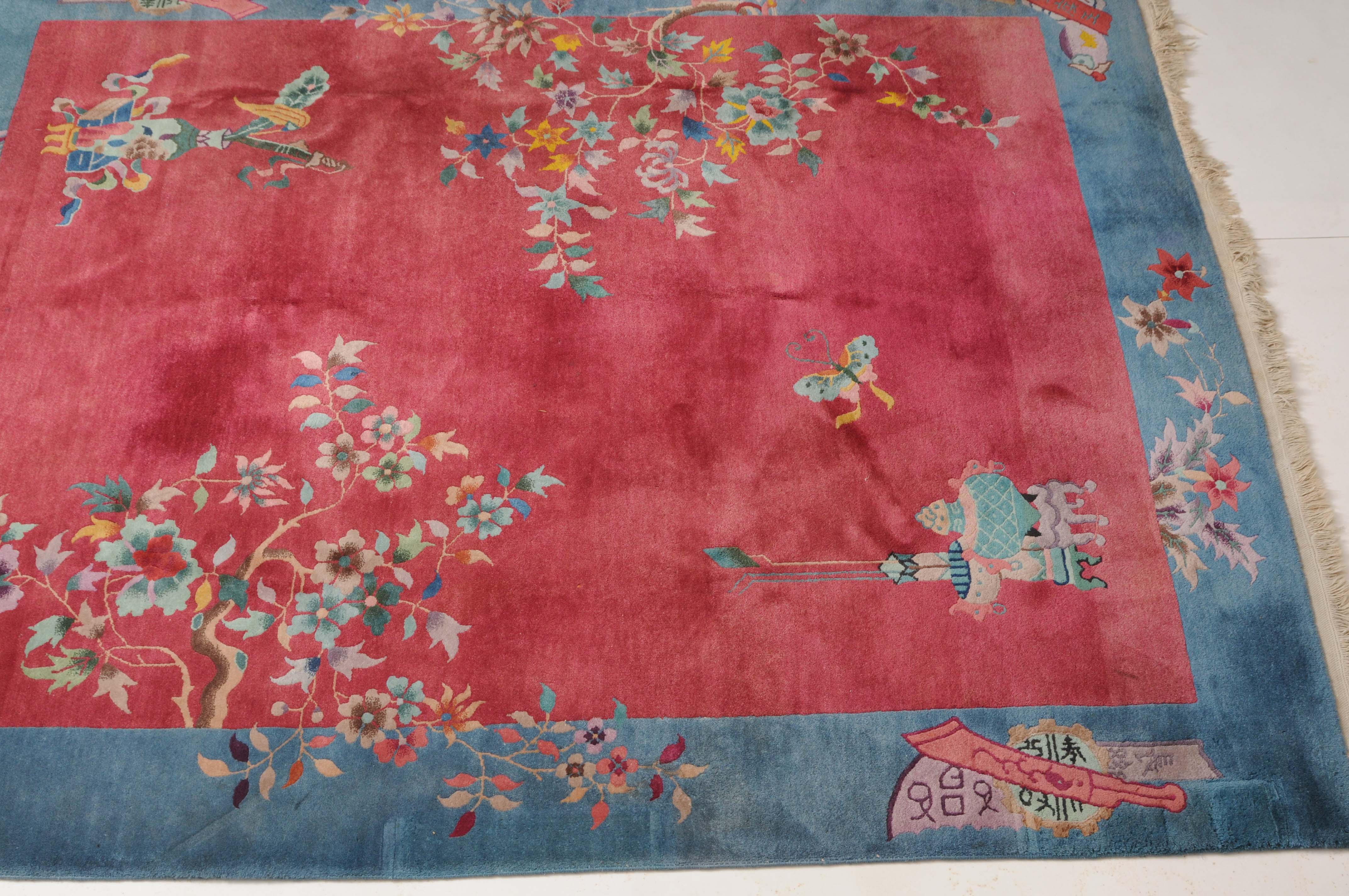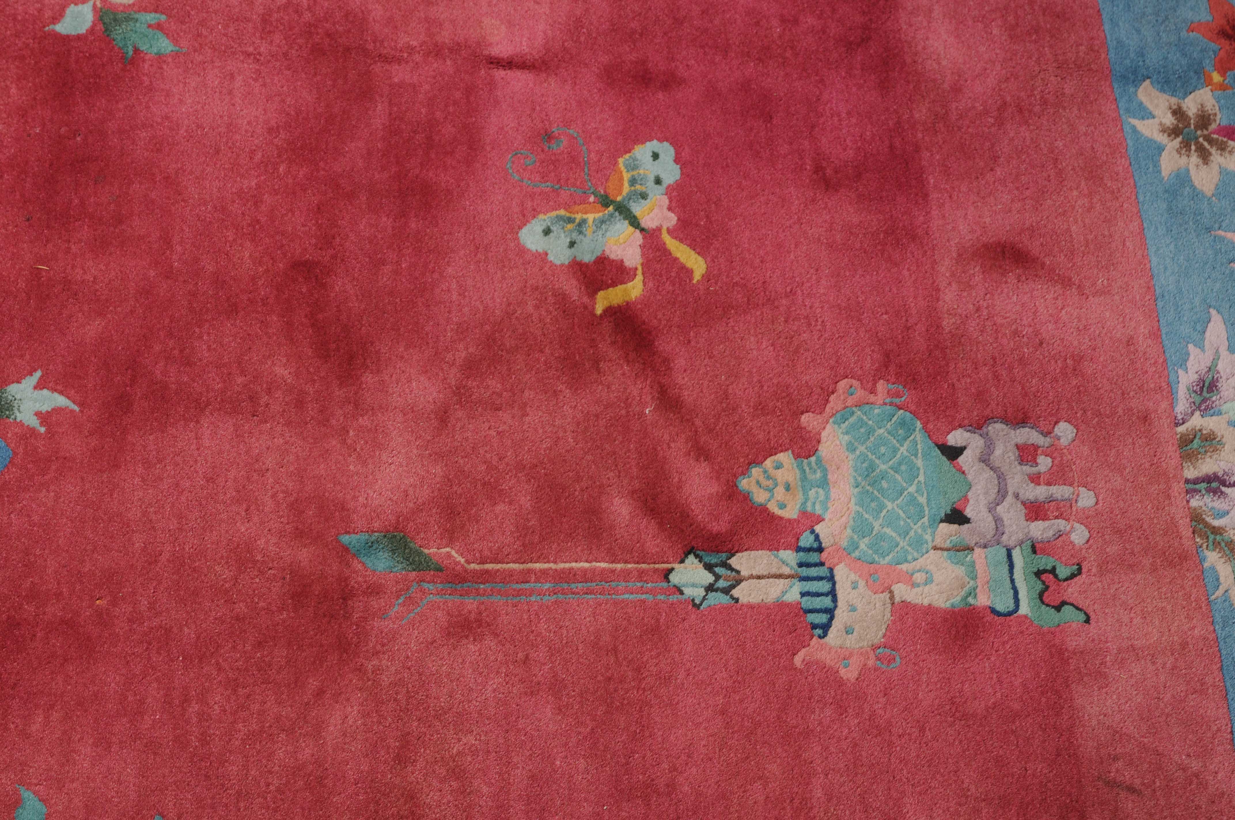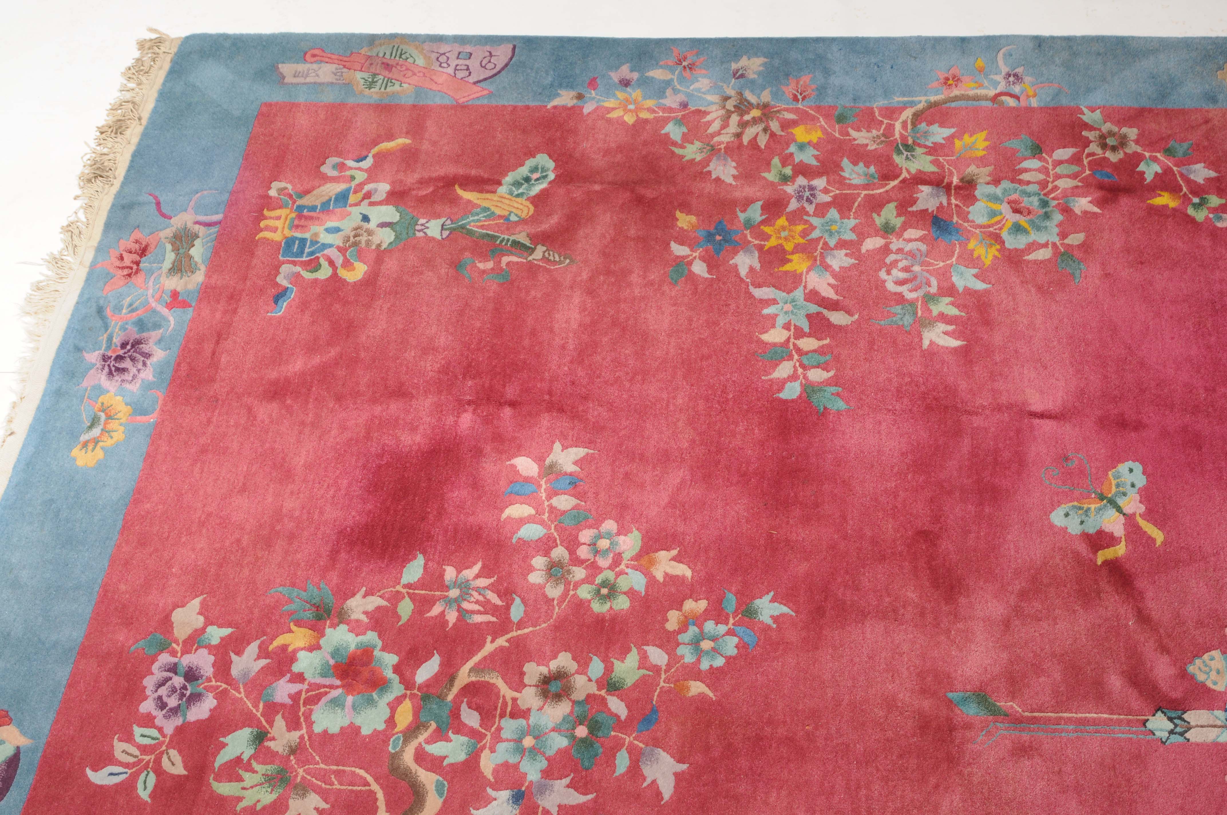 China, um 1950. Mit Blättern und Blüten besetzte Äste ragen seitlich in den tiefroten Grund hinein, der im Inneren mit Tischen und einem Schmetterling dekoriert ist. Die hellblaue breite Bordüre ist mit Schwertern, dekorativen Blüten und weiteren chinesischen Symbolen belegt. Gute Erhaltung. 202x247 cm (ft. 6.7x8.2).