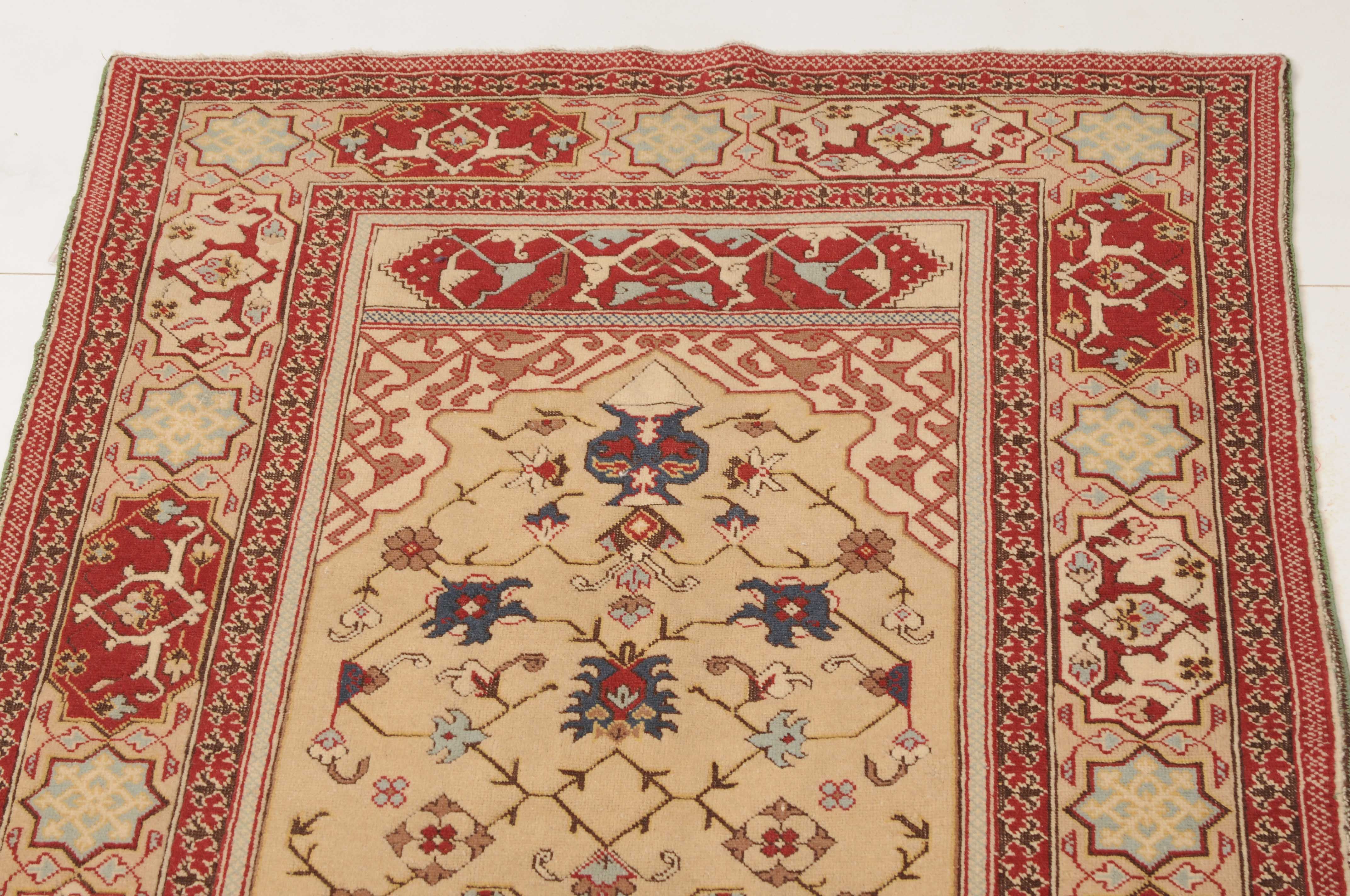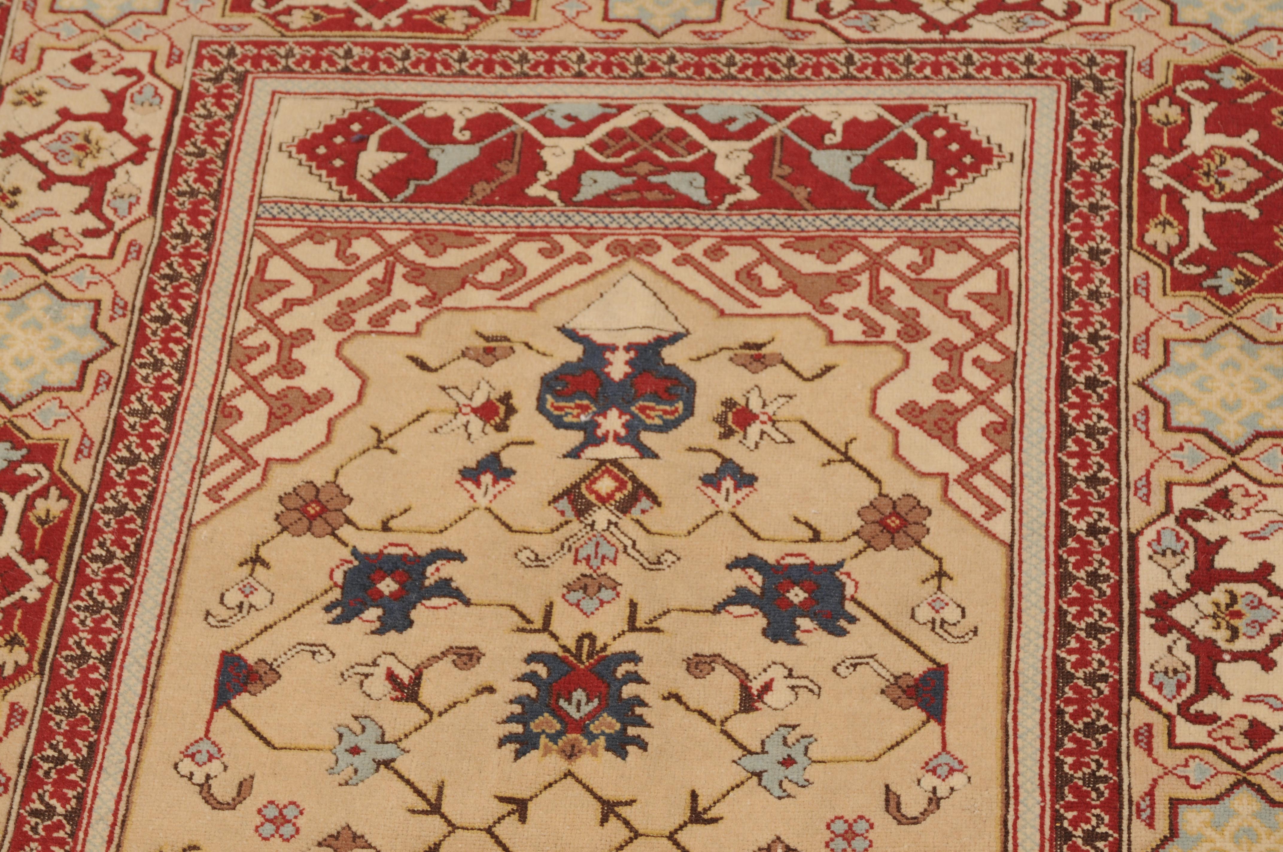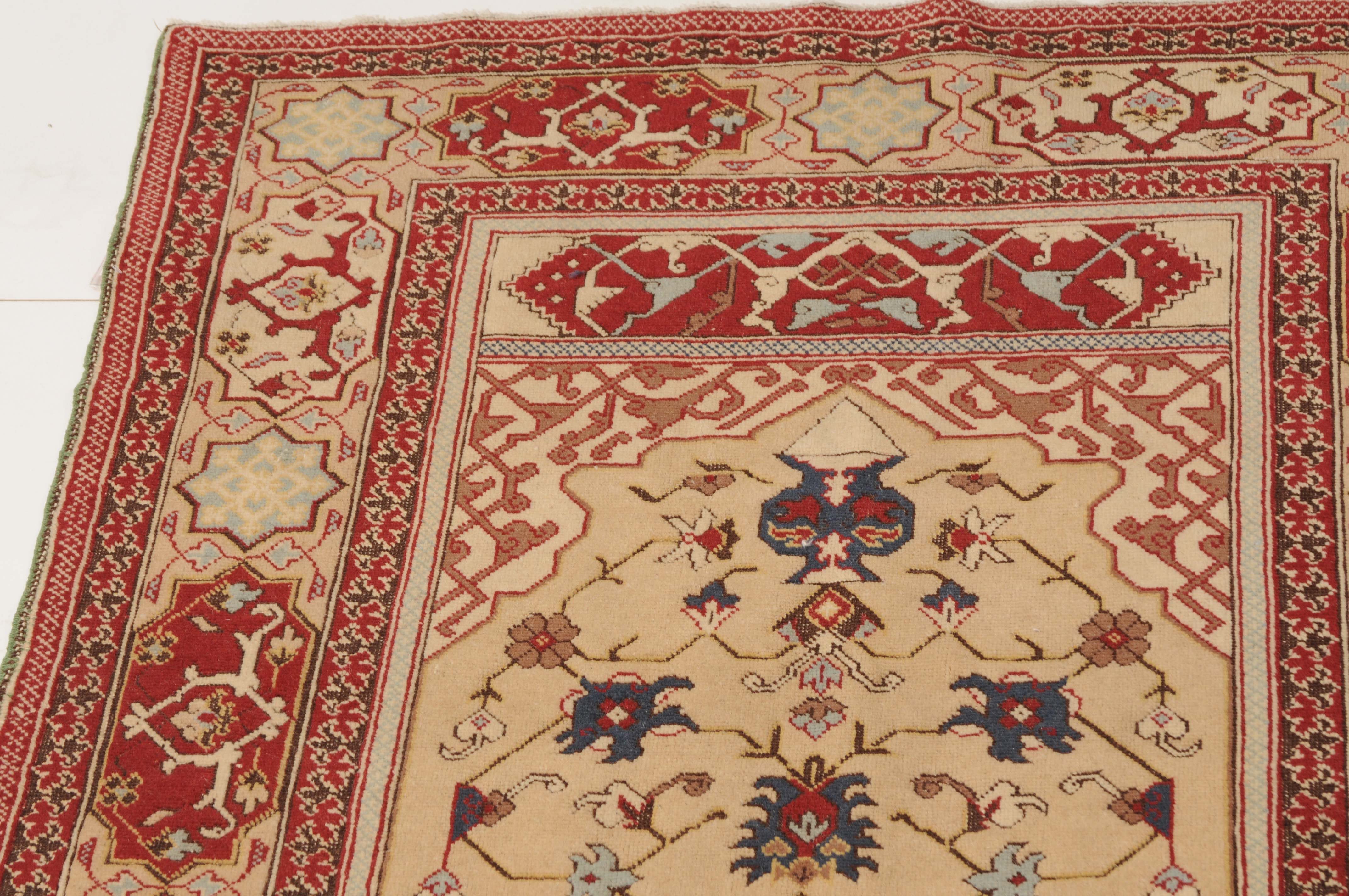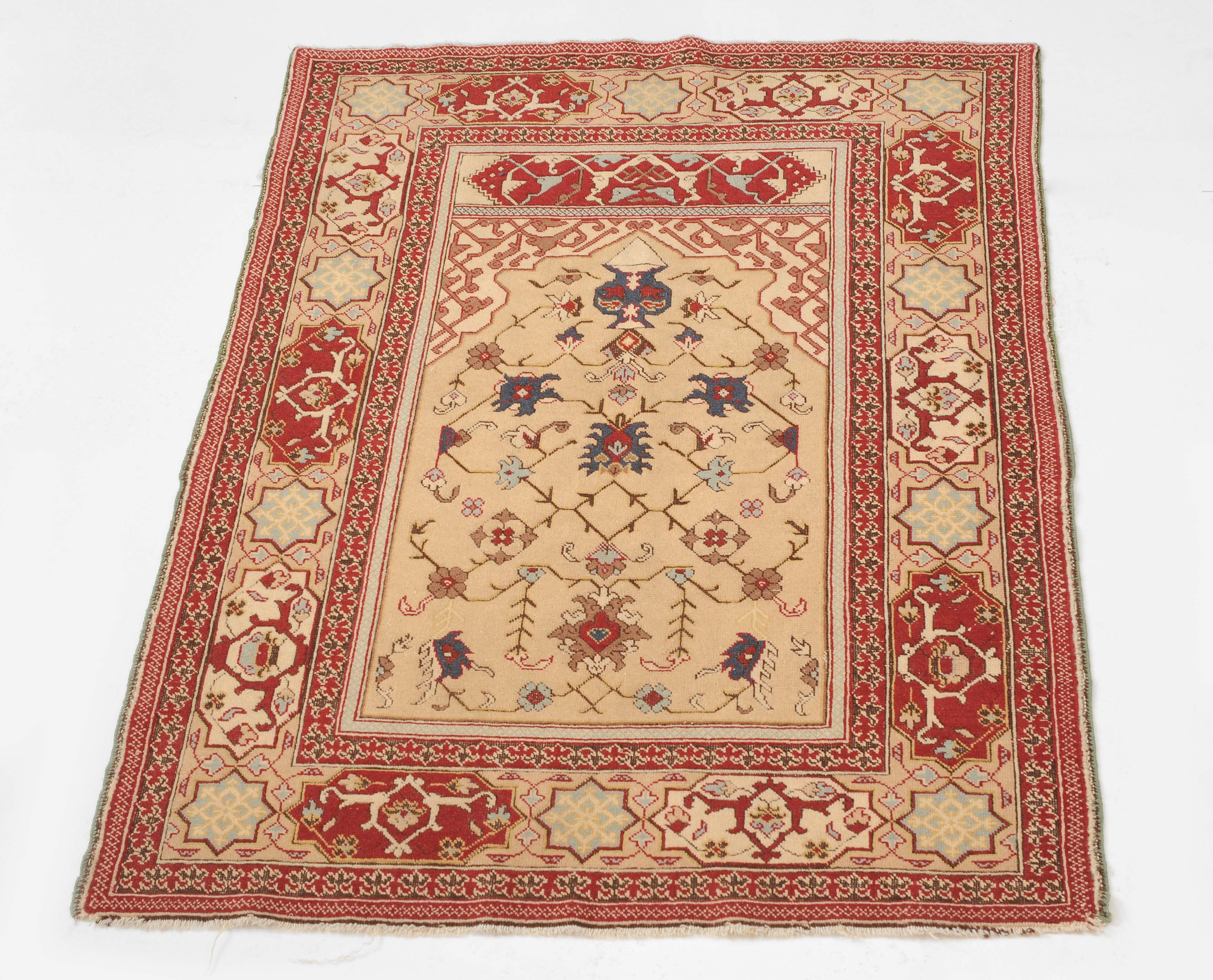Wohl Rumänien, um 1910. Sog. “Tuduc-Teppich“. Auf cremefarbenem Grund hängt unter einer Gebetsnische (Mihrab) eine Ampel hinab ins Feld, umgeben von verschiedensten Palmetten, Blüten und Blattranken. 2 reziproke Medachylborten umranden die mit effektvollen Medaillon- und Stern-Kartuschen belegte Hauptbordüre. Gebrauchsspuren. 110x144 cm (ft. 3.6x4.8).