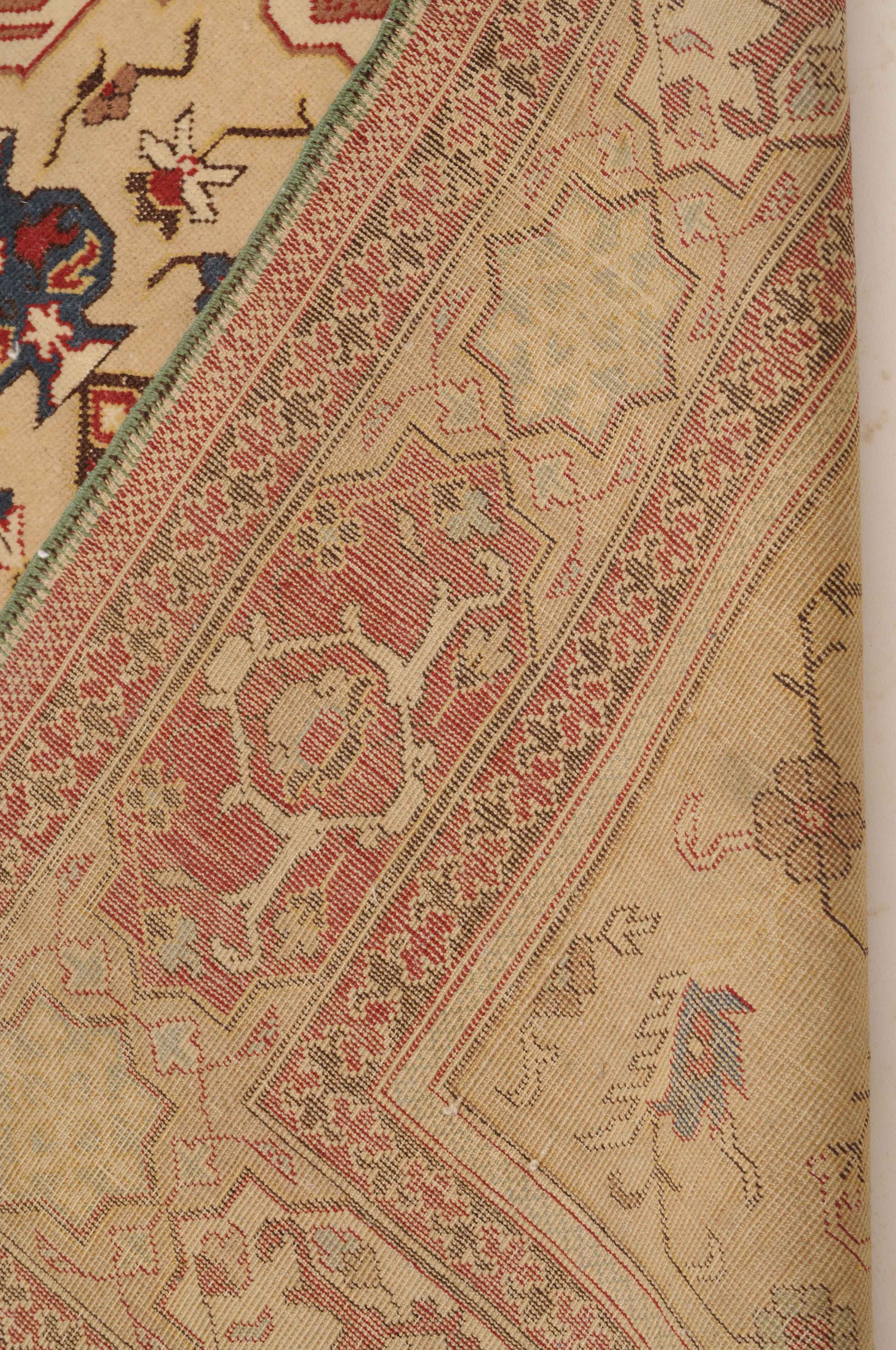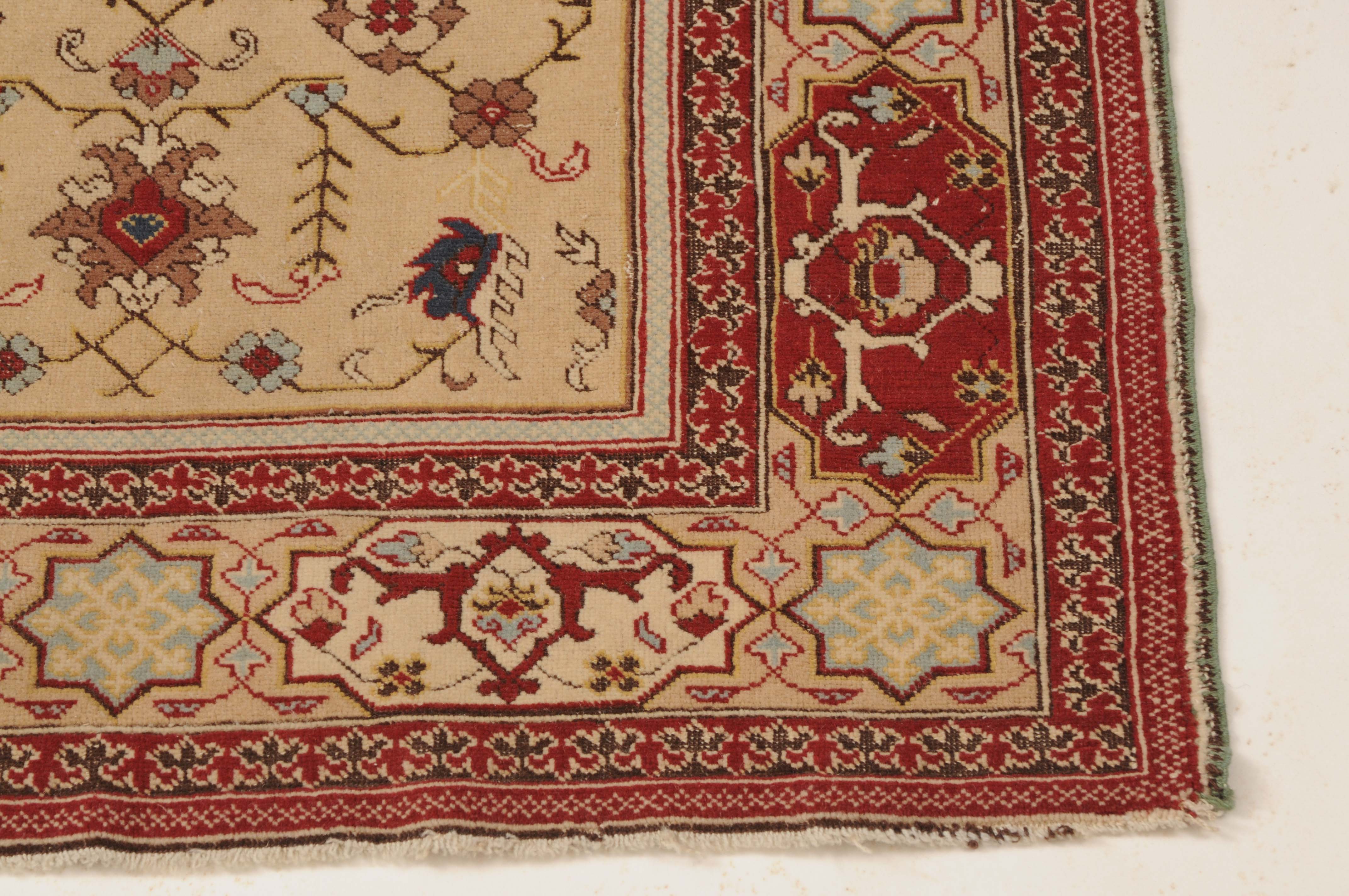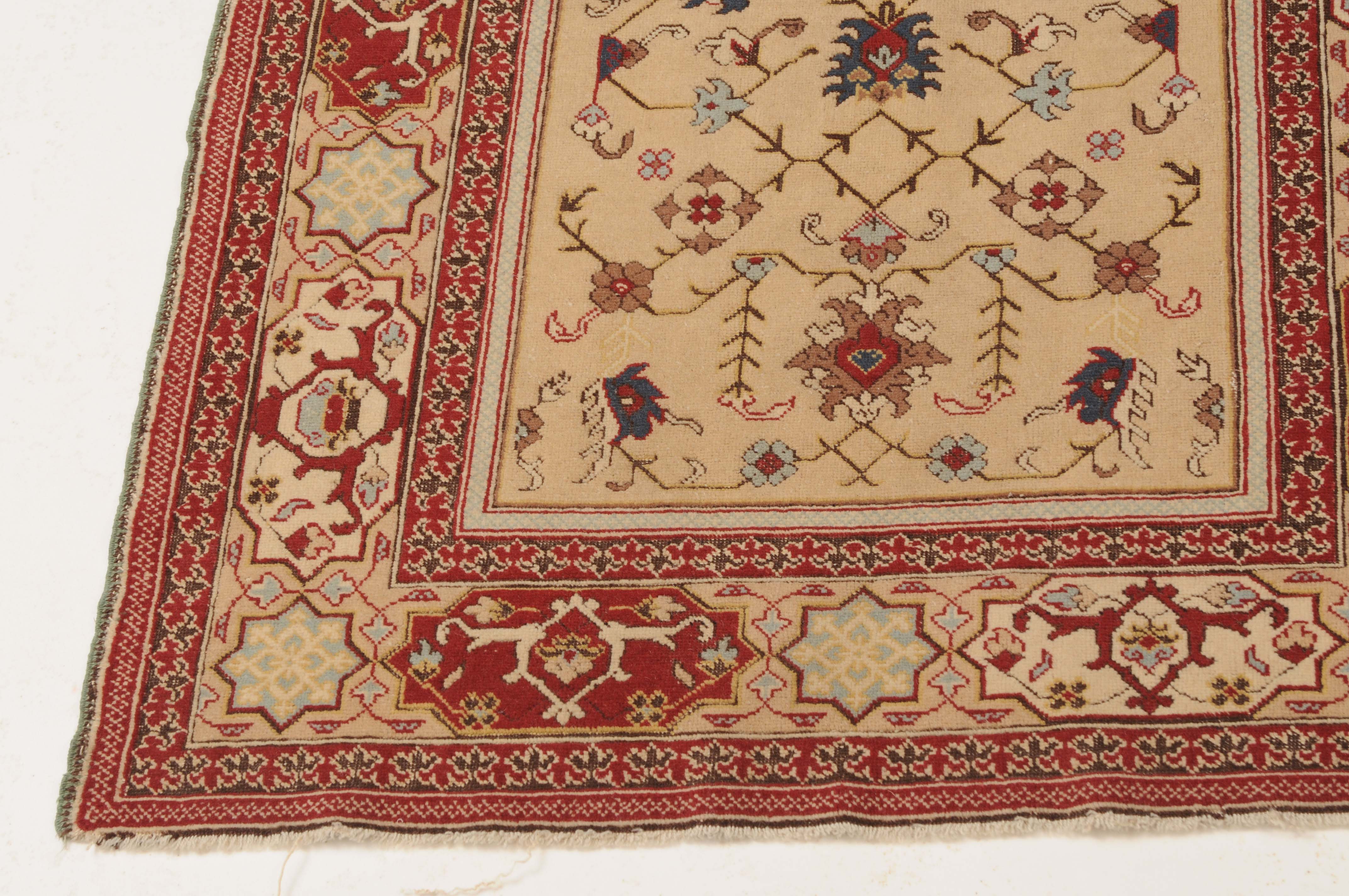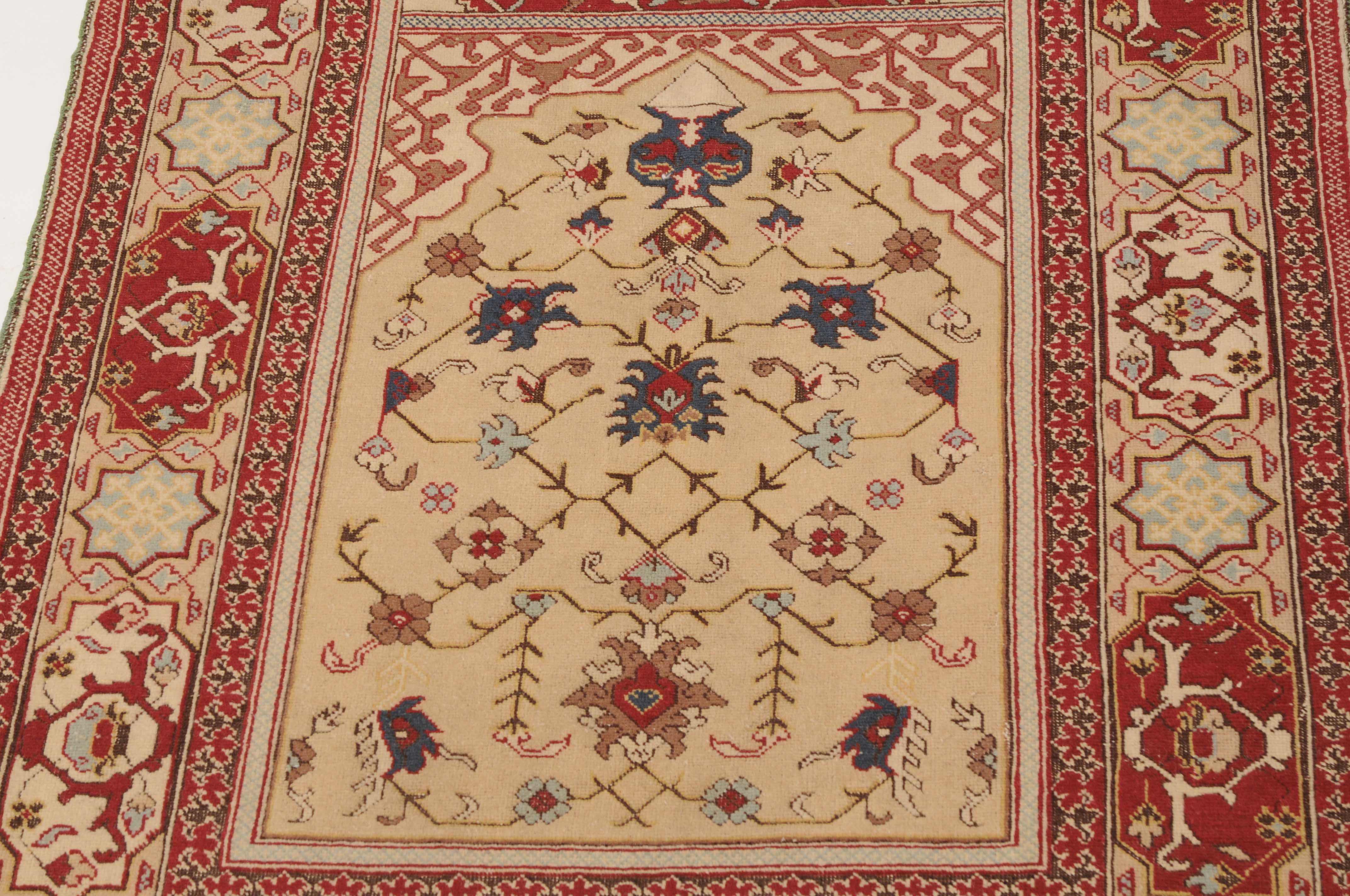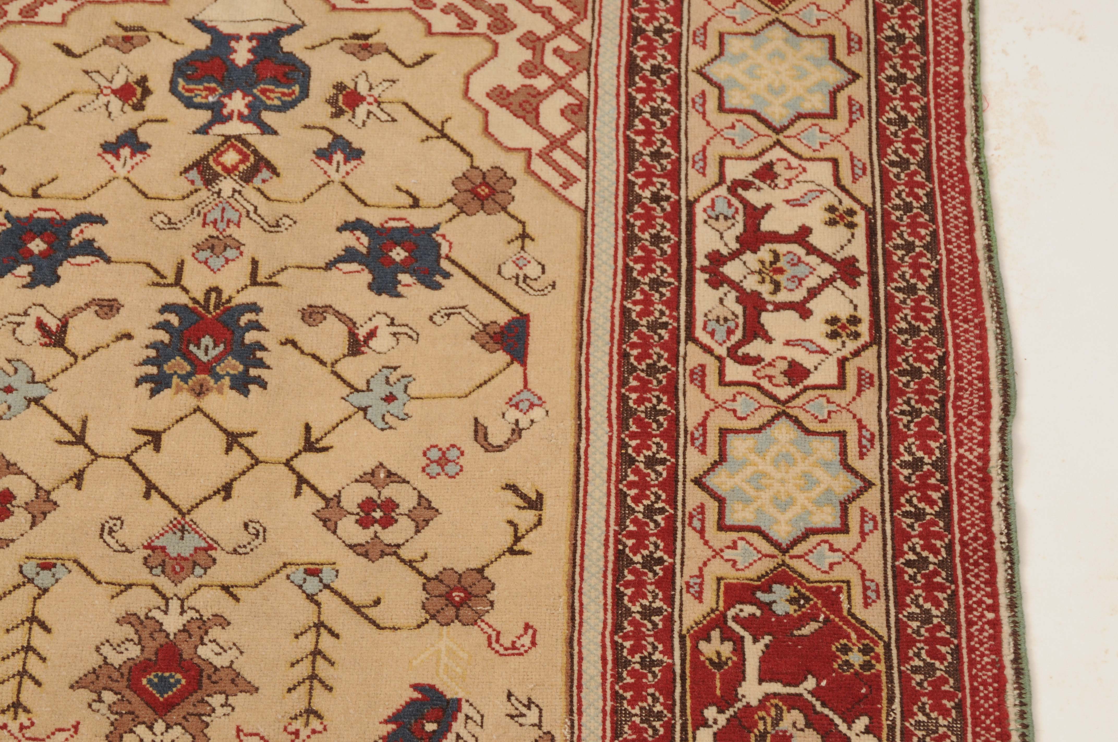 Wohl Rumänien, um 1910. Sog. “Tuduc-Teppich“. Auf cremefarbenem Grund hängt unter einer Gebetsnische (Mihrab) eine Ampel hinab ins Feld, umgeben von verschiedensten Palmetten, Blüten und Blattranken. 2 reziproke Medachylborten umranden die mit effektvollen Medaillon- und Stern-Kartuschen belegte Hauptbordüre. Gebrauchsspuren. 110x144 cm (ft. 3.6x4.8).