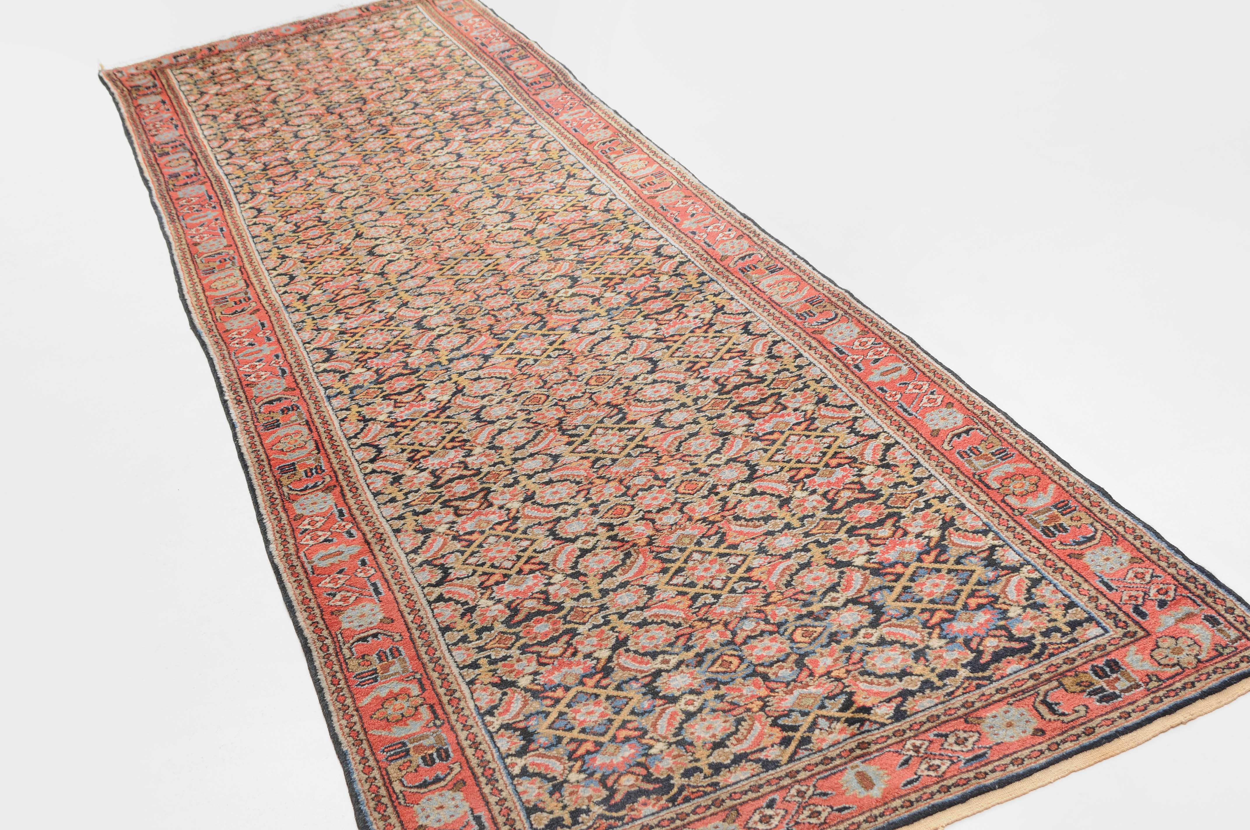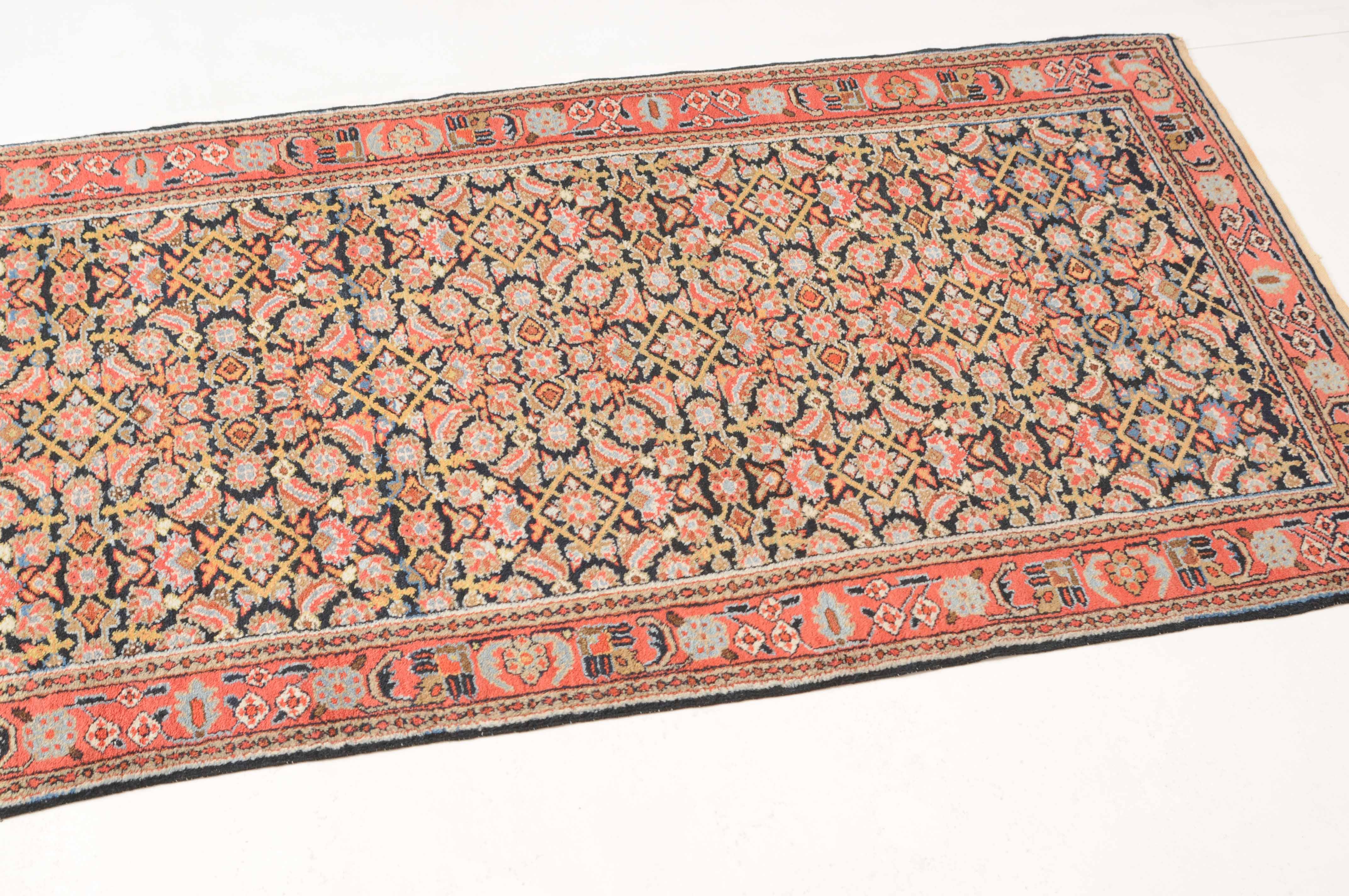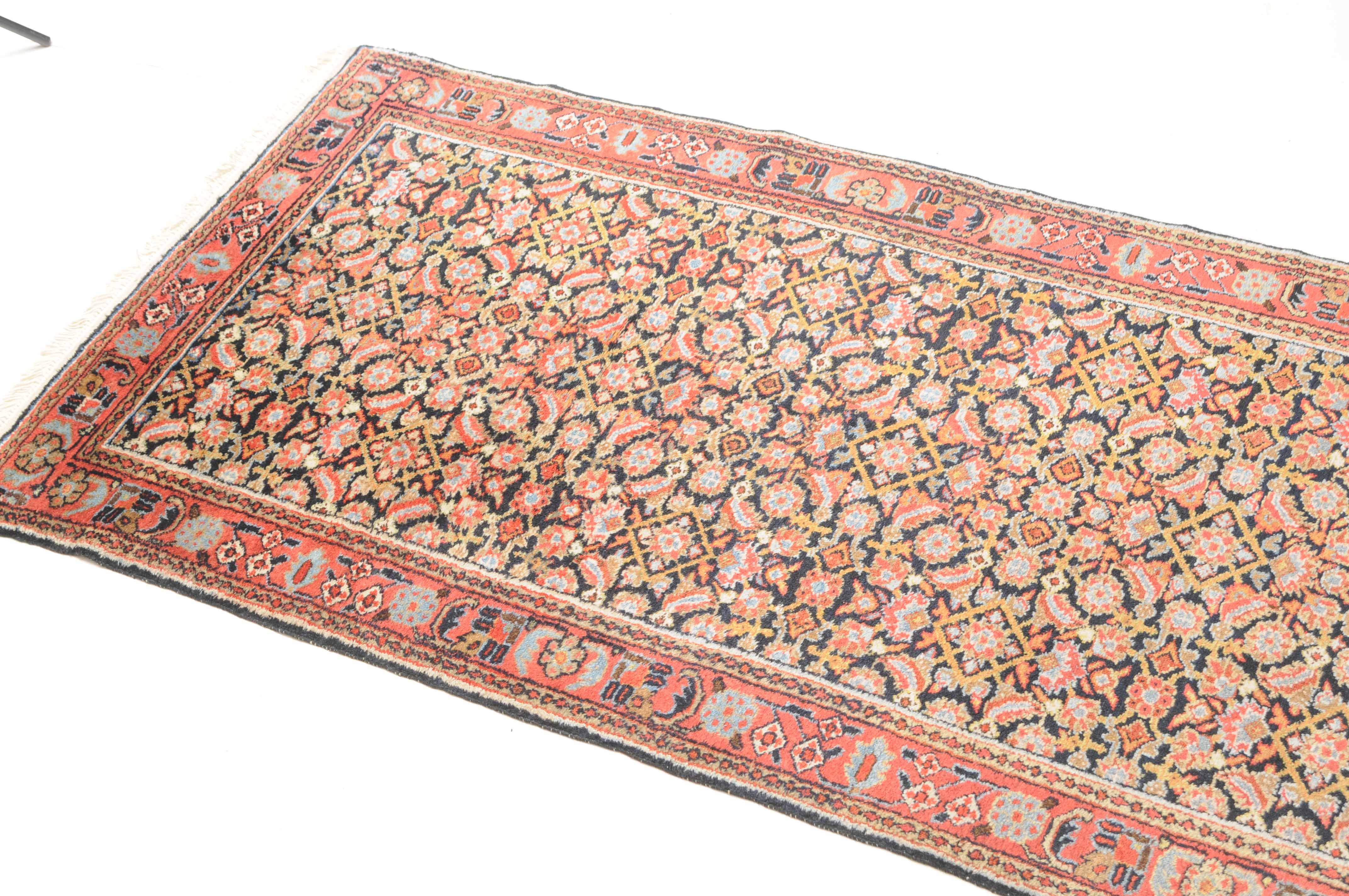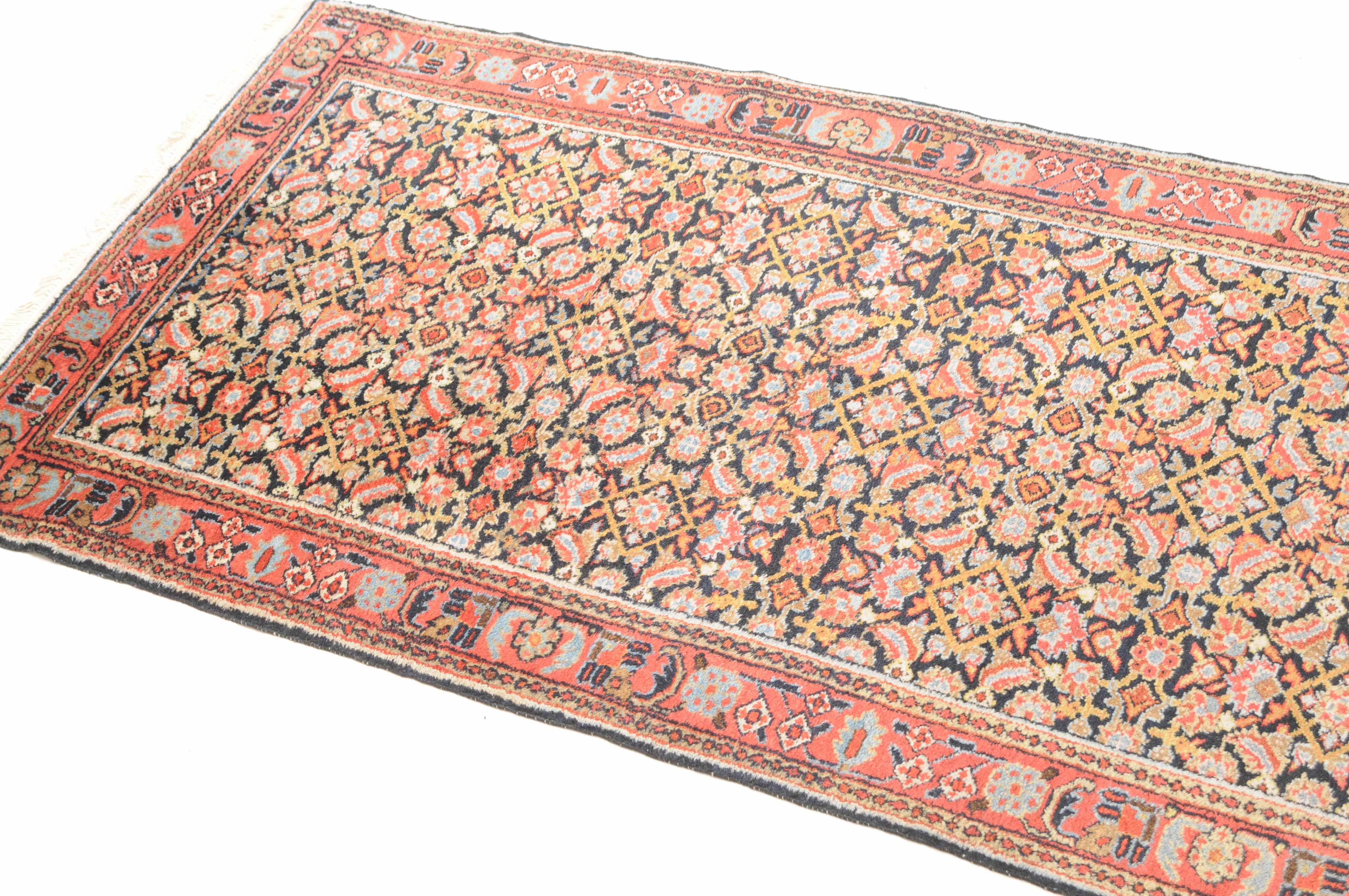 Z-Persien, um 1910. Das gesamte nachtblaue Mittelfeld ist flächendeckend mit einem dekorativen Herati-Streudekor ausstaffiert. 2 Borten umfassen die breite rosarote, mit Blüten und Ranken belegte Hauptbordüre. Sehr gute Erhaltung. 112x388 cm (ft. 3.7x12.8).