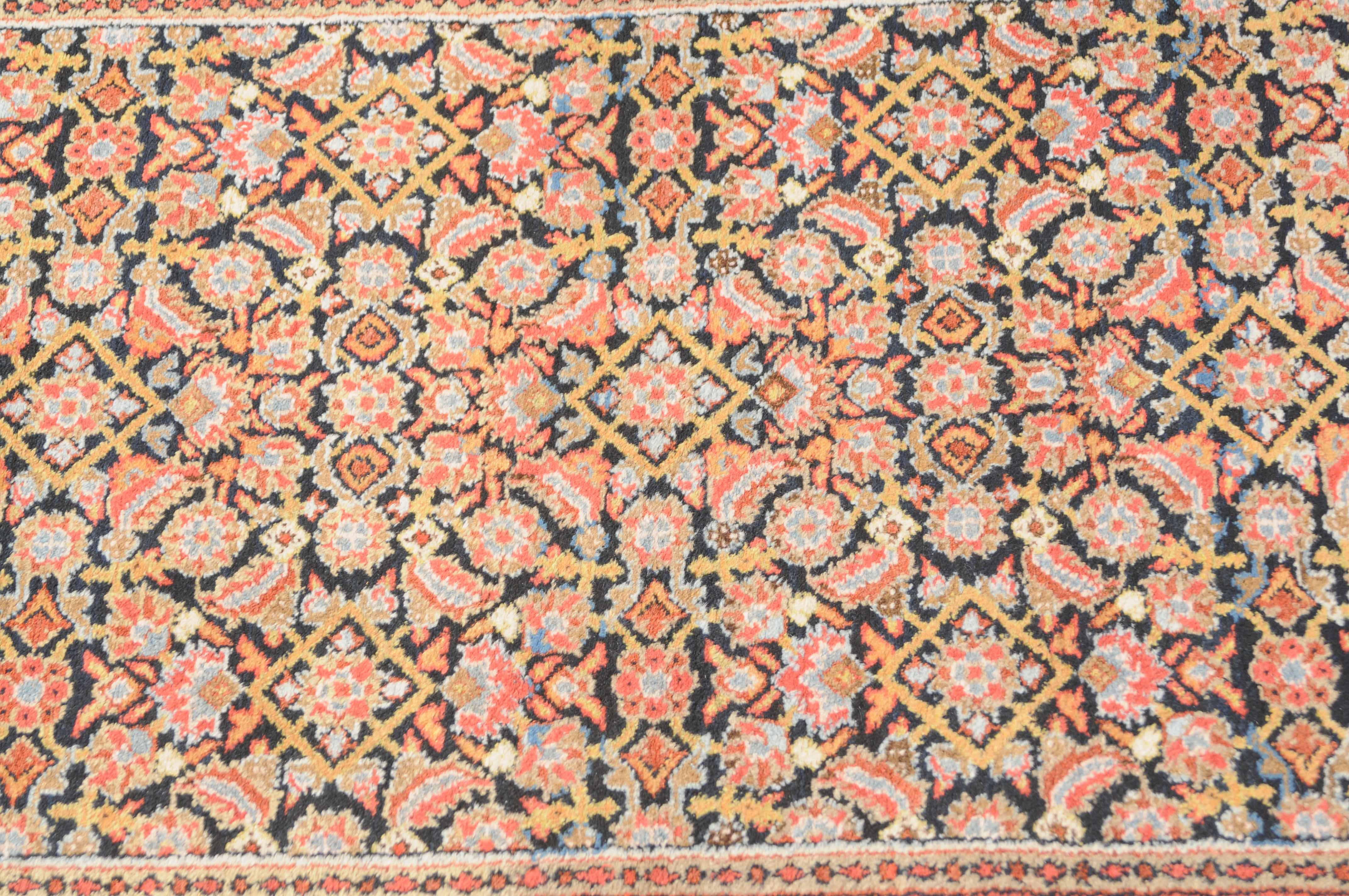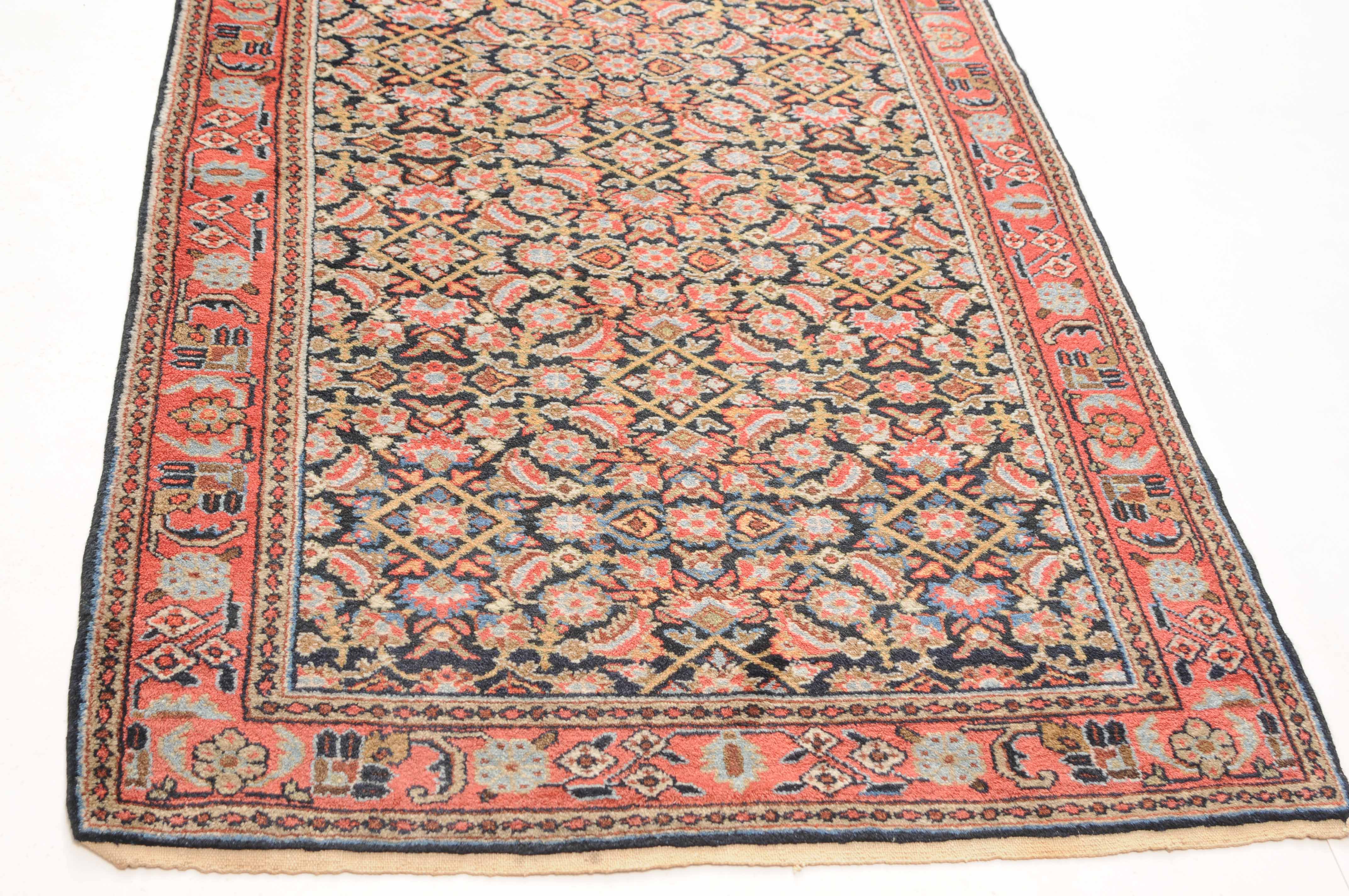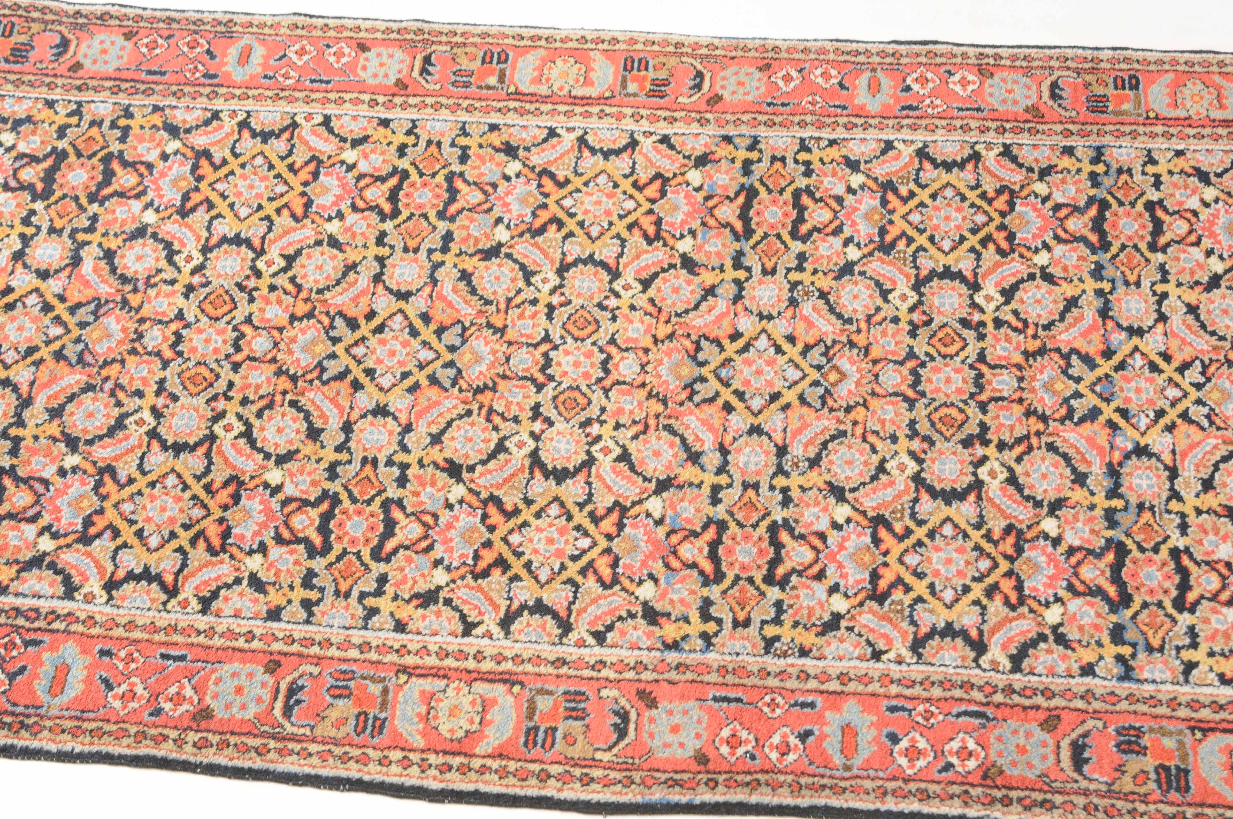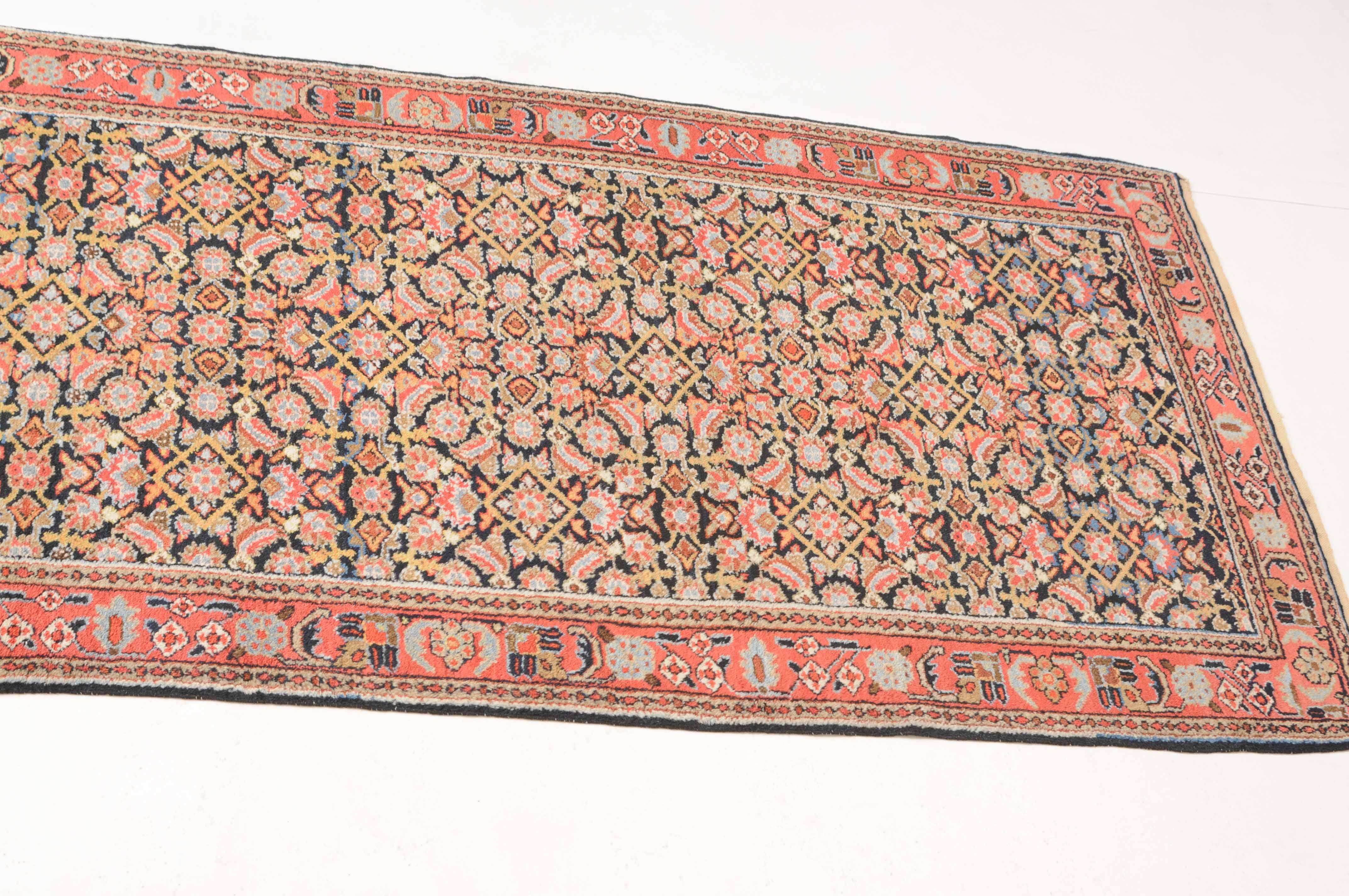 Z-Persien, um 1910. Das gesamte nachtblaue Mittelfeld ist flächendeckend mit einem dekorativen Herati-Streudekor ausstaffiert. 2 Borten umfassen die breite rosarote, mit Blüten und Ranken belegte Hauptbordüre. Sehr gute Erhaltung. 112x388 cm (ft. 3.7x12.8).