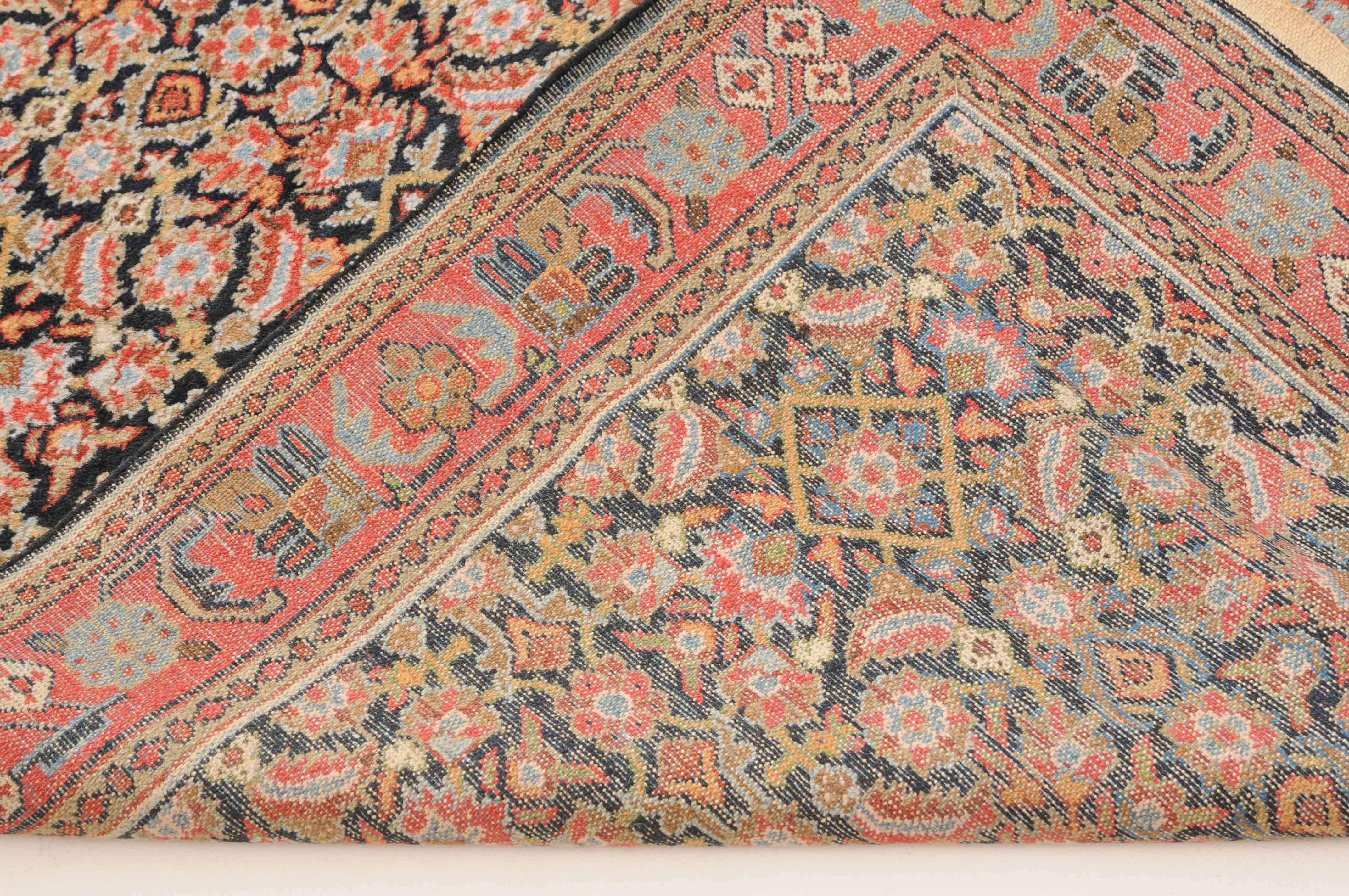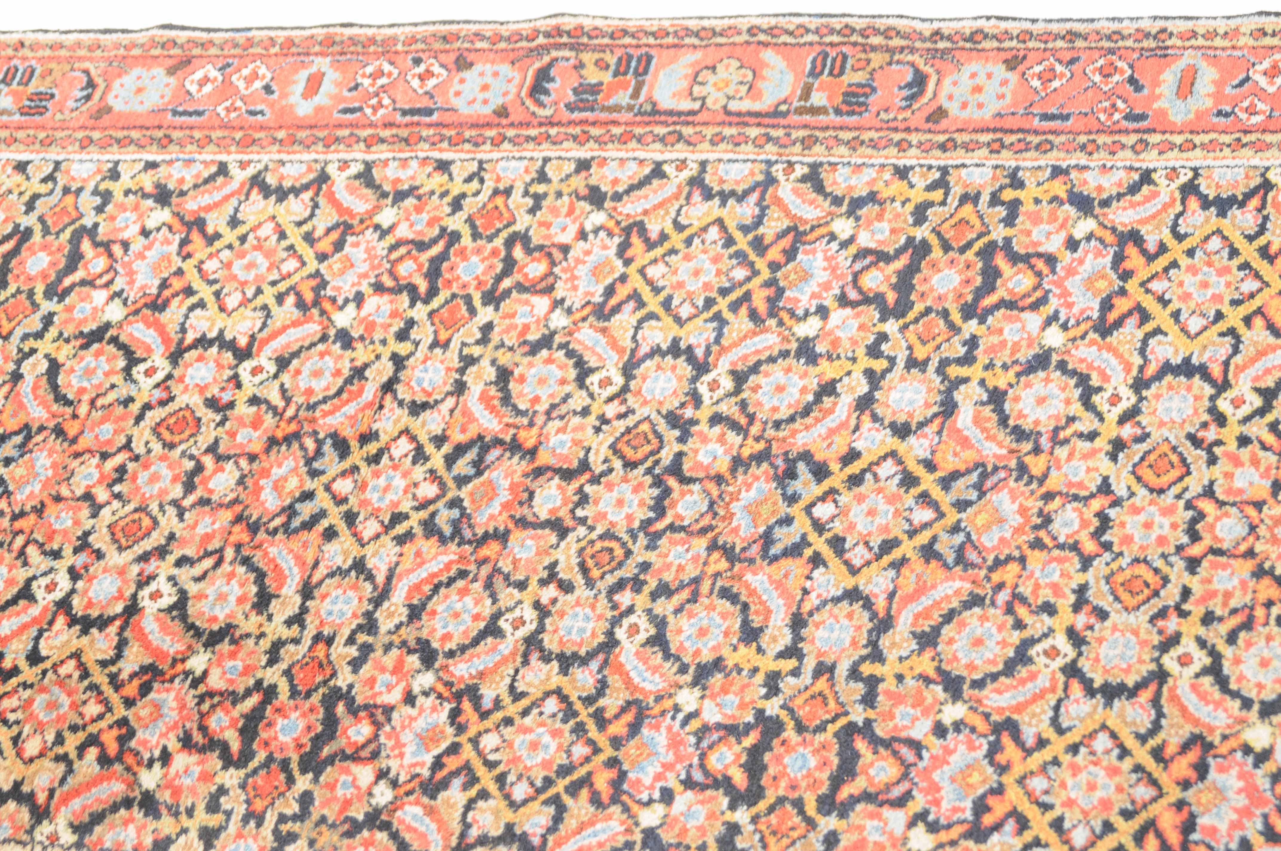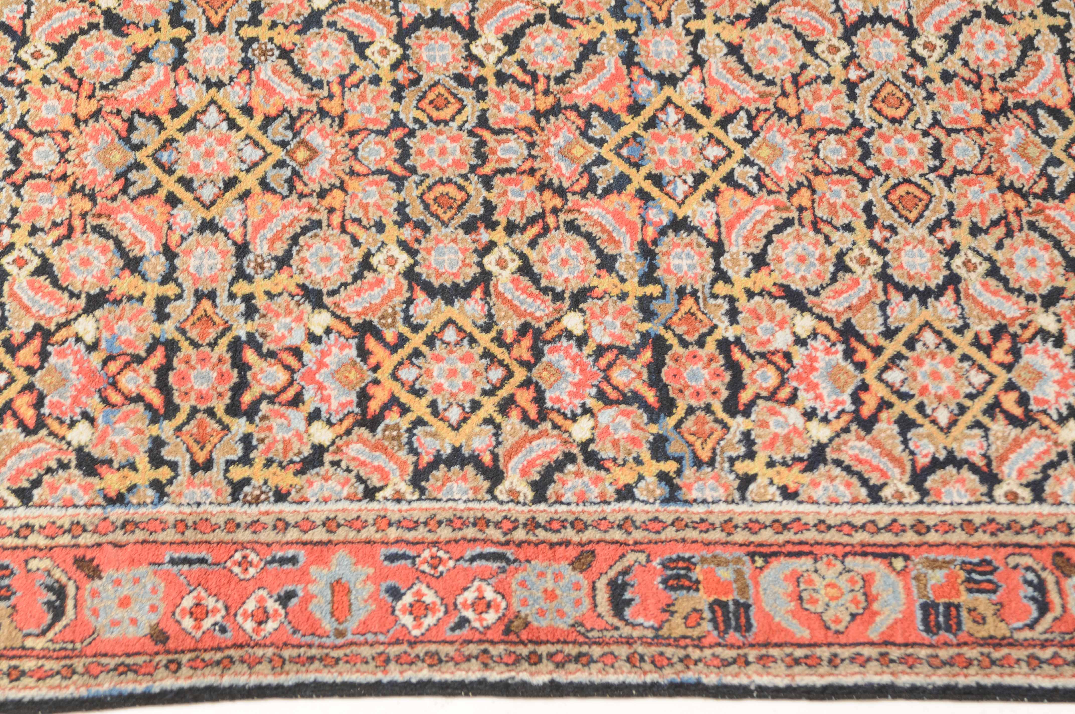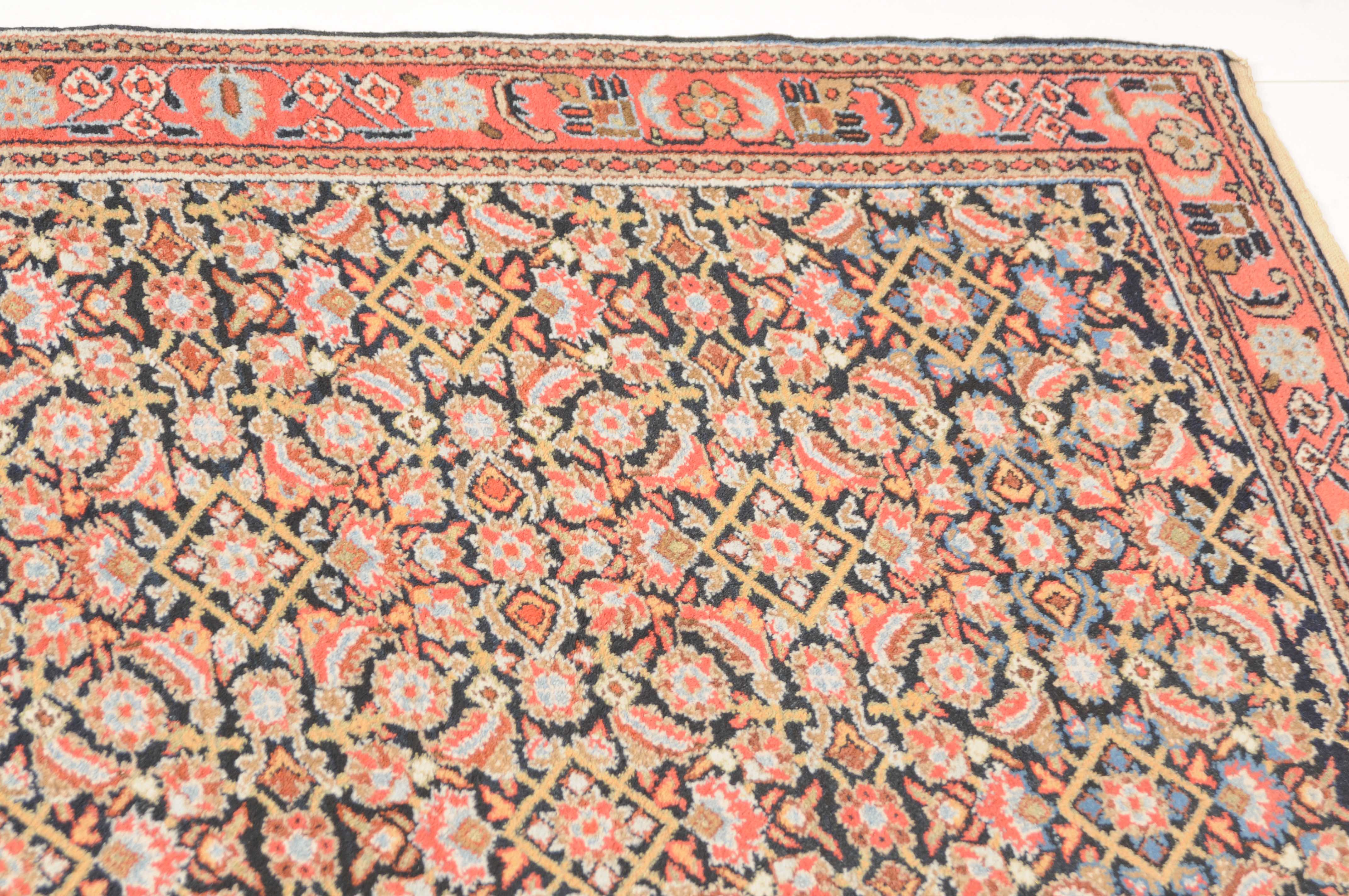 Z-Persien, um 1910. Das gesamte nachtblaue Mittelfeld ist flächendeckend mit einem dekorativen Herati-Streudekor ausstaffiert. 2 Borten umfassen die breite rosarote, mit Blüten und Ranken belegte Hauptbordüre. Sehr gute Erhaltung. 112x388 cm (ft. 3.7x12.8).