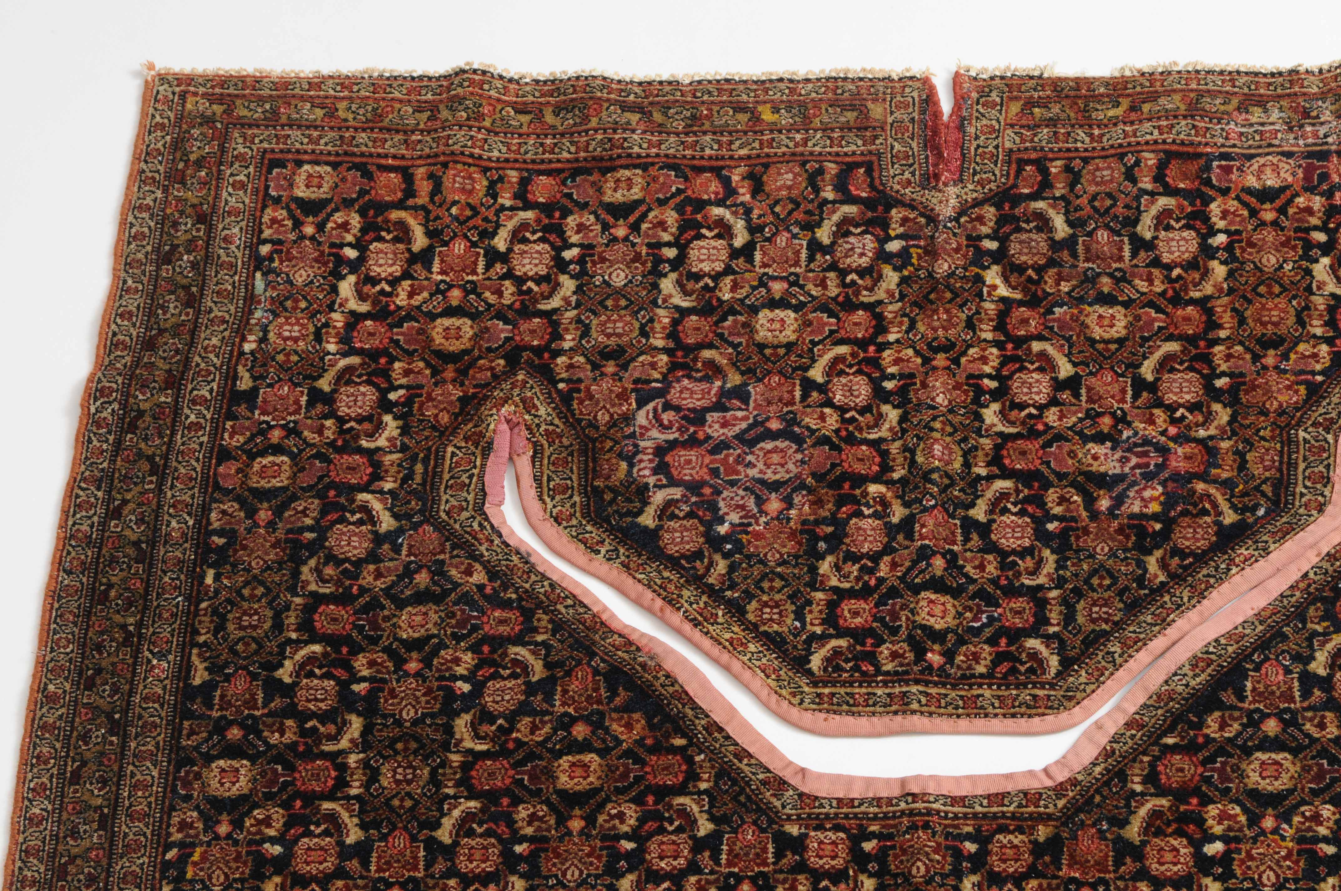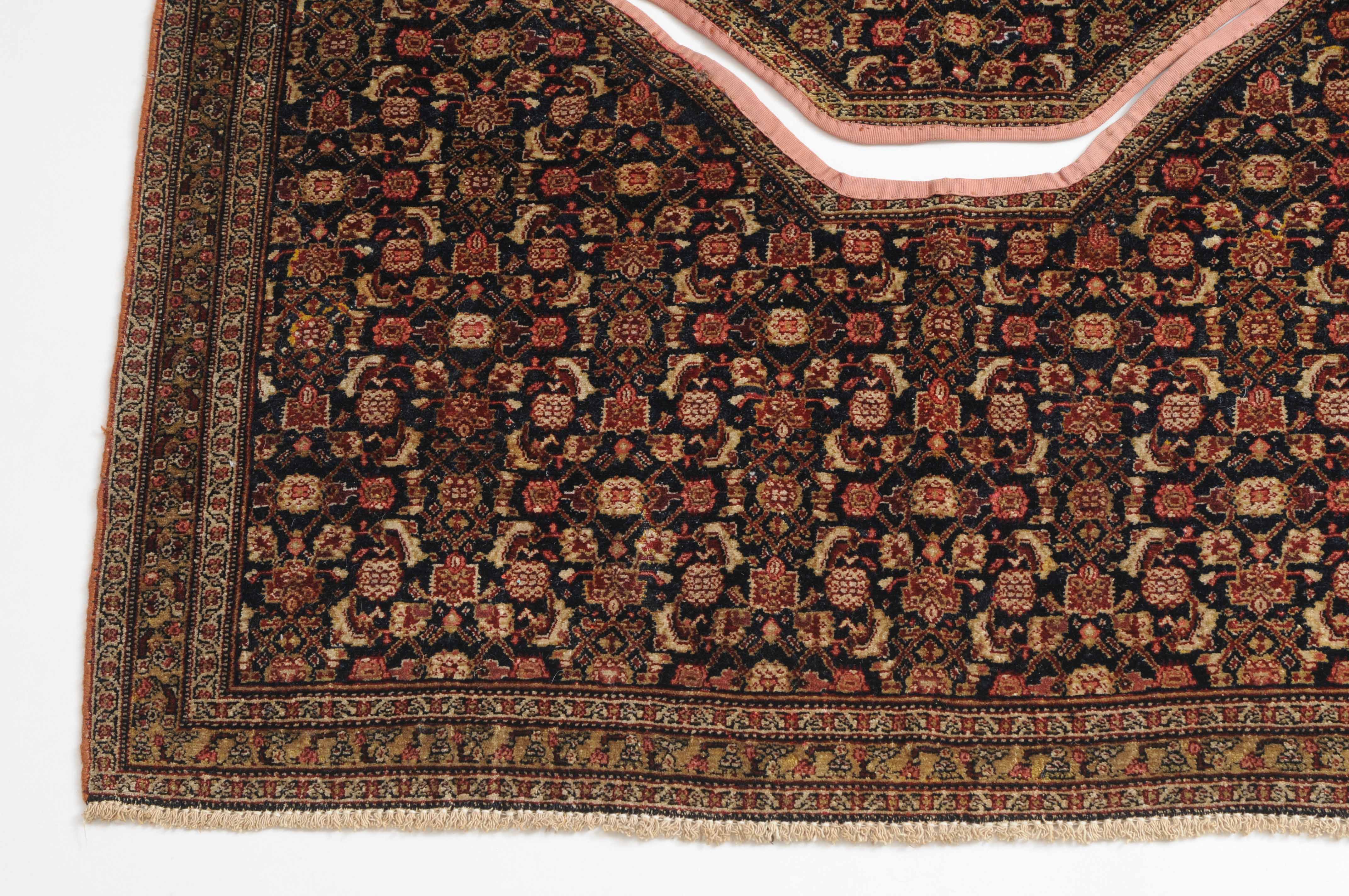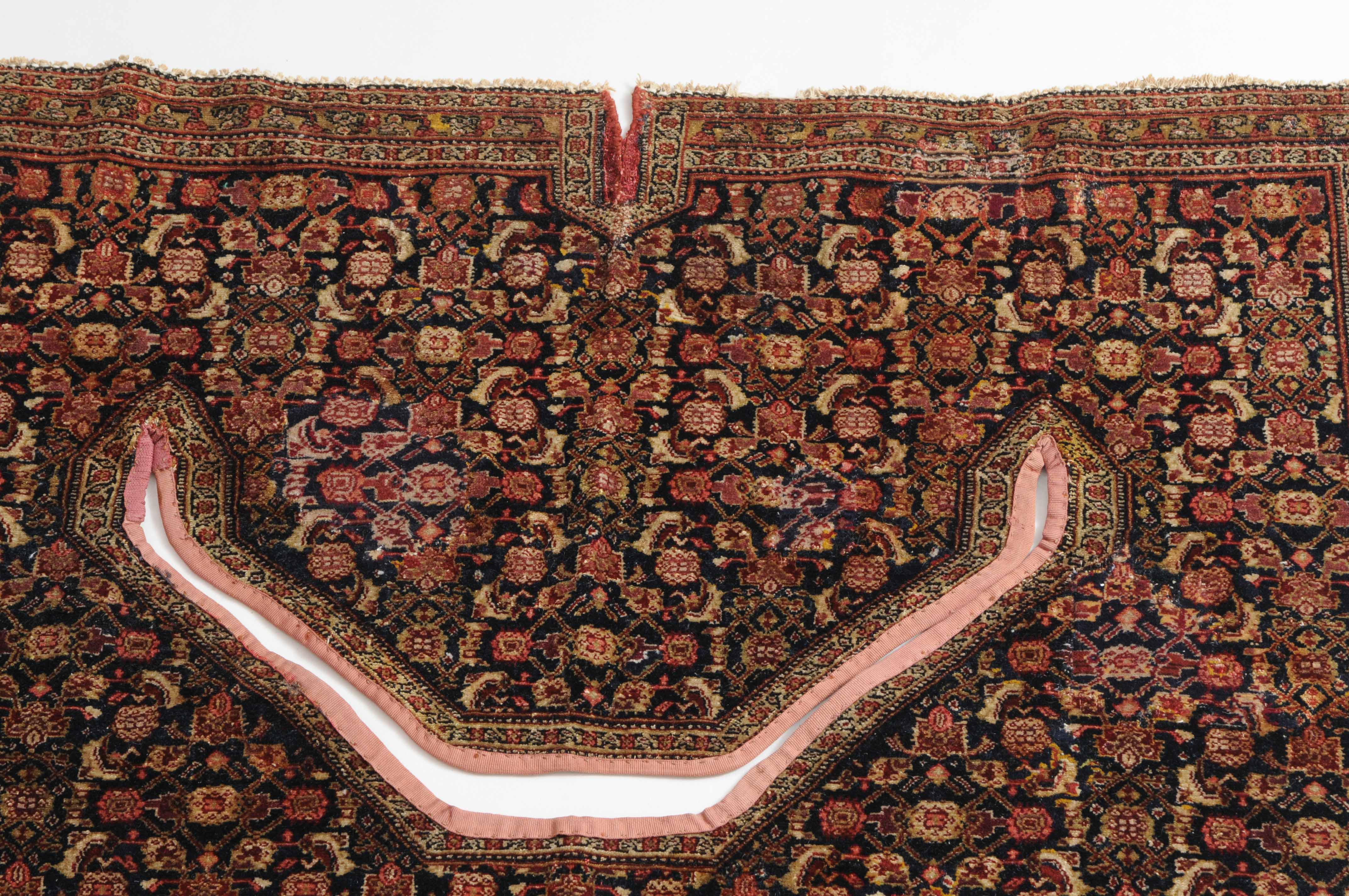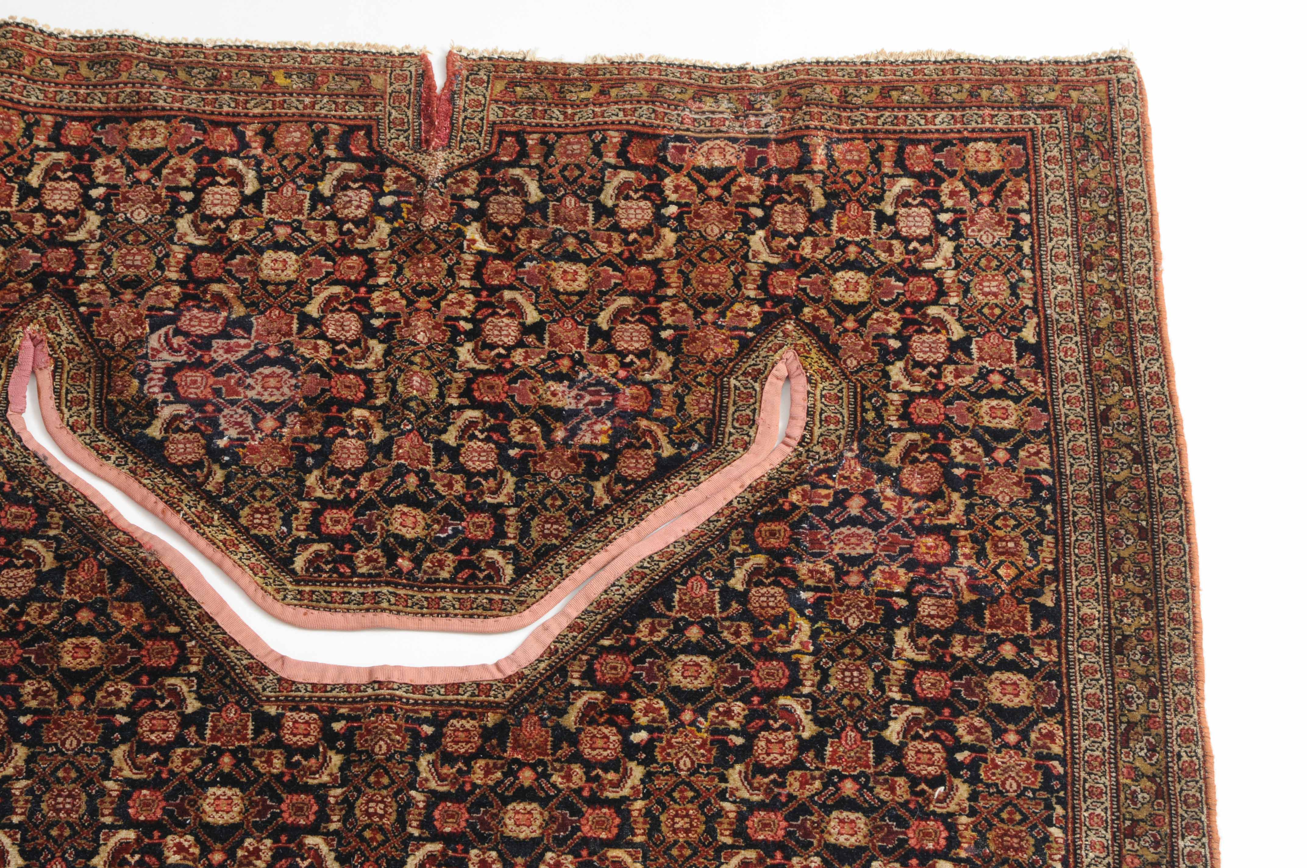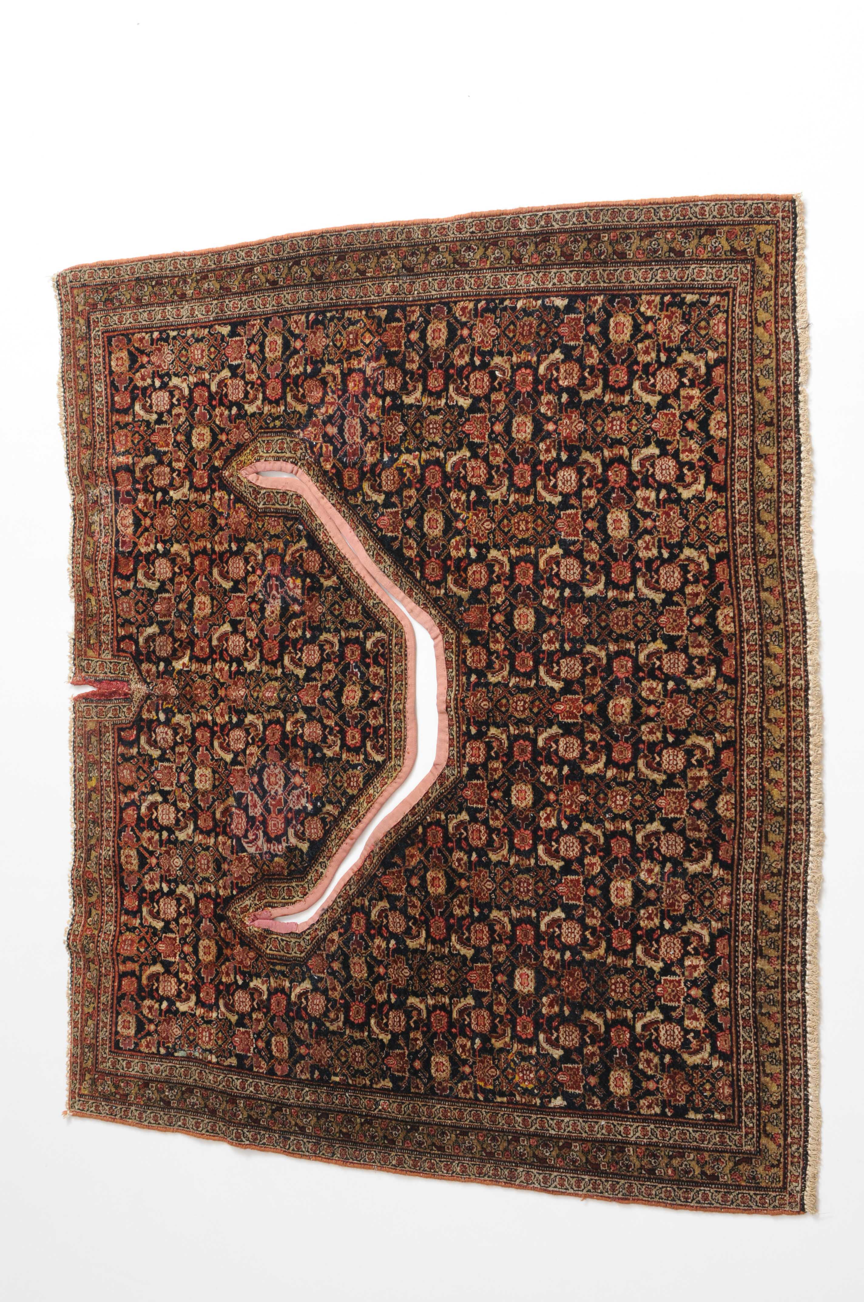 W-Persien, um 1900. Feine Knüpfung. Der tiefblaue Grund ist durchgehend mit einem dekorativen Senne-Streudekor überzogen, mit einem für Satteldecken üblichen Spalt in der Mitte. 2 Rosettenborten säumen die schmale, für Senne-Teppiche charakteristische Bordüre. Mehrere alte reparierte Stellen, ansonsten sehr gute Erhaltung. 95x110 cm (ft. 3.1x3.6).