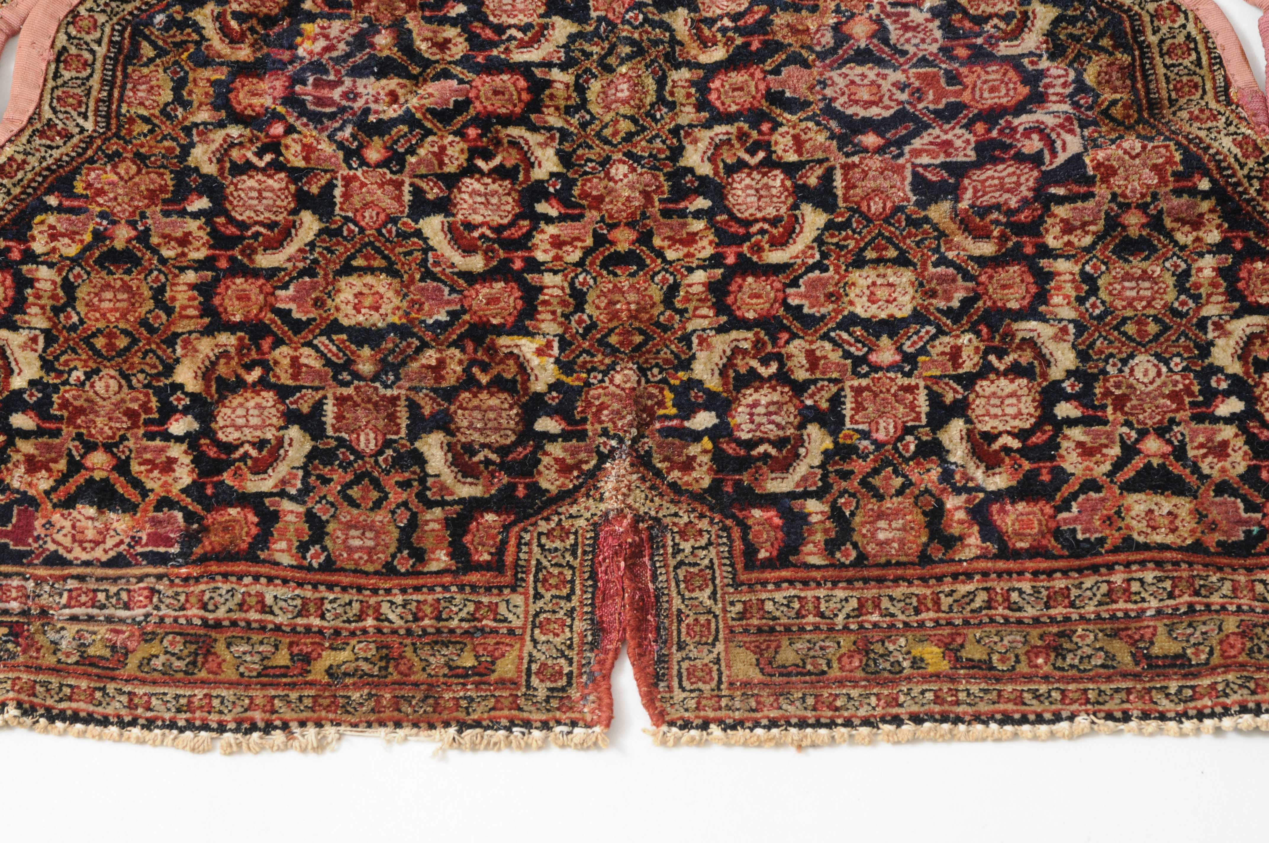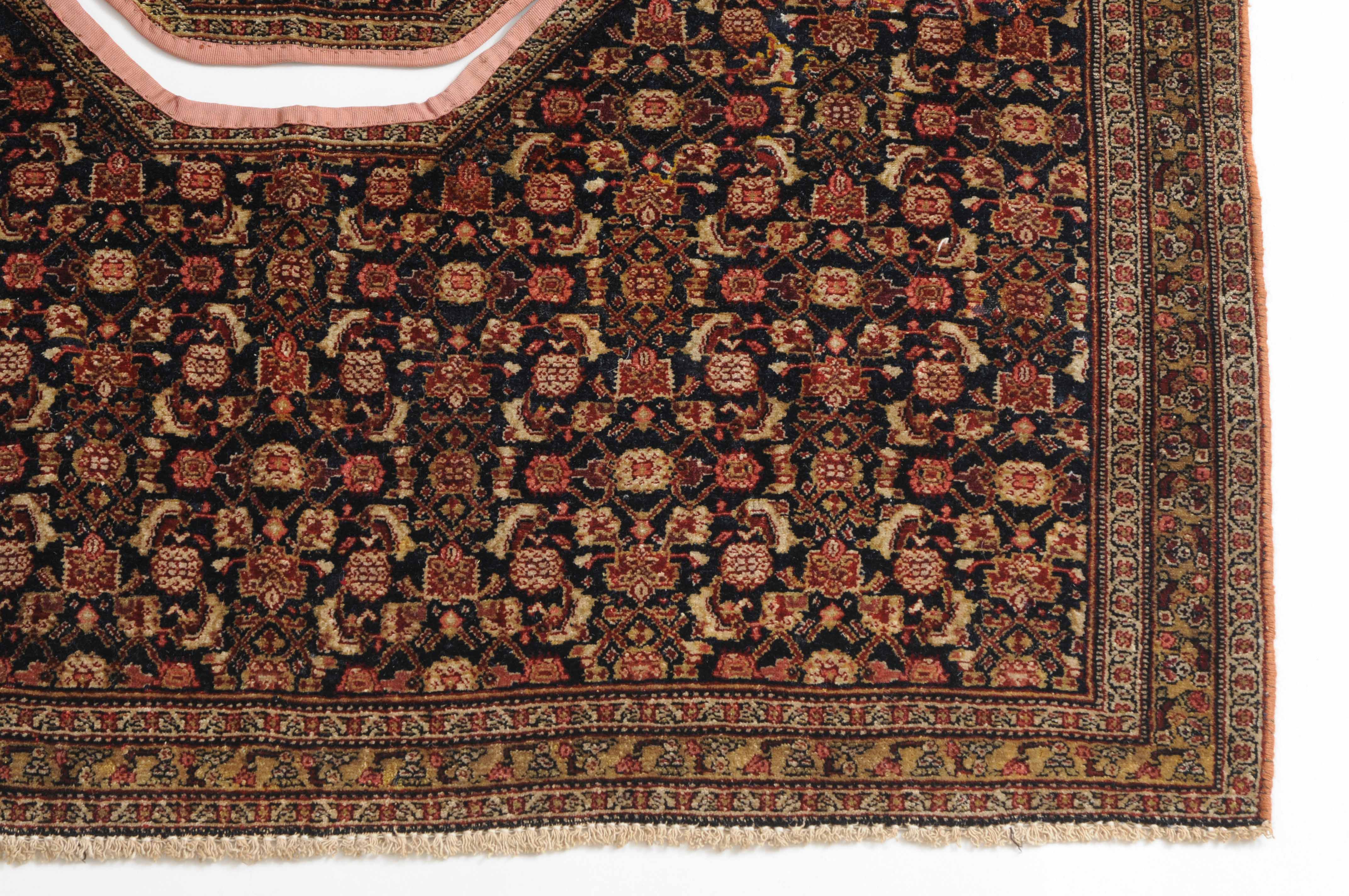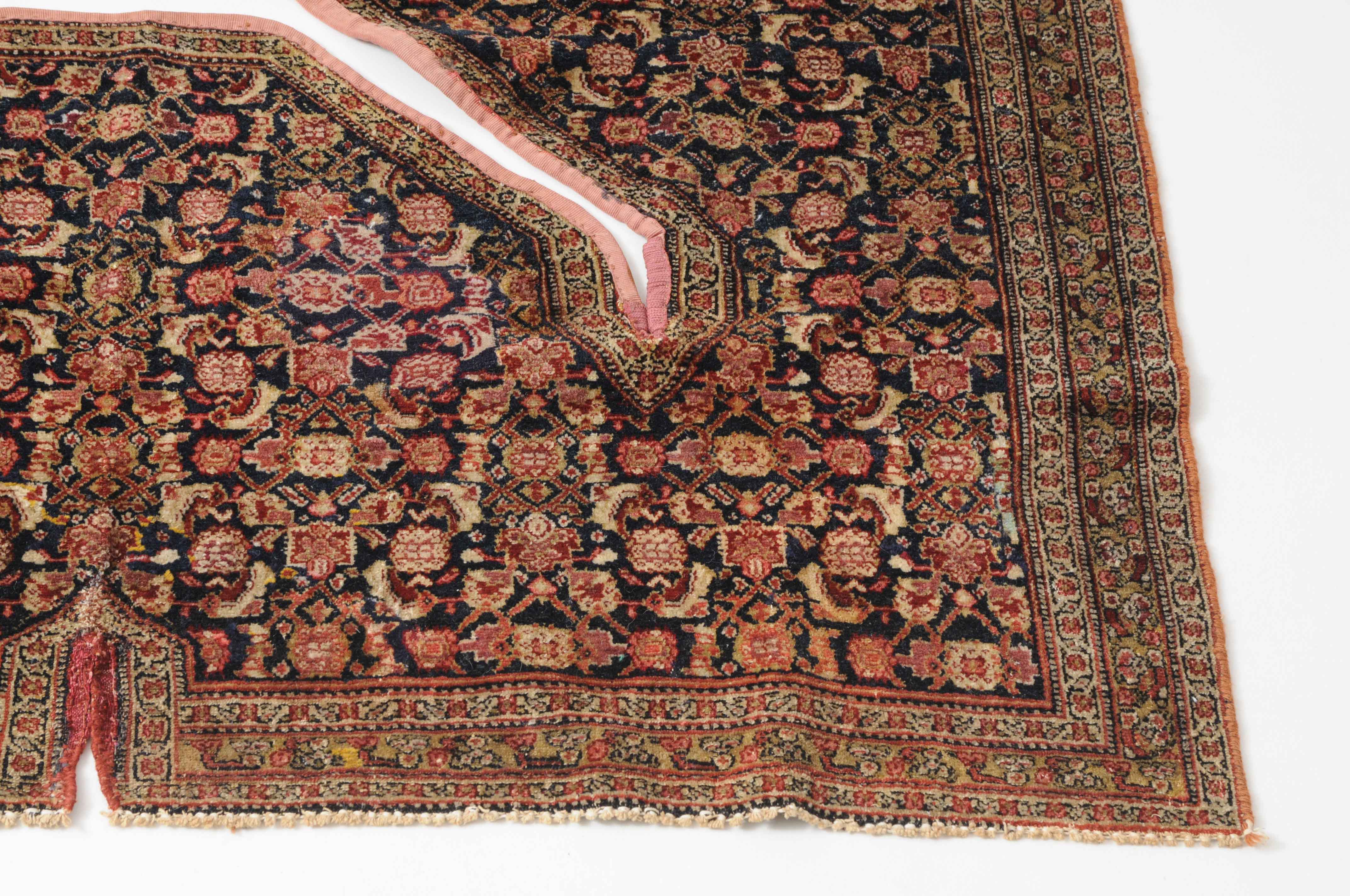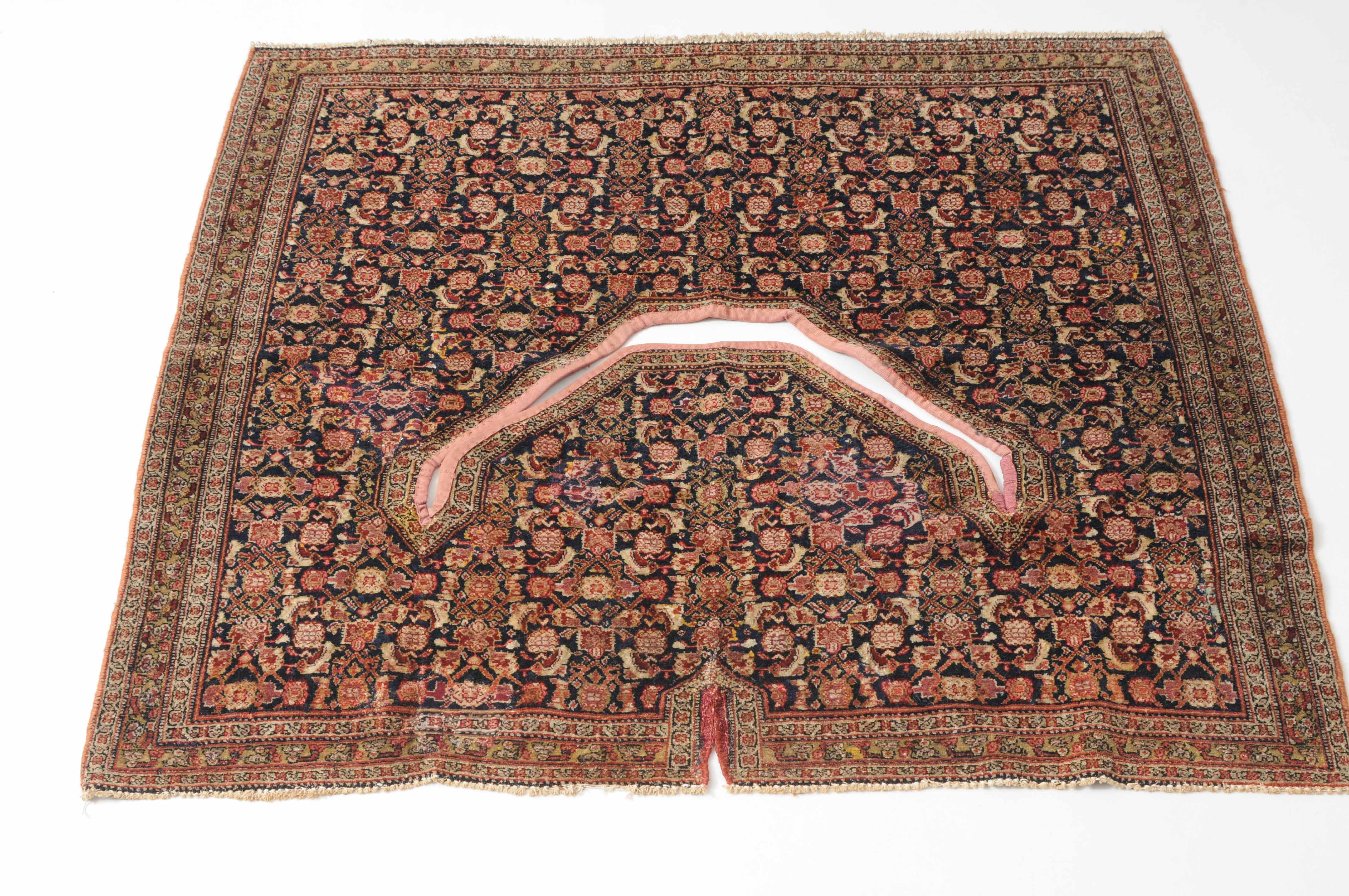 W-Persien, um 1900. Feine Knüpfung. Der tiefblaue Grund ist durchgehend mit einem dekorativen Senne-Streudekor überzogen, mit einem für Satteldecken üblichen Spalt in der Mitte. 2 Rosettenborten säumen die schmale, für Senne-Teppiche charakteristische Bordüre. Mehrere alte reparierte Stellen, ansonsten sehr gute Erhaltung. 95x110 cm (ft. 3.1x3.6).