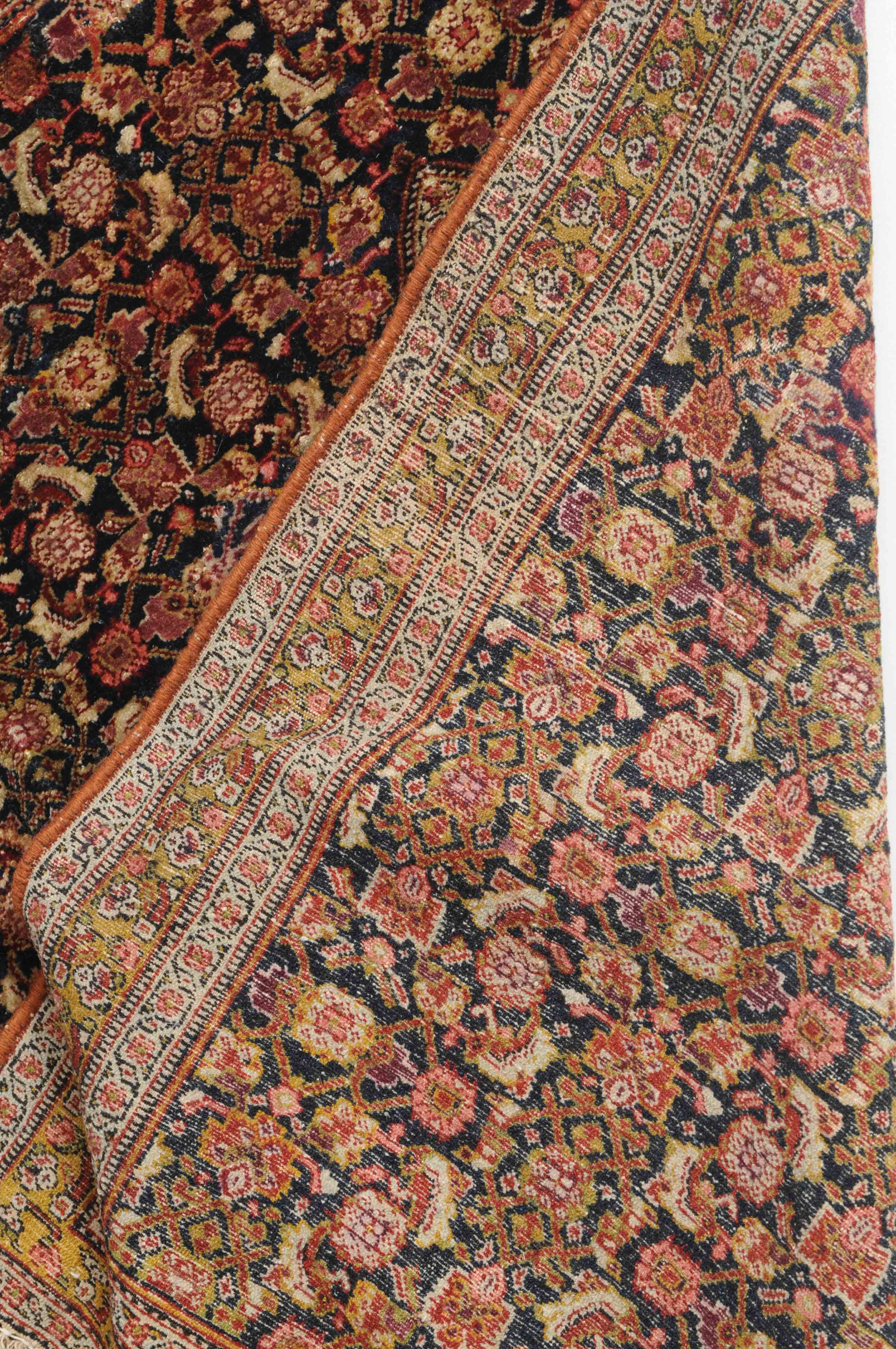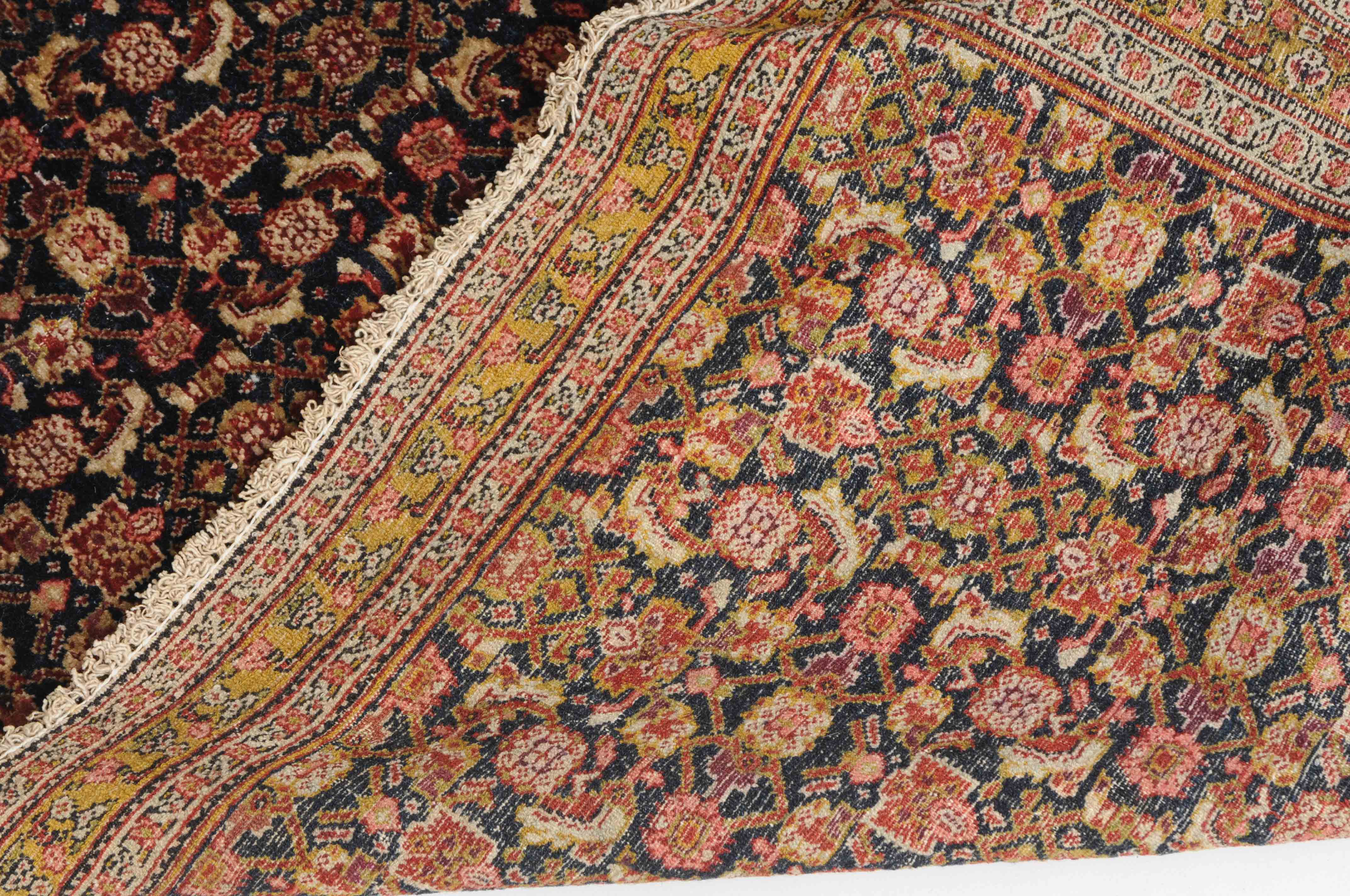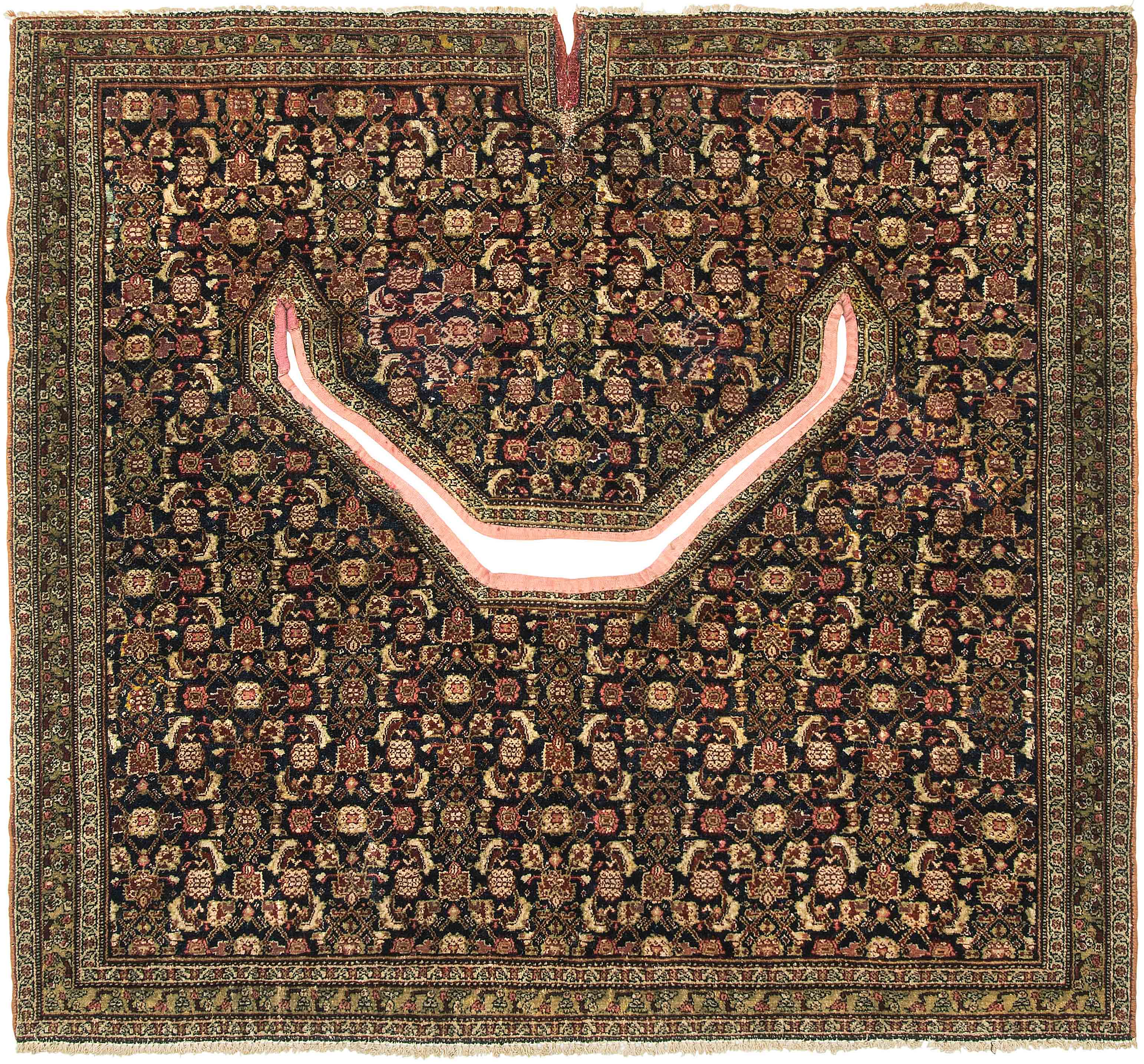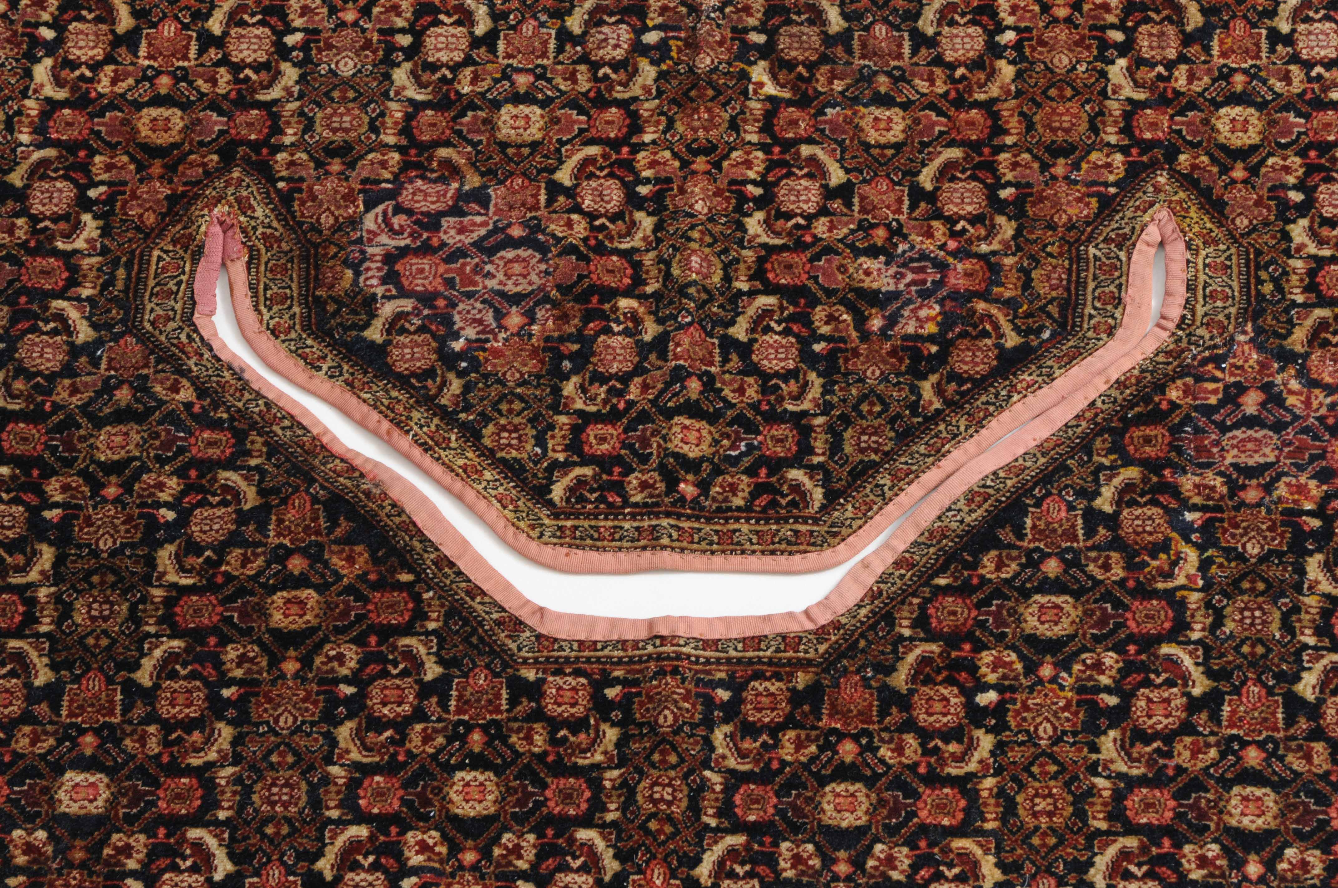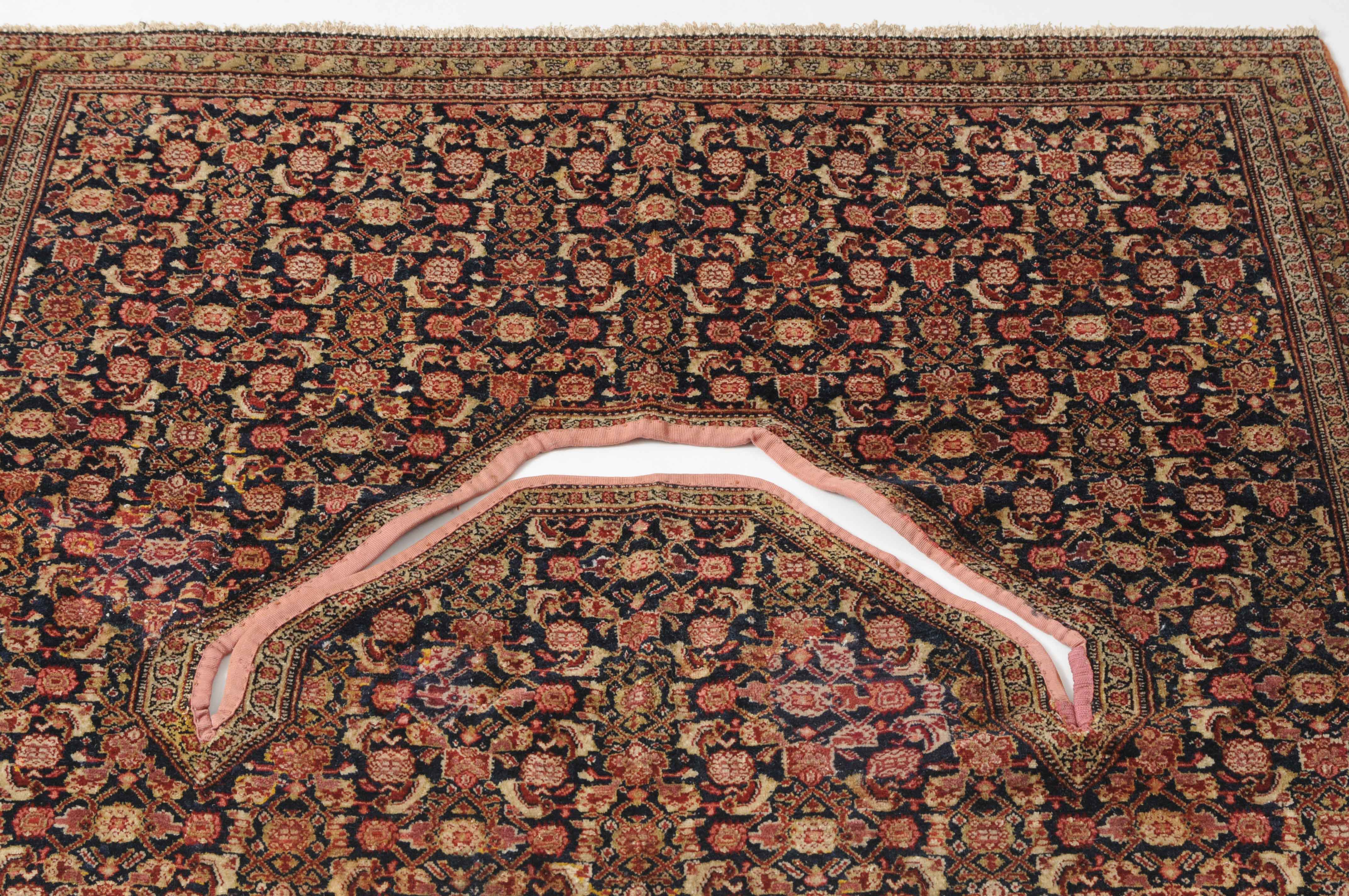 W-Persien, um 1900. Feine Knüpfung. Der tiefblaue Grund ist durchgehend mit einem dekorativen Senne-Streudekor überzogen, mit einem für Satteldecken üblichen Spalt in der Mitte. 2 Rosettenborten säumen die schmale, für Senne-Teppiche charakteristische Bordüre. Mehrere alte reparierte Stellen, ansonsten sehr gute Erhaltung. 95x110 cm (ft. 3.1x3.6).