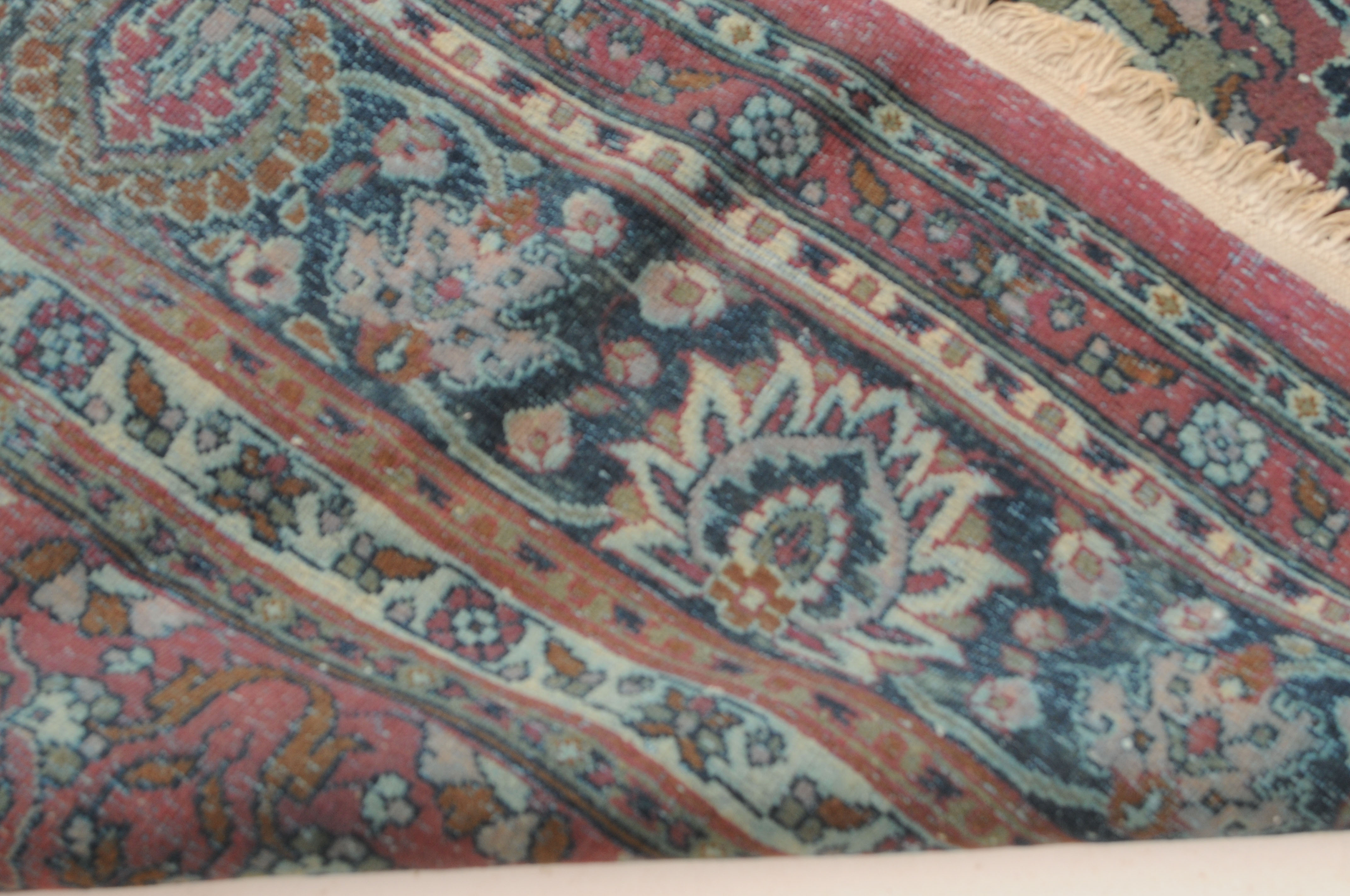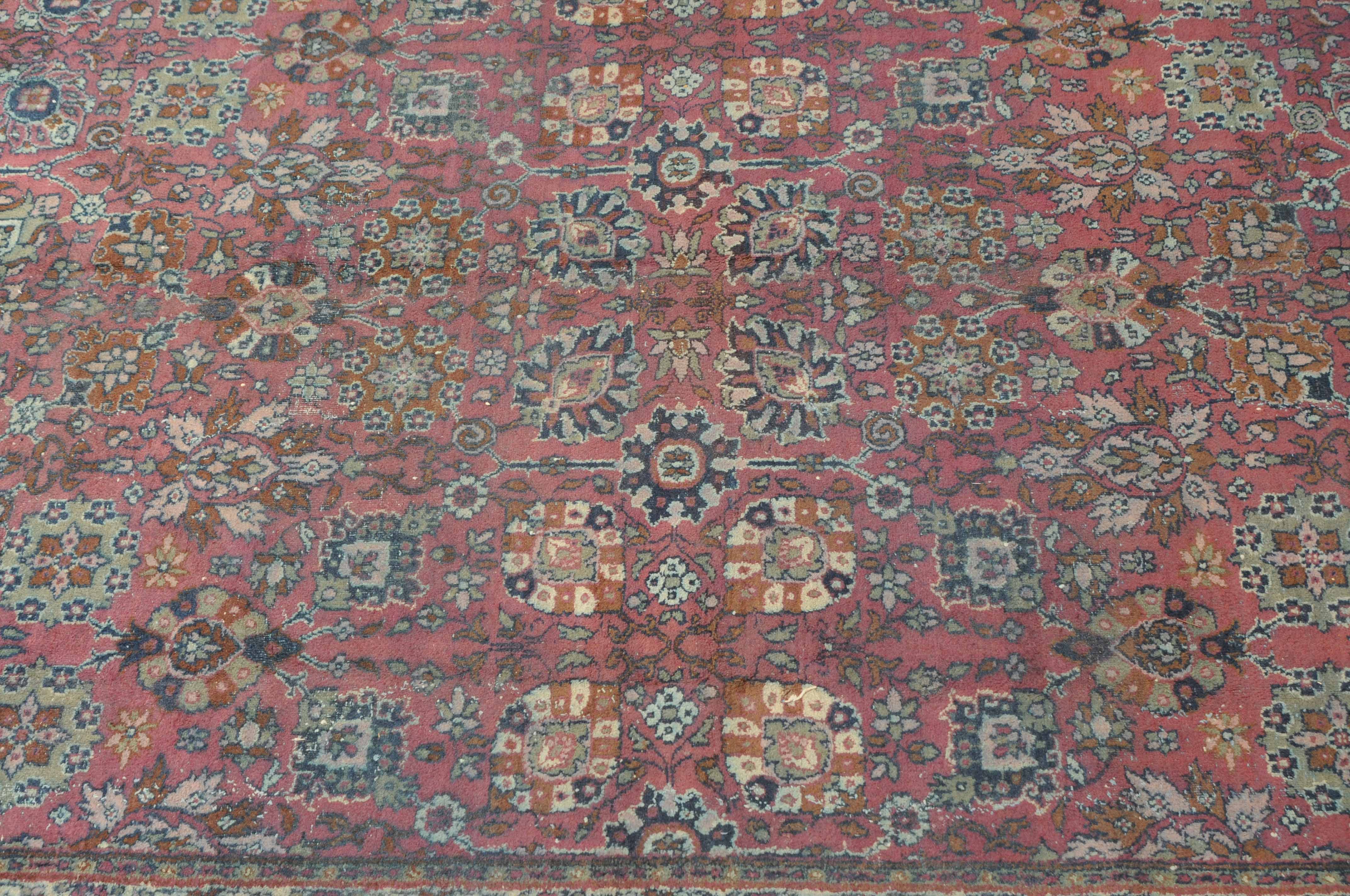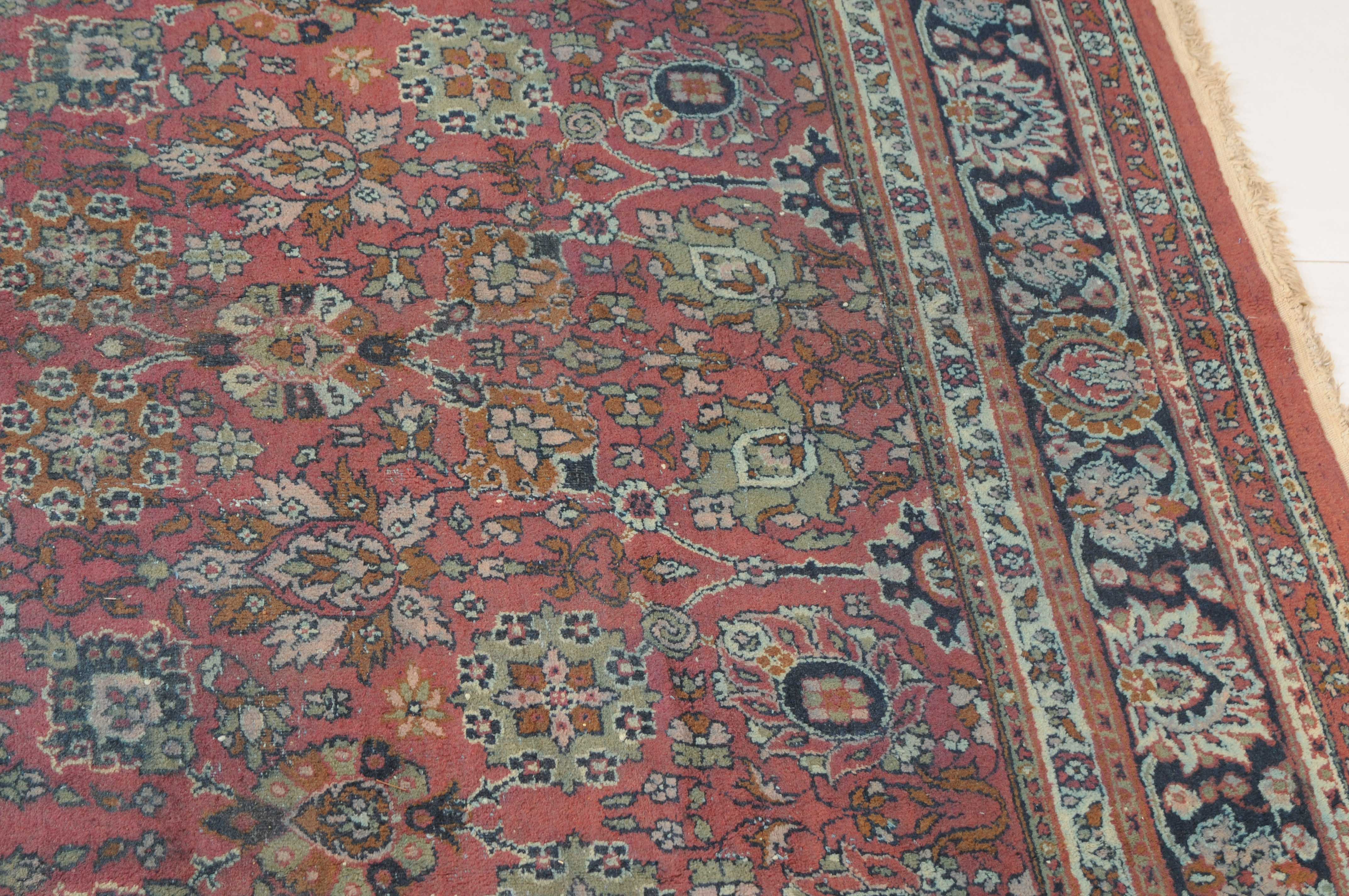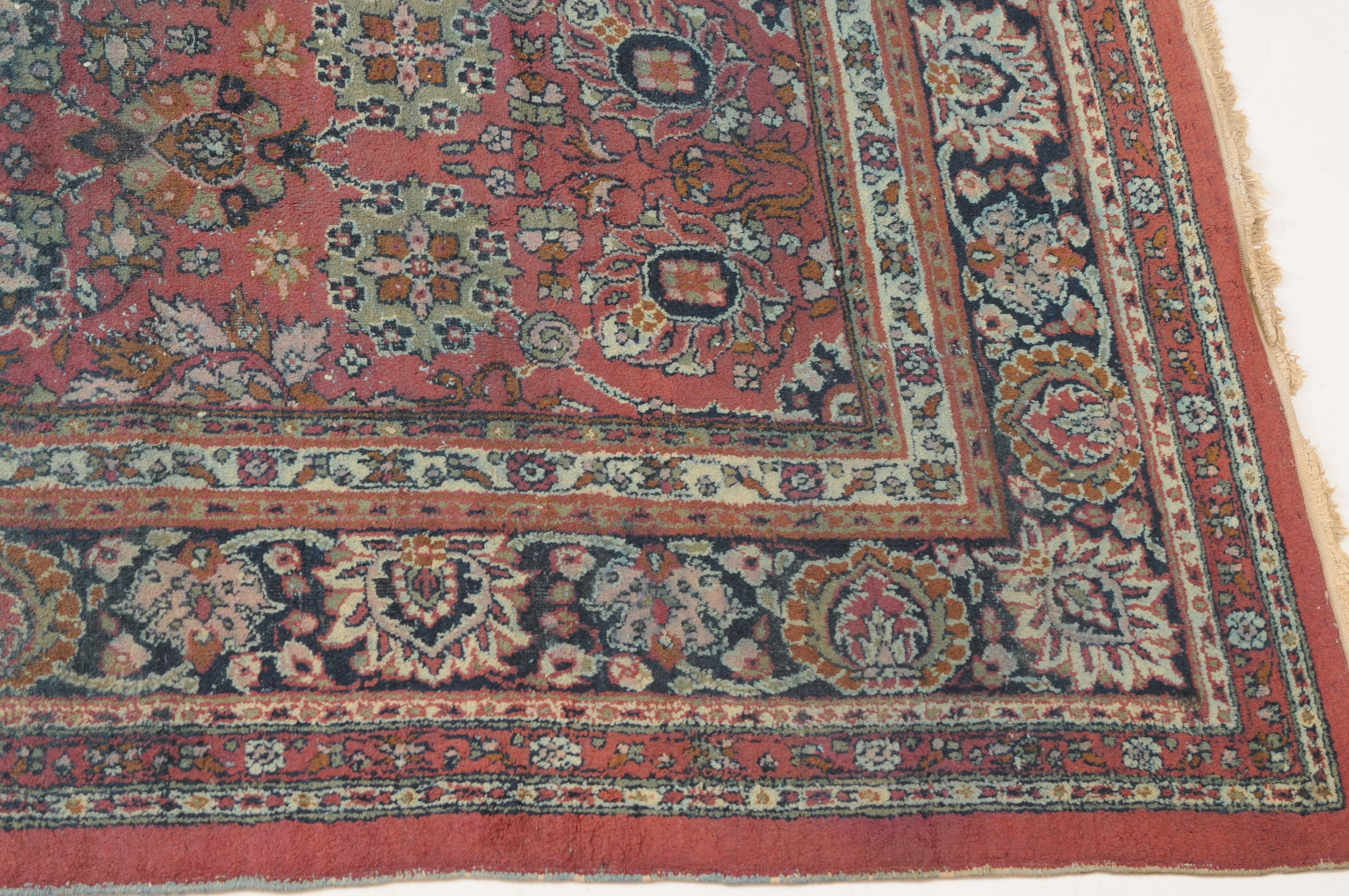 N-Indien, um 1910. Das elegante rote Mittelfeld ist durchgehend mit Palmetten, Blattranken und Blüten in unendlichem Rapport überzogen. 2 Nebenbordüren säumen die breite, ebenfalls mit Palmetten, Blüten und Blattranken geschmückte Hauptbordüre. Fleckig, Gebrauchsspuren. 275x355 cm (ft. 9.1x11.7).