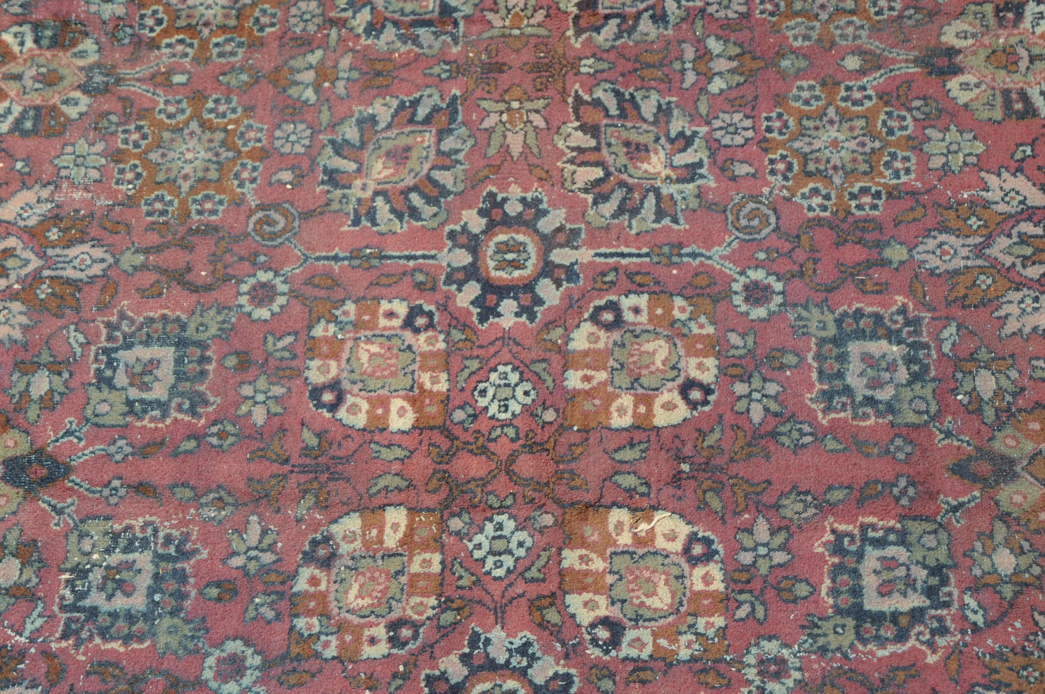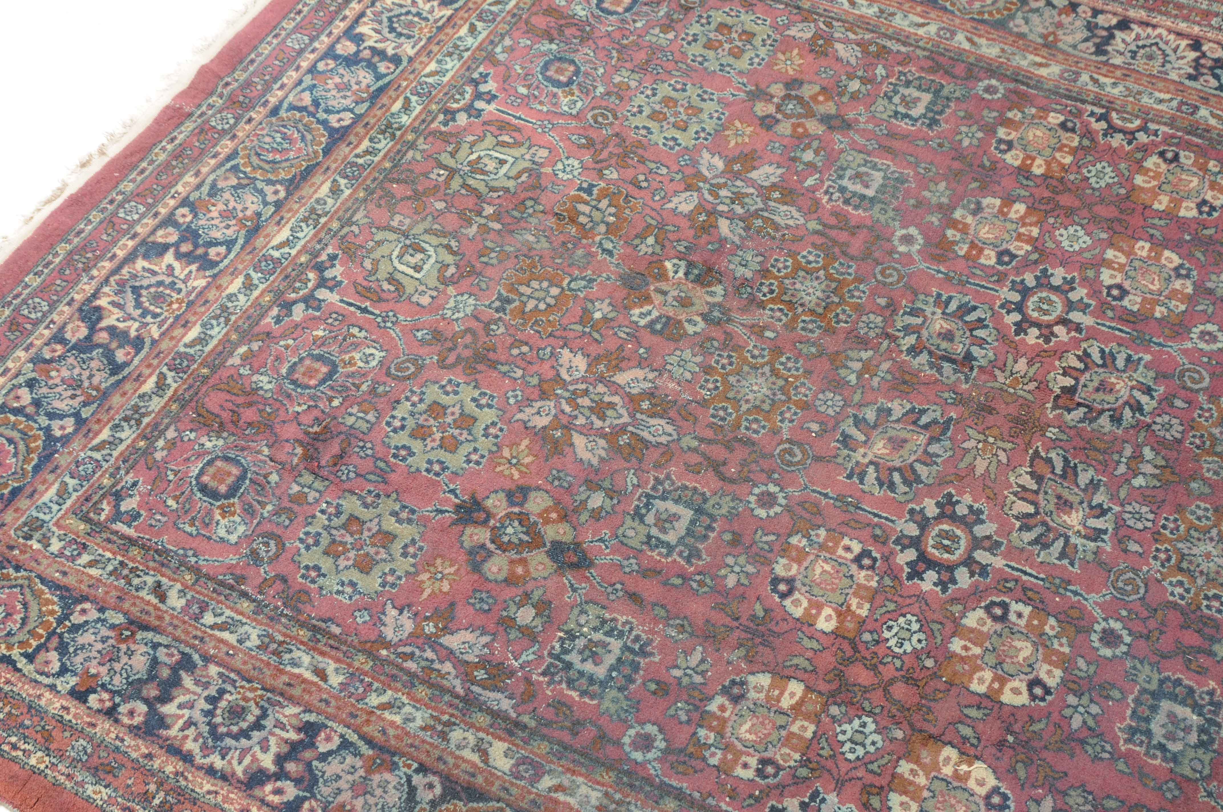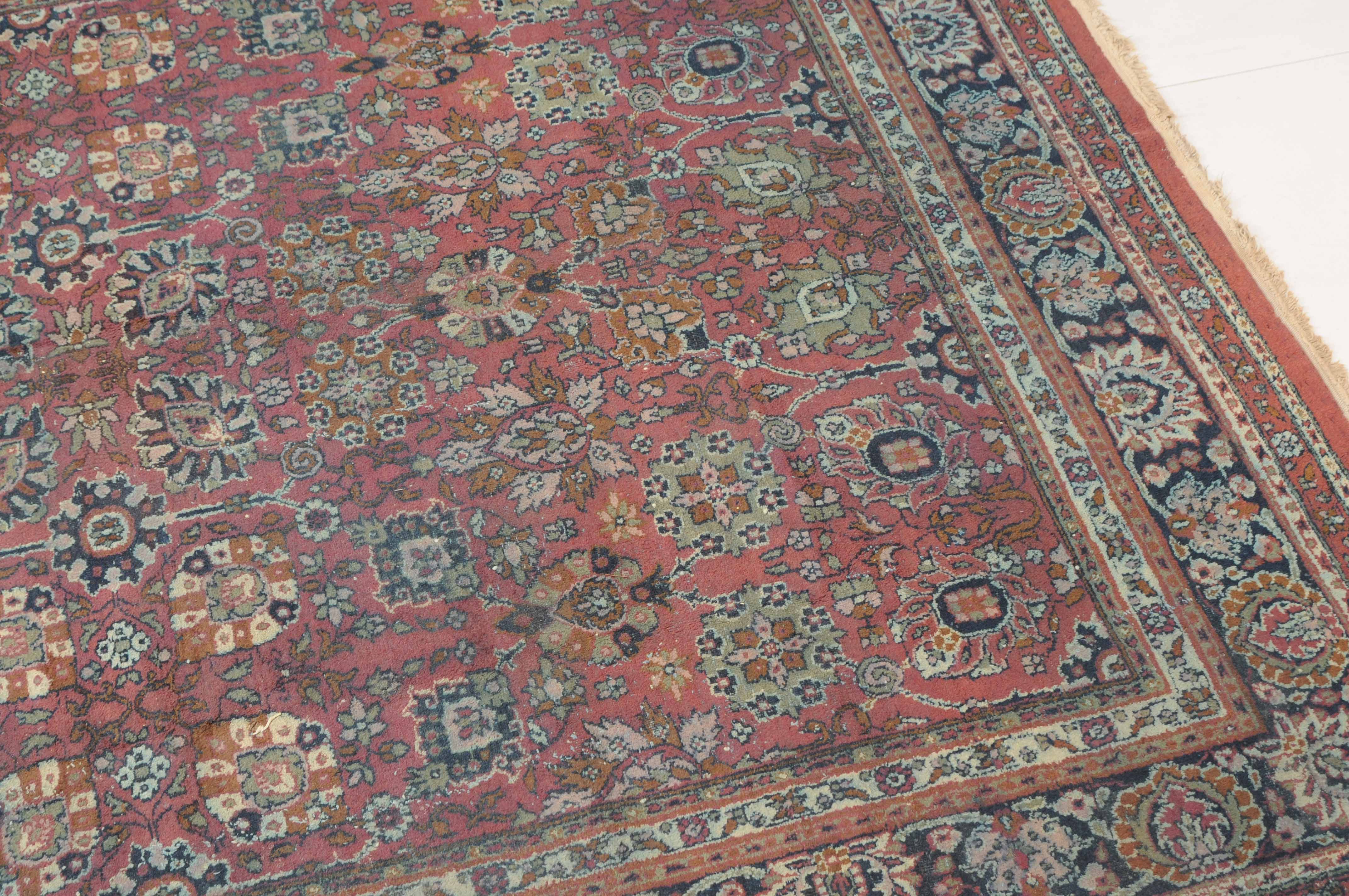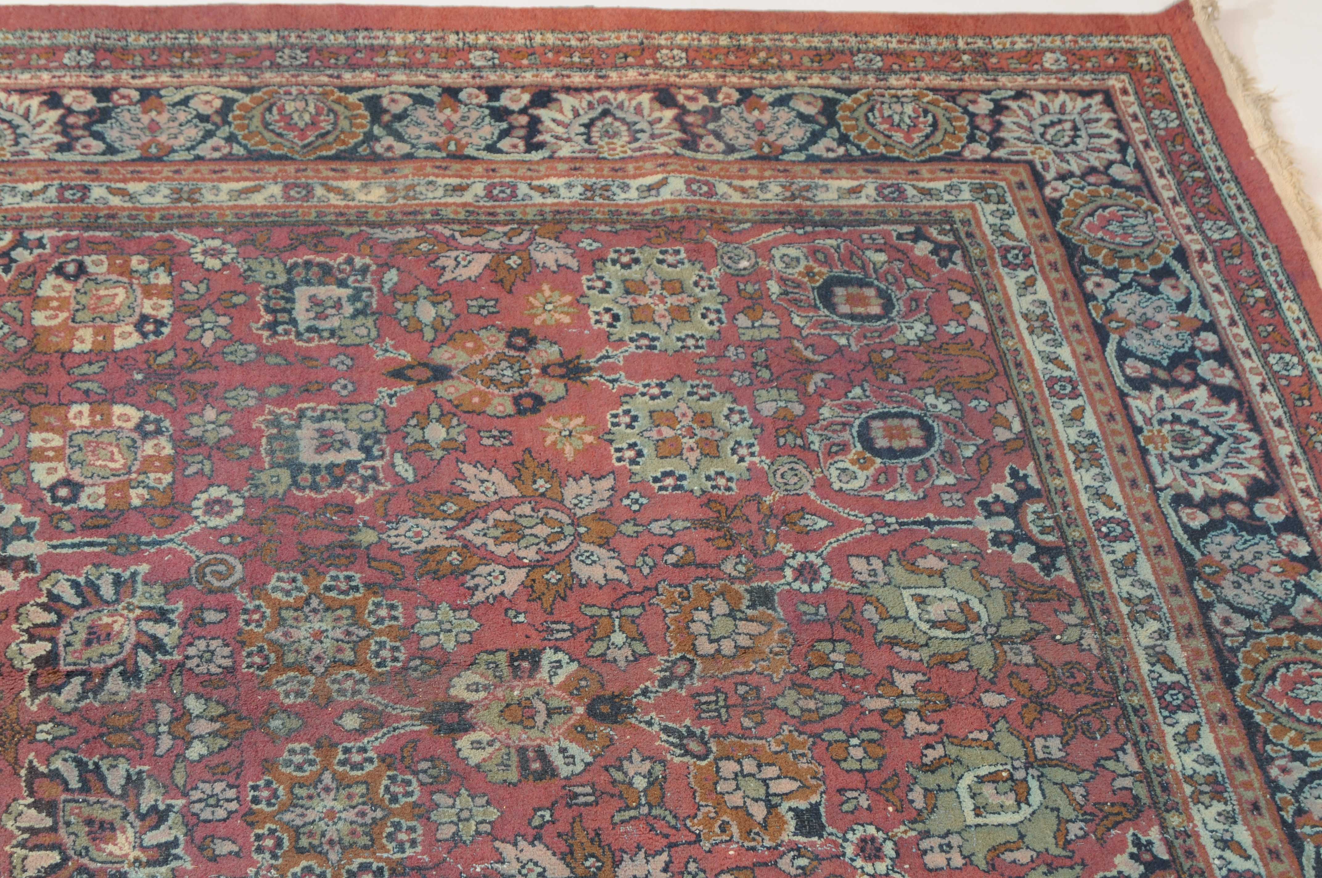 N-Indien, um 1910. Das elegante rote Mittelfeld ist durchgehend mit Palmetten, Blattranken und Blüten in unendlichem Rapport überzogen. 2 Nebenbordüren säumen die breite, ebenfalls mit Palmetten, Blüten und Blattranken geschmückte Hauptbordüre. Fleckig, Gebrauchsspuren. 275x355 cm (ft. 9.1x11.7).