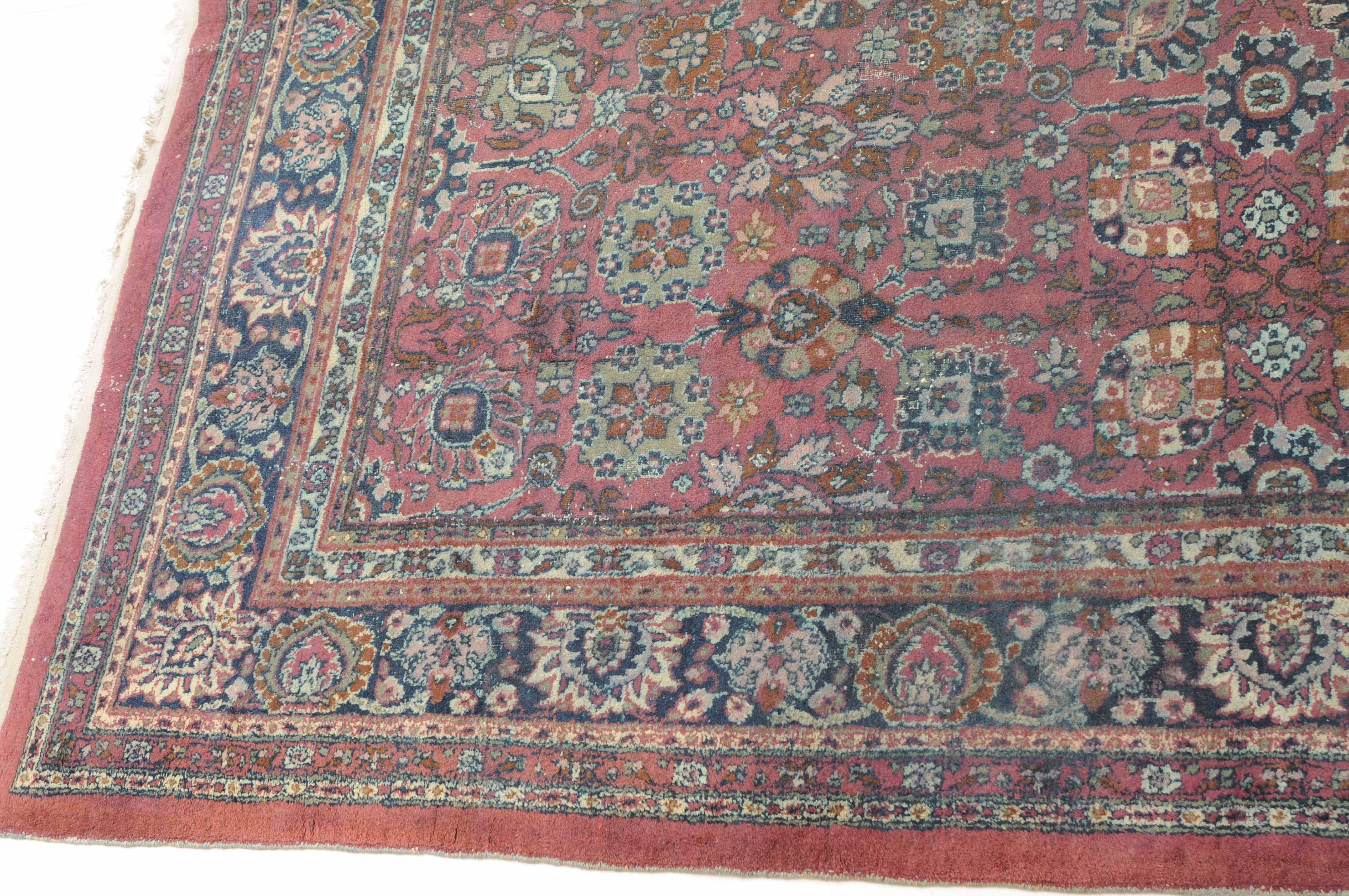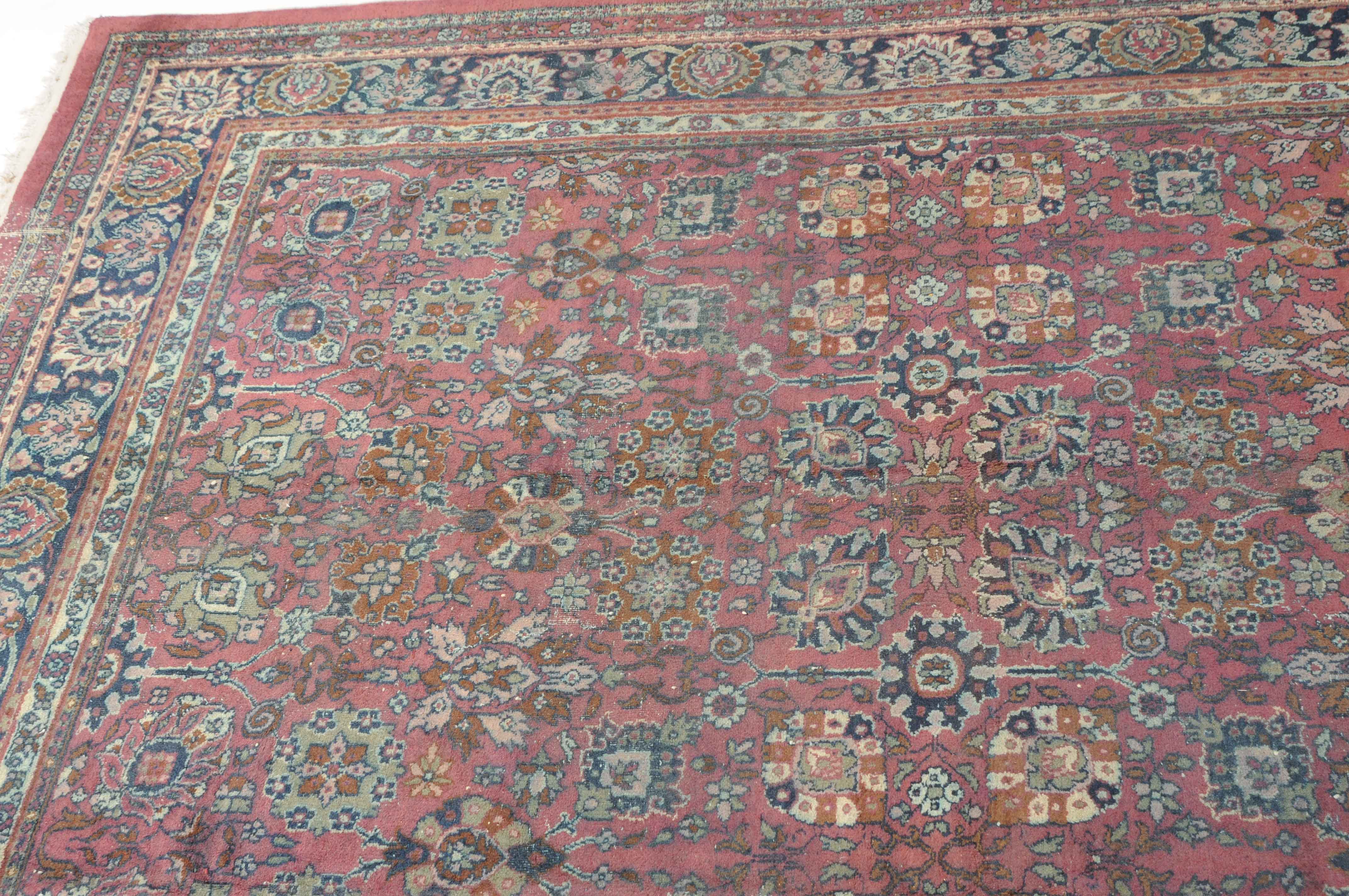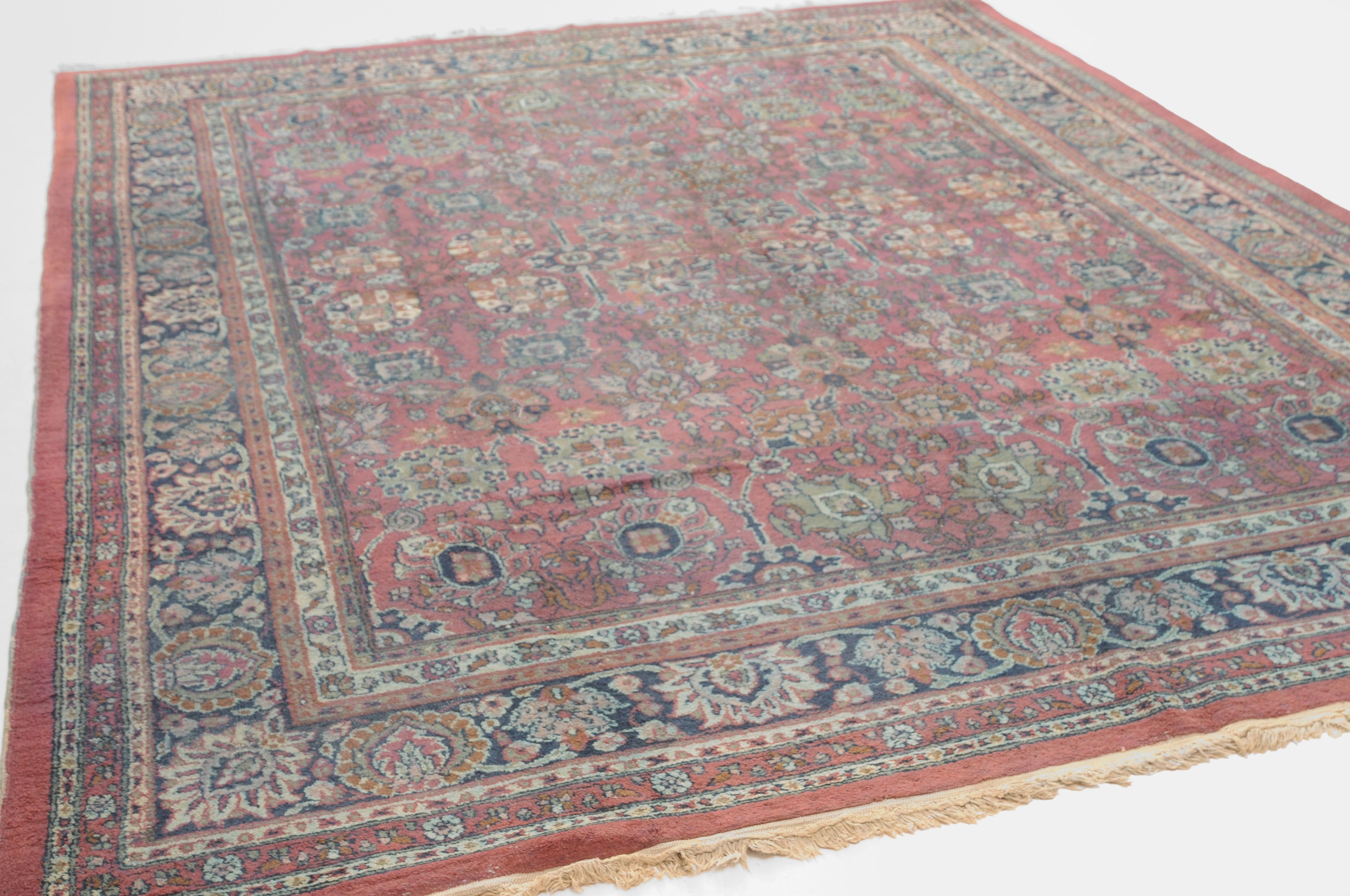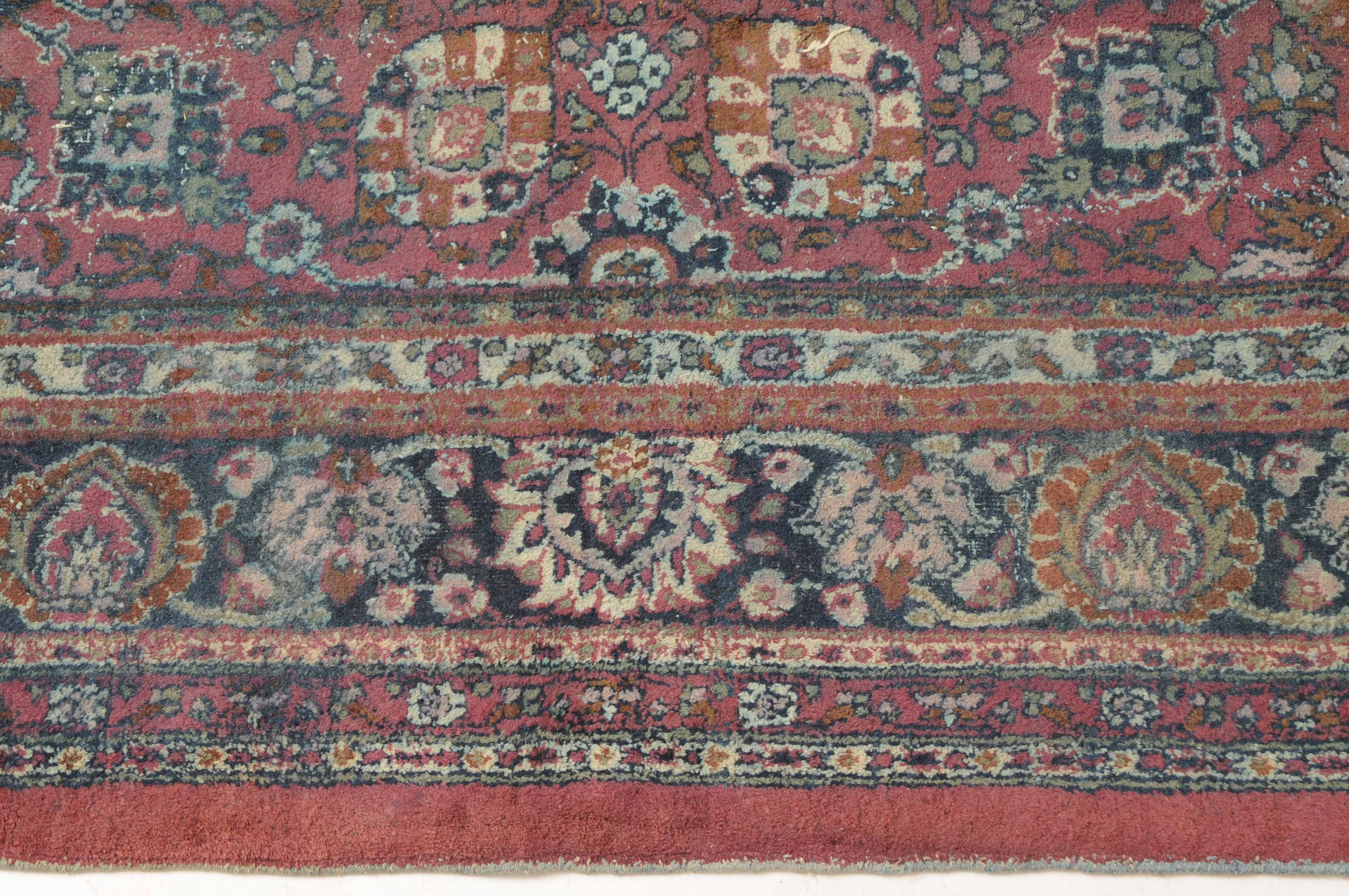 N-Indien, um 1910. Das elegante rote Mittelfeld ist durchgehend mit Palmetten, Blattranken und Blüten in unendlichem Rapport überzogen. 2 Nebenbordüren säumen die breite, ebenfalls mit Palmetten, Blüten und Blattranken geschmückte Hauptbordüre. Fleckig, Gebrauchsspuren. 275x355 cm (ft. 9.1x11.7).