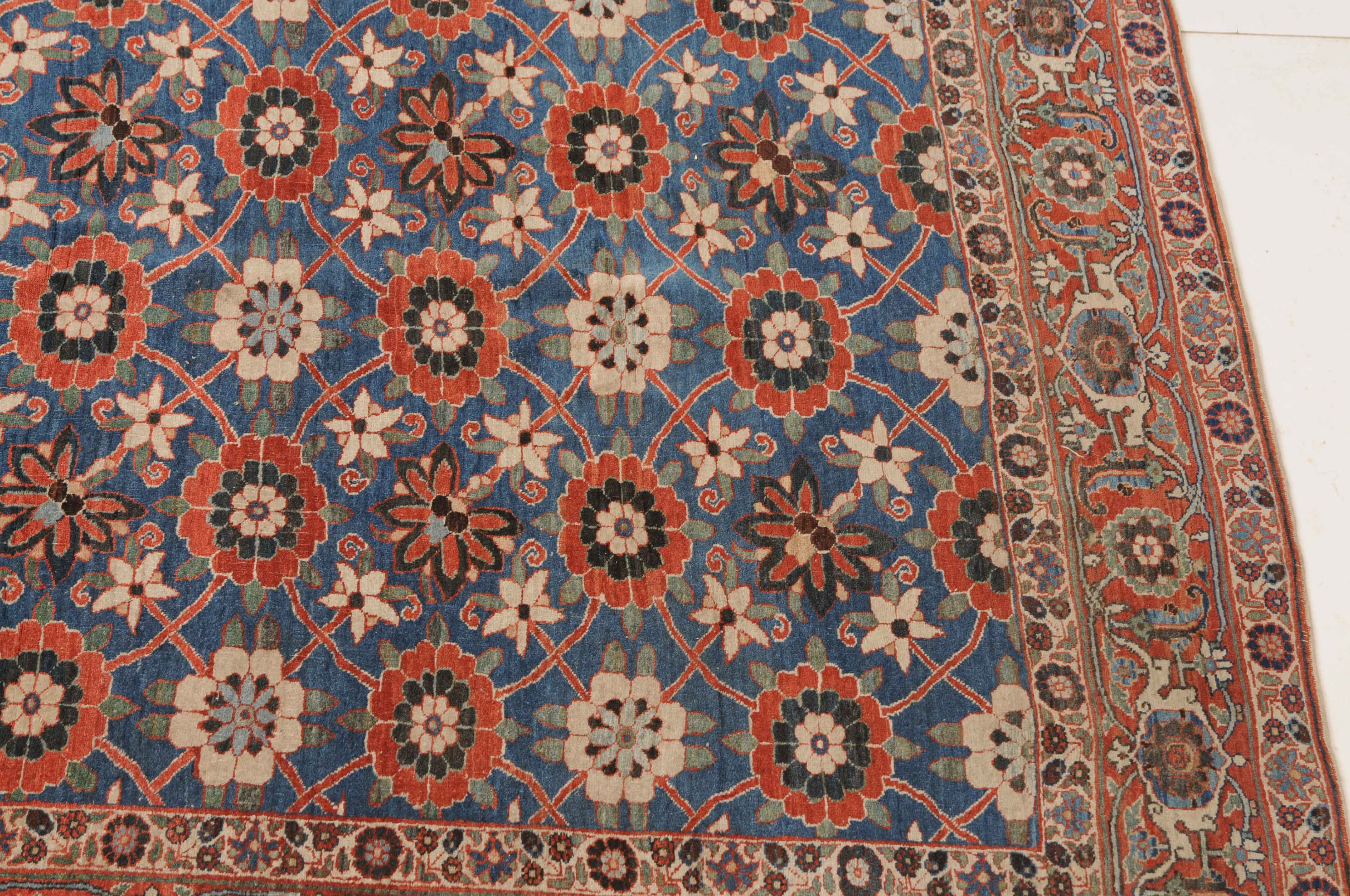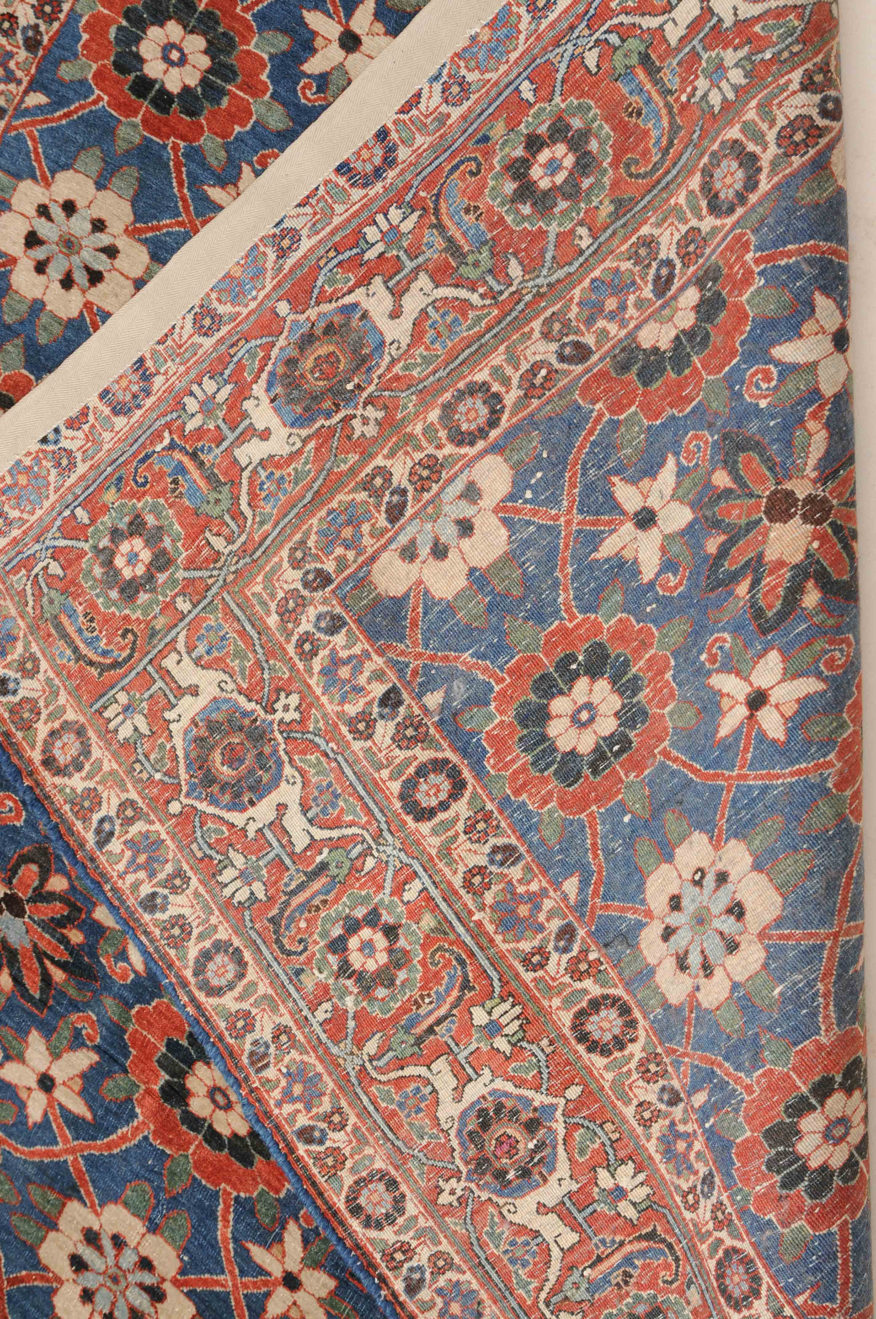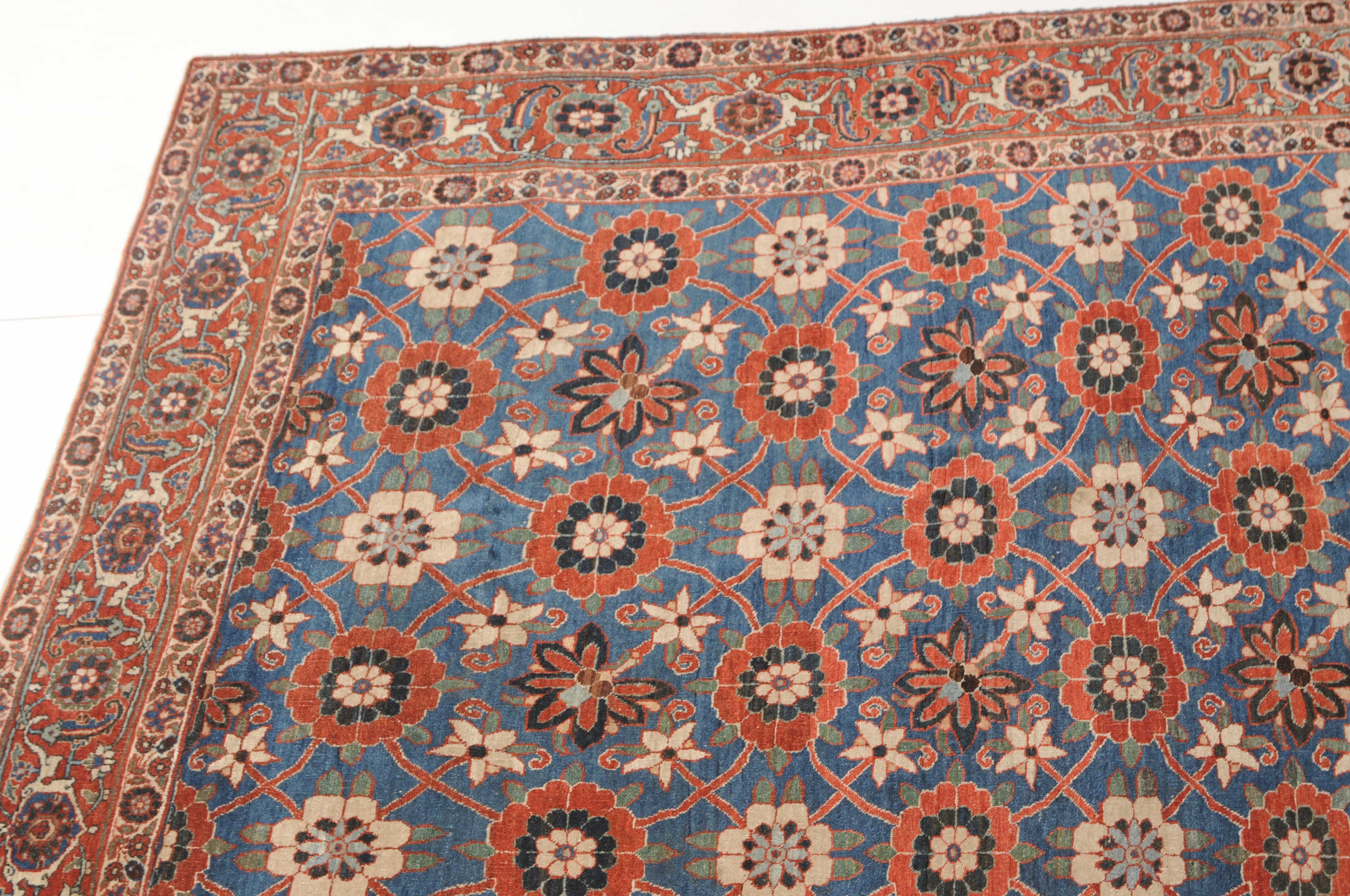 Z-Persien, um 1910. Dichtes florales Werk. Charakteristisches hellblaues, durchgehend mit roten Blattranken und Blüten in unendlichem Rapport belegtes Mittelfeld. 2 weisse Nebenbordüren umranden die reich verzierte florale rote Hauptbordüre. Gebrauchsspuren. 150x195 cm (ft. 5x6.4).