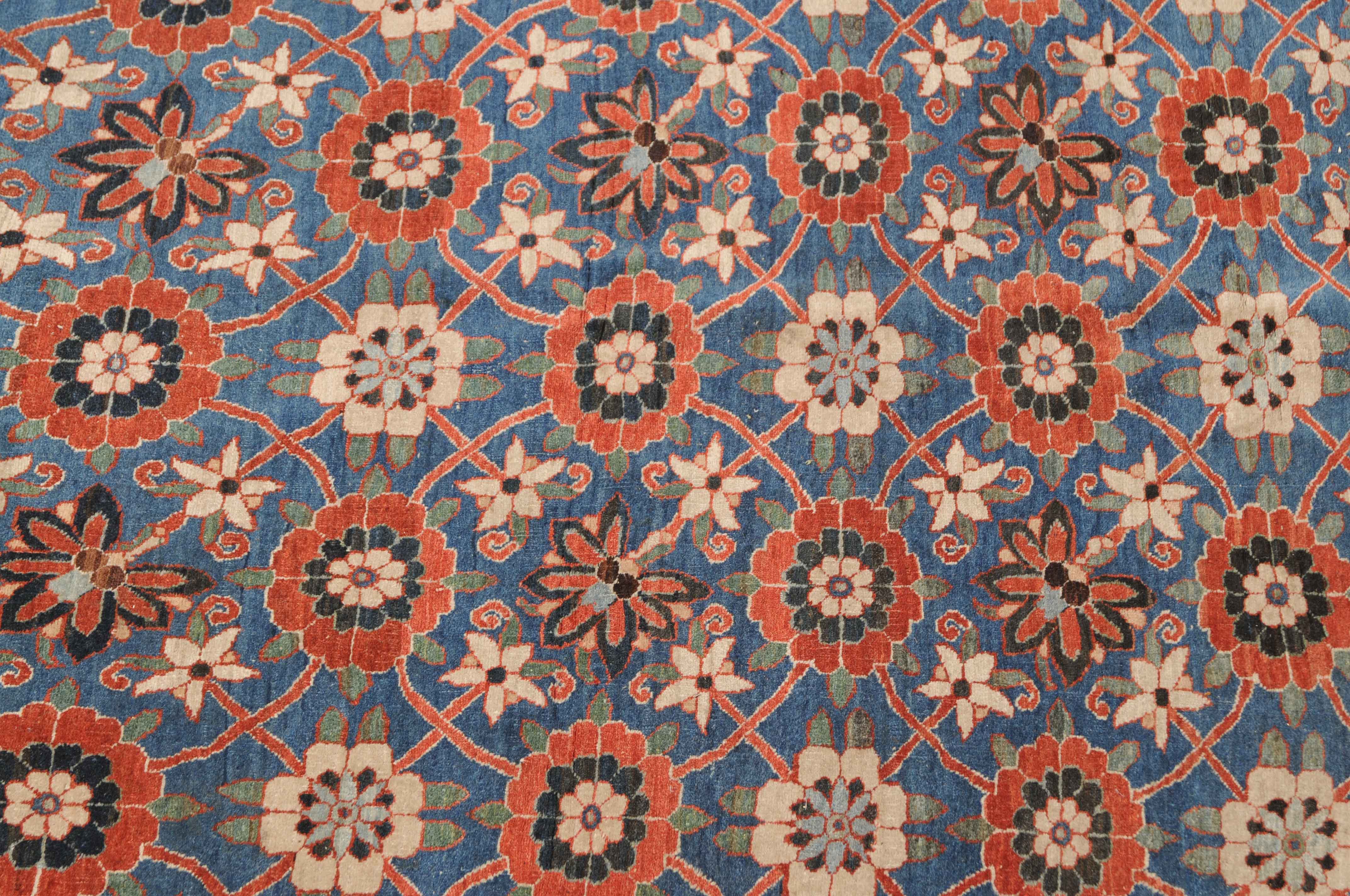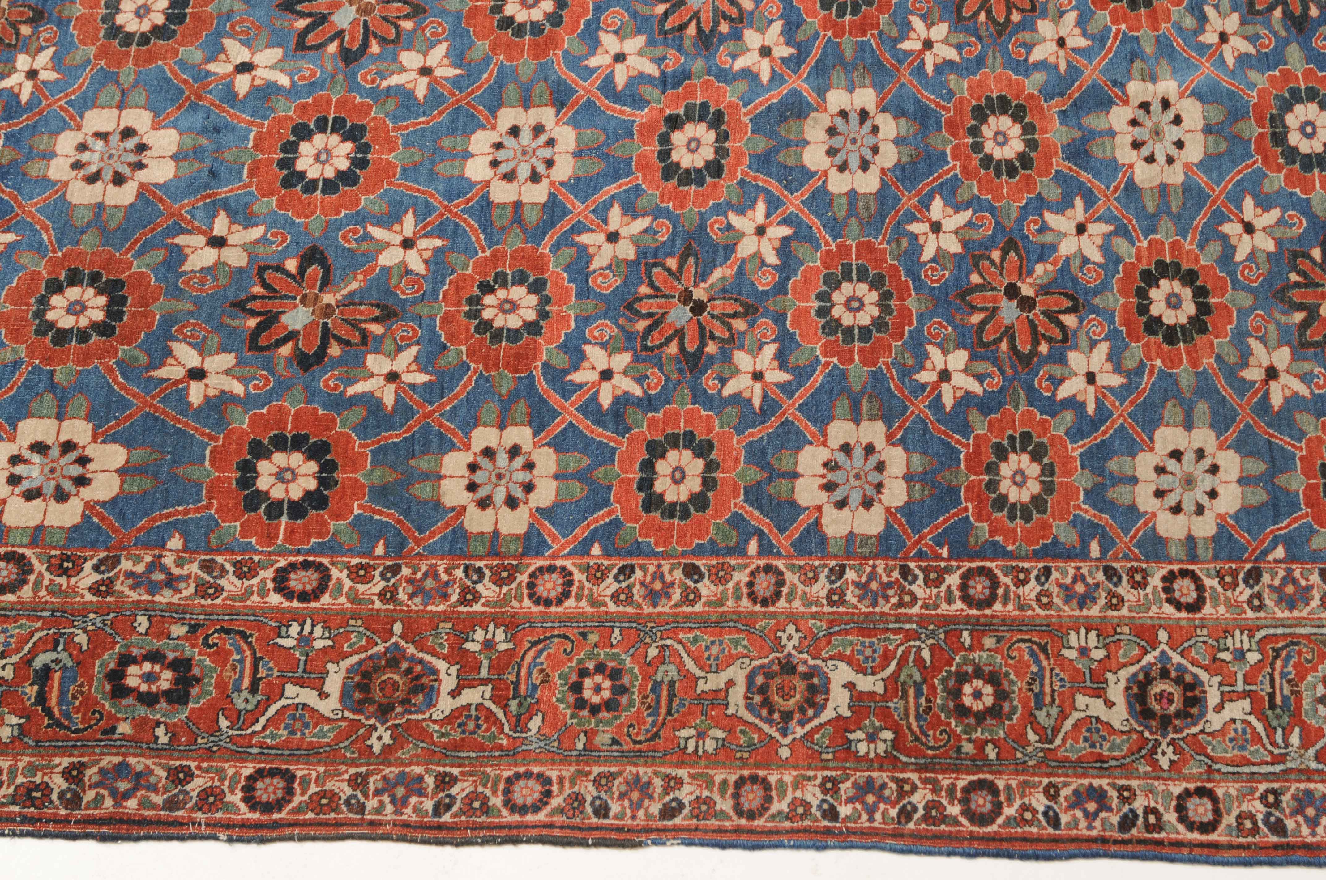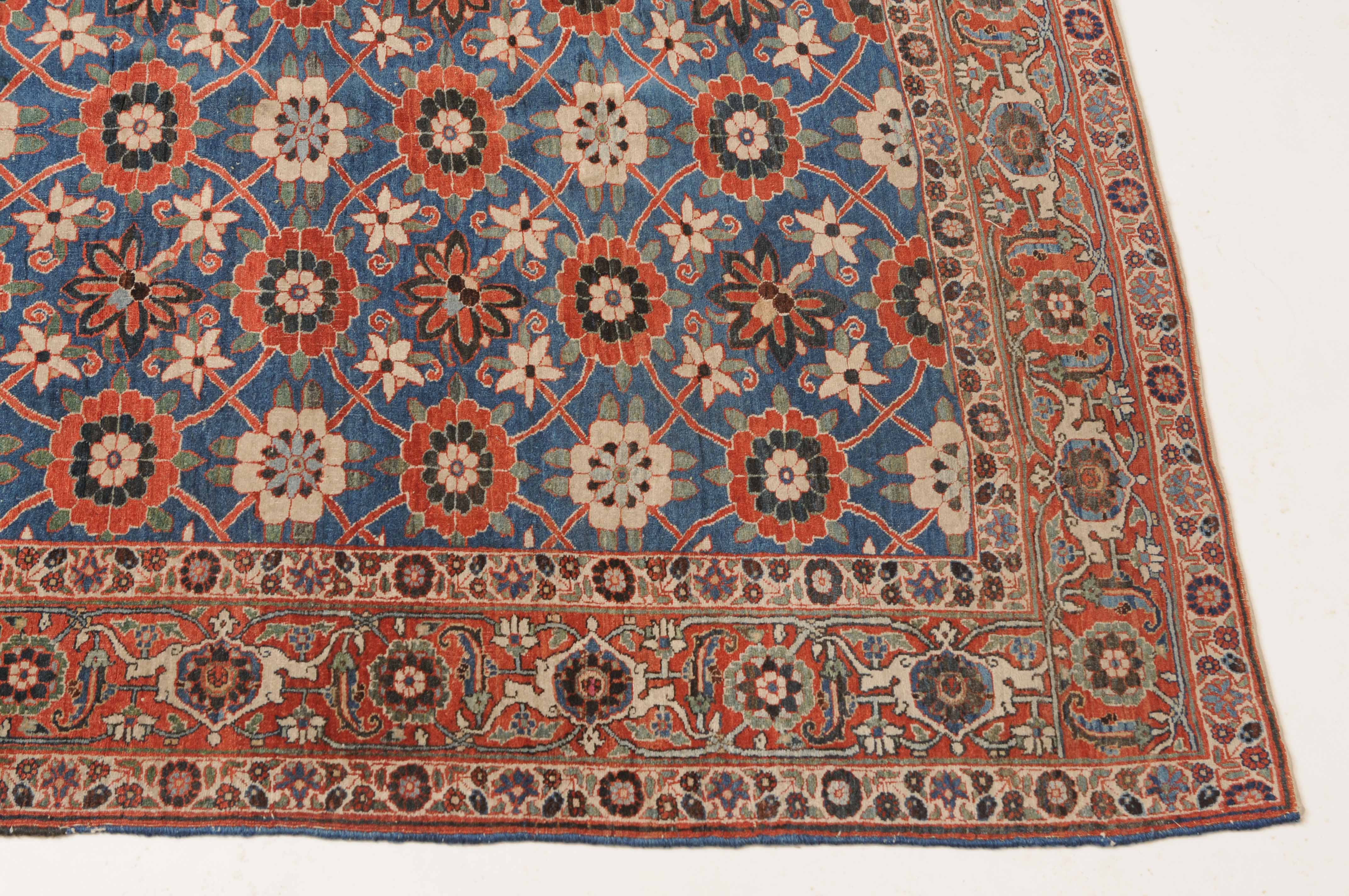 Z-Persien, um 1910. Dichtes florales Werk. Charakteristisches hellblaues, durchgehend mit roten Blattranken und Blüten in unendlichem Rapport belegtes Mittelfeld. 2 weisse Nebenbordüren umranden die reich verzierte florale rote Hauptbordüre. Gebrauchsspuren. 150x195 cm (ft. 5x6.4).