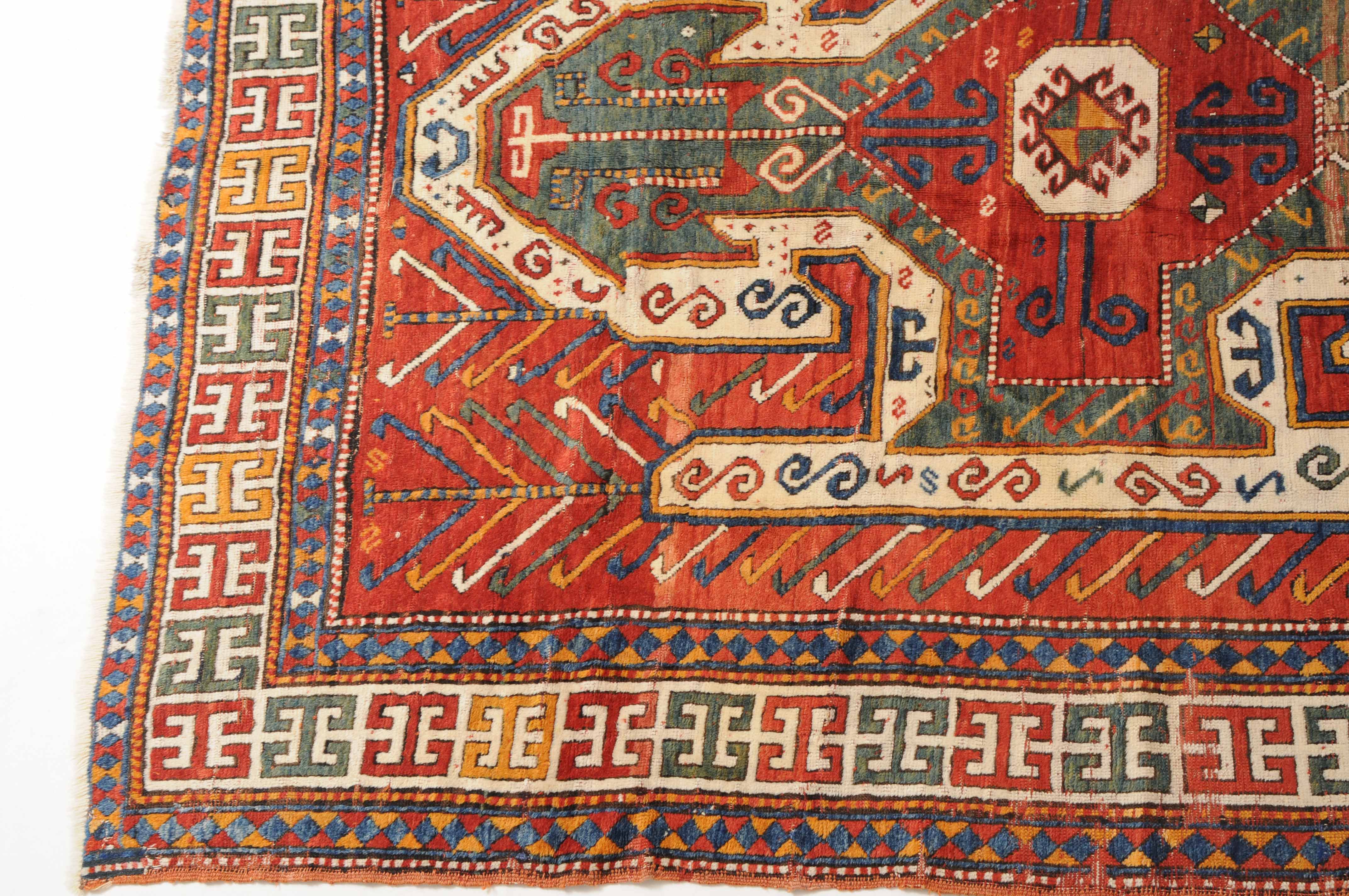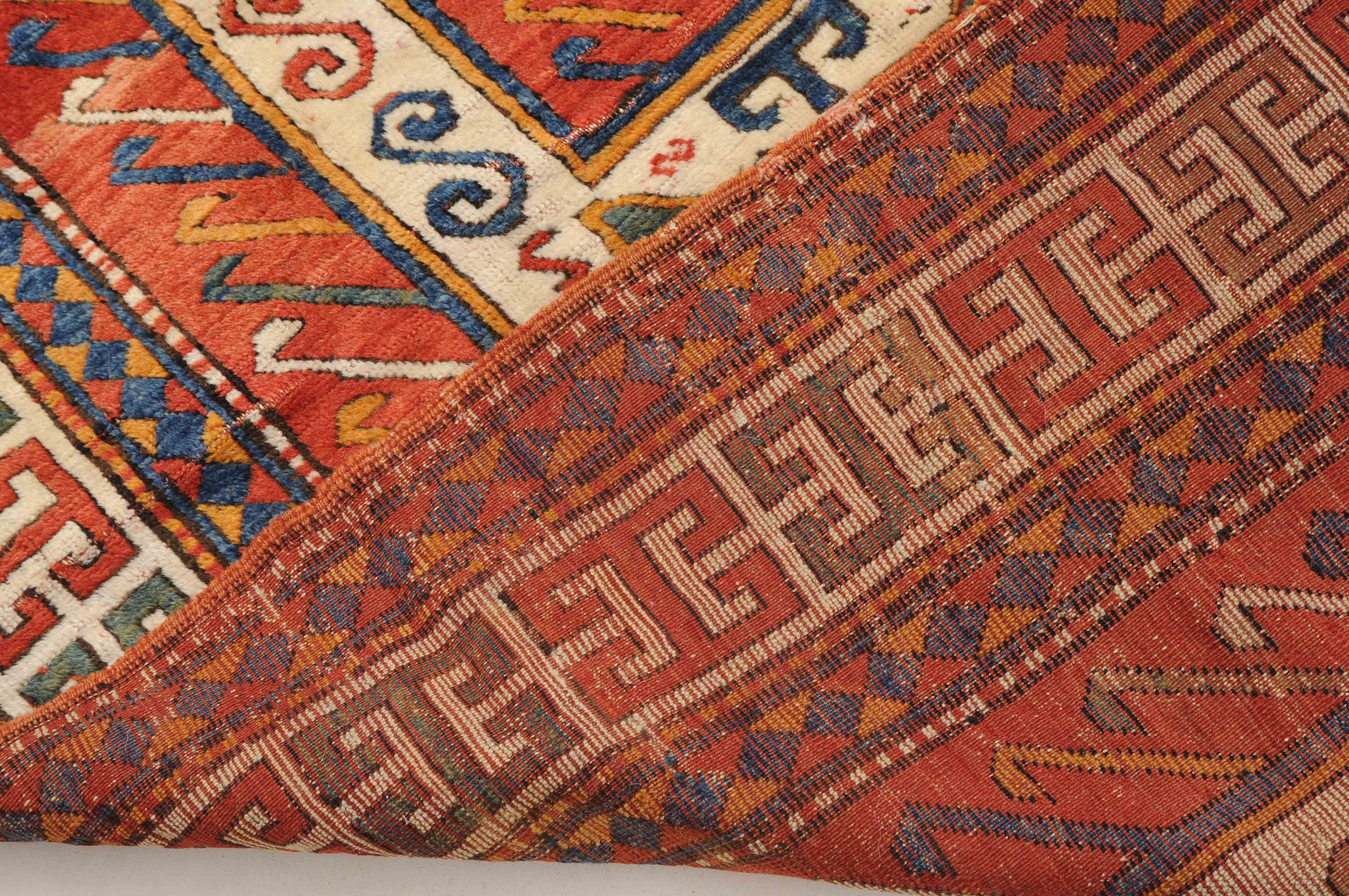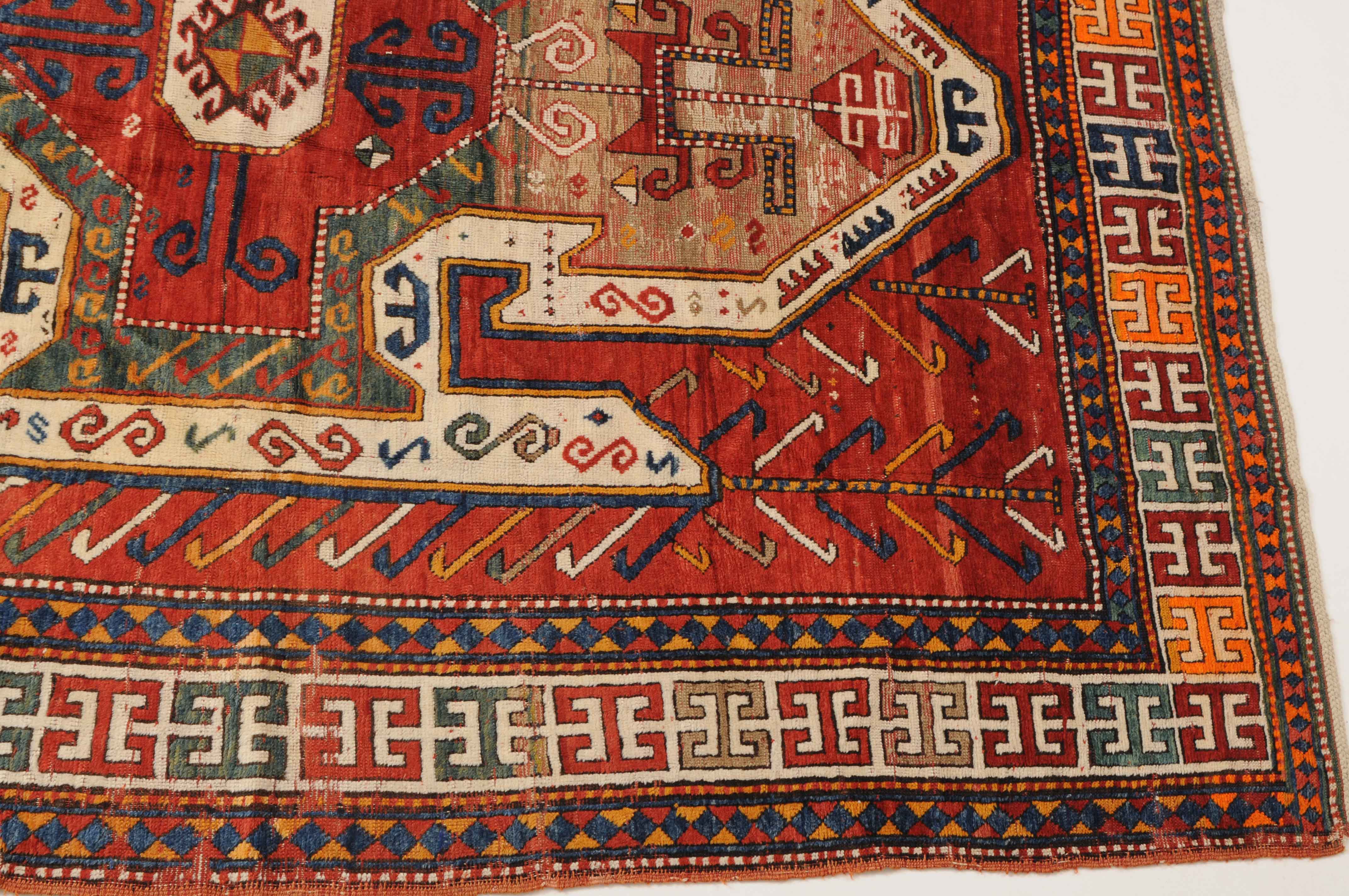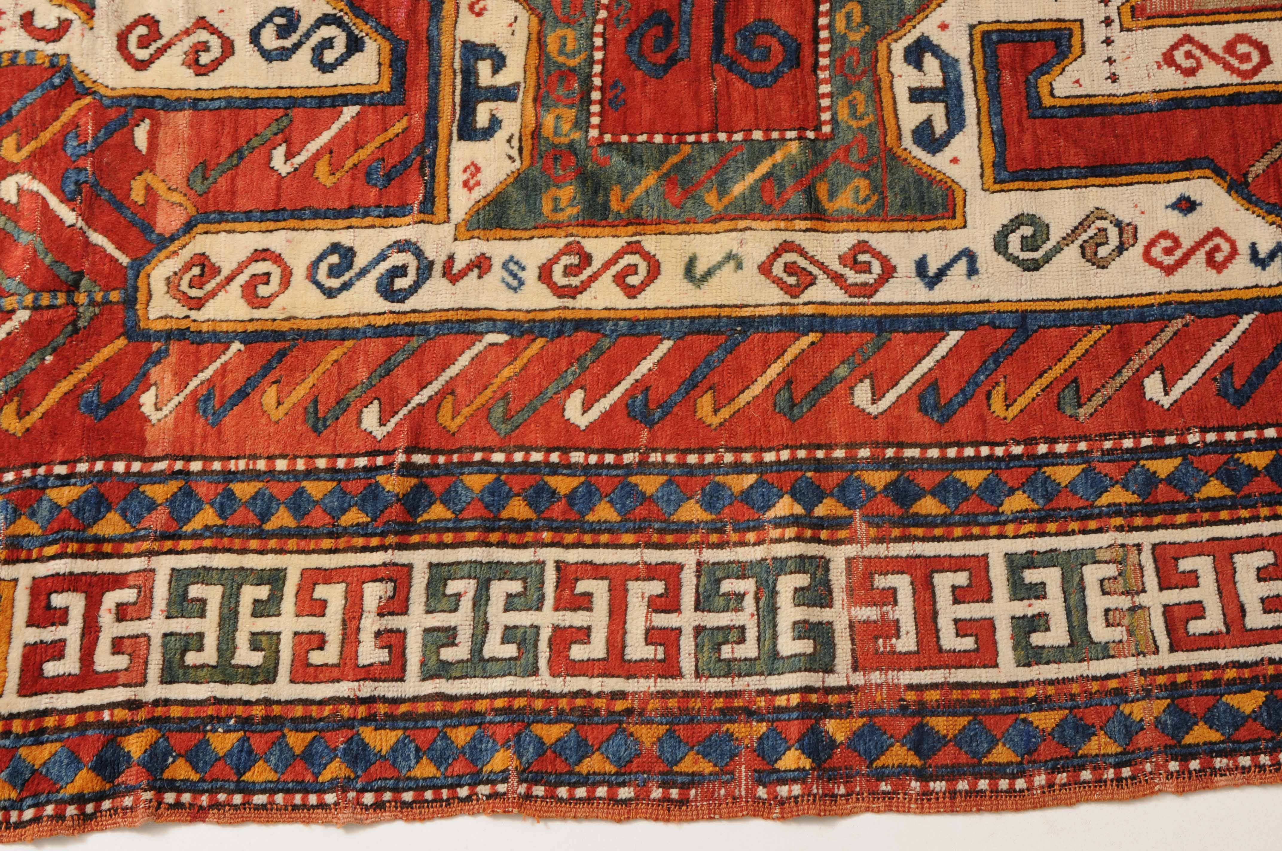 Z-Kaukasus, um 1910. Im ziegelroten Feld thront ein eindrucksvolles weisses kreuzförmiges Schild-Medaillon, das im Inneren mit einem roten hakenbesetzten Kartuschen-Medaillon belegt ist. Die 4 mit Hakenstangen gefüllten Ecken grenzen an die weisse, mit alternierenden Doppel-T-Formen belegte Hauptbordüre. Starke Gebrauchsspuren. 207x270 cm (ft. 6.8x8.9).
