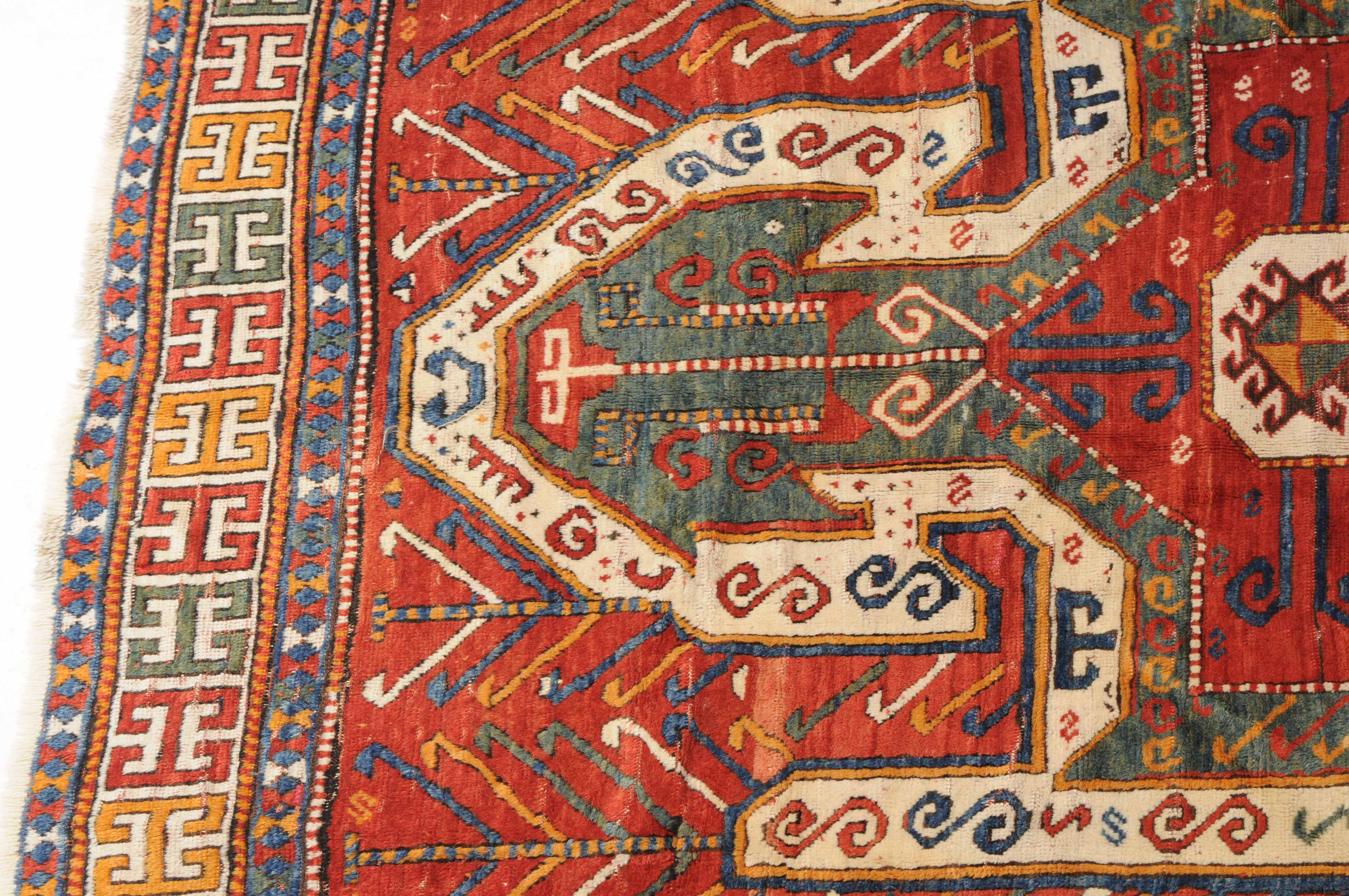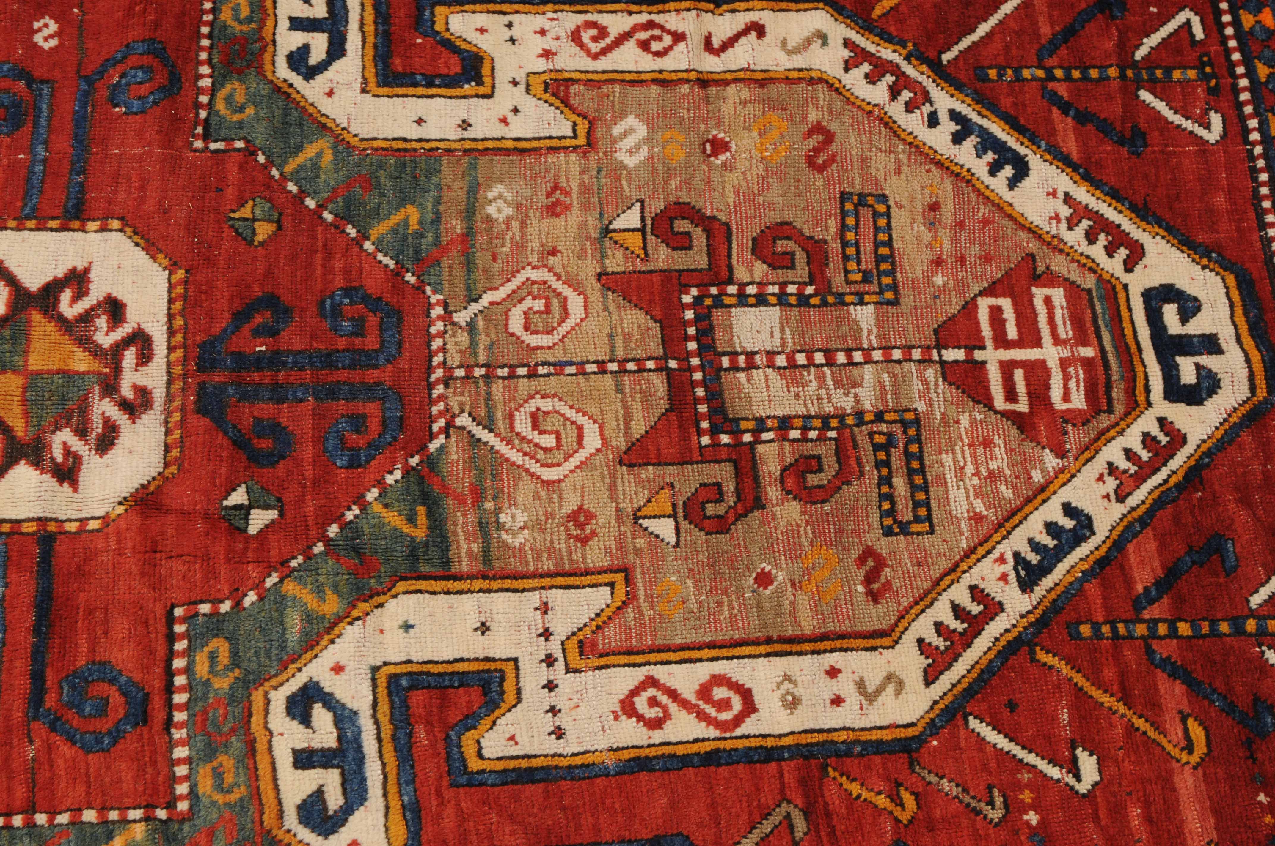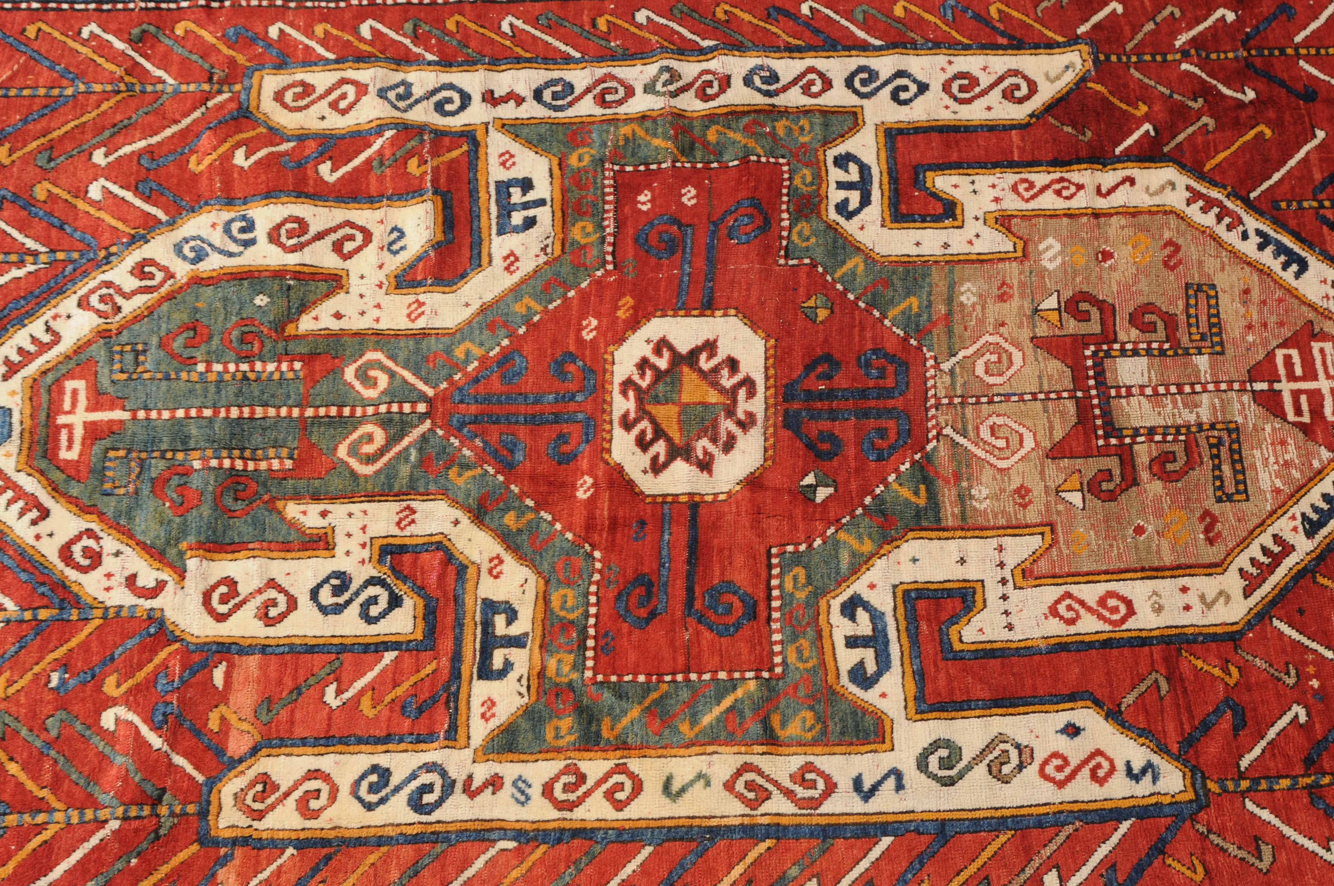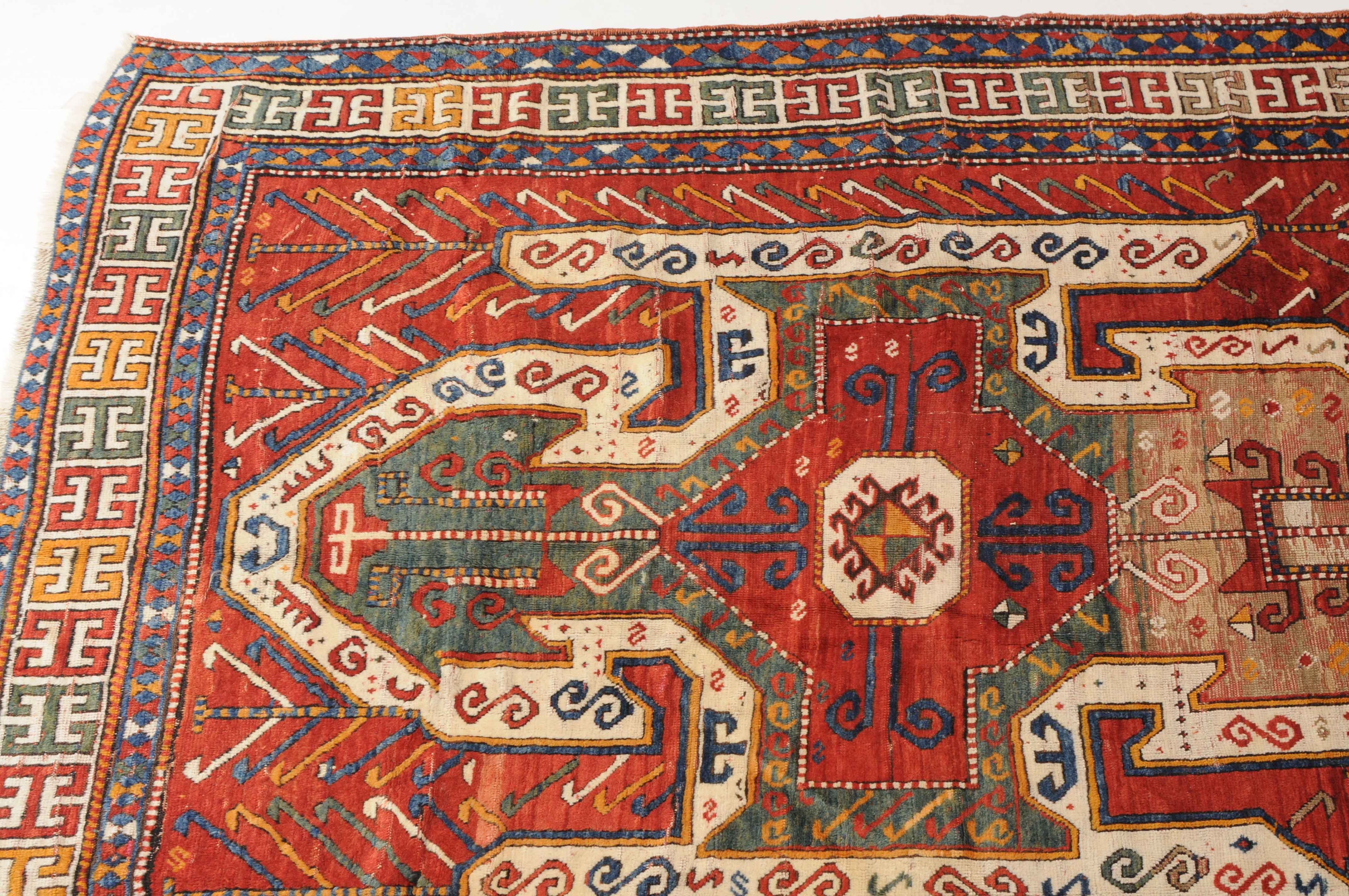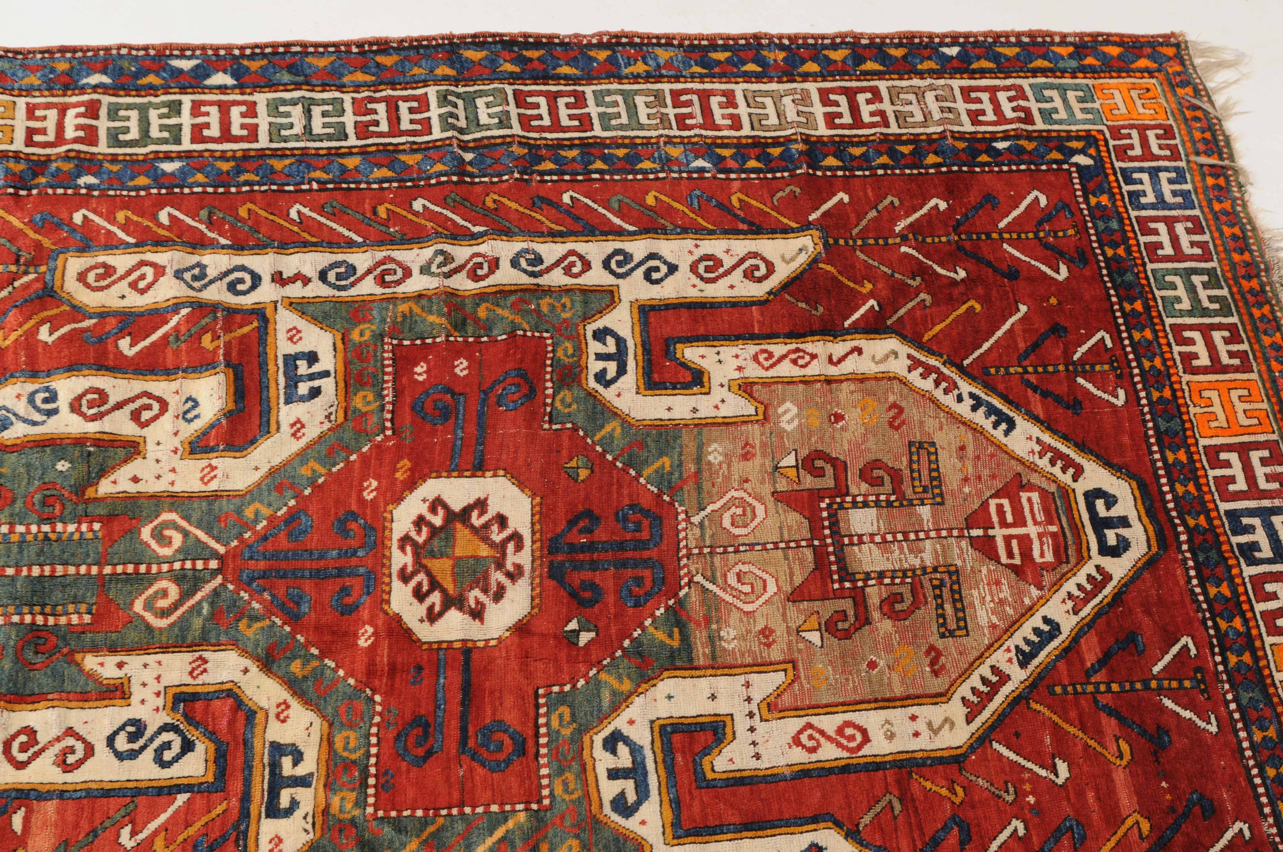 Z-Kaukasus, um 1910. Im ziegelroten Feld thront ein eindrucksvolles weisses kreuzförmiges Schild-Medaillon, das im Inneren mit einem roten hakenbesetzten Kartuschen-Medaillon belegt ist. Die 4 mit Hakenstangen gefüllten Ecken grenzen an die weisse, mit alternierenden Doppel-T-Formen belegte Hauptbordüre. Starke Gebrauchsspuren. 207x270 cm (ft. 6.8x8.9).