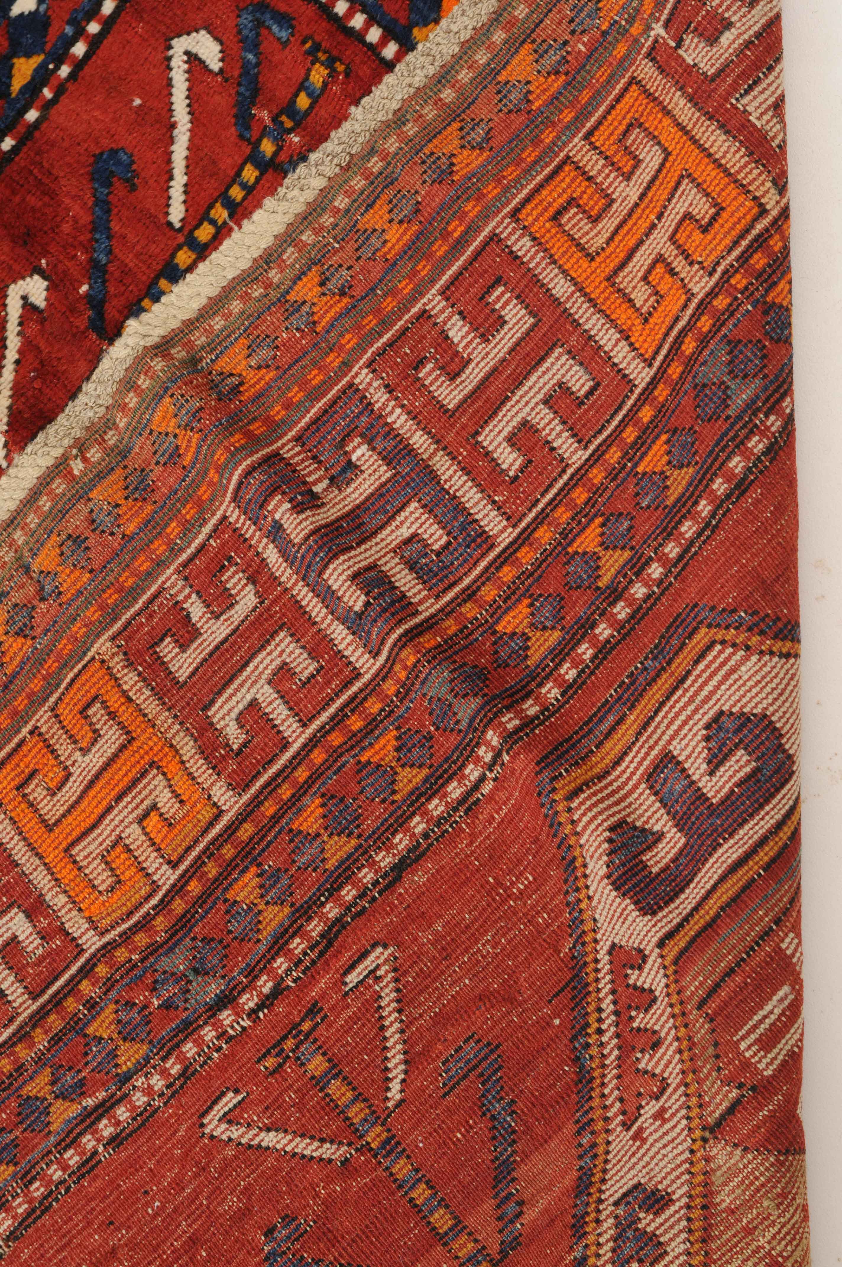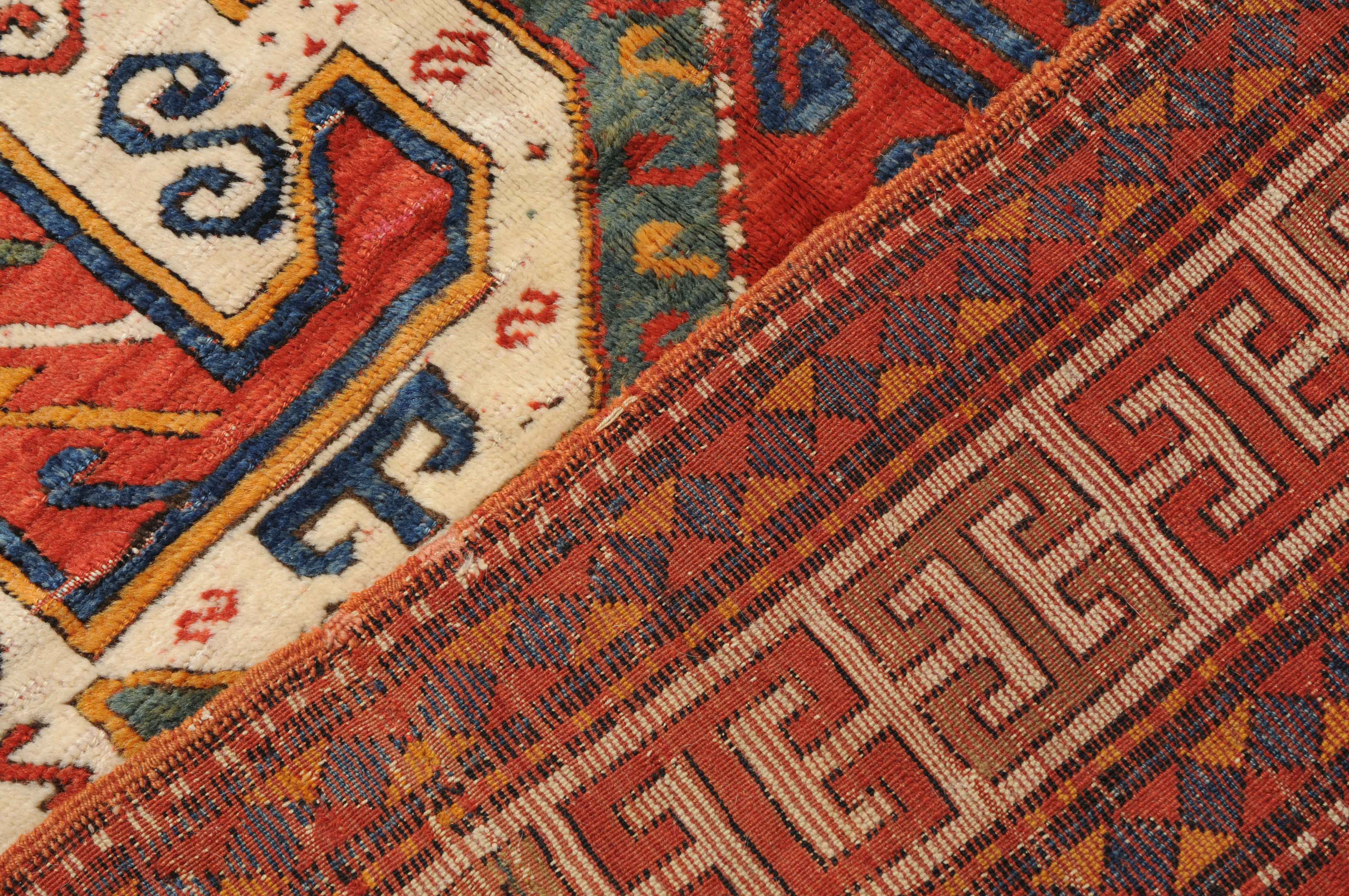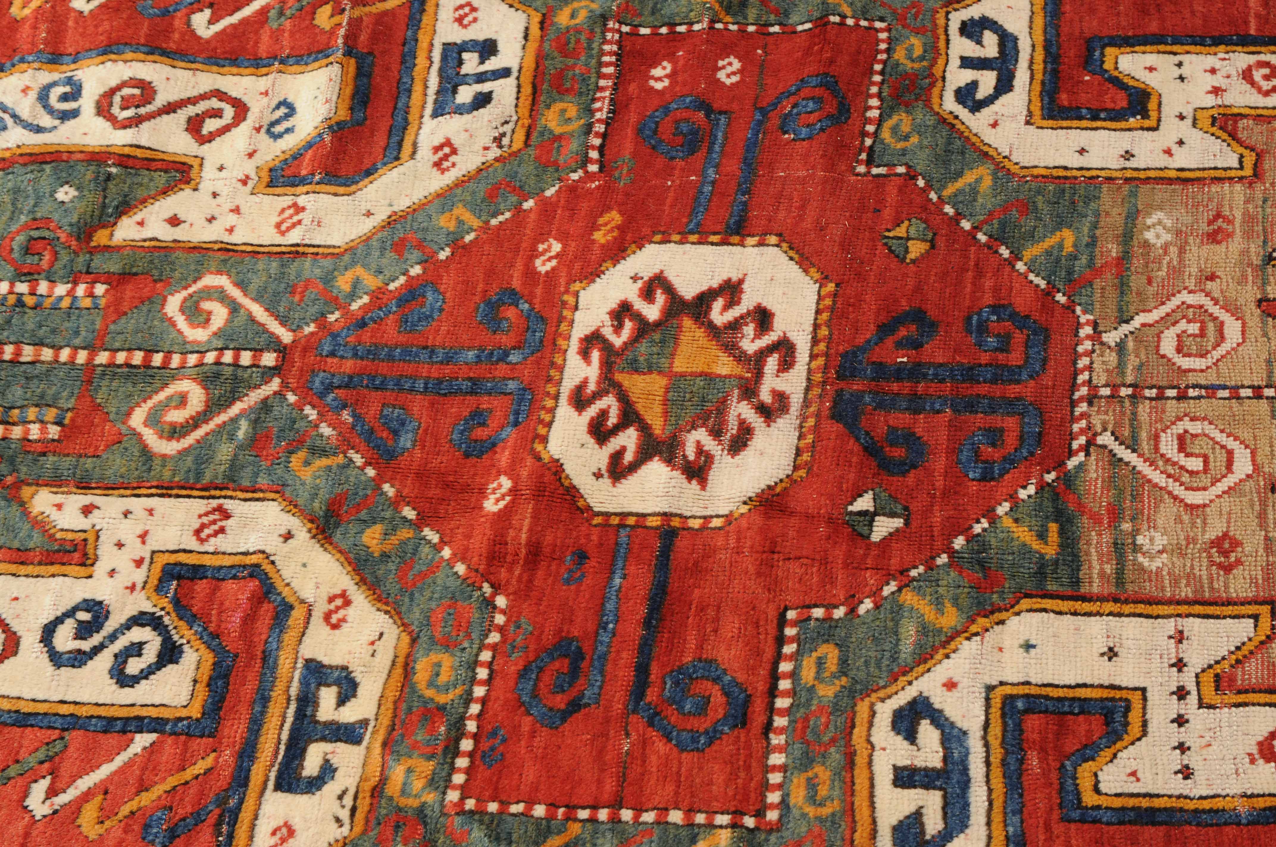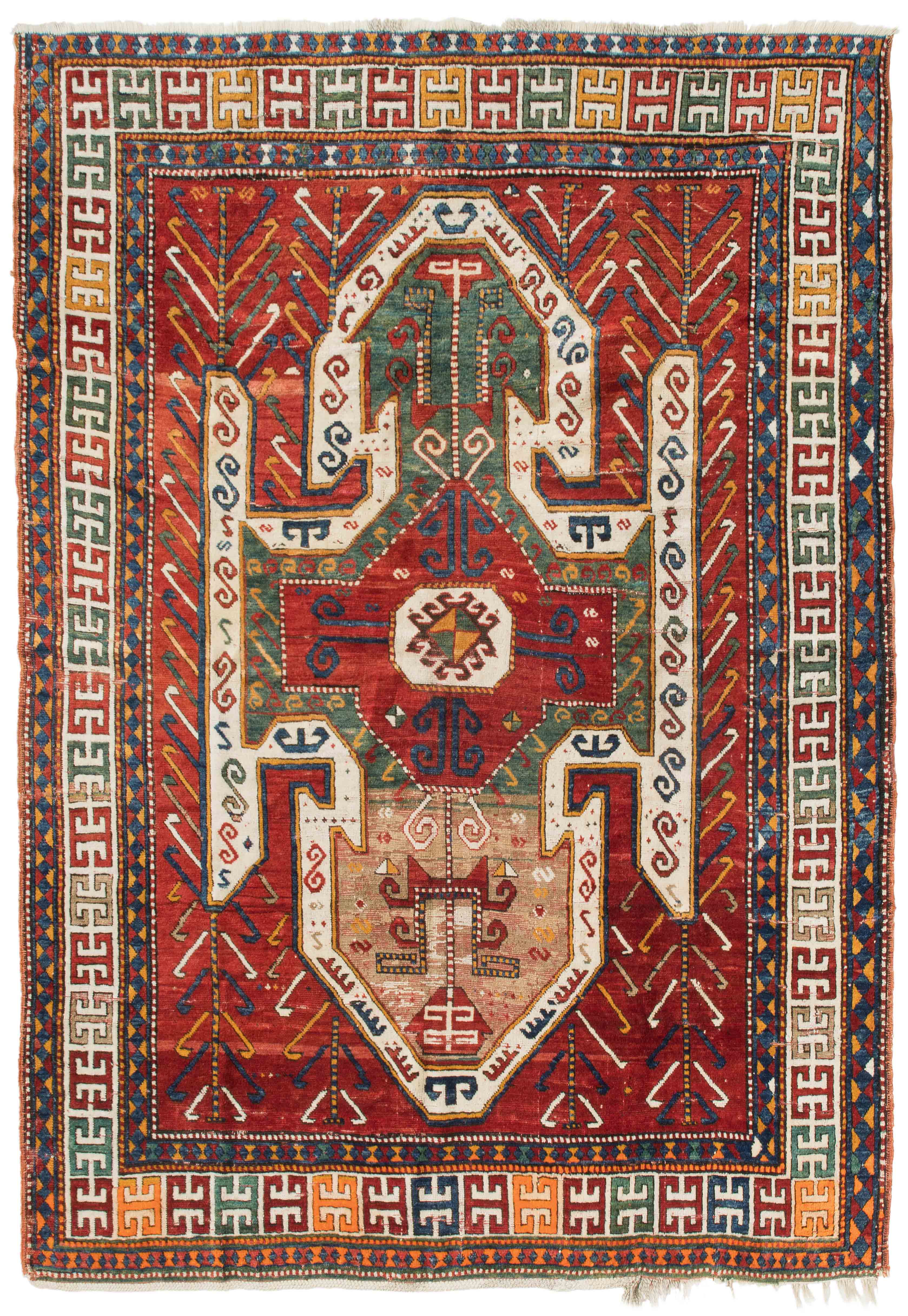 Z-Kaukasus, um 1910. Im ziegelroten Feld thront ein eindrucksvolles weisses kreuzförmiges Schild-Medaillon, das im Inneren mit einem roten hakenbesetzten Kartuschen-Medaillon belegt ist. Die 4 mit Hakenstangen gefüllten Ecken grenzen an die weisse, mit alternierenden Doppel-T-Formen belegte Hauptbordüre. Starke Gebrauchsspuren. 207x270 cm (ft. 6.8x8.9).