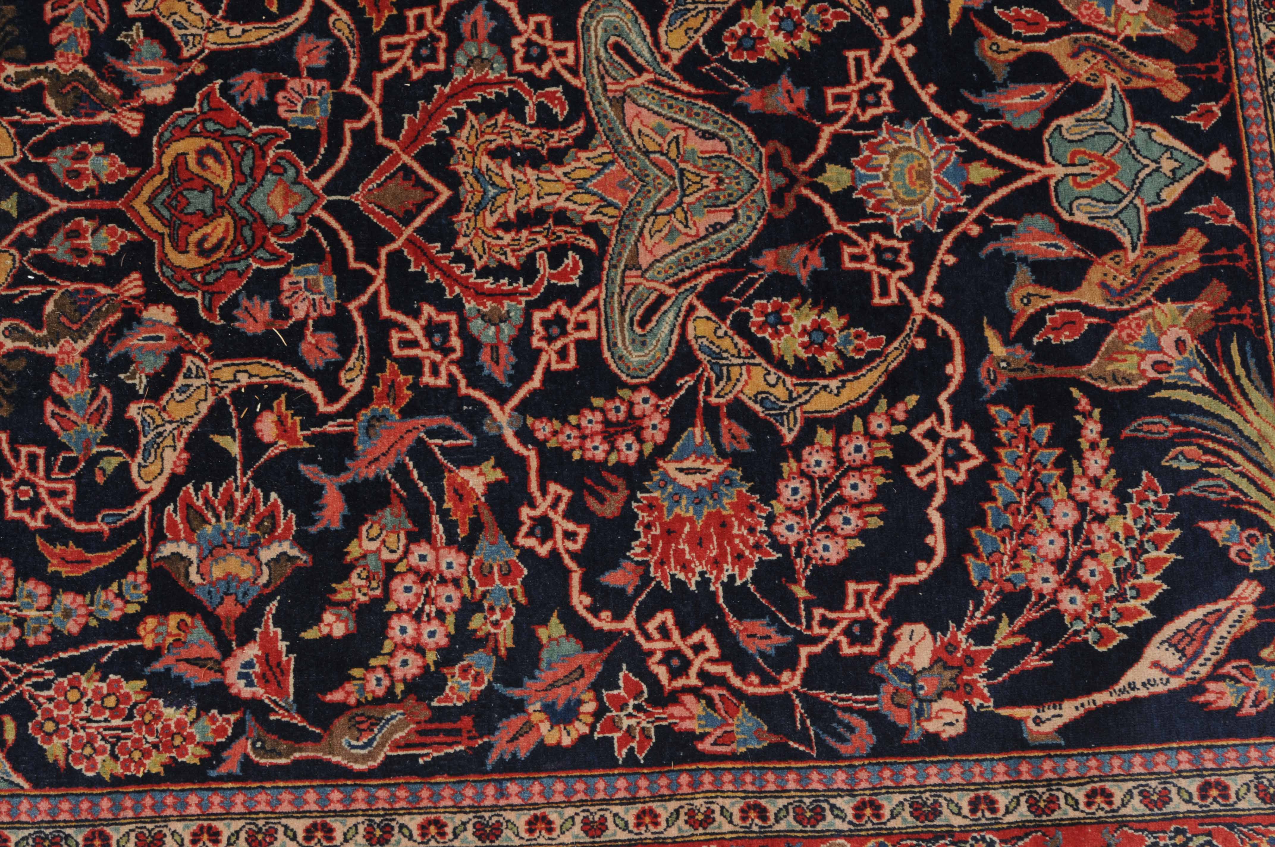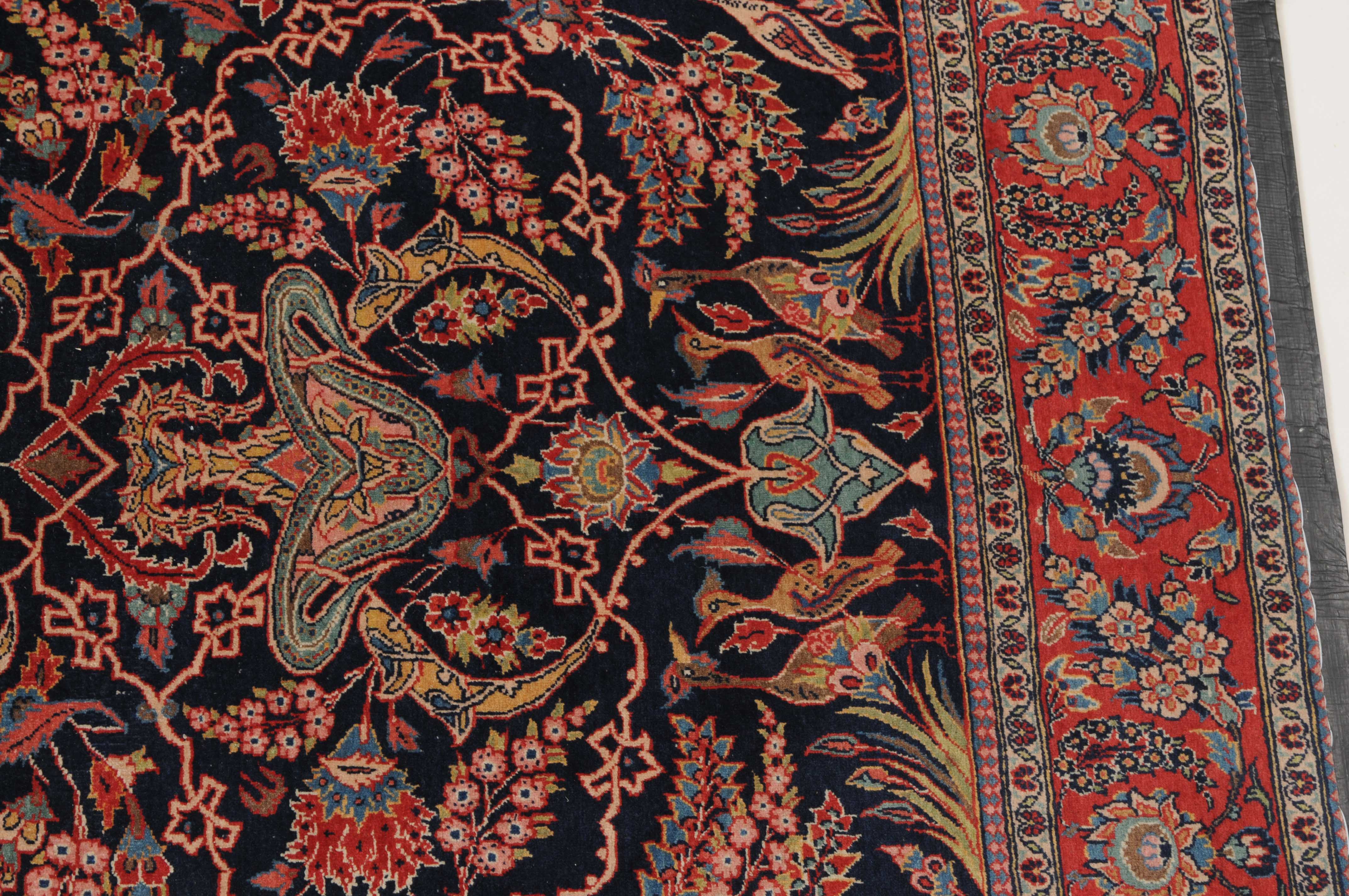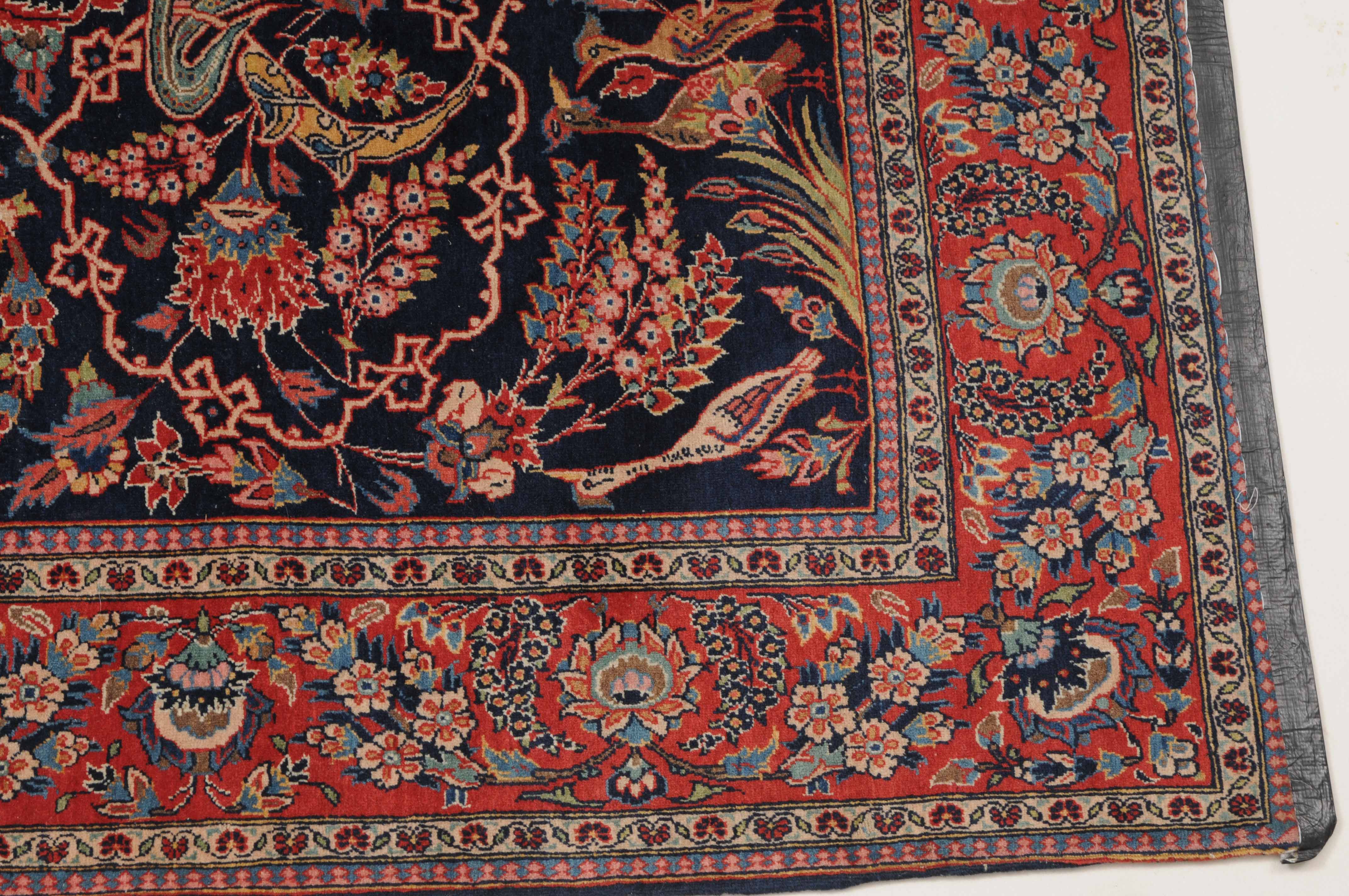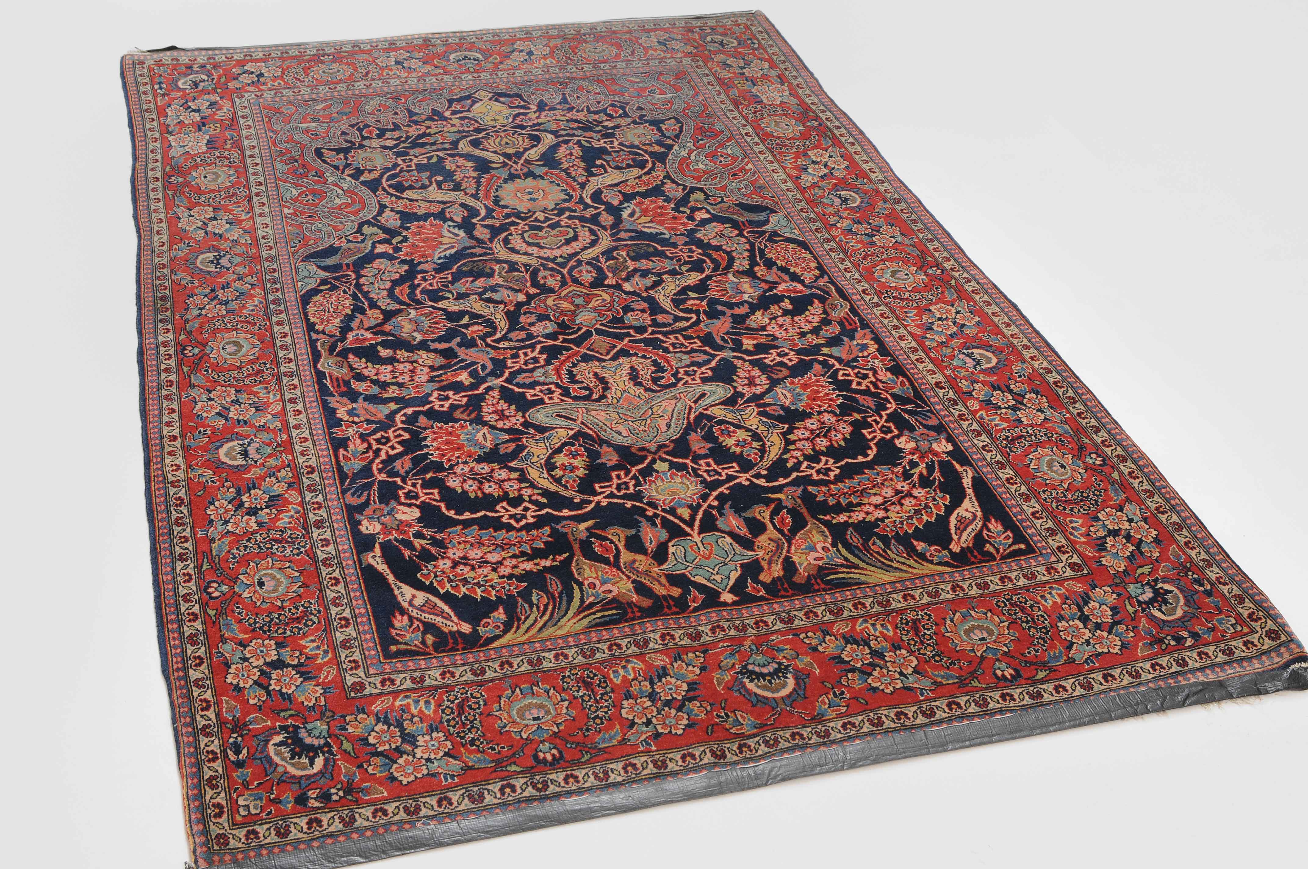 Z-Persien, um 1910. Dichtes florales Werk. Im nachtblauen Hauptfeld figurieren unter einer Gebetsnische (Mihrab) Vögel, flankiert von filigran gearbeiteten Blütenbouquets und girlandenartig angelegten Ranken und Zweigen. 2 Rosettenborten umgeben die mit Blütenkompositionen durchgehend gefüllte rote Hauptbordüre. Gebrauchsspuren. 132x208 cm (ft. 4.4x6.9).