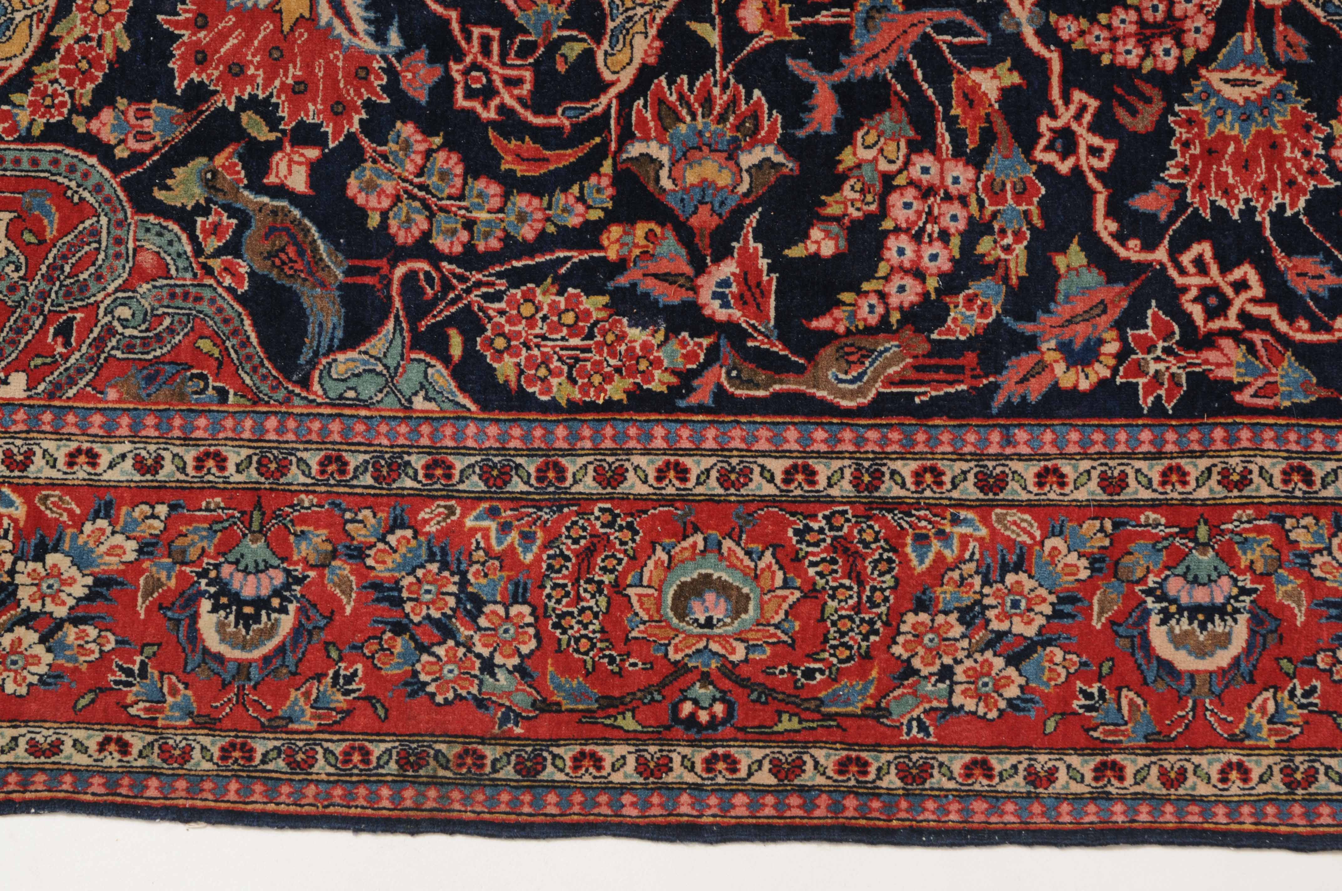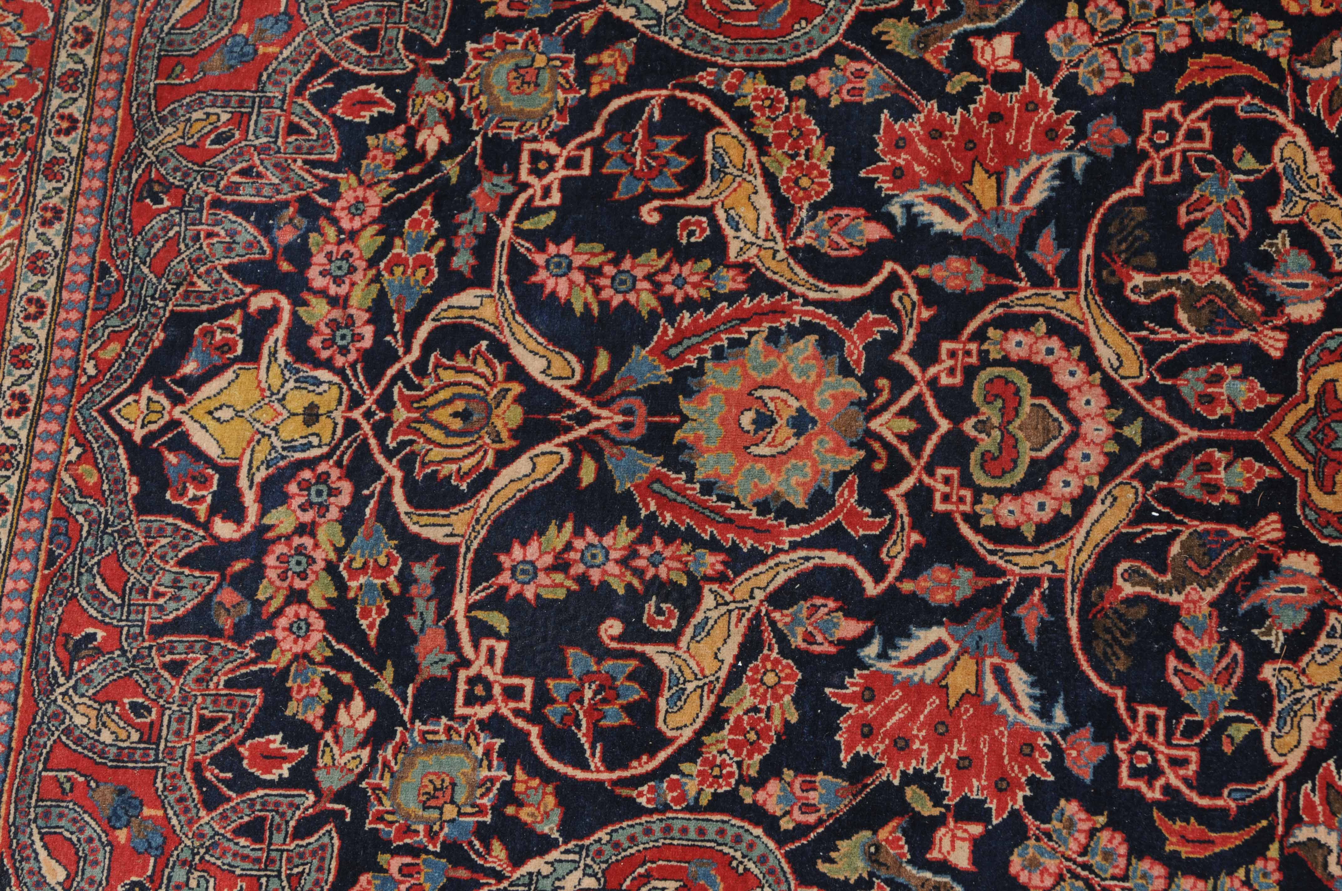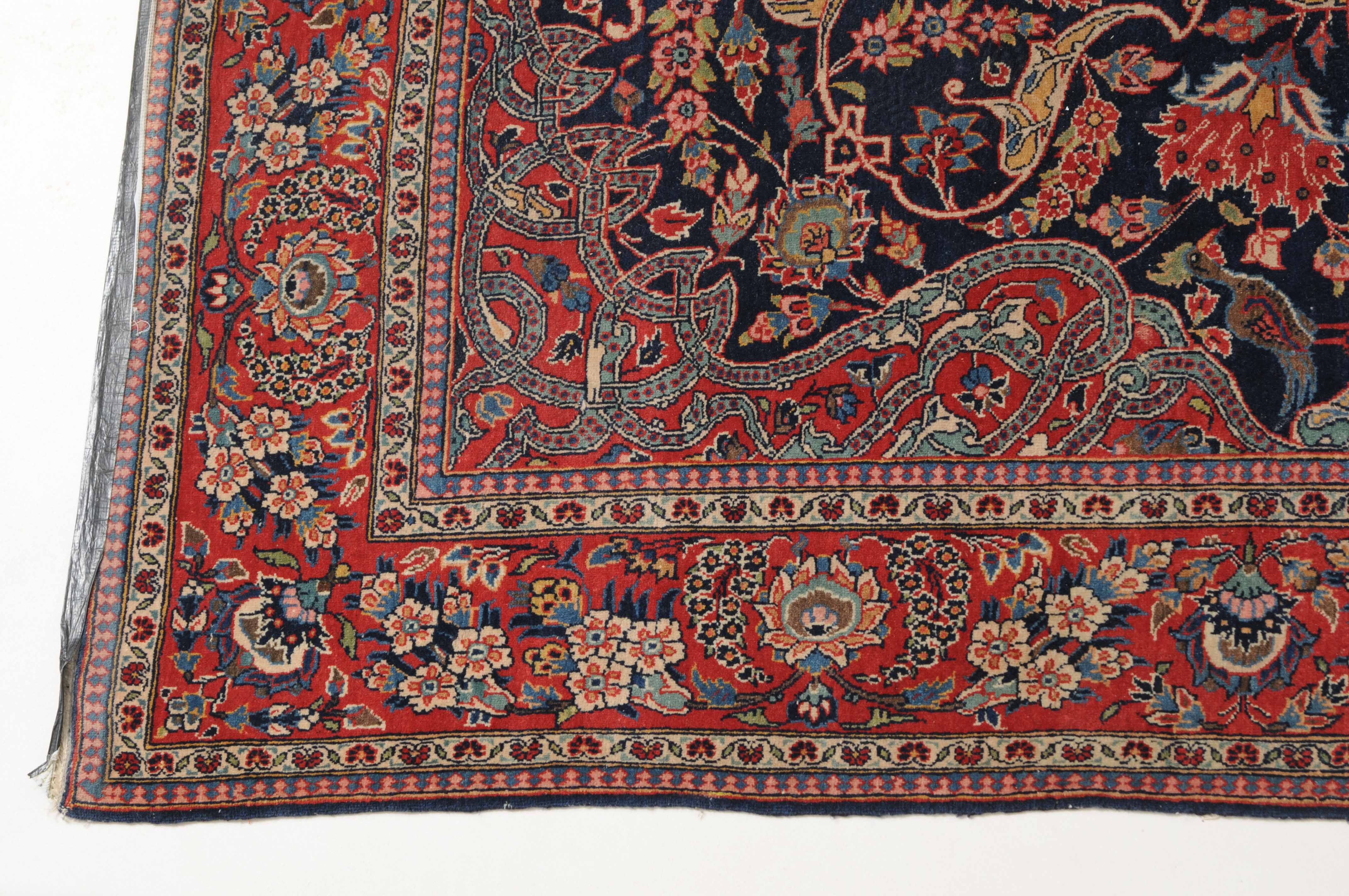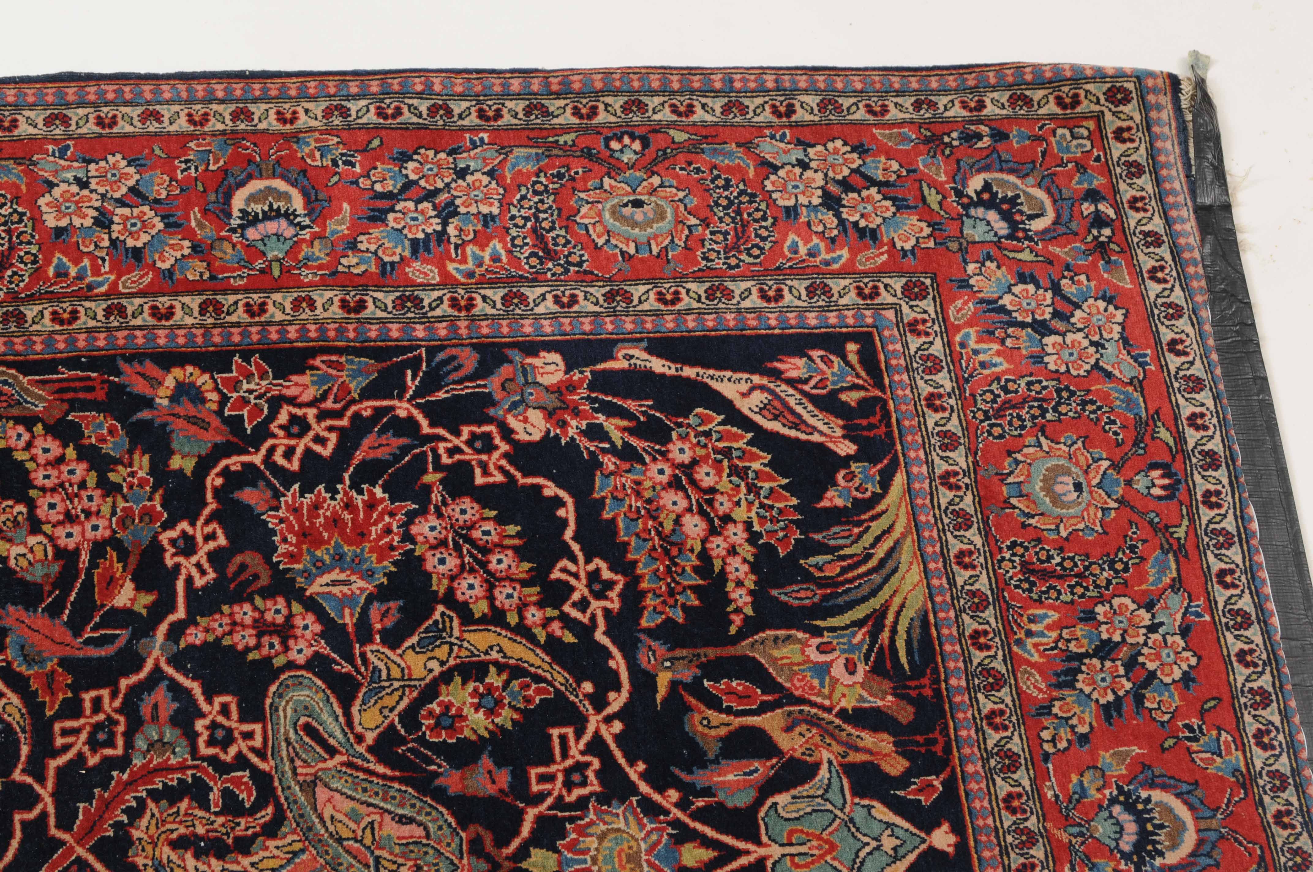 Z-Persien, um 1910. Dichtes florales Werk. Im nachtblauen Hauptfeld figurieren unter einer Gebetsnische (Mihrab) Vögel, flankiert von filigran gearbeiteten Blütenbouquets und girlandenartig angelegten Ranken und Zweigen. 2 Rosettenborten umgeben die mit Blütenkompositionen durchgehend gefüllte rote Hauptbordüre. Gebrauchsspuren. 132x208 cm (ft. 4.4x6.9).