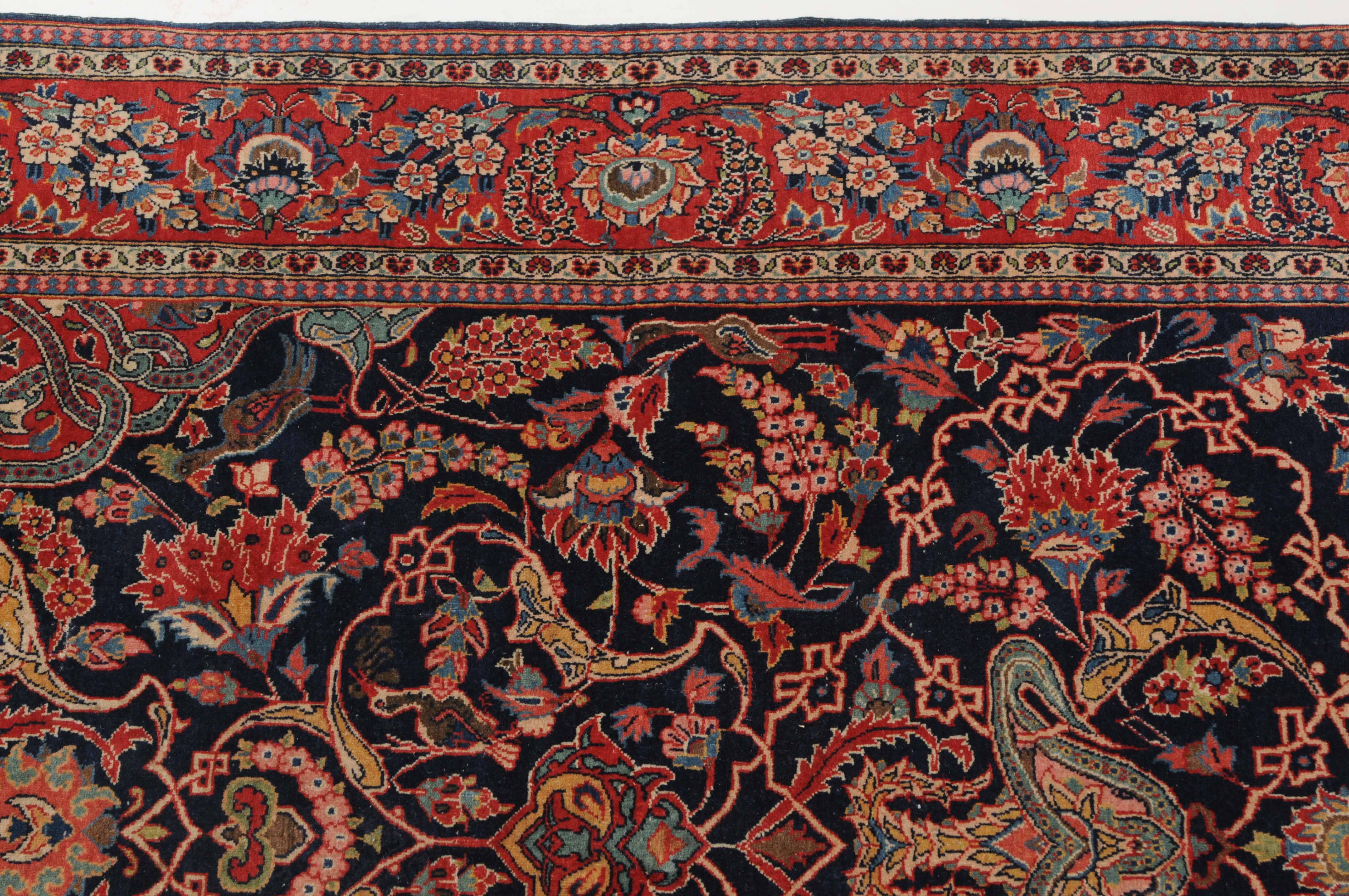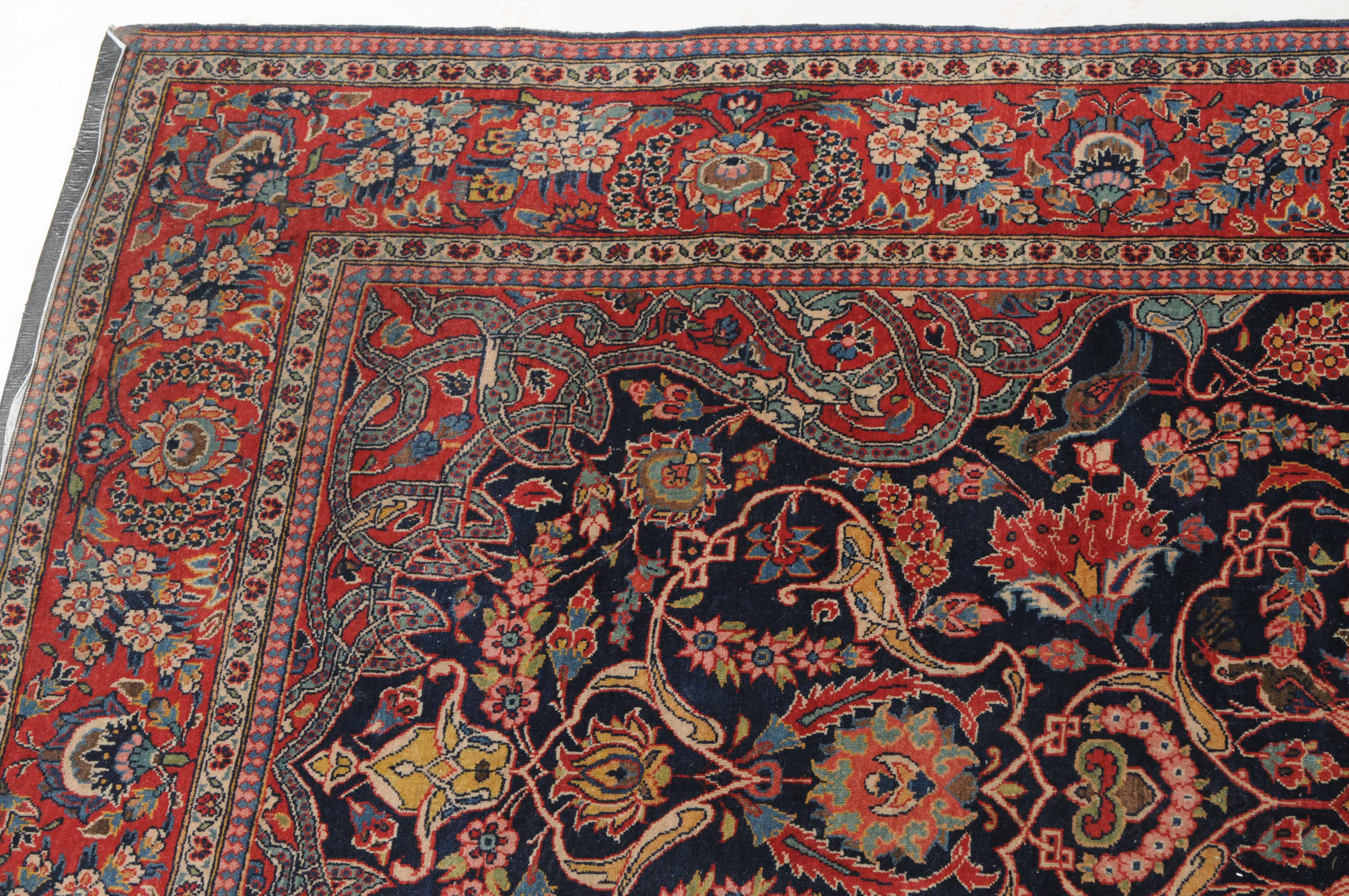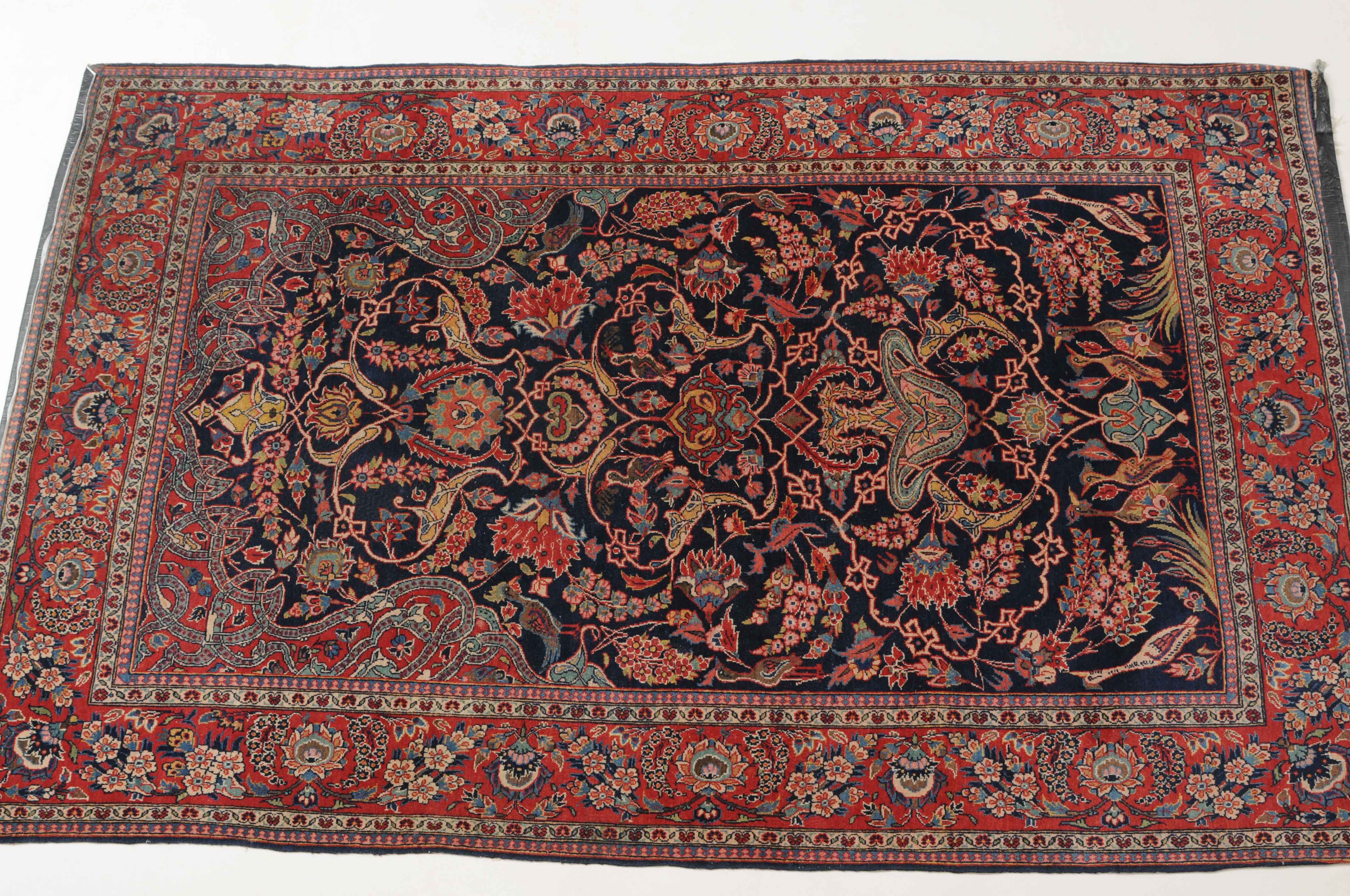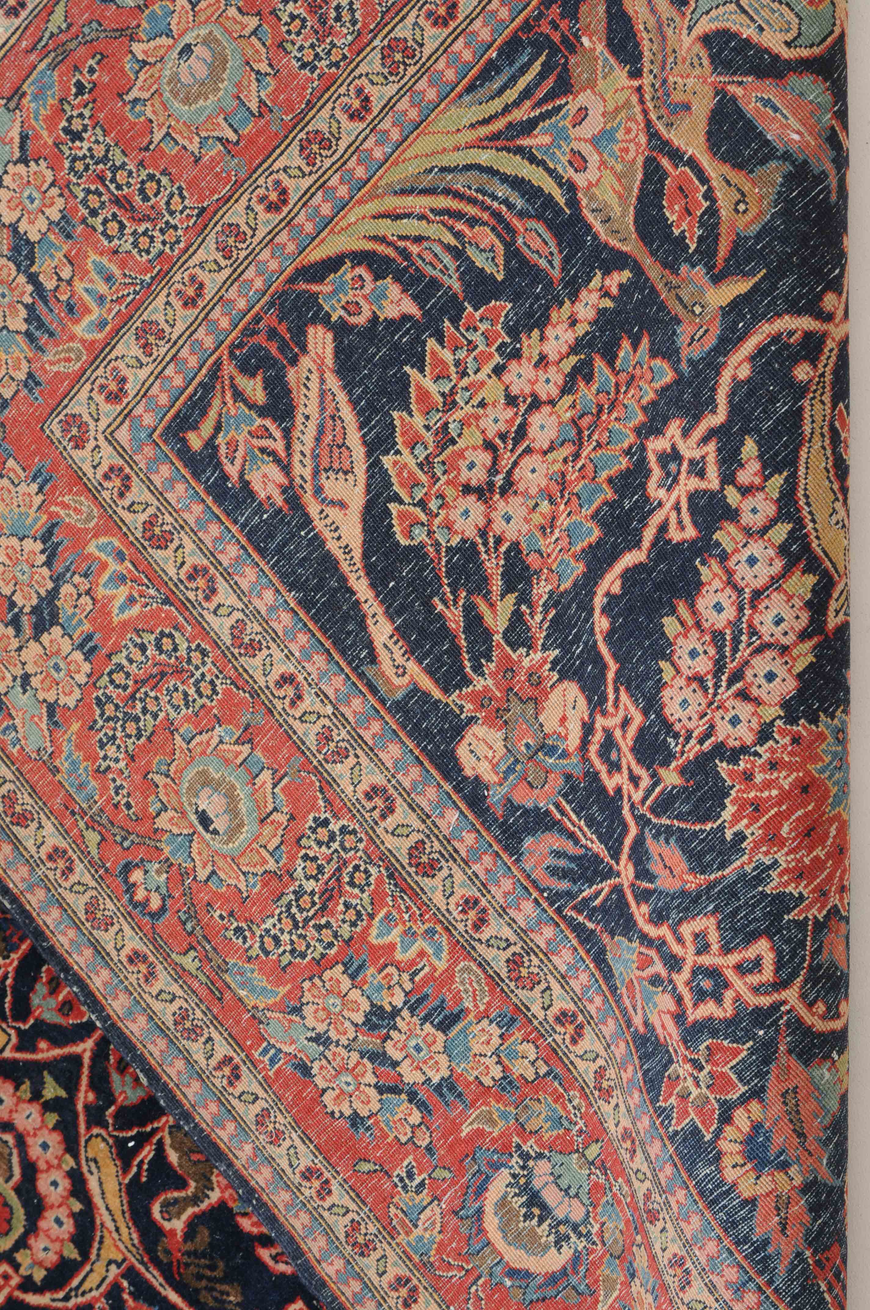 Z-Persien, um 1910. Dichtes florales Werk. Im nachtblauen Hauptfeld figurieren unter einer Gebetsnische (Mihrab) Vögel, flankiert von filigran gearbeiteten Blütenbouquets und girlandenartig angelegten Ranken und Zweigen. 2 Rosettenborten umgeben die mit Blütenkompositionen durchgehend gefüllte rote Hauptbordüre. Gebrauchsspuren. 132x208 cm (ft. 4.4x6.9).