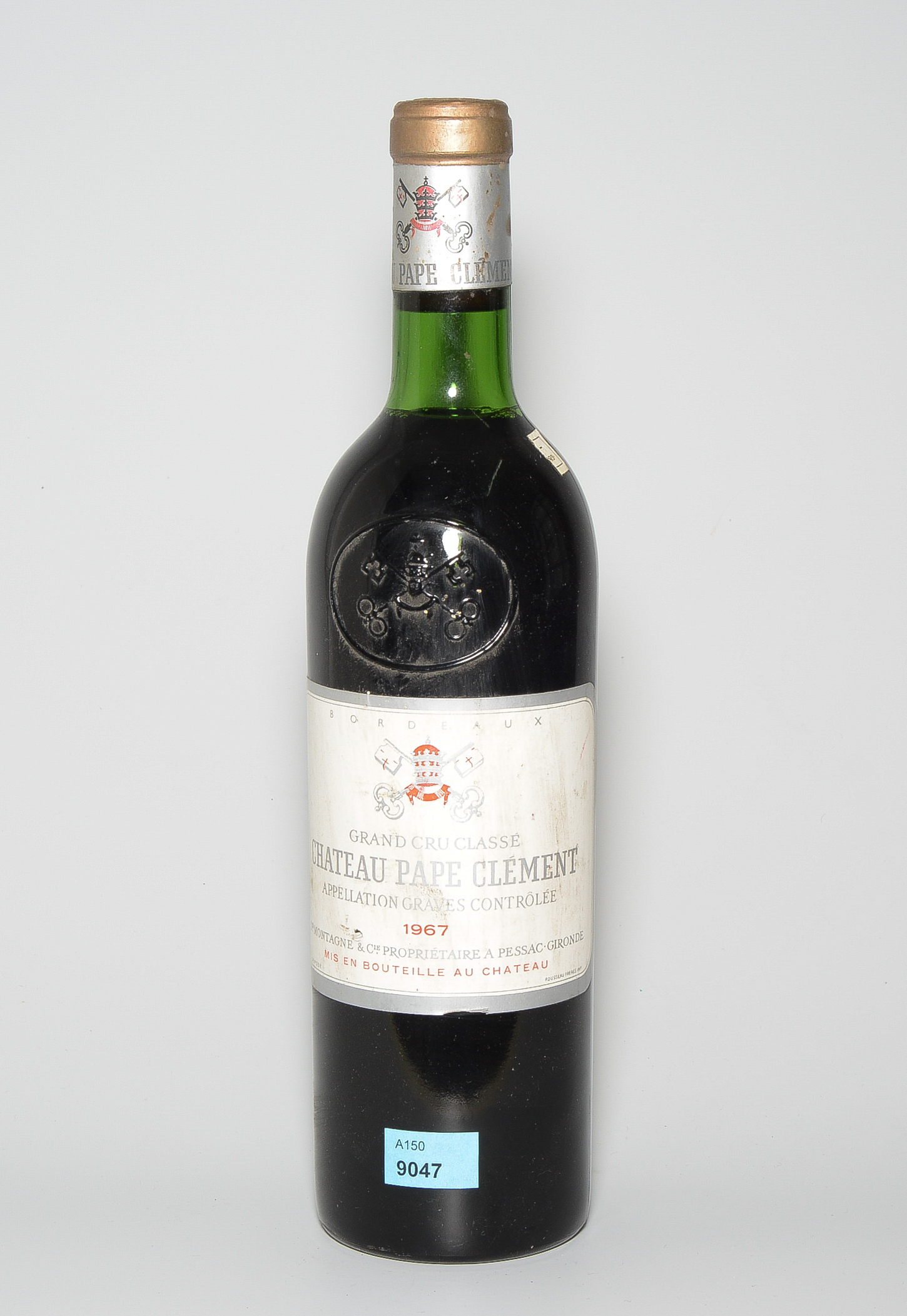 Chat. Pape Clement, 67 GC Graves, 1 Fl. Chat. la Baisserie, 82 St.Emilion, 2 Fl. Tertre du Moulin, 97 St.Emilion, 2 Fl. Vieux Chateau Mazerat, 71 St.Emilion, 3 Fl. Chat. Marquis de Terme, 88 Margaux, 1 Fl. Chat. Bataille, 87 Pauillac, 1 Fl. Chat. Haut Villette,87 St.Emilion, 1 Fl. Chat. Monbousquet, 78 St. Emilion, 1 Fl. Zusammen 12 Flaschen.