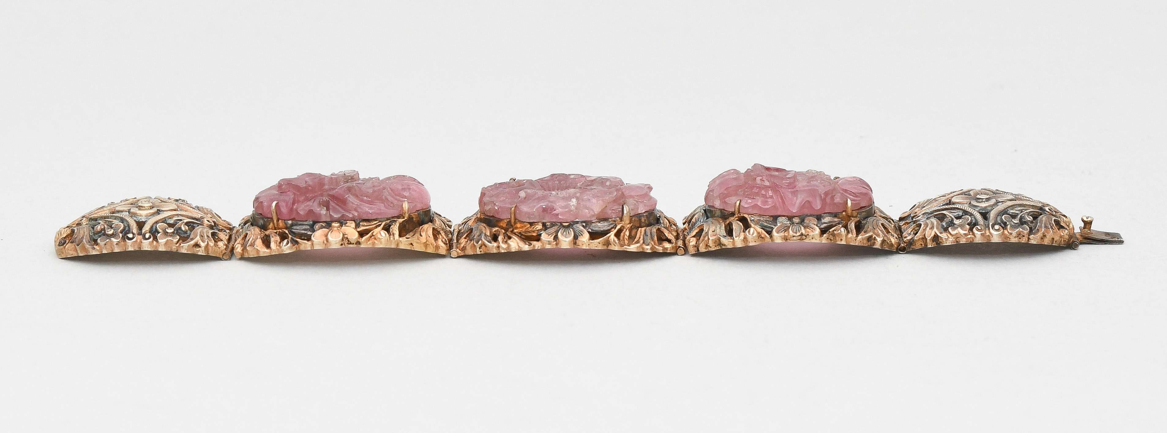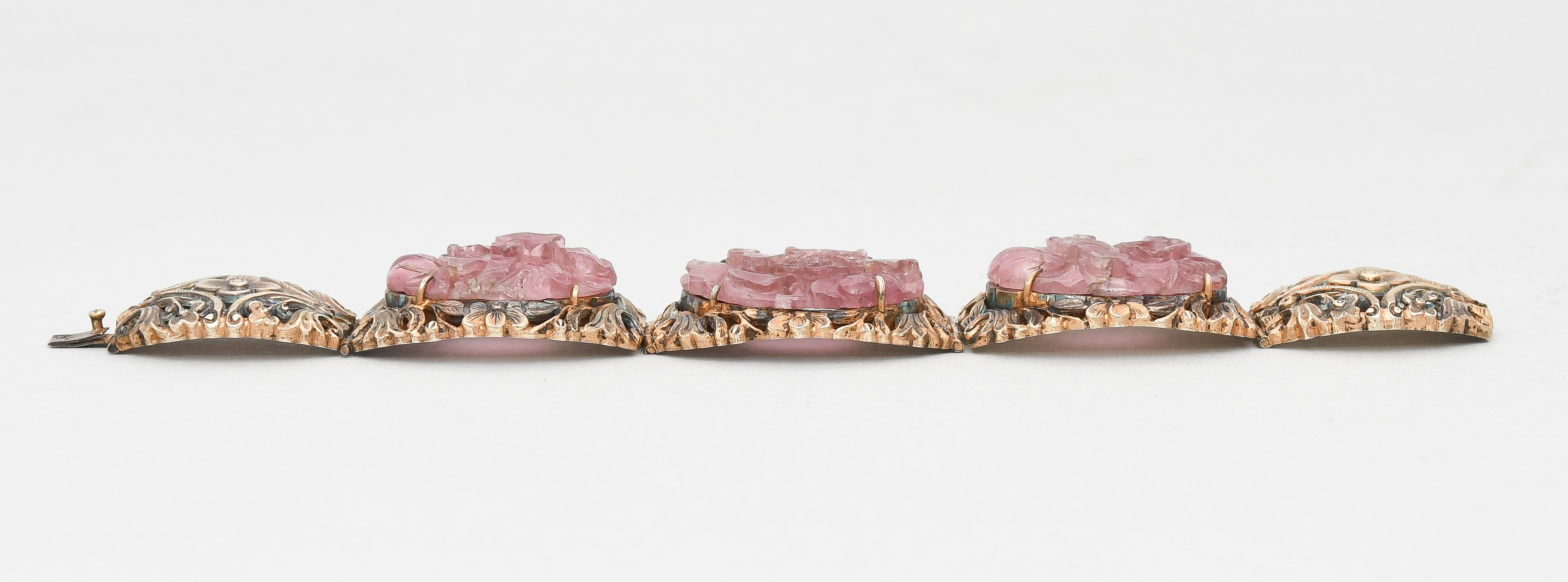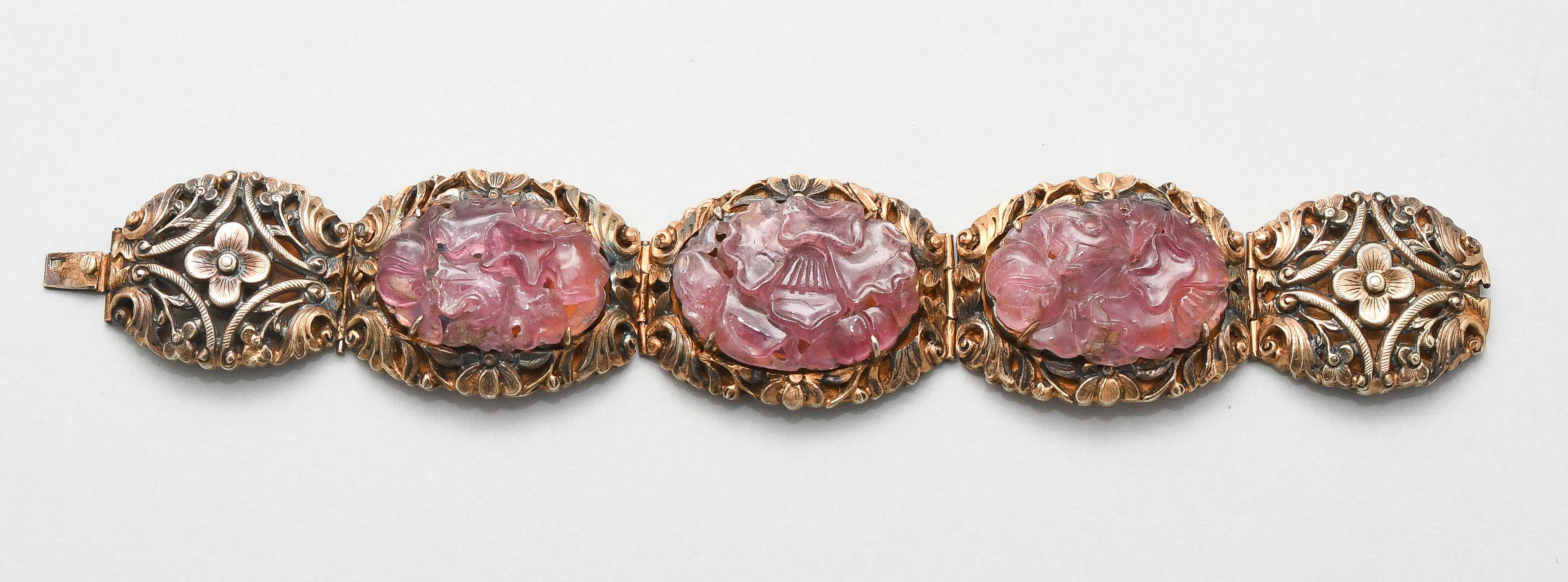 China, Anfang 20.Jh. Silber, vergoldet mit Turmalin. Fünfgliedriges Silberarmband mit reliefiertem Floraldekor und besetzt mit drei tlw. durchbrochen gearbeiteten Turmalin-Ovalen. Mit Punze "ZBW" und "800". L 17,5 cm. - Tlw. bestossen.