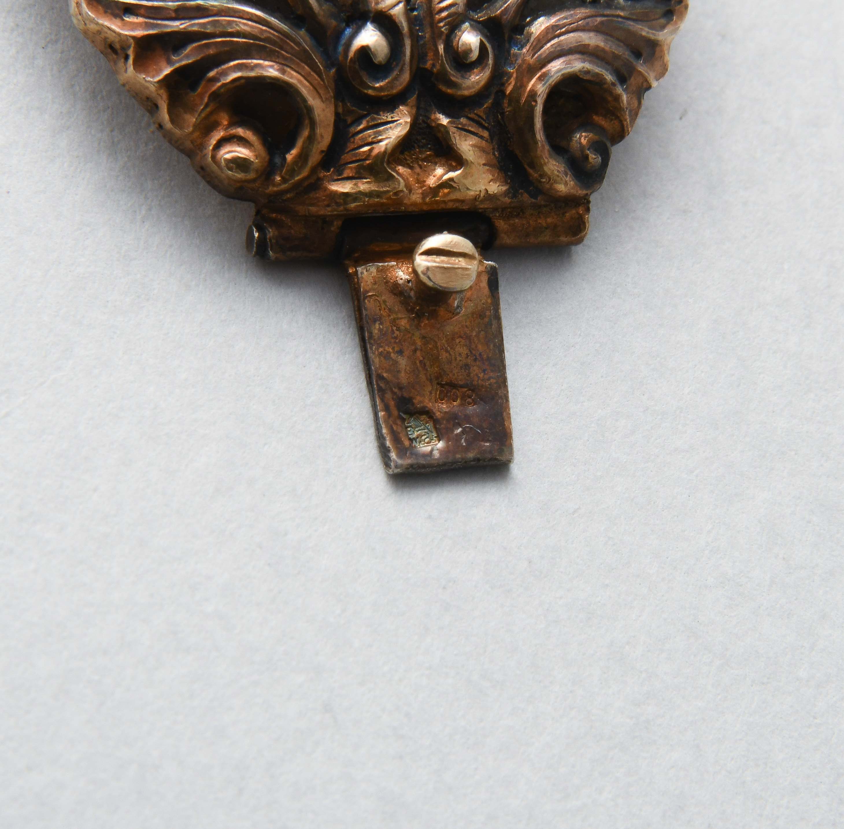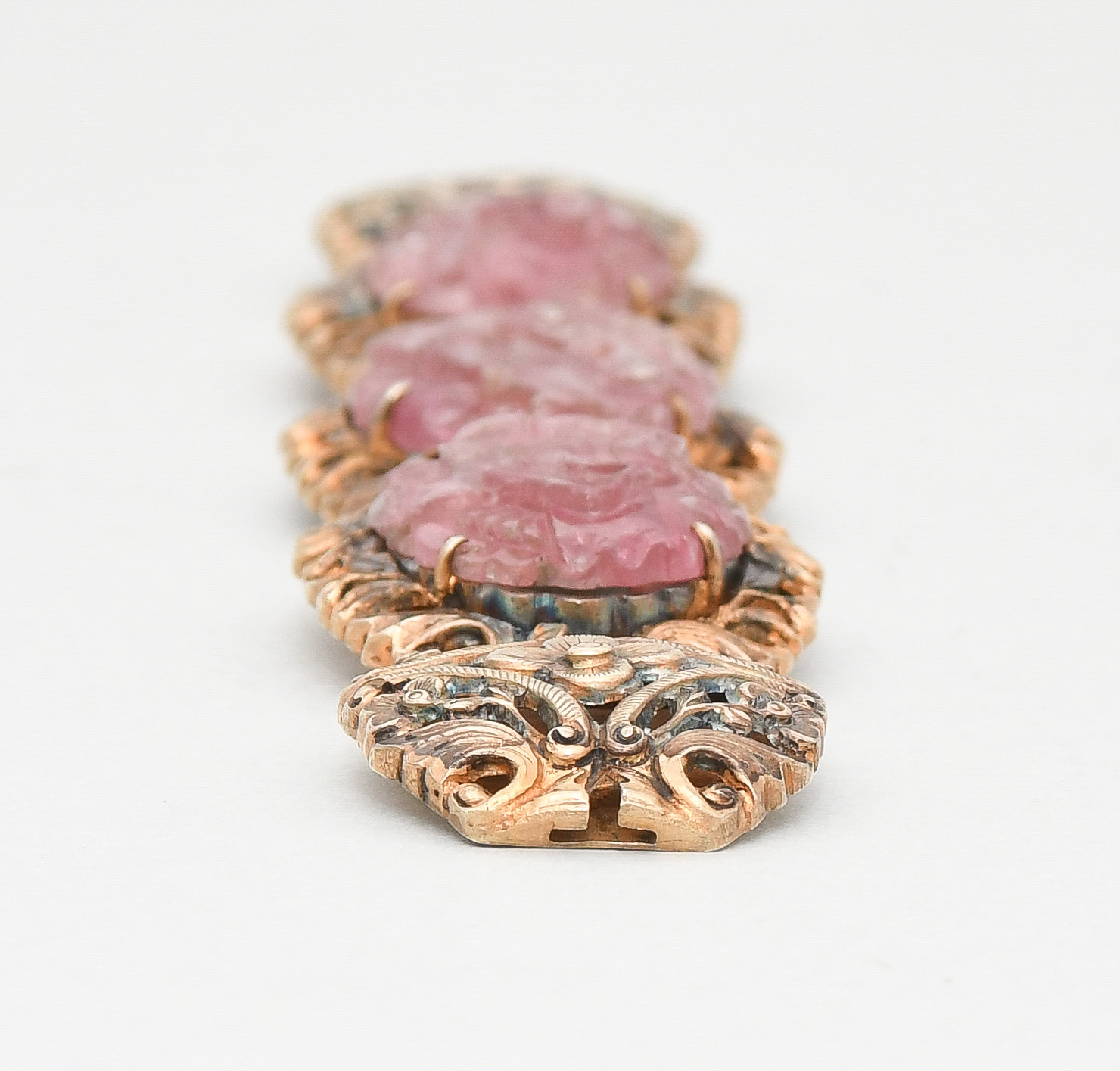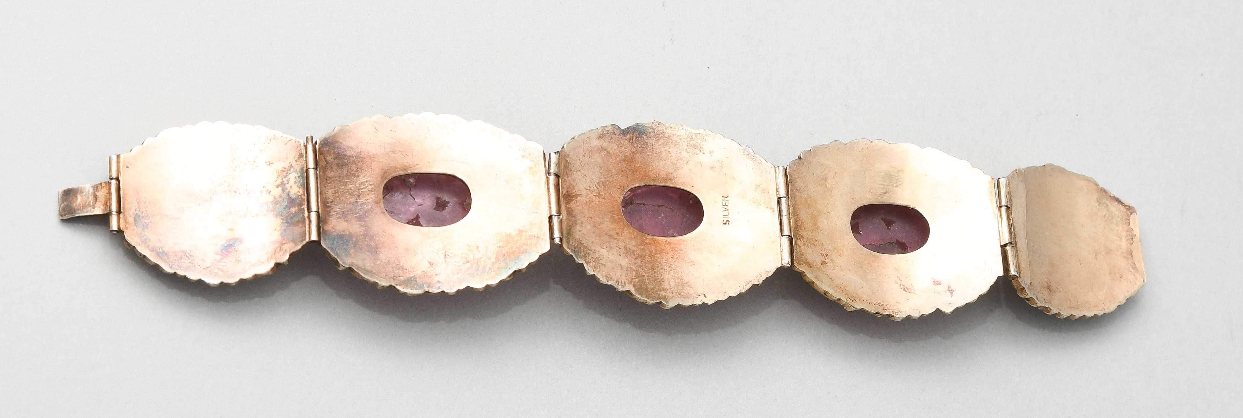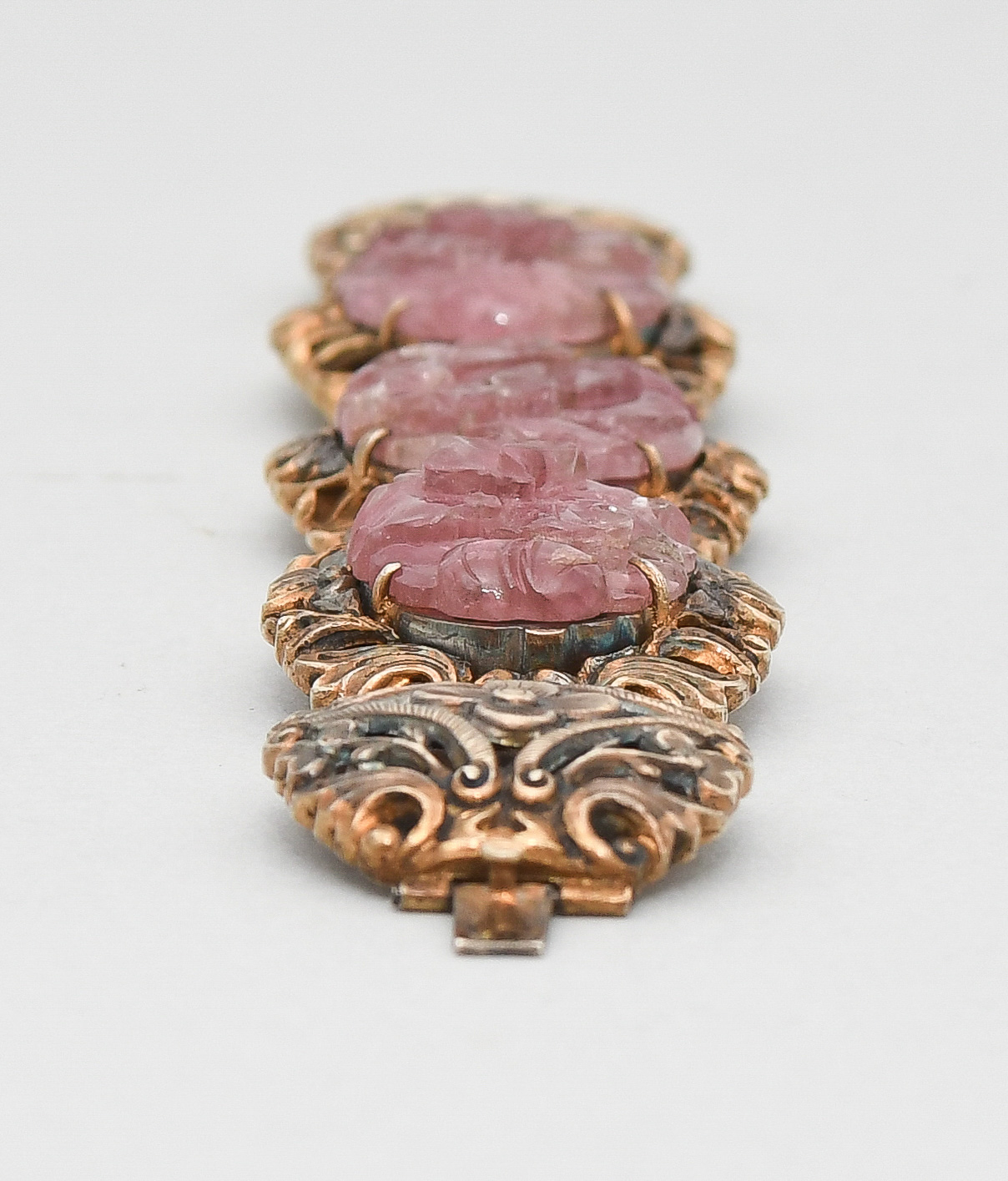 China, Anfang 20.Jh. Silber, vergoldet mit Turmalin. Fünfgliedriges Silberarmband mit reliefiertem Floraldekor und besetzt mit drei tlw. durchbrochen gearbeiteten Turmalin-Ovalen. Mit Punze "ZBW" und "800". L 17,5 cm. - Tlw. bestossen.