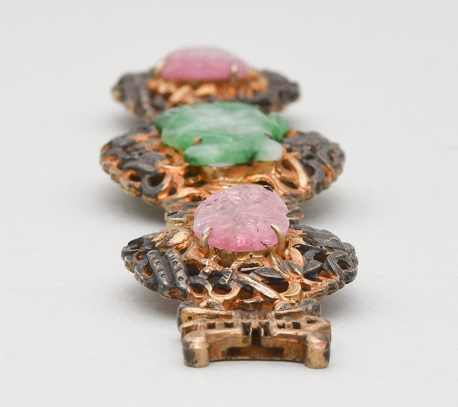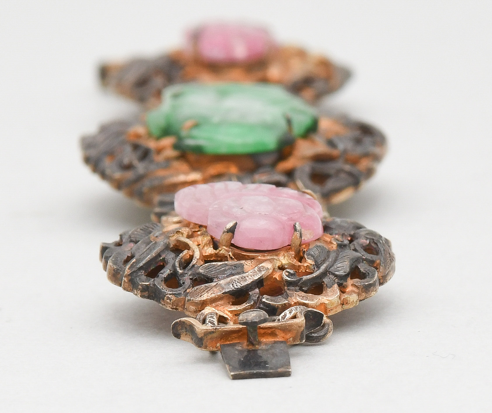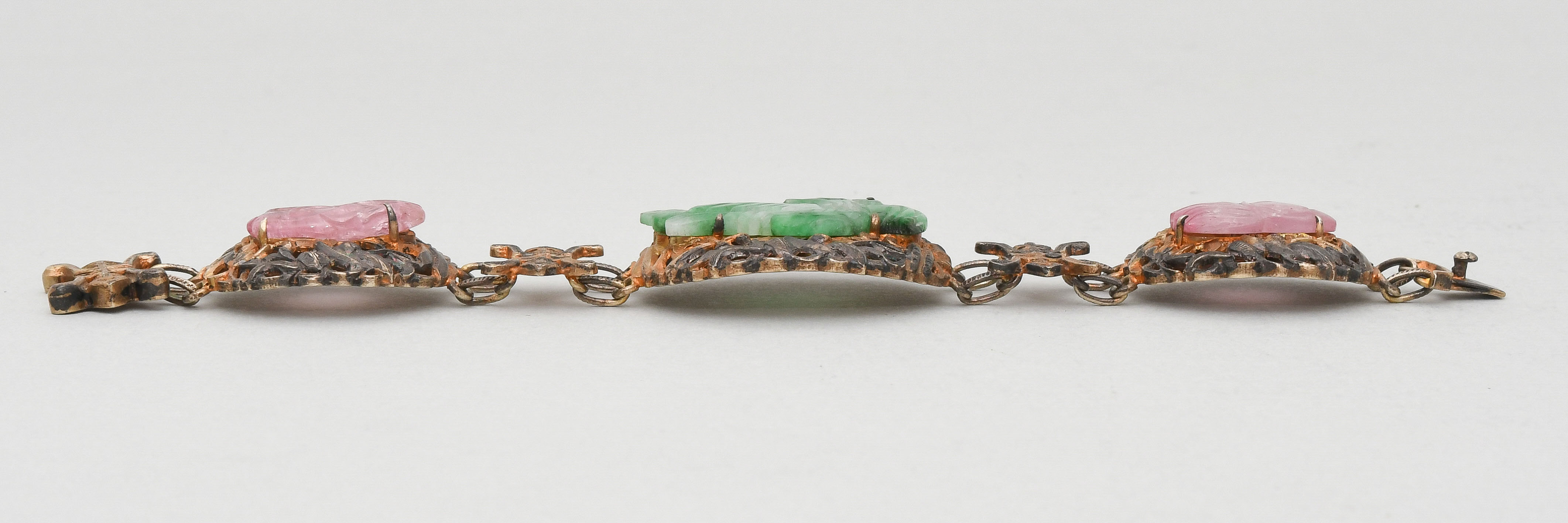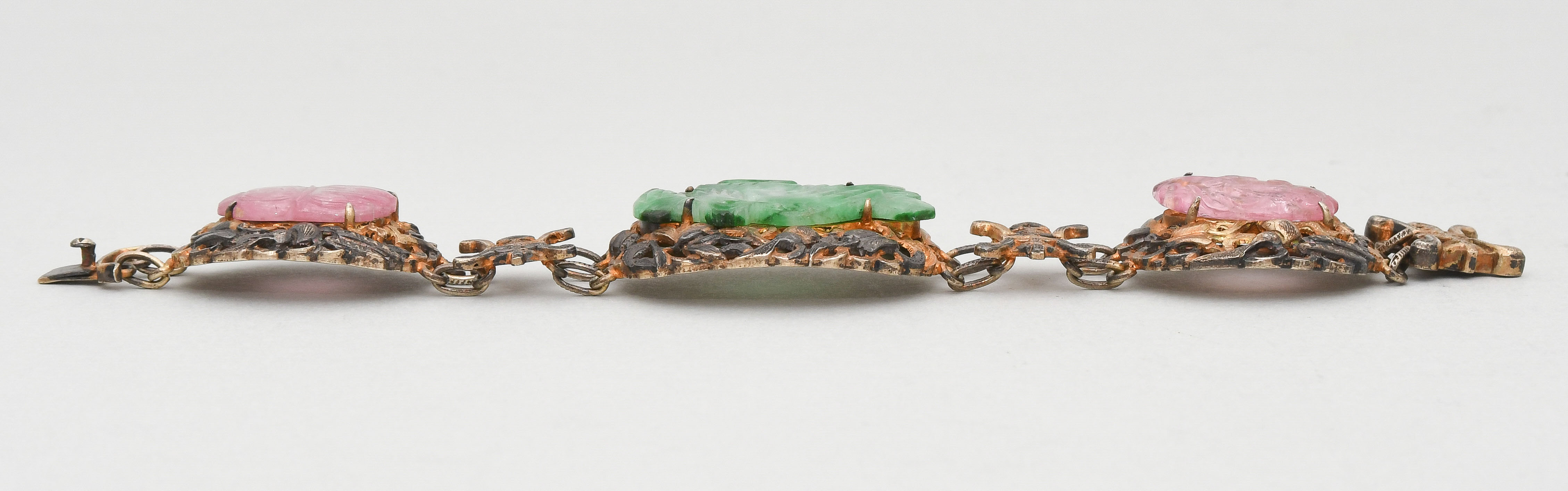 China, 1.Hälfte 20.Jh. Silber mit Resten einer Vergoldung, besetzt mit Halbedelsteinen. Dreigliedriges Bracelet besetzt mit zwei Turmalin- und einem Jadeplättchen, verbunden mit drei Verbindungsglieder in Shou-Form. Verschluss mit Punze: "Silver". L 17,5 cm.