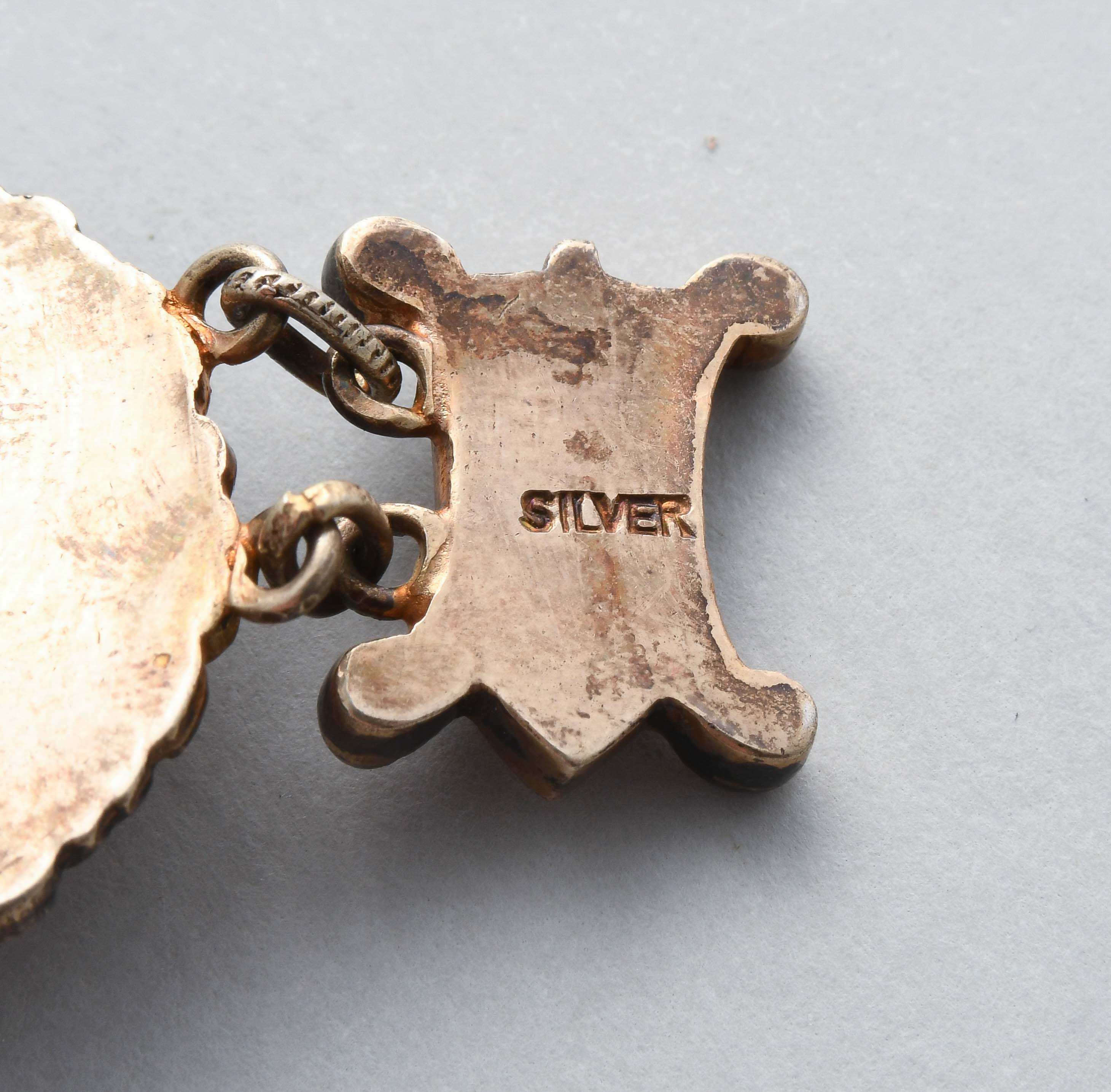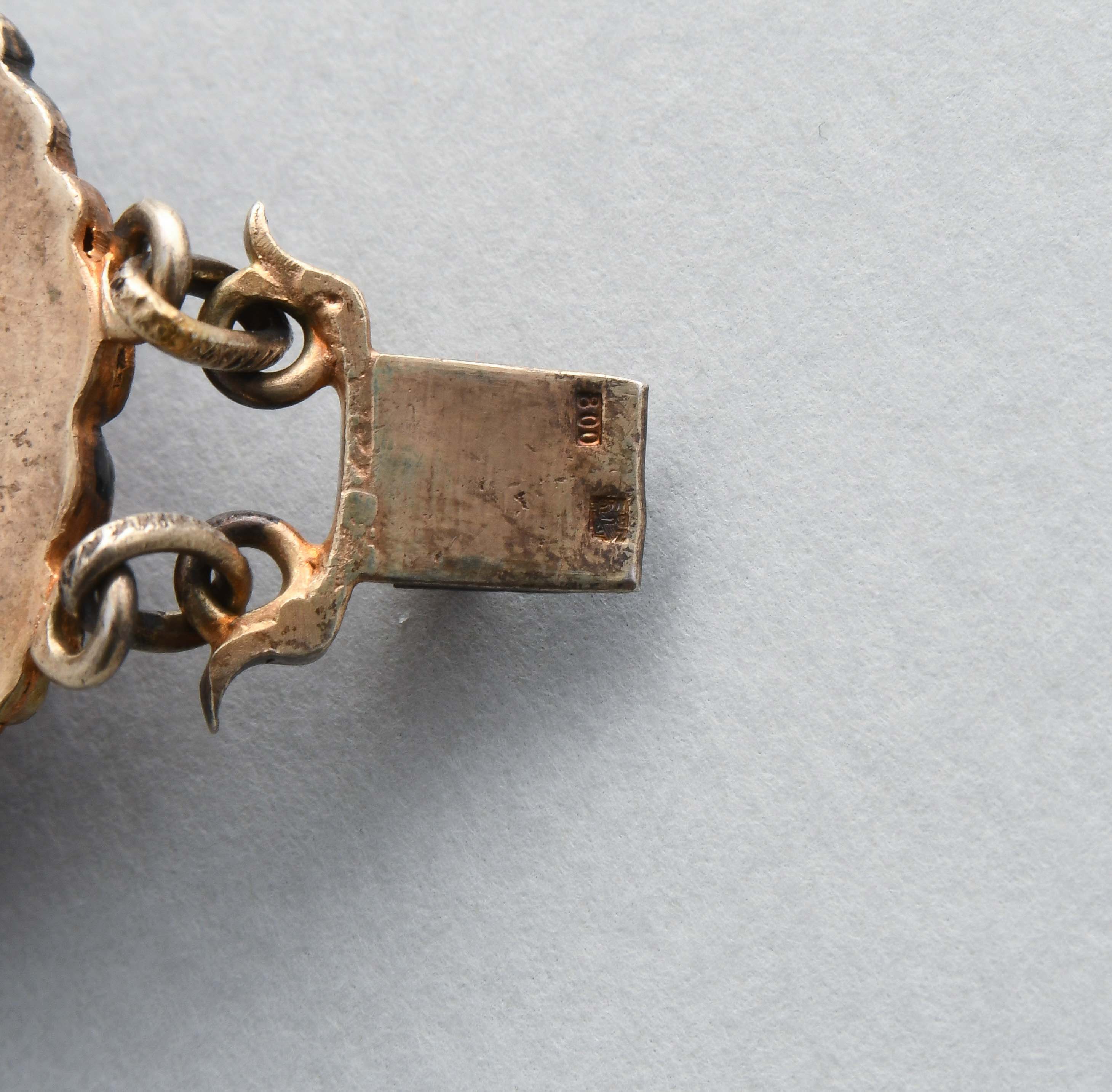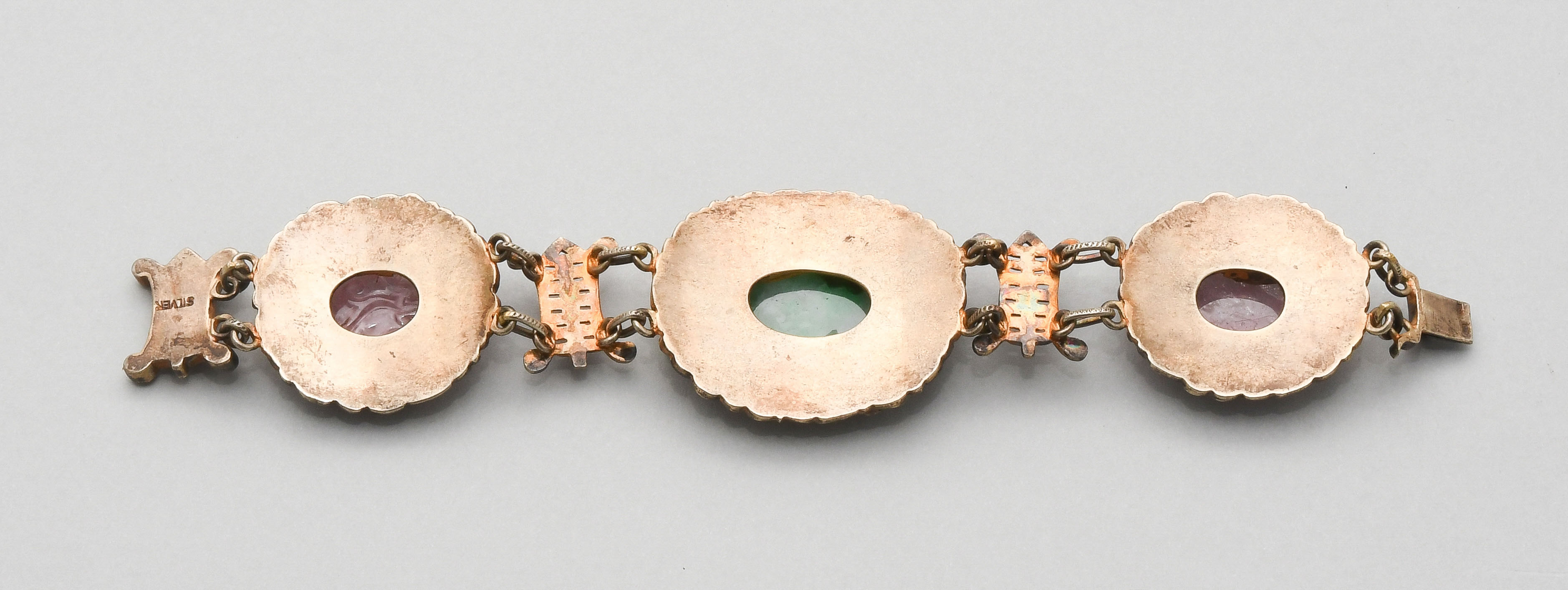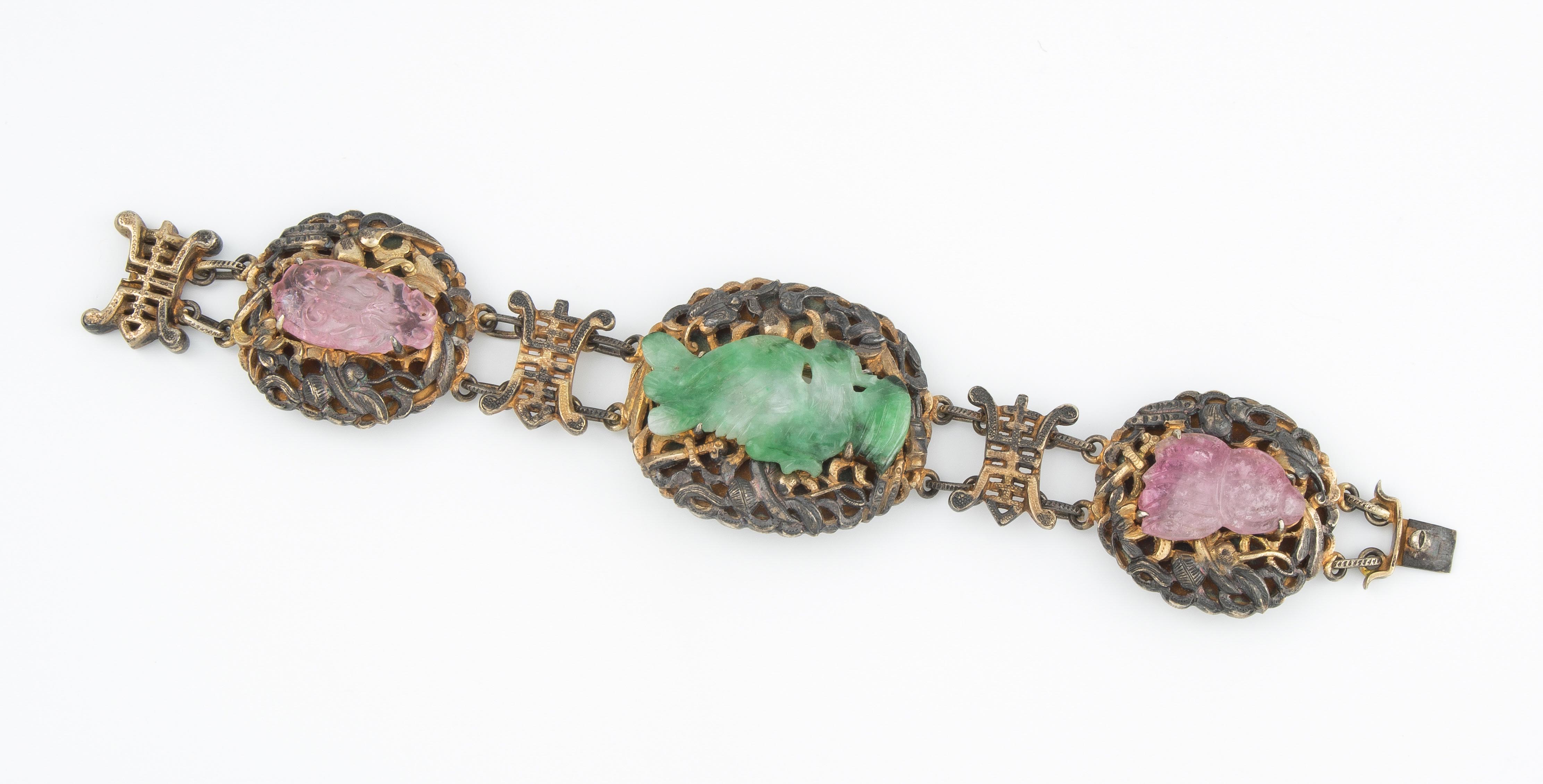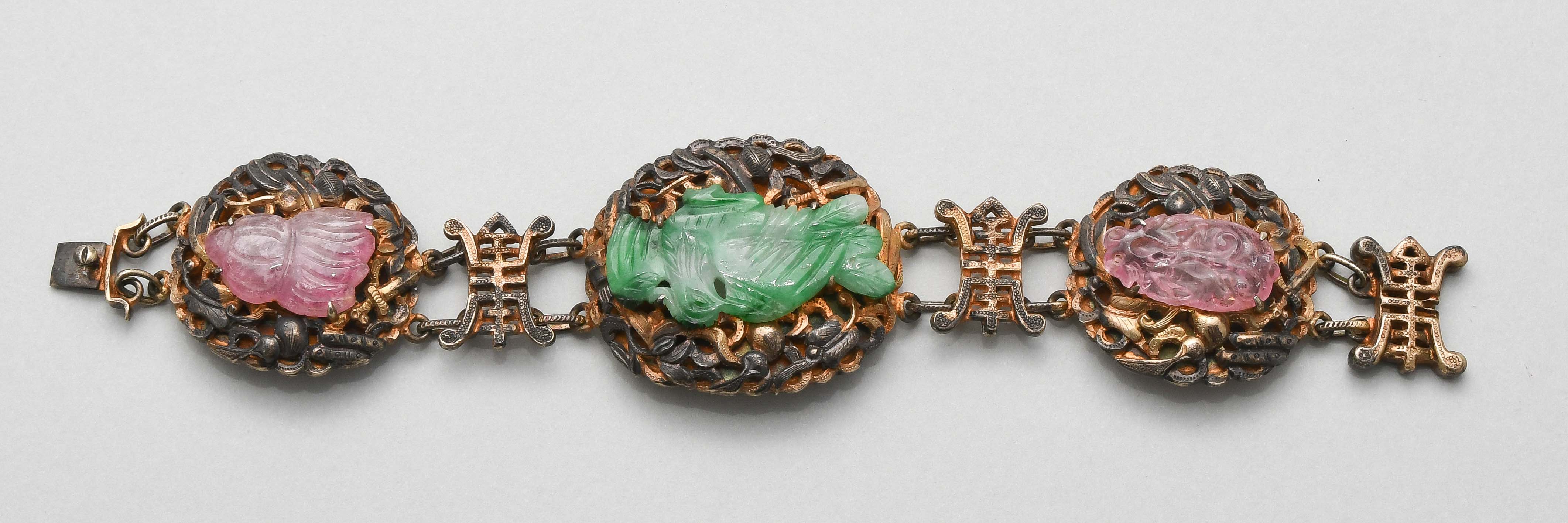 China, 1.Hälfte 20.Jh. Silber mit Resten einer Vergoldung, besetzt mit Halbedelsteinen. Dreigliedriges Bracelet besetzt mit zwei Turmalin- und einem Jadeplättchen, verbunden mit drei Verbindungsglieder in Shou-Form. Verschluss mit Punze: "Silver". L 17,5 cm.