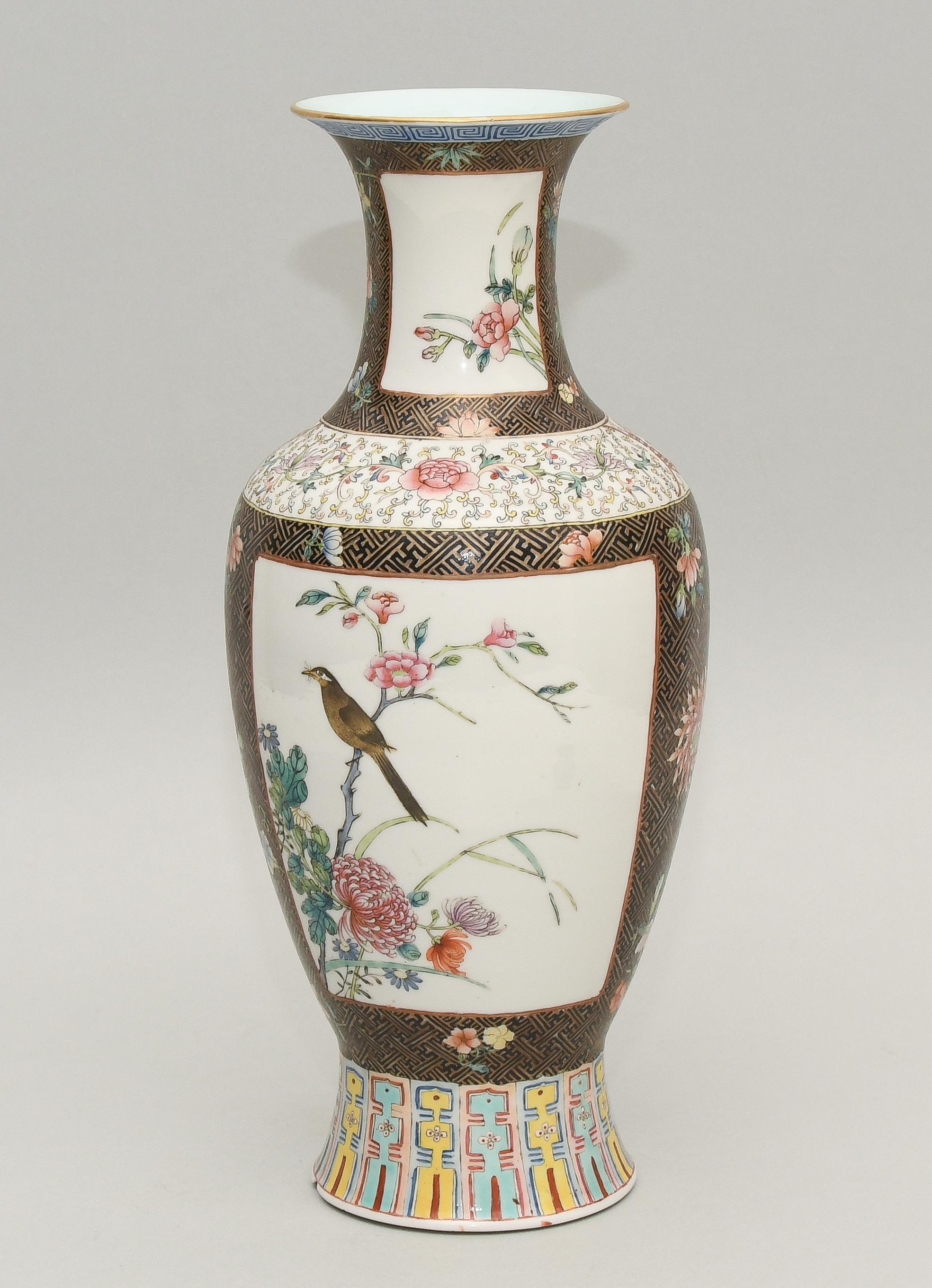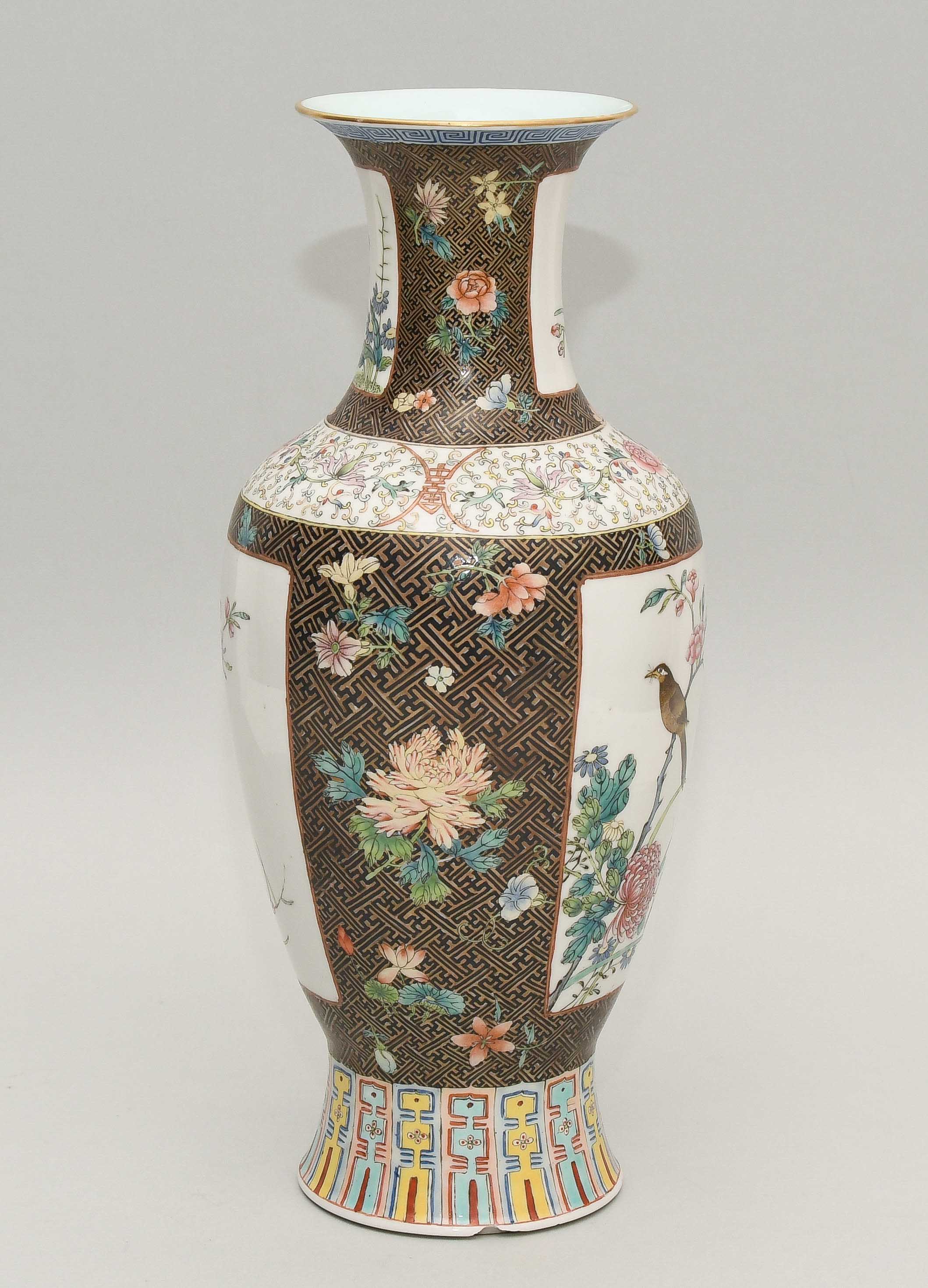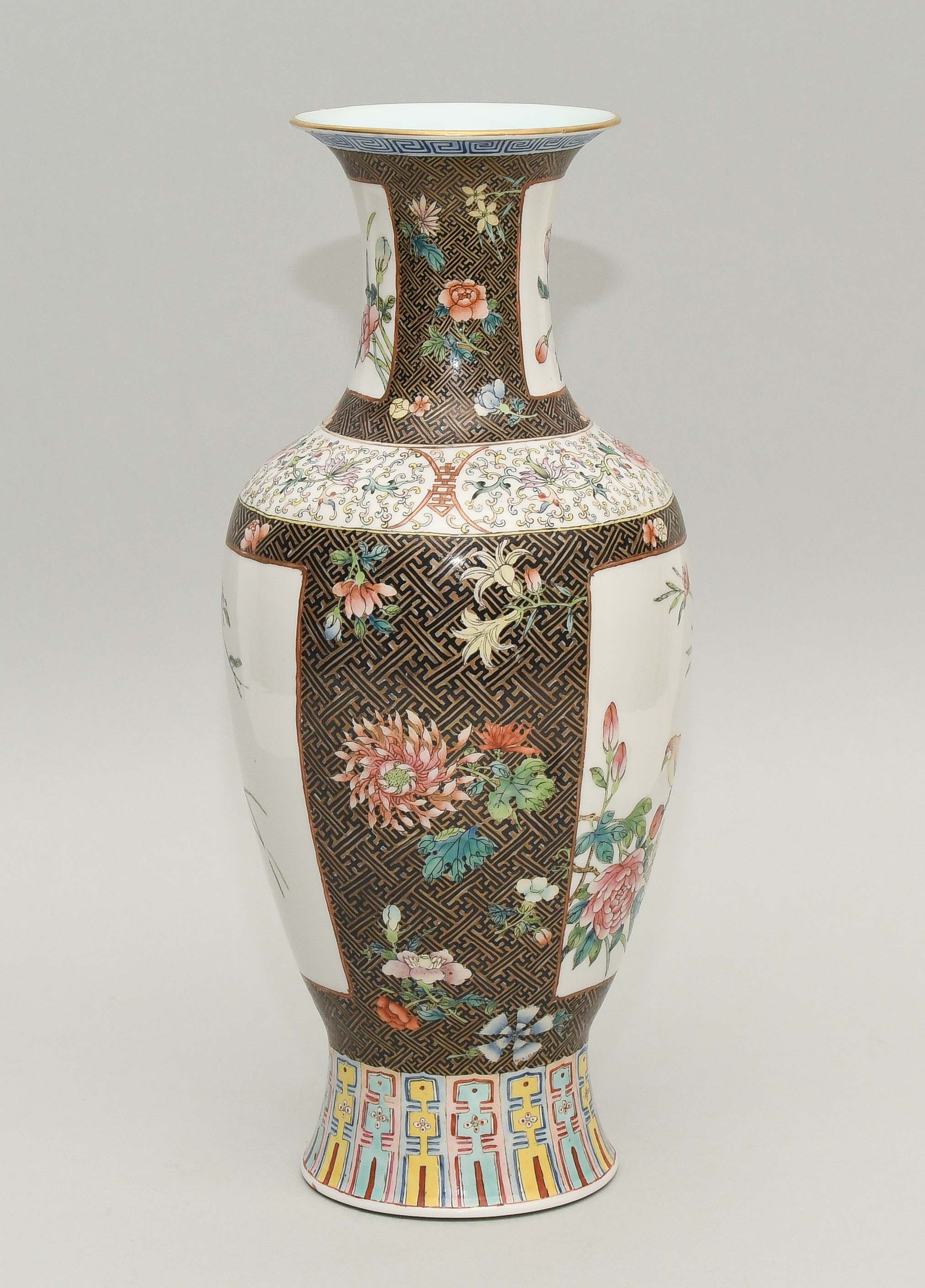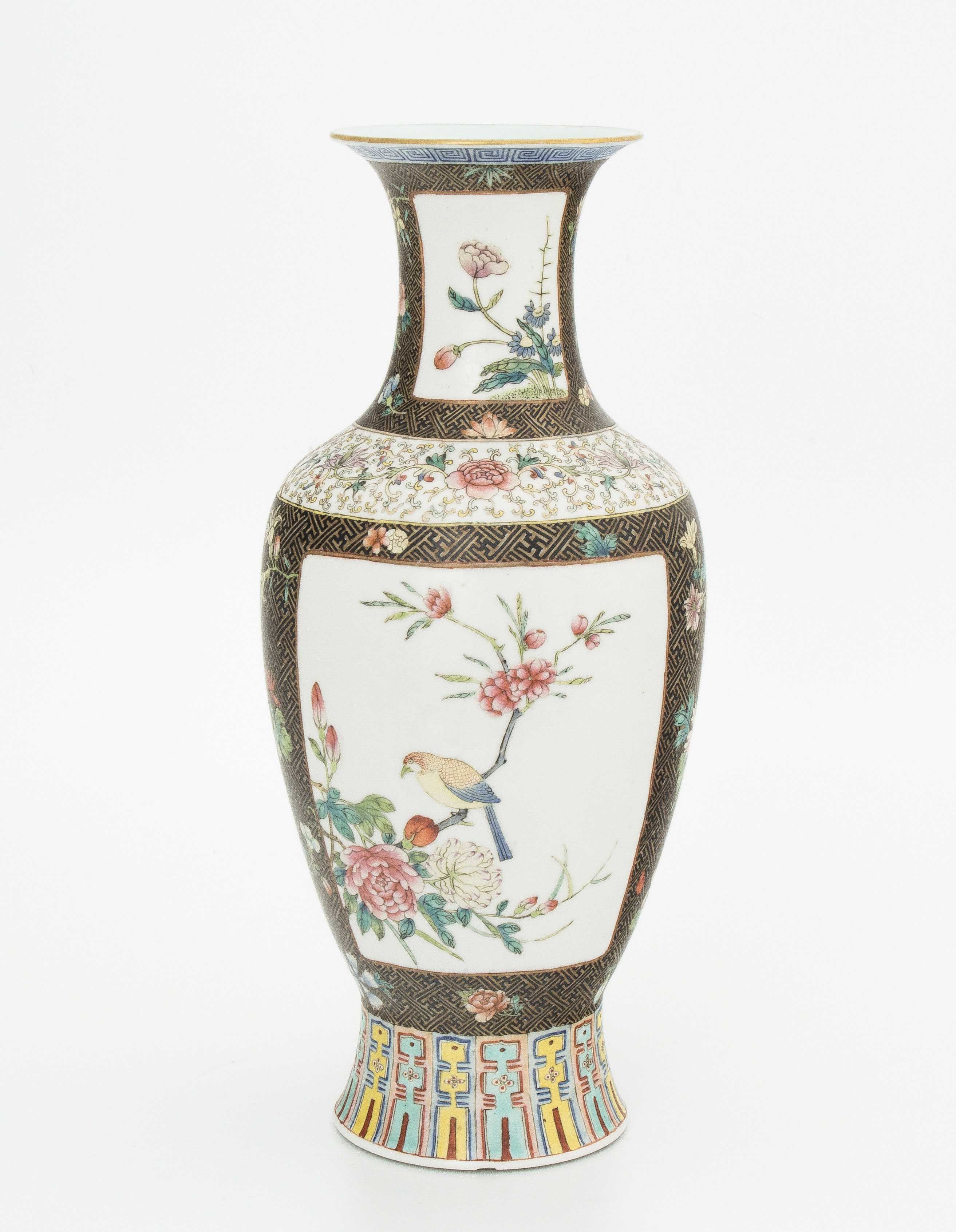China, 20.Jh. Porzellan. Blumen-/Vogeldekor in den beiden Paneelen in Famille Rose auf schwarz-goldenem Grund. Apokryphe eisenrote Qianlong-Marke. H 33,5 cm. - Bestossen.