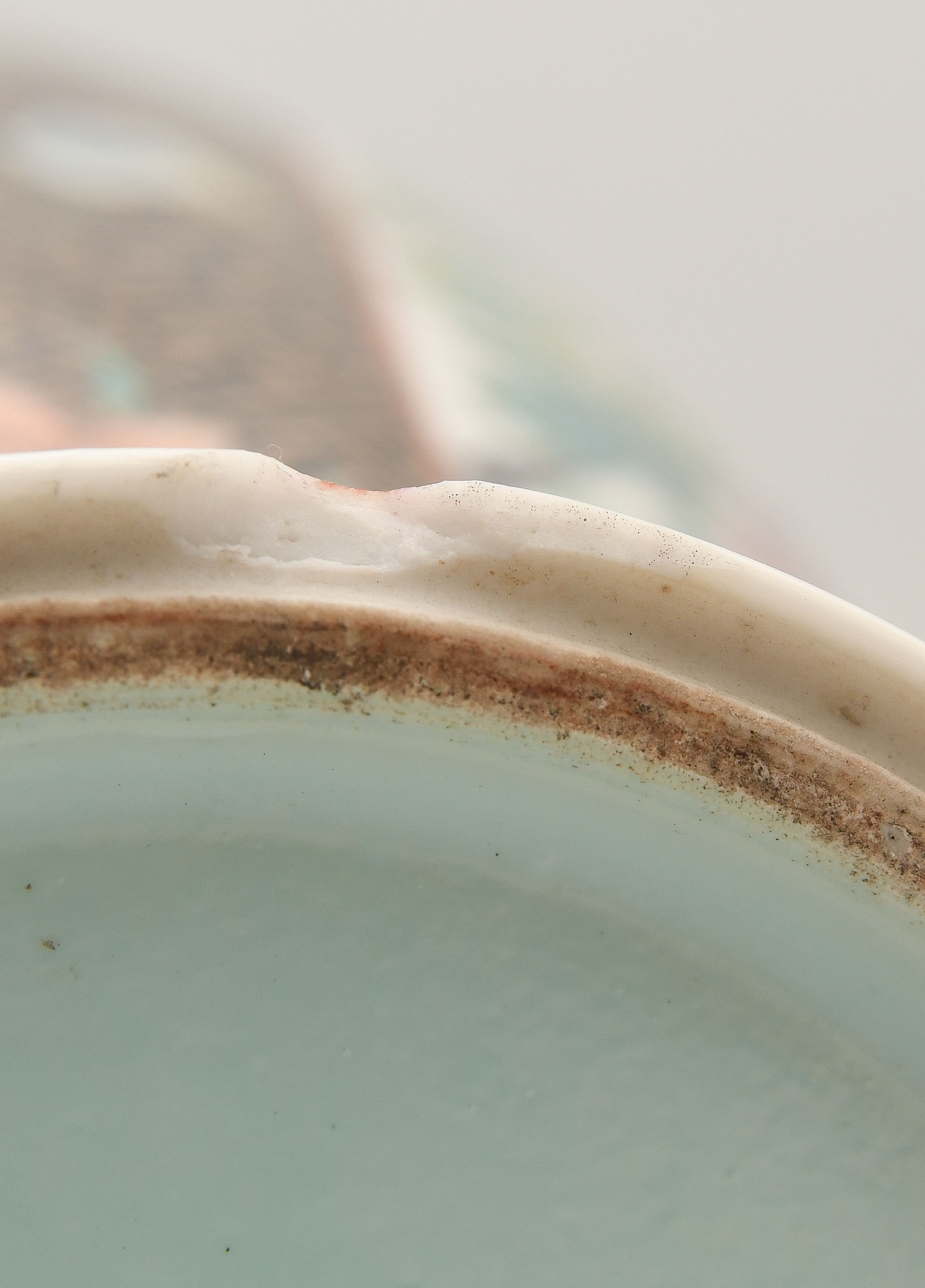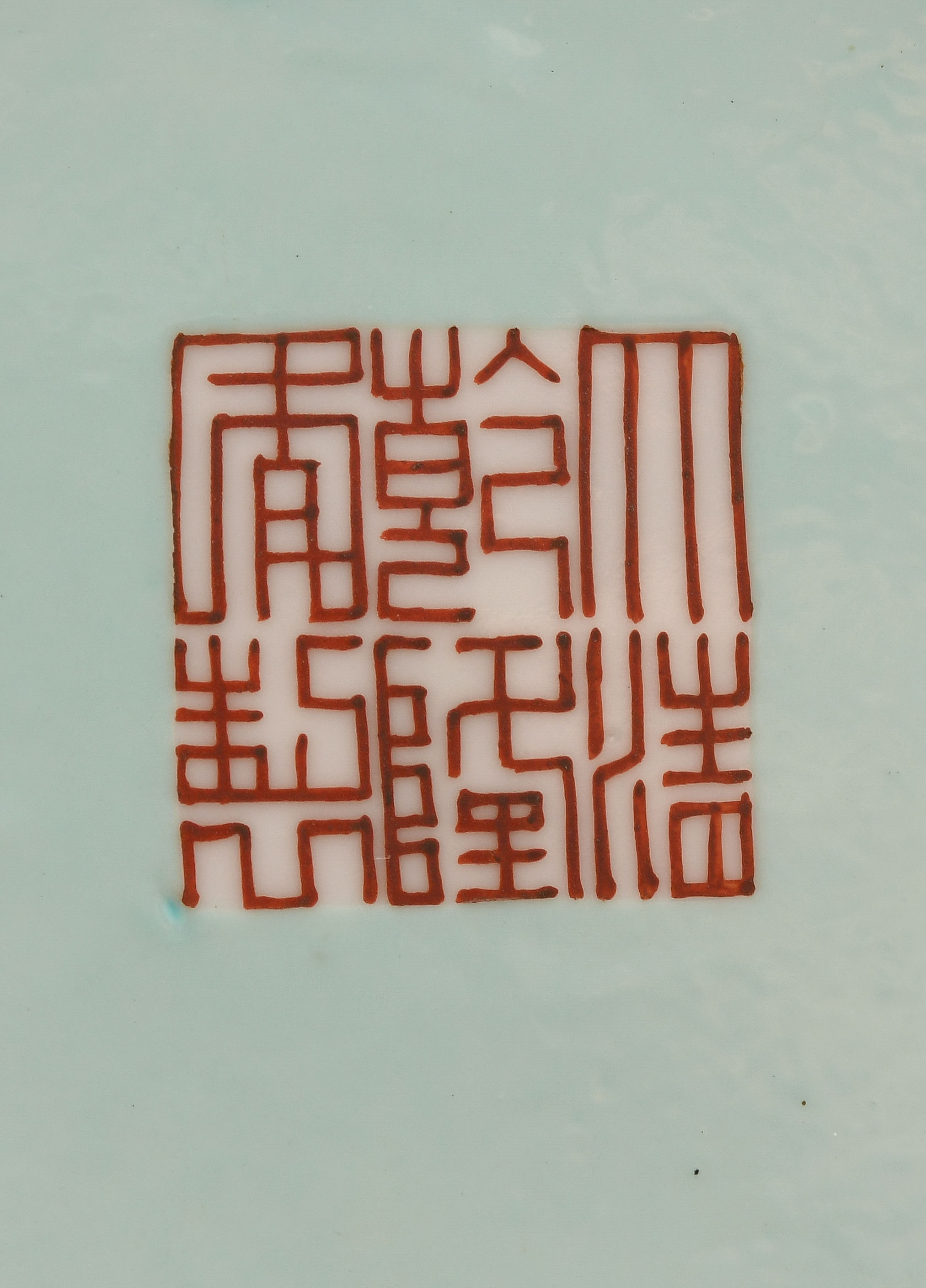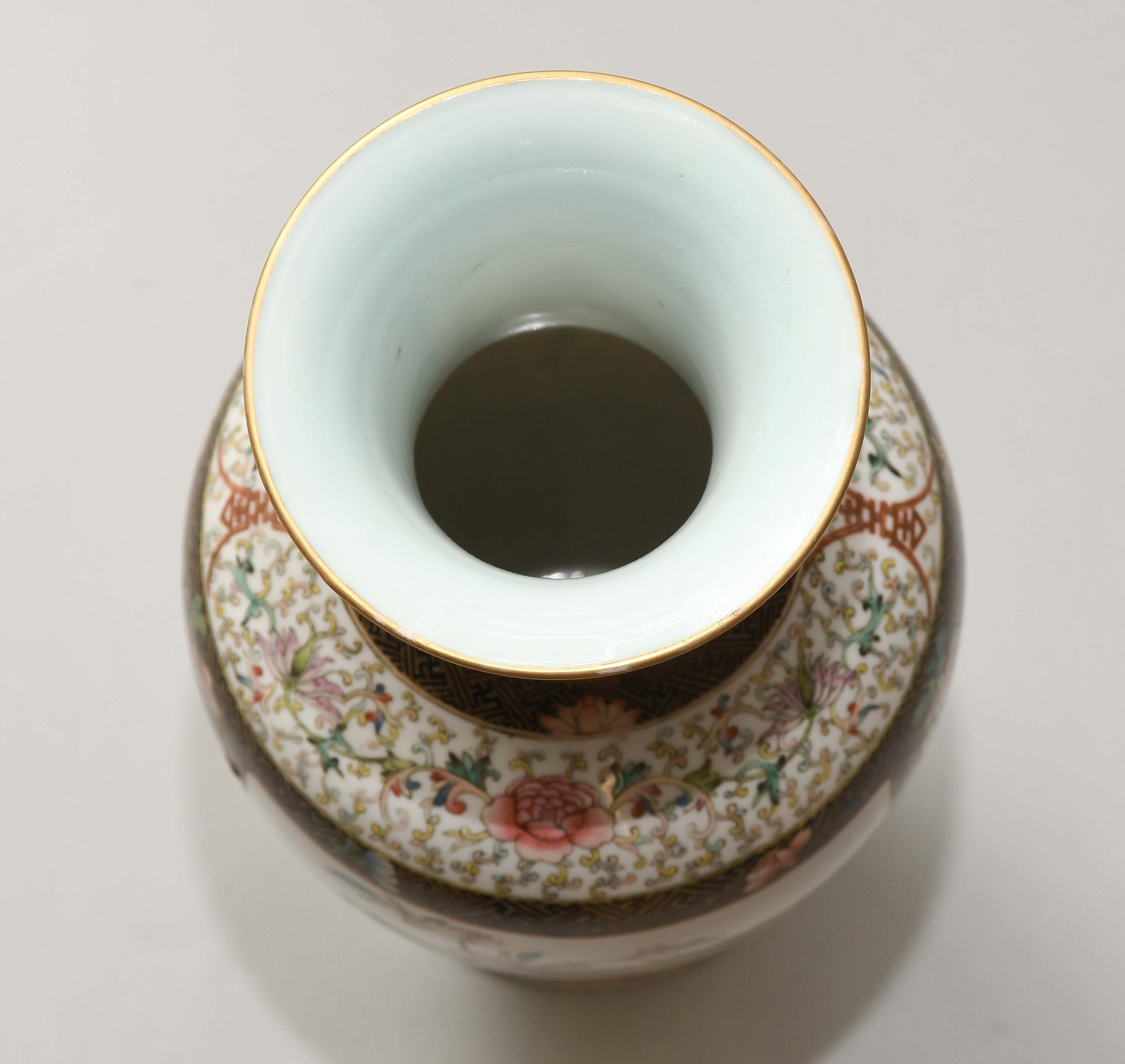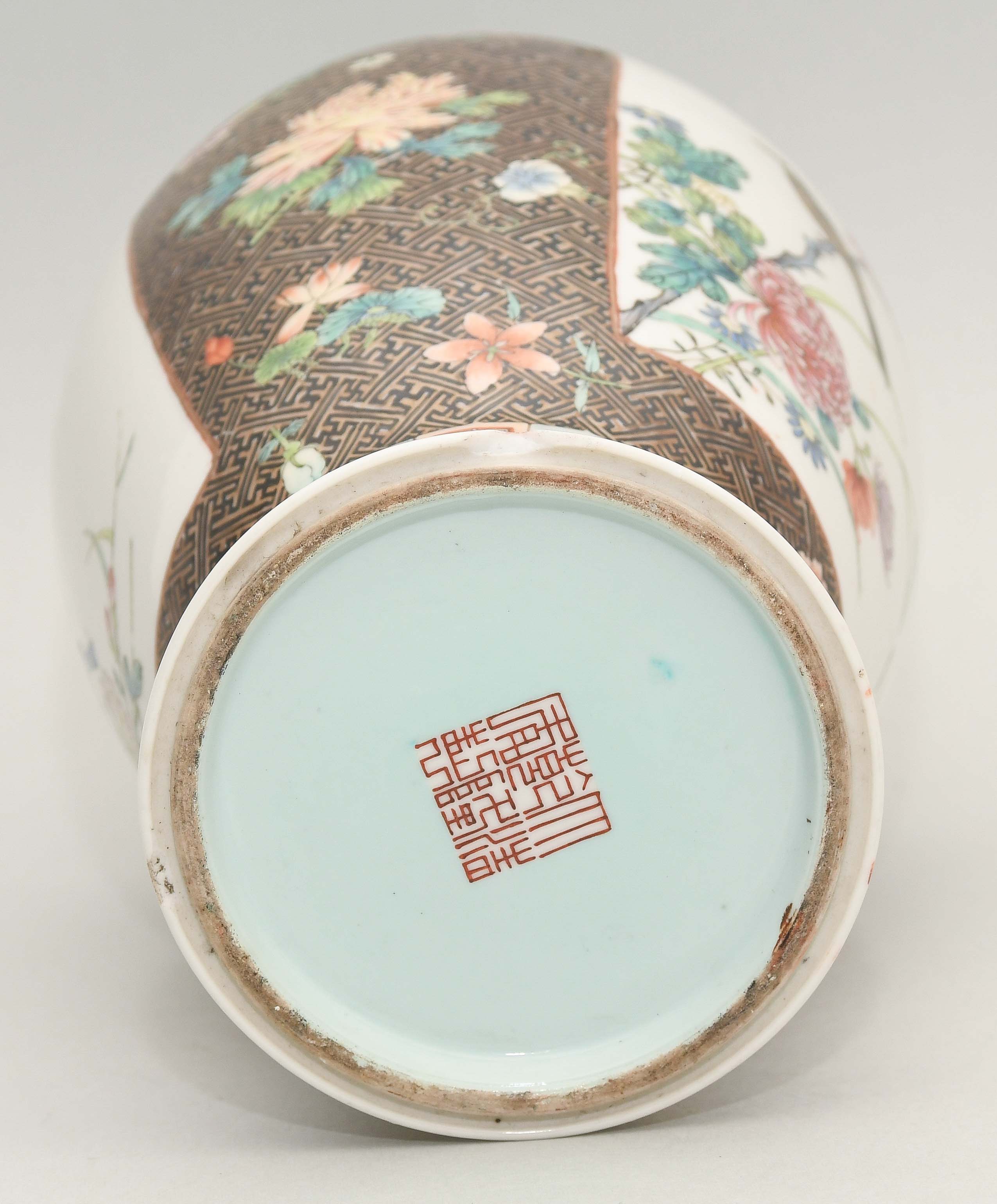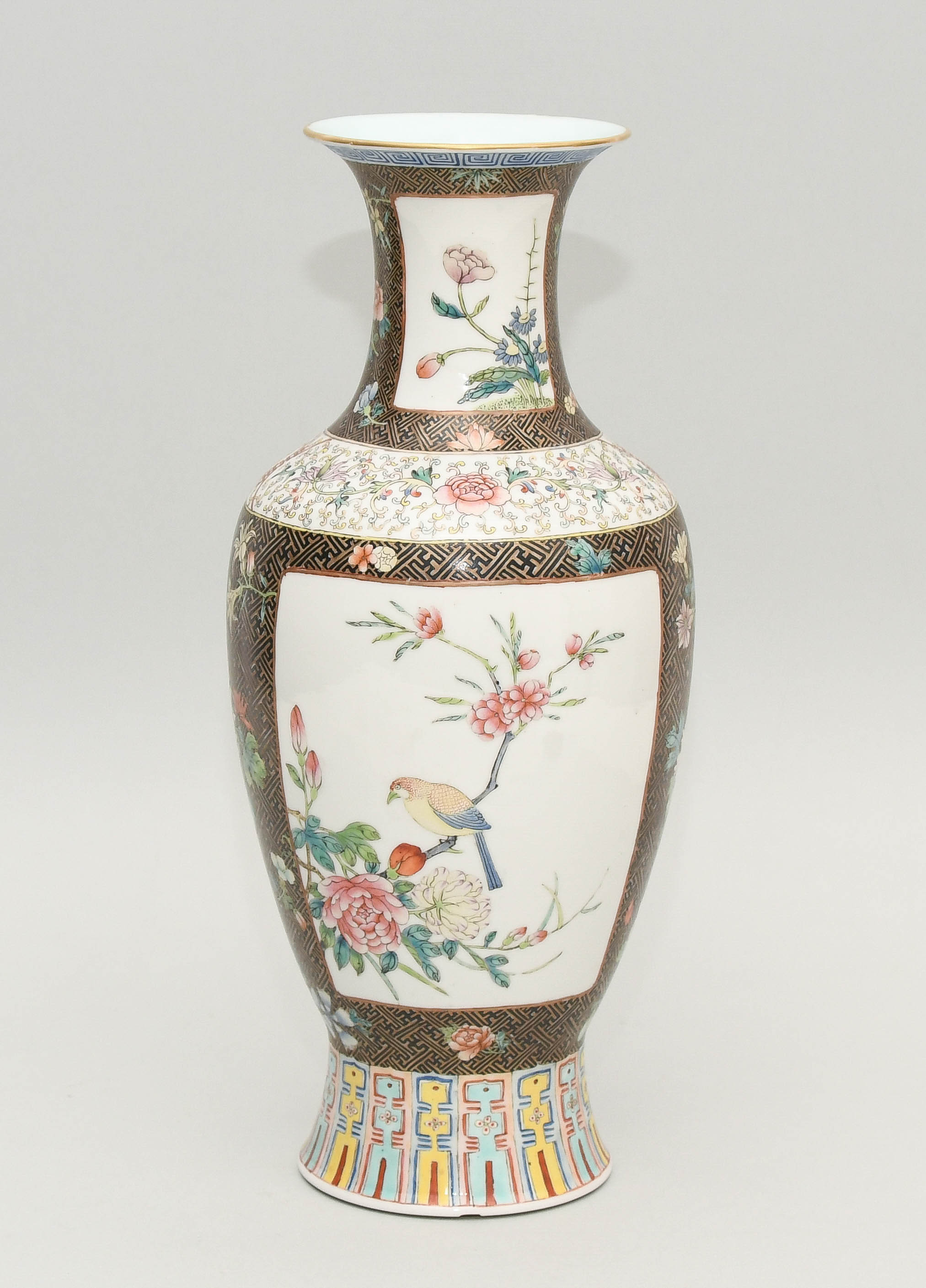 China, 20.Jh. Porzellan. Blumen-/Vogeldekor in den beiden Paneelen in Famille Rose auf schwarz-goldenem Grund. Apokryphe eisenrote Qianlong-Marke. H 33,5 cm. - Bestossen.