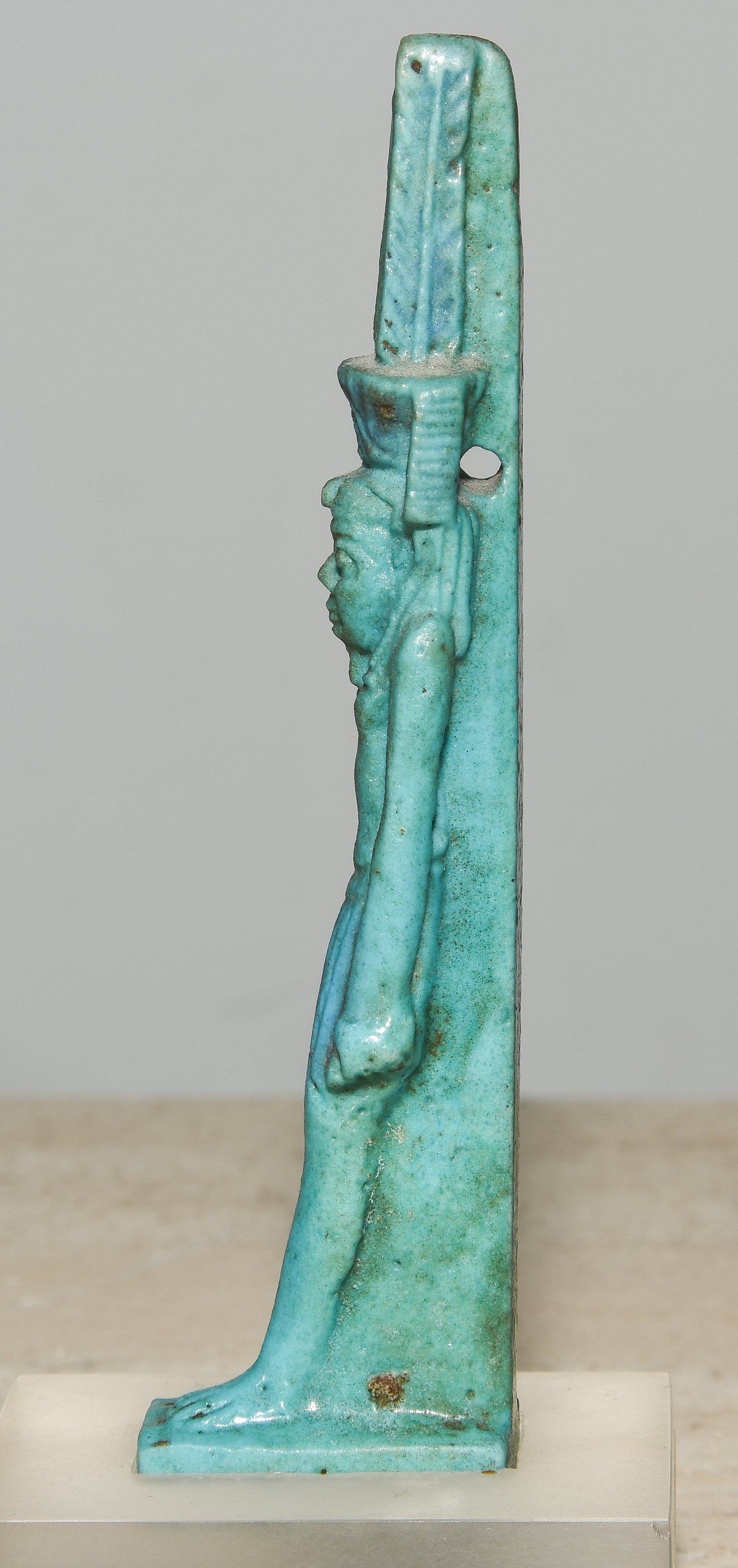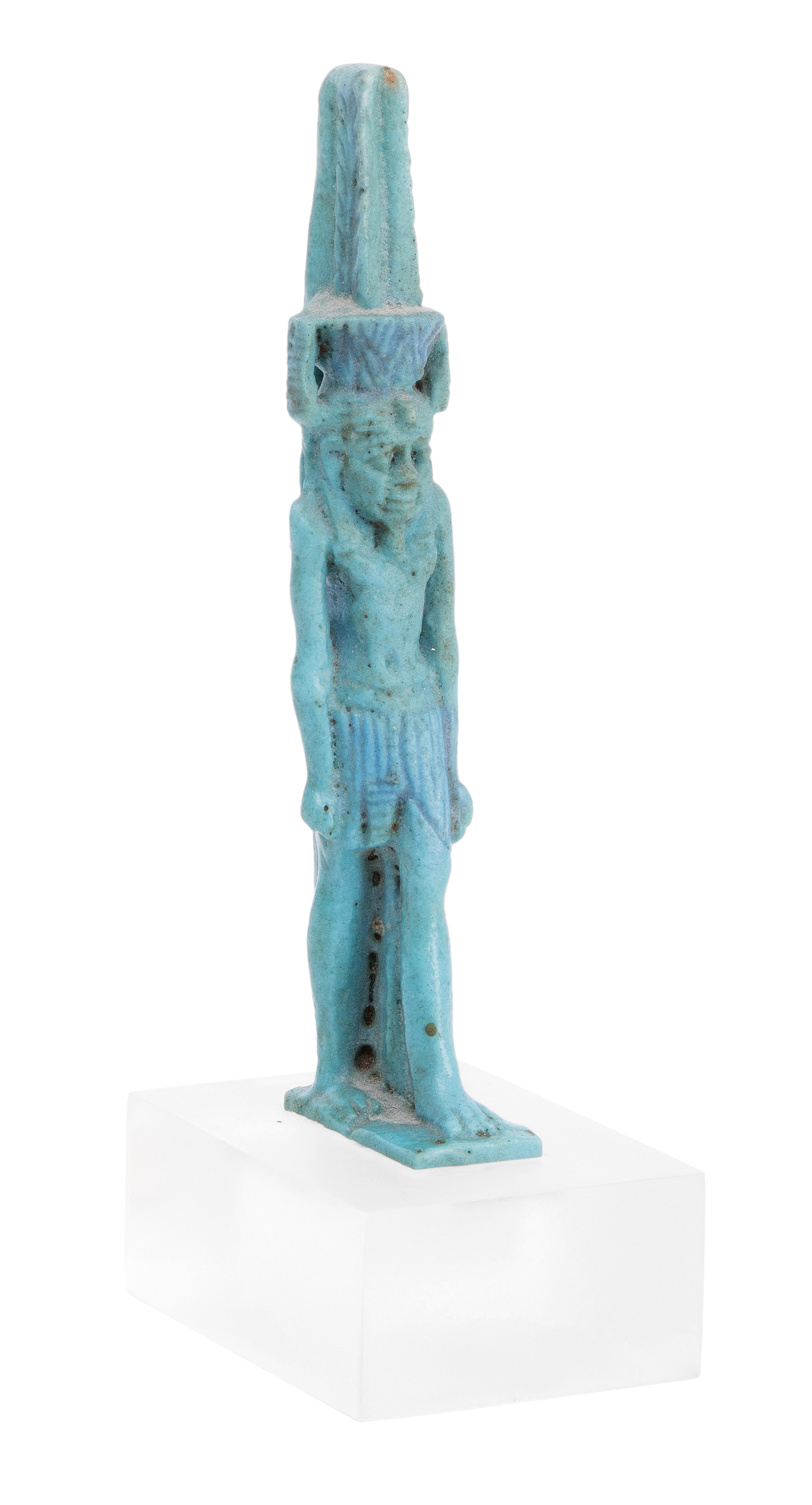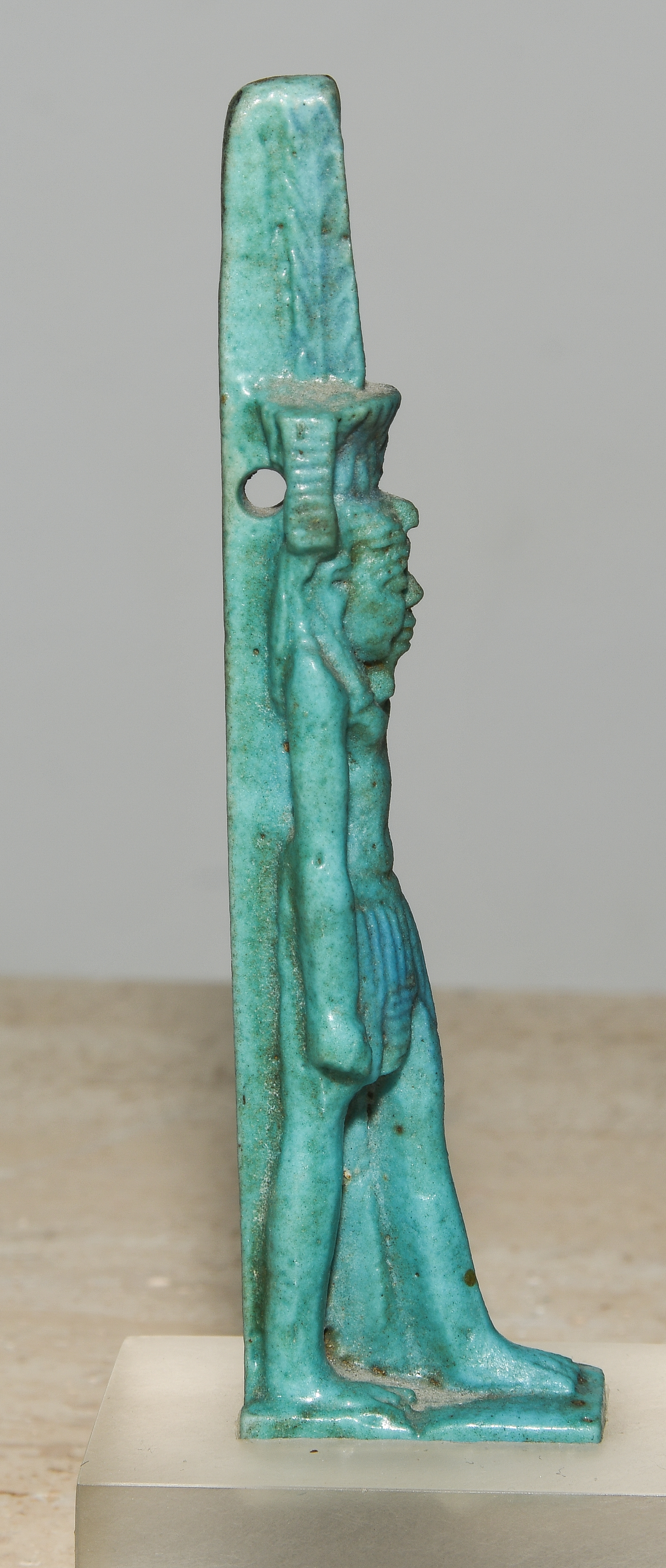 Ägypten, Dritte Zwischenzeit, ca. 1070–712 v.C. Türkis glasierte Fayence. Schreitender Nefertem, die Lotusblüte mit Federpaar auf seinem Kopf tragend. Am Rückenpfeiler zur Aufhängung durchbohrt. H 9,5 cm. Auf Plexiglasstand montiert.