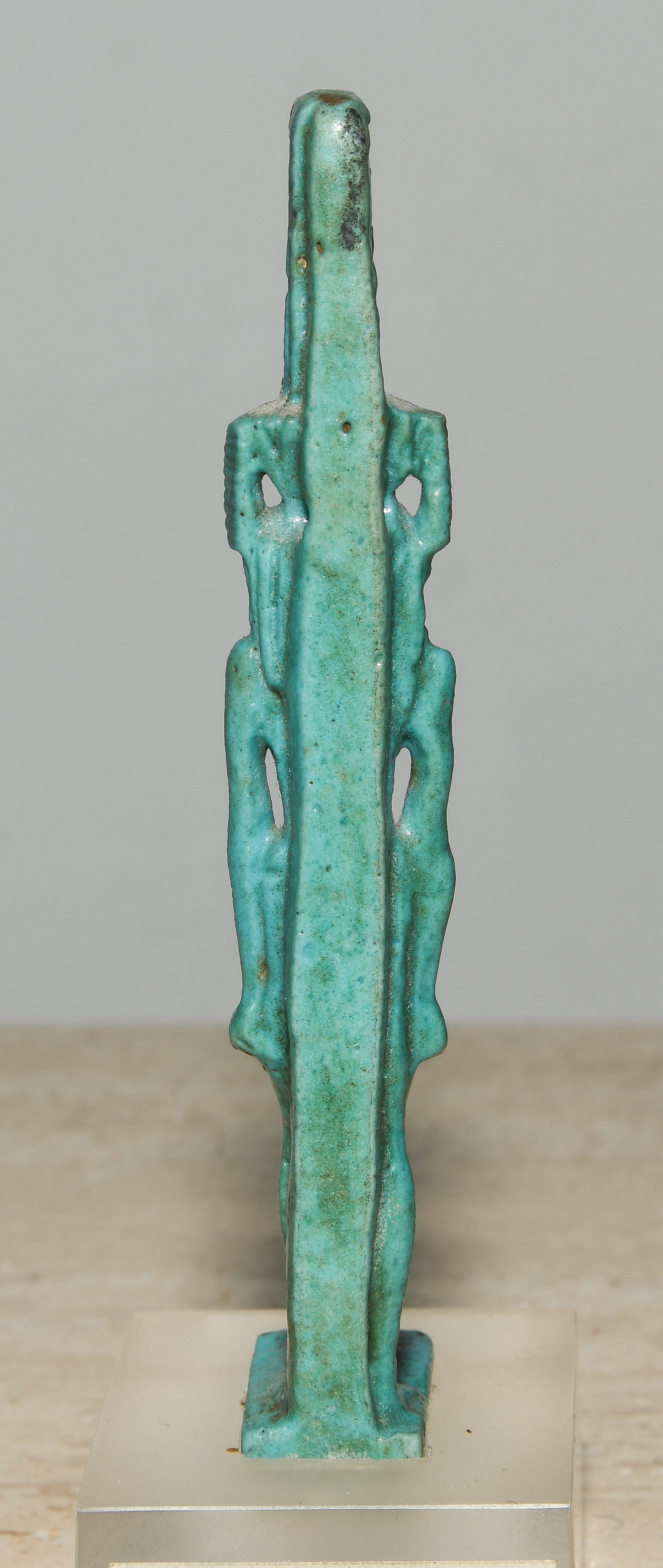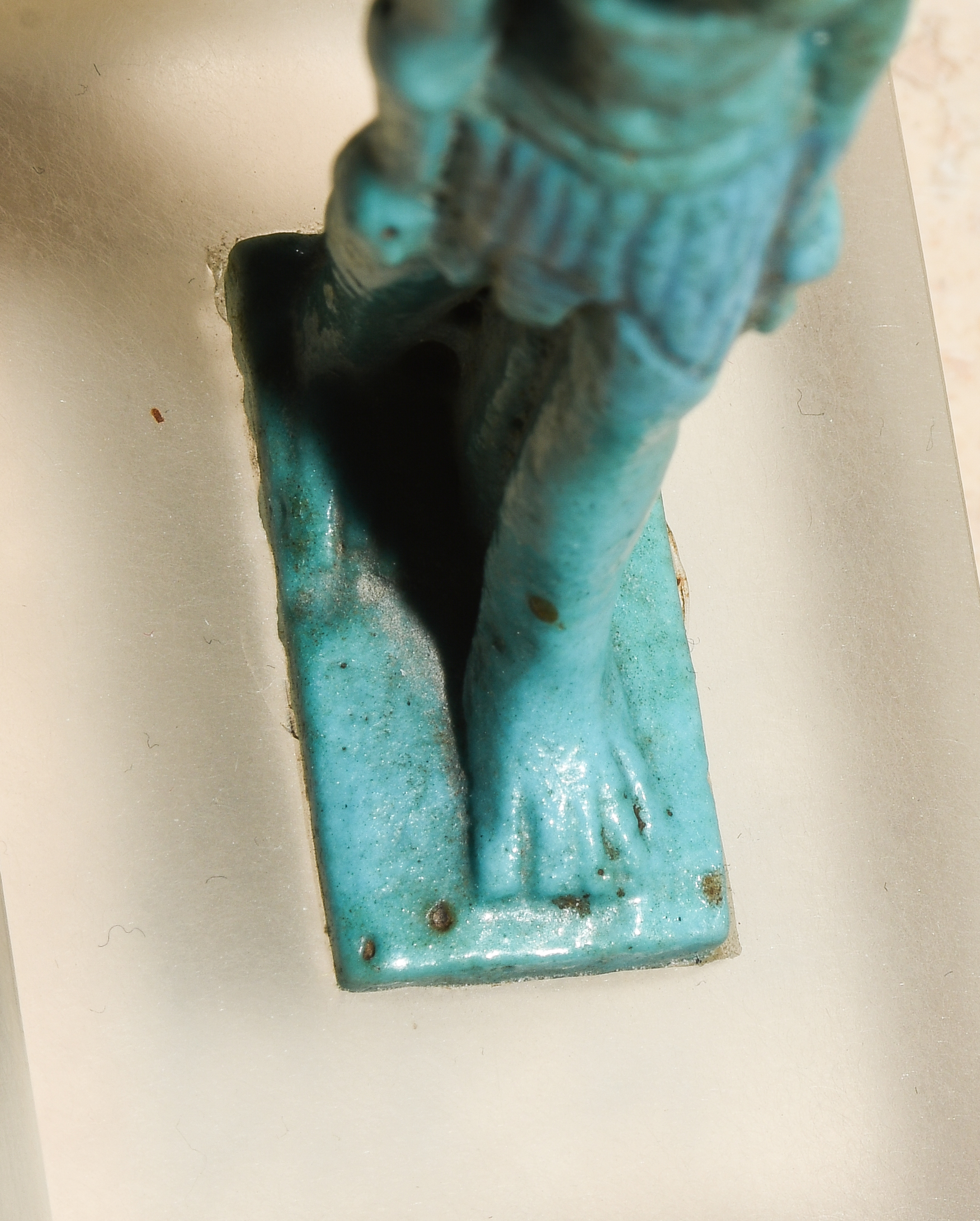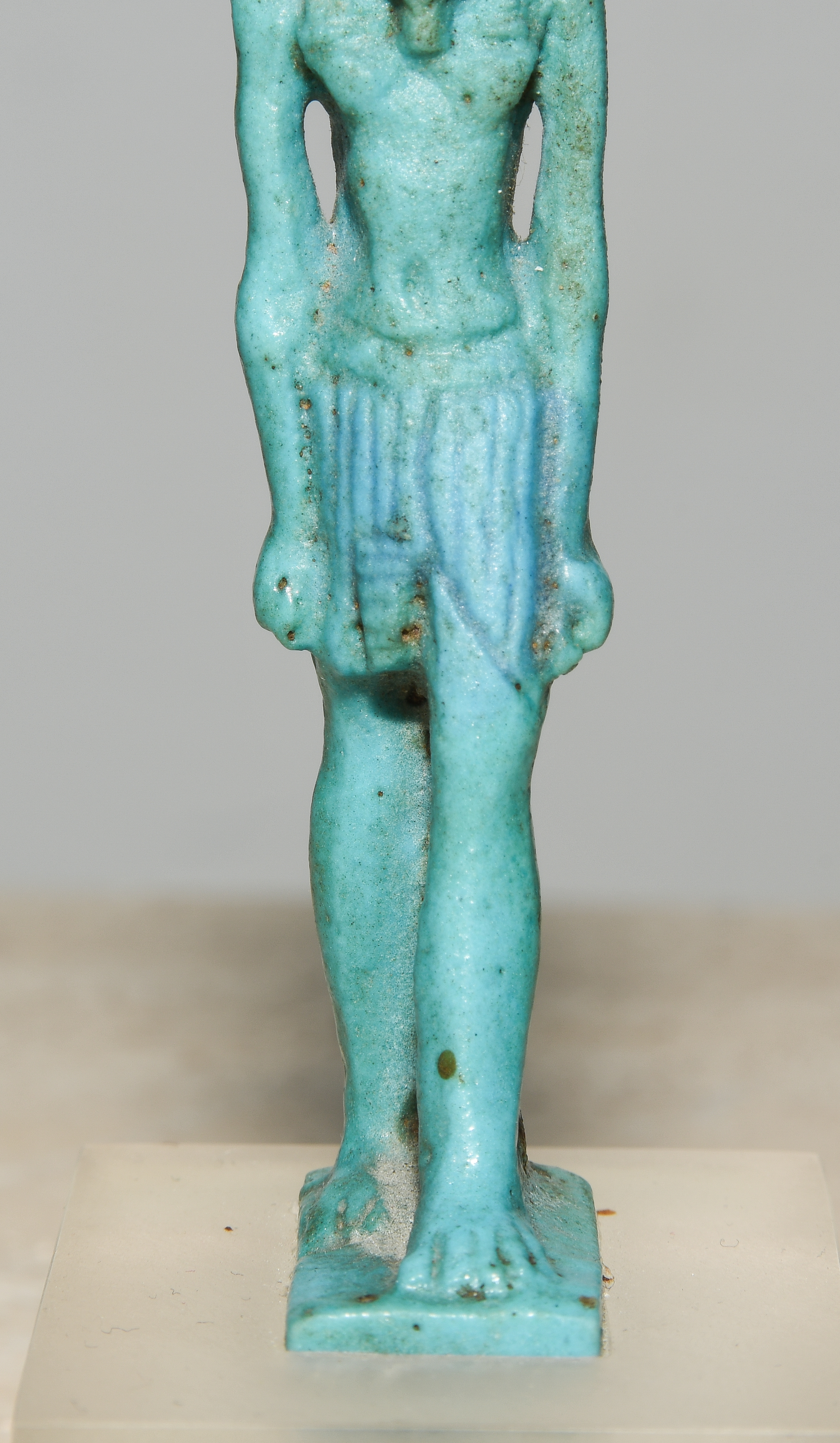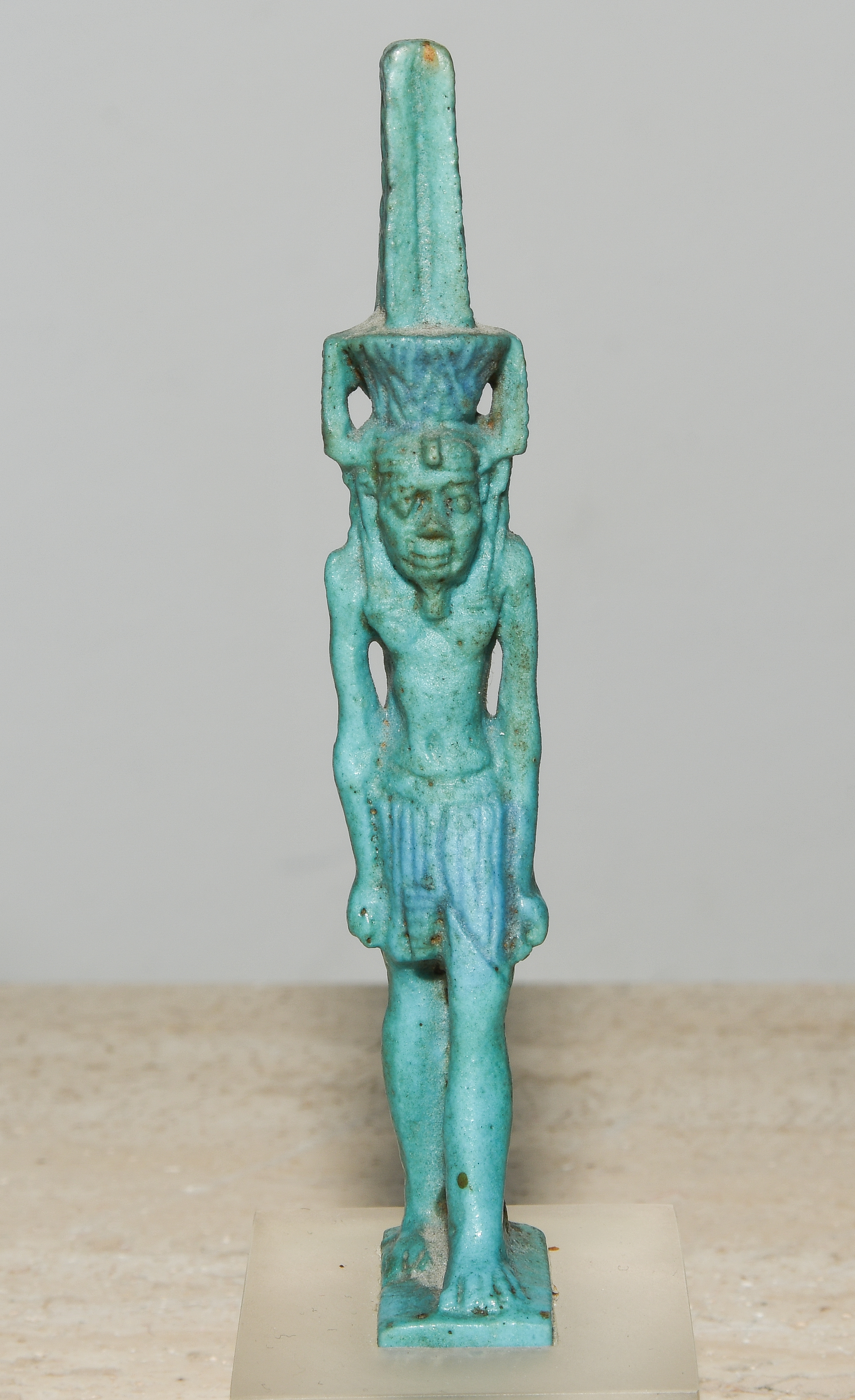 Ägypten, Dritte Zwischenzeit, ca. 1070–712 v.C. Türkis glasierte Fayence. Schreitender Nefertem, die Lotusblüte mit Federpaar auf seinem Kopf tragend. Am Rückenpfeiler zur Aufhängung durchbohrt. H 9,5 cm. Auf Plexiglasstand montiert.