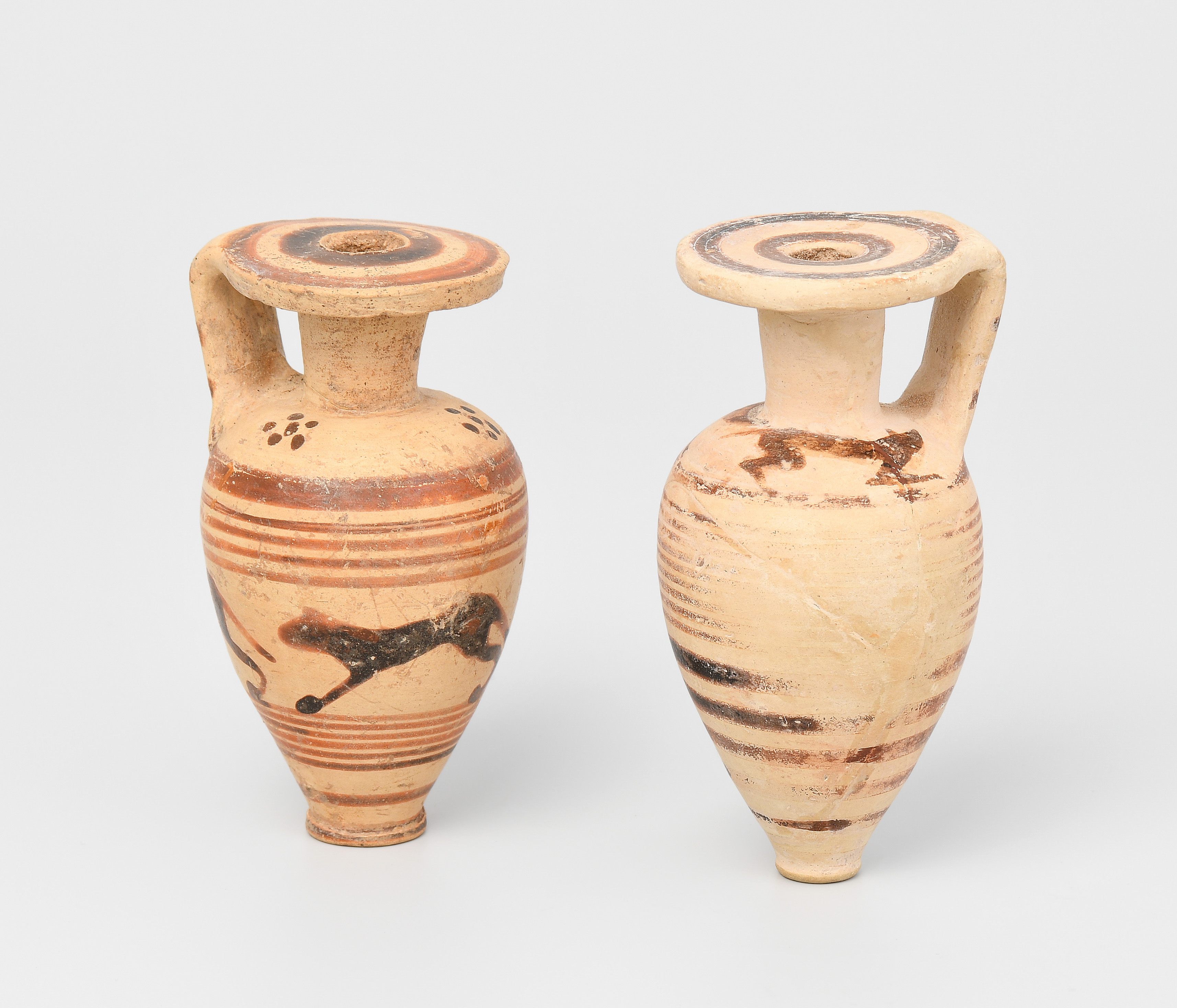 Protokorinthisch, um 675–650 v.C. Silhouettentechnik. Auf dem Corpus Liniendekor und zwei laufende Hunde. Der andere Aryballos mit Liniendekor und drei laufenden Hunden sowie Punktrosetten. Beide Mündungsteller und Henkel mit breiten Linien. H 7 und 7,2 cm. - Ein Aryballos aus Fragmenten zusammengesetzt.