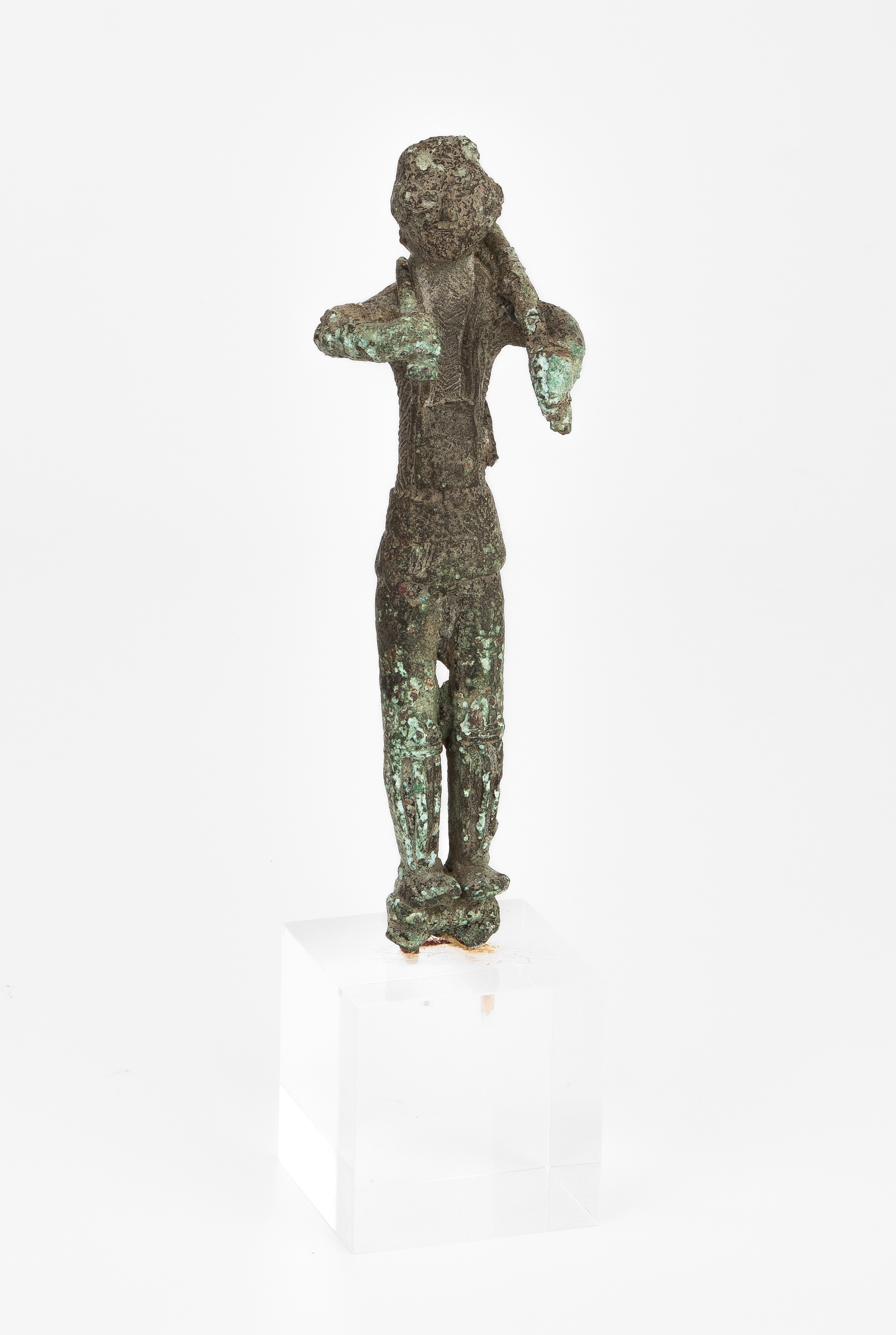 Sardinien, 8.–7.Jh. v.C. Bronze. Stehende männliche Figur, über seiner linken Schulter den Bogen und über seine rechte Schulter einen Stock haltend, der Rücken mit Köcher. H 12,5 cm. Auf Plexi-Quader montiert.