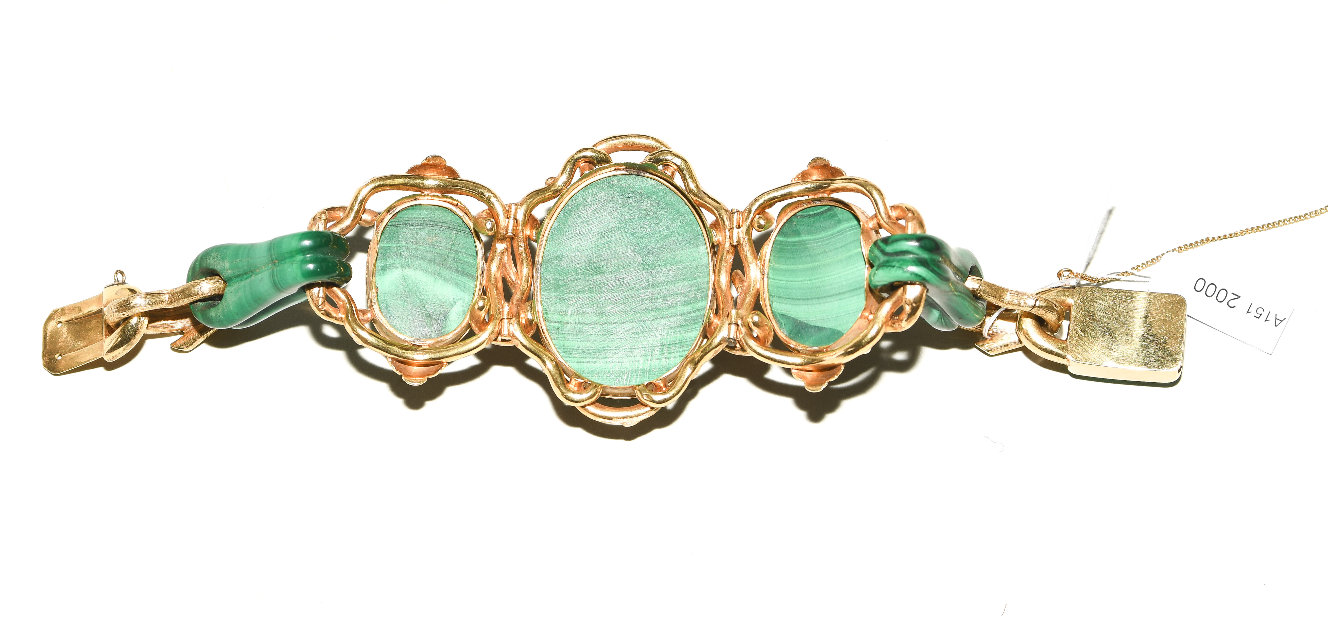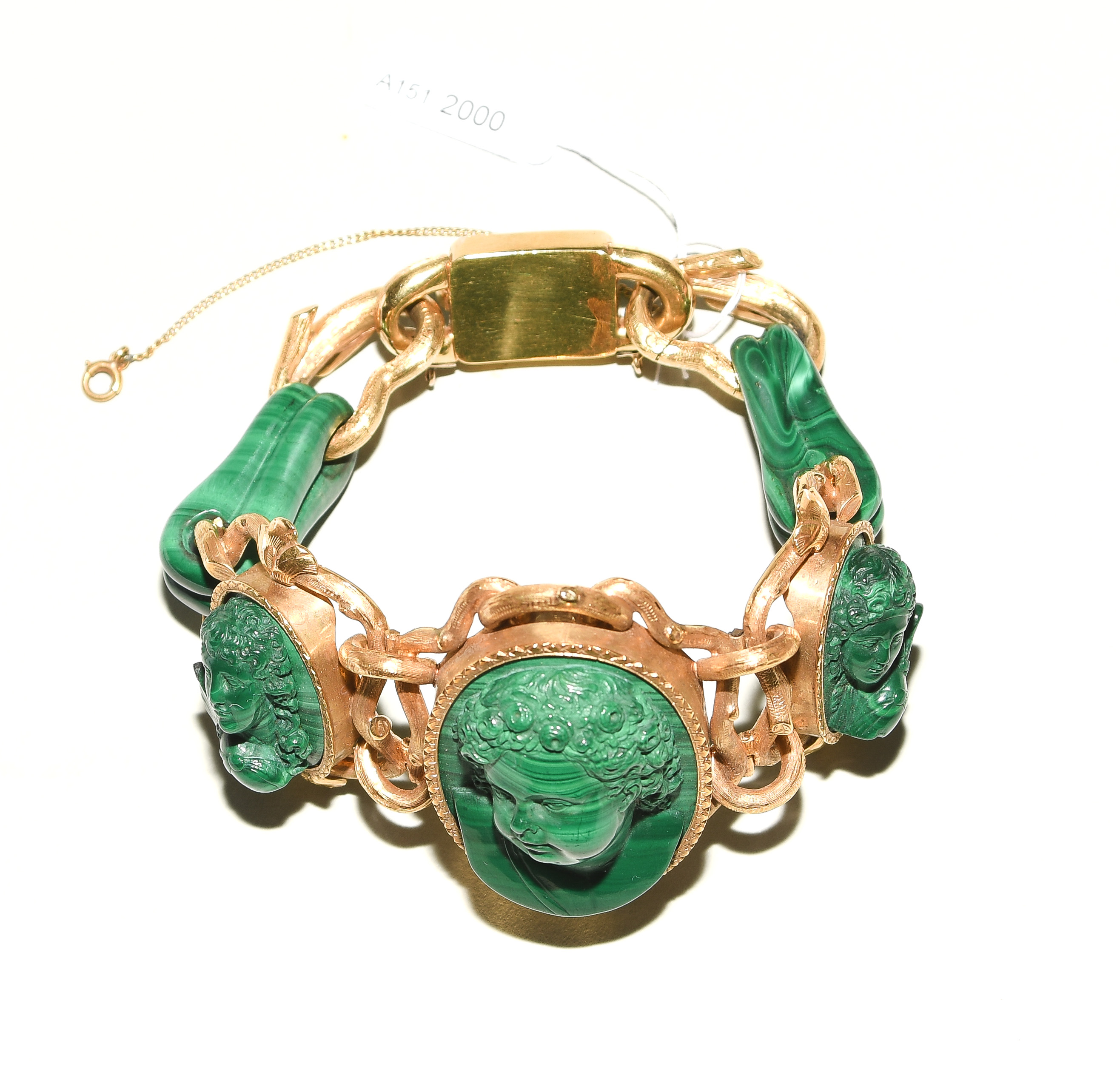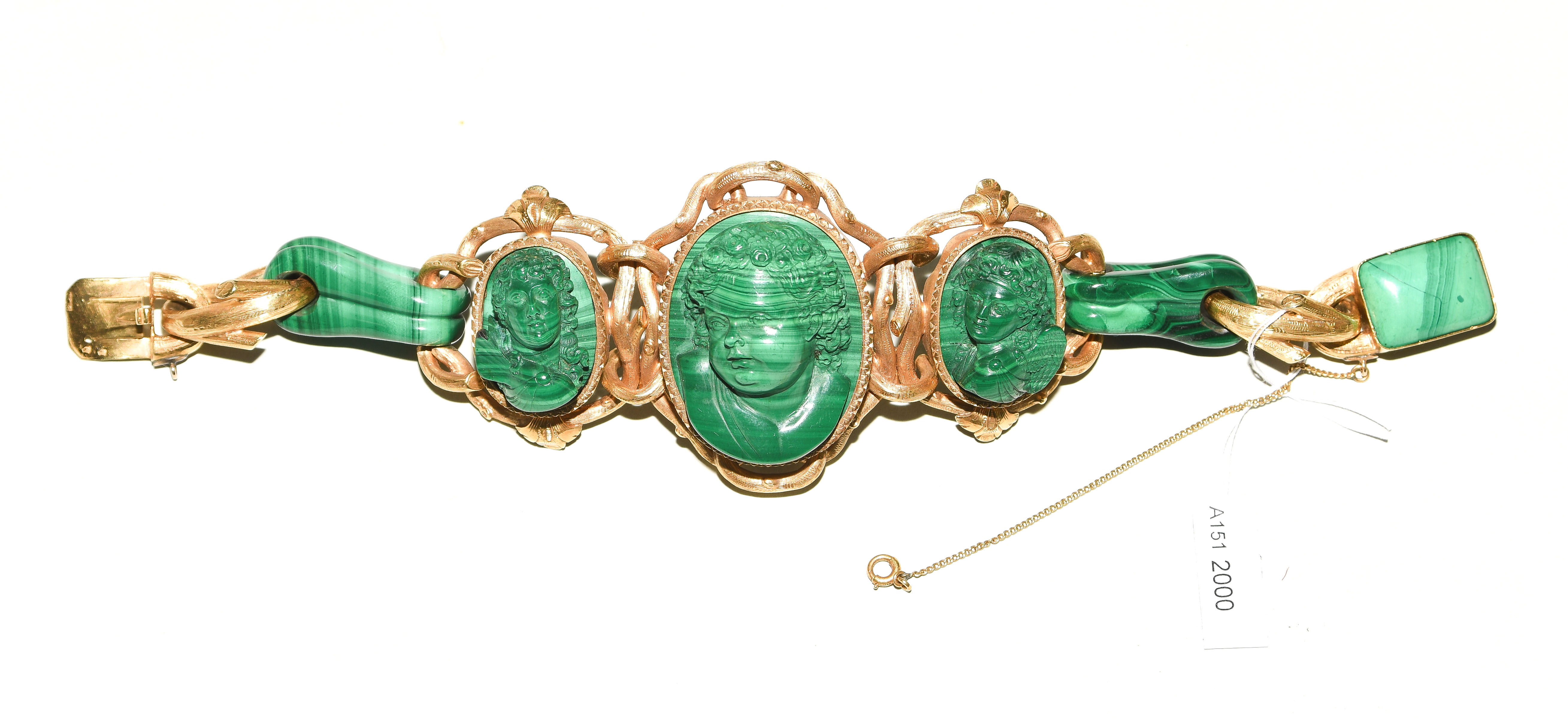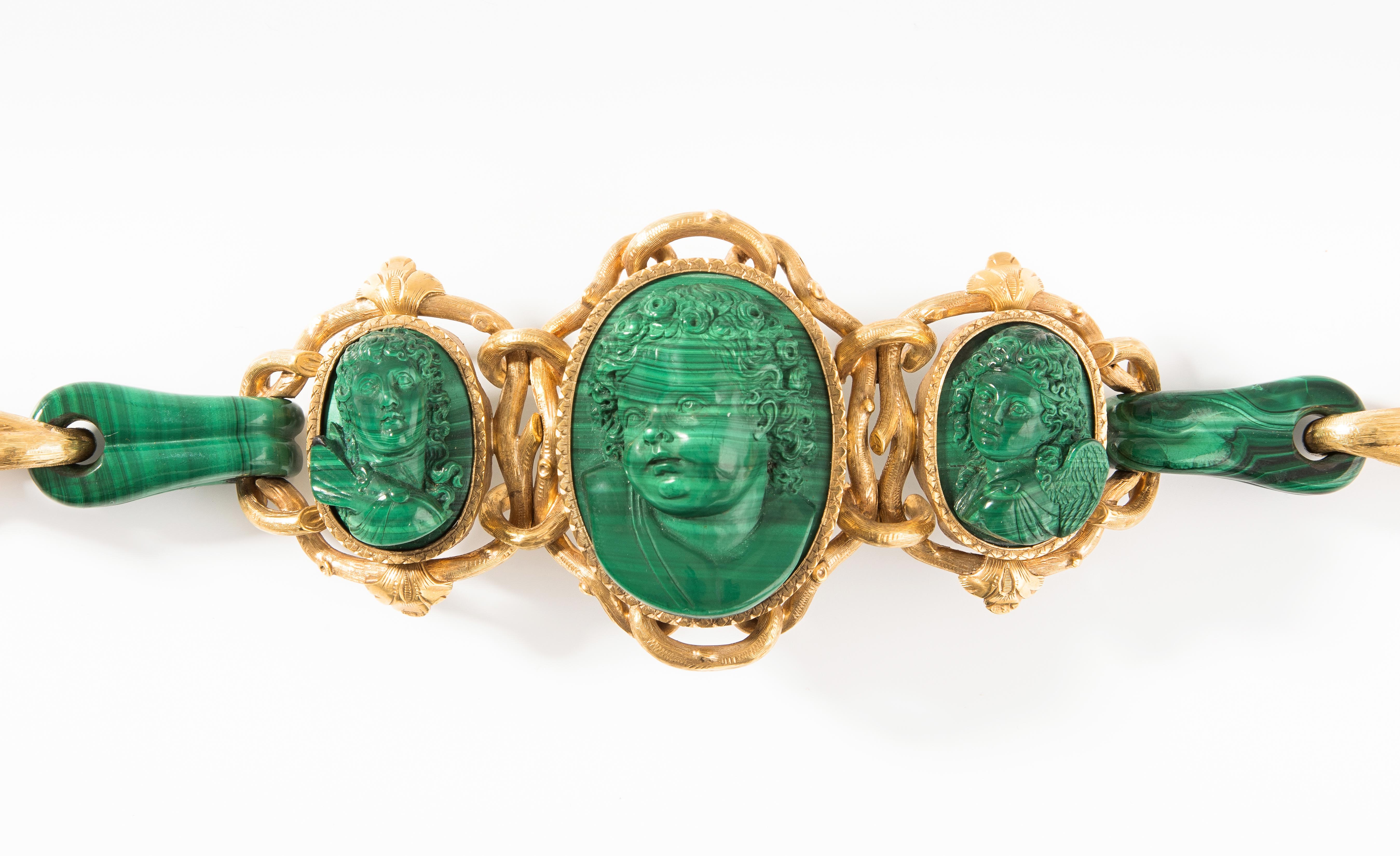 Frankreich, 19.Jh. 750 Gelbgold. Drei plastisch aus Malachit gravierte Puttis, tlw. modifiziert. Gravierte Goldumrahmung in Form von Ästen mit Blattmotiven. L 18,5 cm, 78 g.