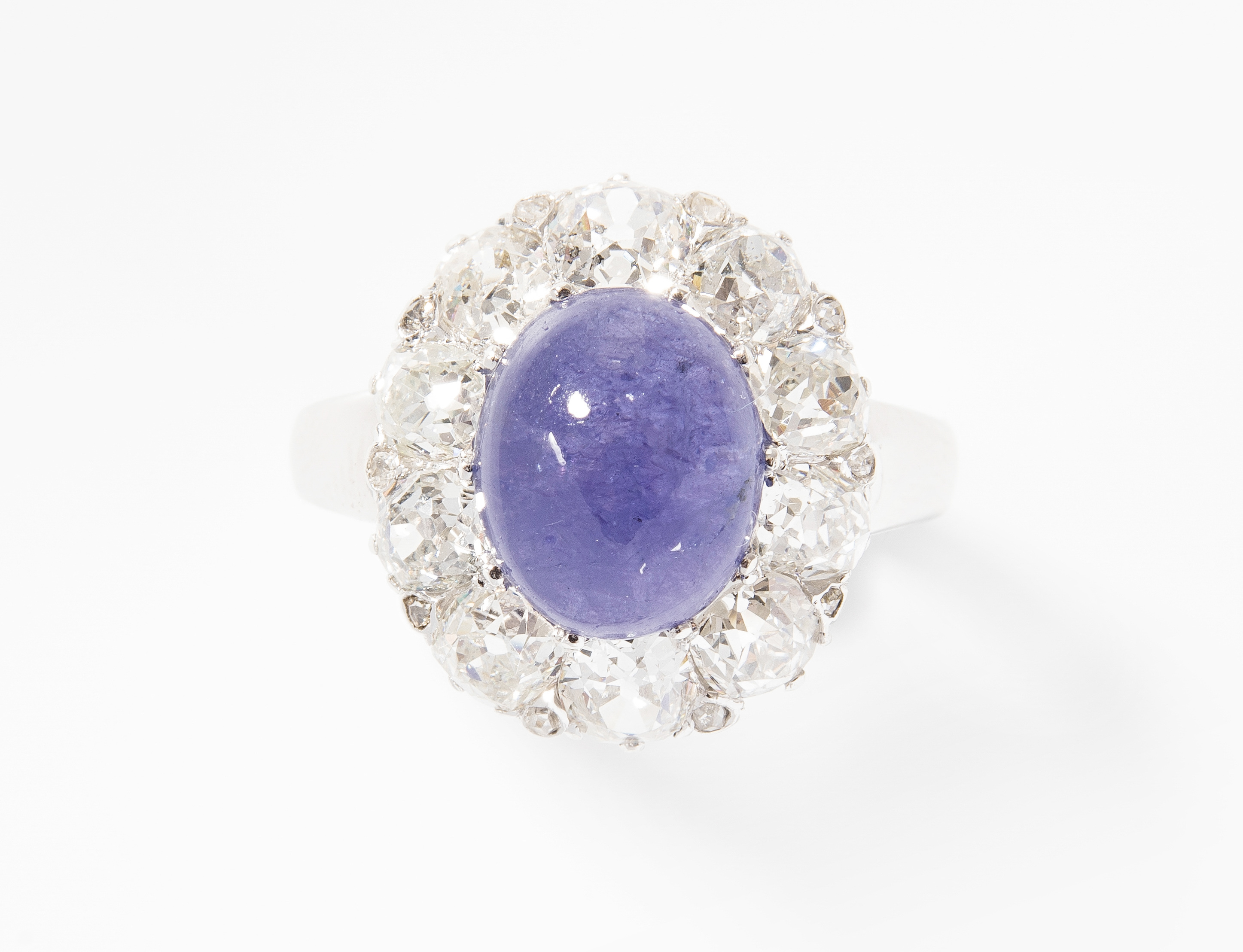 585 Weissgold. Antikstil. Entourage-Modell mit 1 ovalen Tansanit-Cabochon ca. 4.80 ct, umgeben von 10 Altschliff-Diamanten ca. 1.60 ct H/I-si/P1. Gr. 58, 8,1 g.