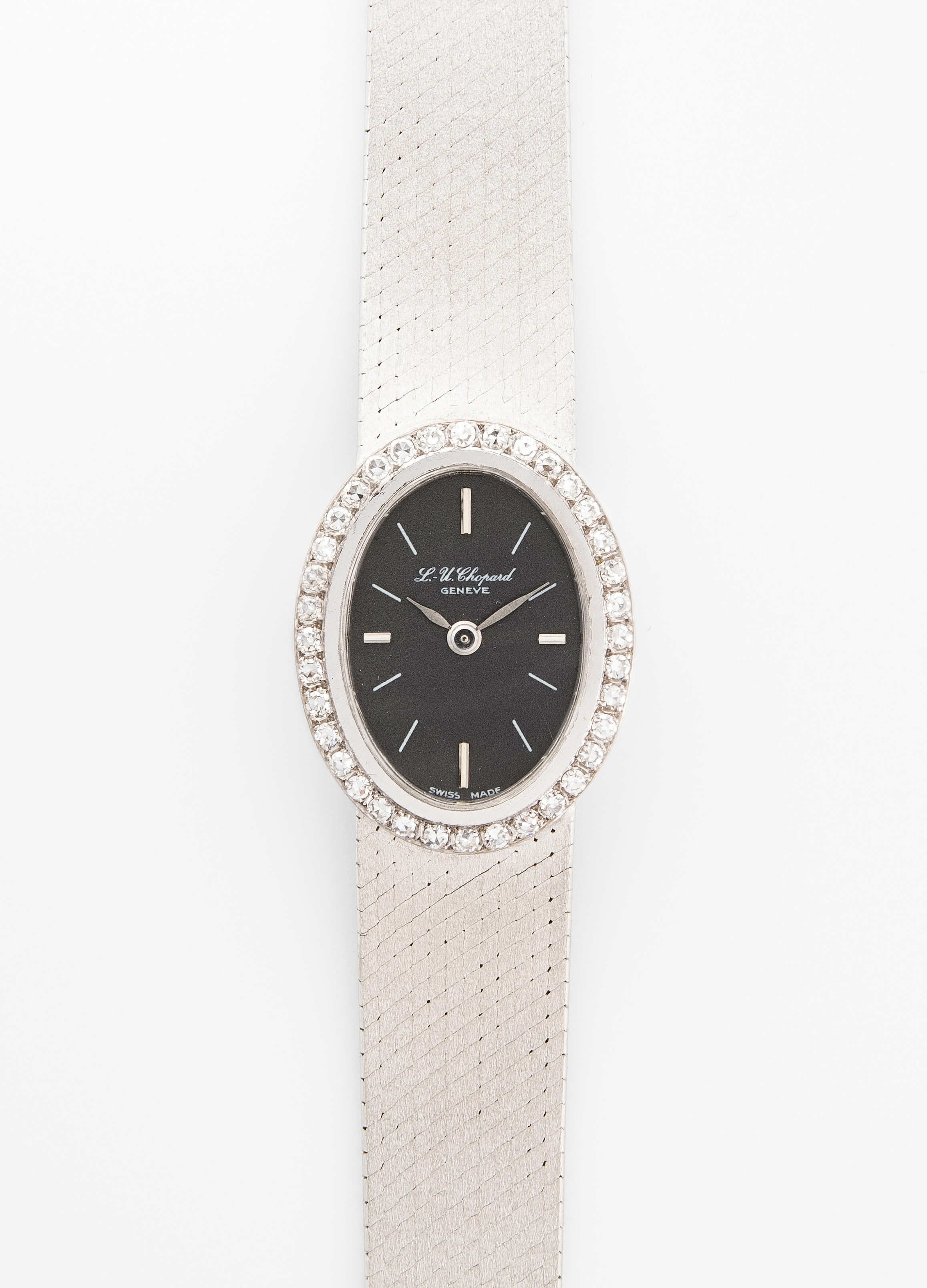 750 Weissgold. Ref. 102781-1001. Gehäuse Nr. 5031. Serien Nr. 26616. Handaufzug. Ovales Gehäuse, anthrazitfarbenes Zifferblatt mit Strichindizes, Saphirglas, Diamant-Lunette ca. 0.30 ct. Flaches, satiniertes Milanaiseband im Verlauf. Strukturiertes Weissgoldband von Bucherer. Leiterverschluss. L 15,5/16 cm. 39,9 g. Funktionstüchtig.