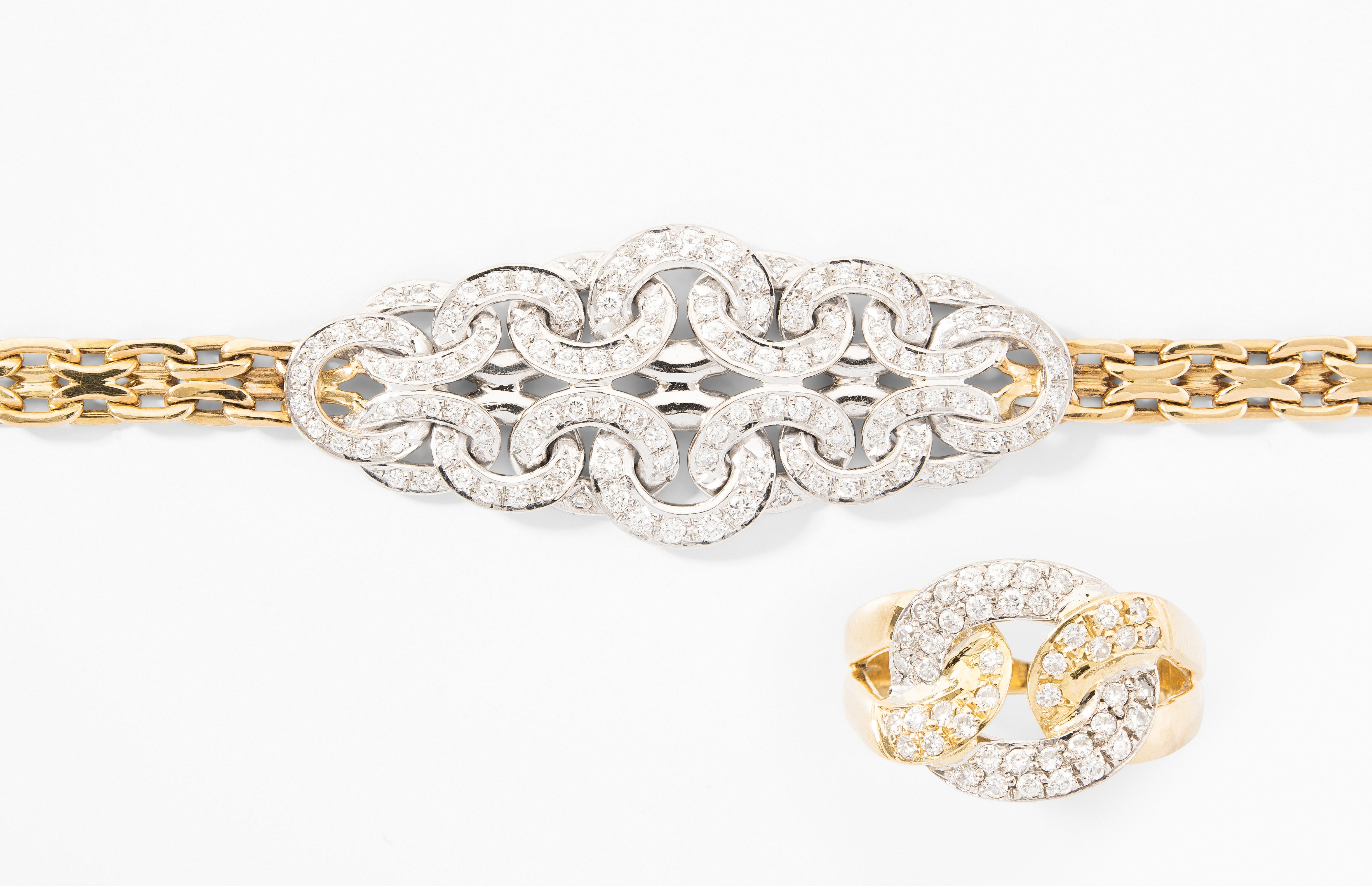 1980er Jahre. 750 Gelb- und Weissgold. Bracelet (Meister) und Ring. Bracelet mit 122 Brillanten, 1.87 ct. L 17 cm. Ring mit 44 Brillanten, 0.55 ct. Gr. 56. Gesamtgewicht 40,4 g.