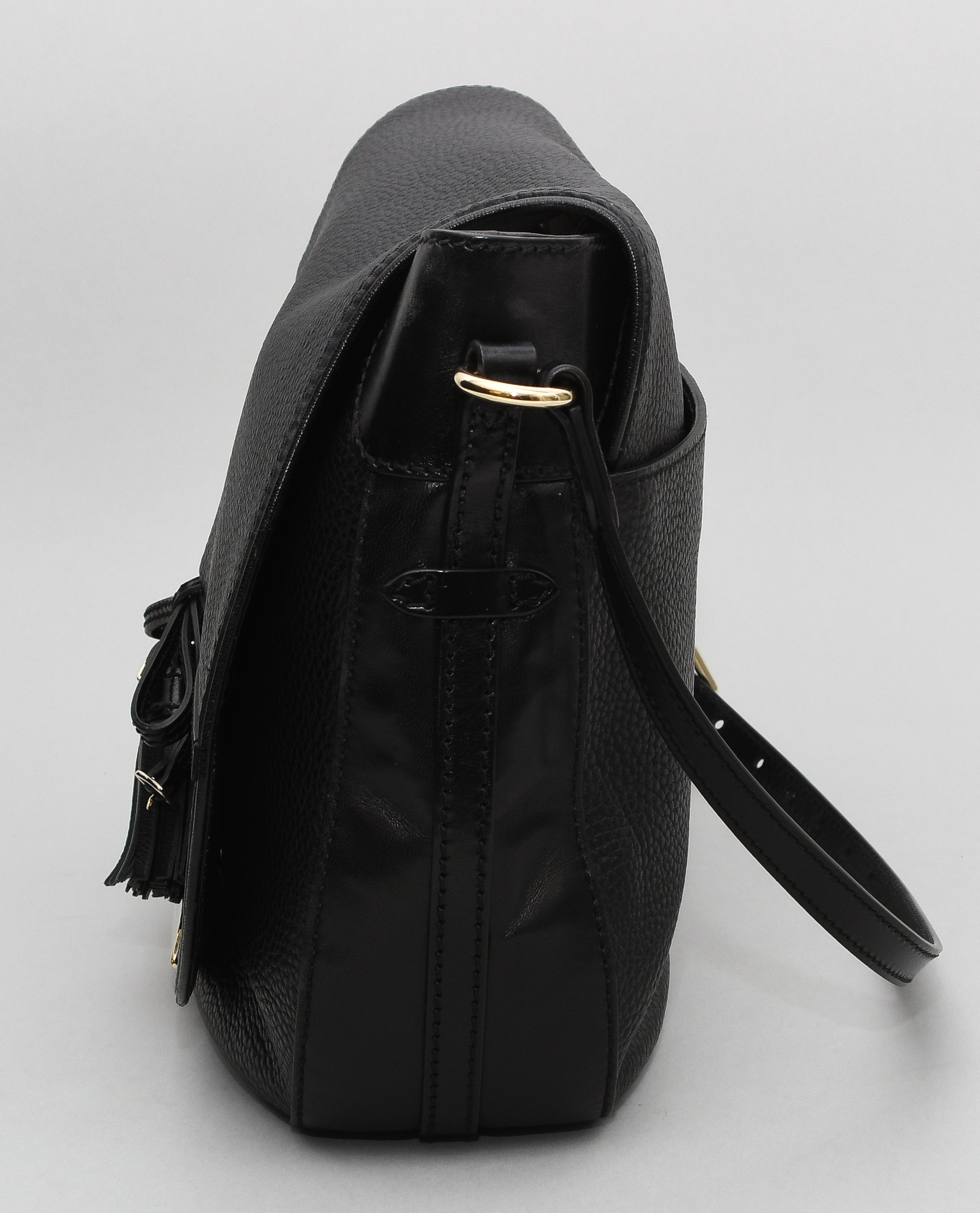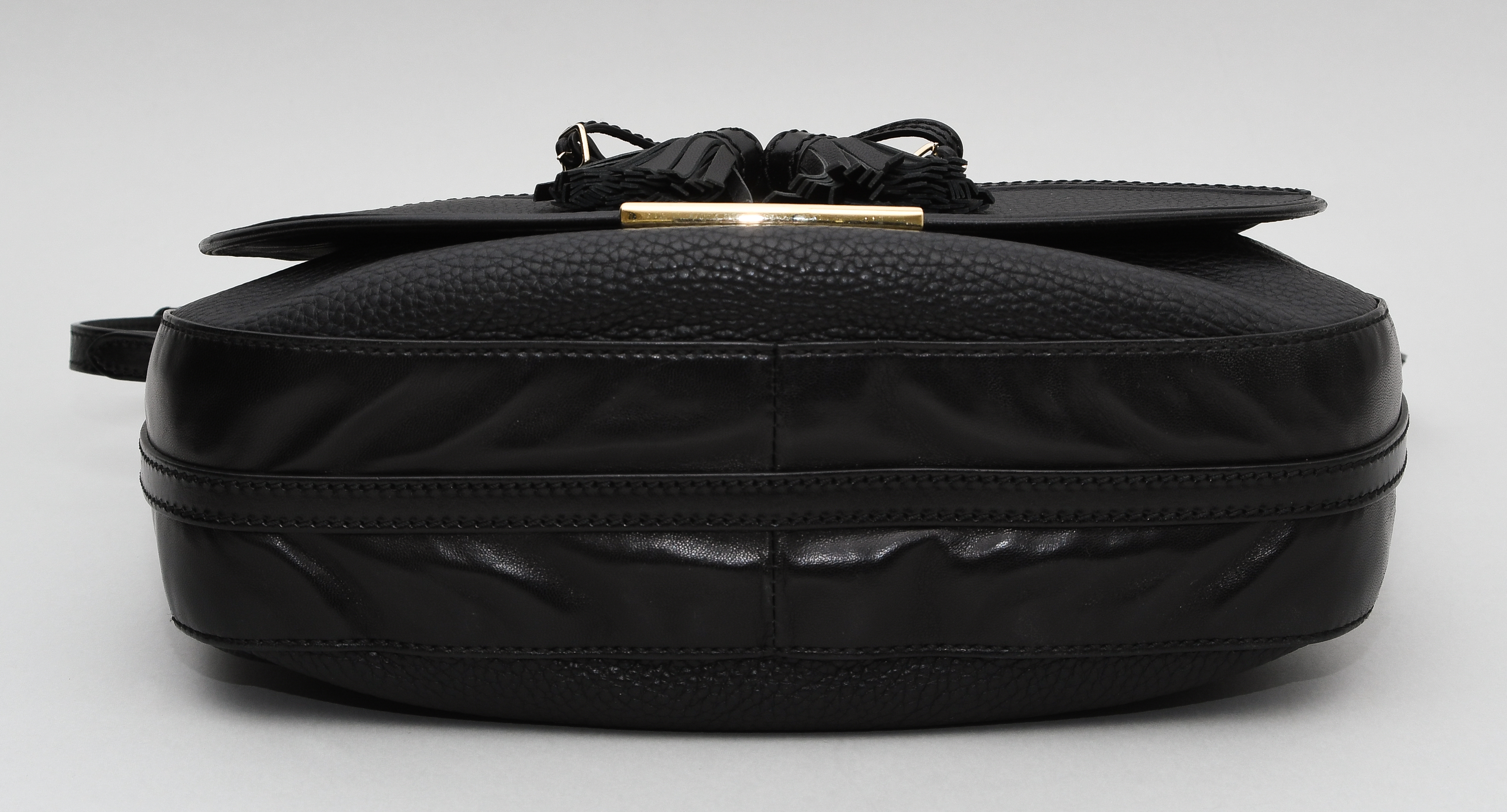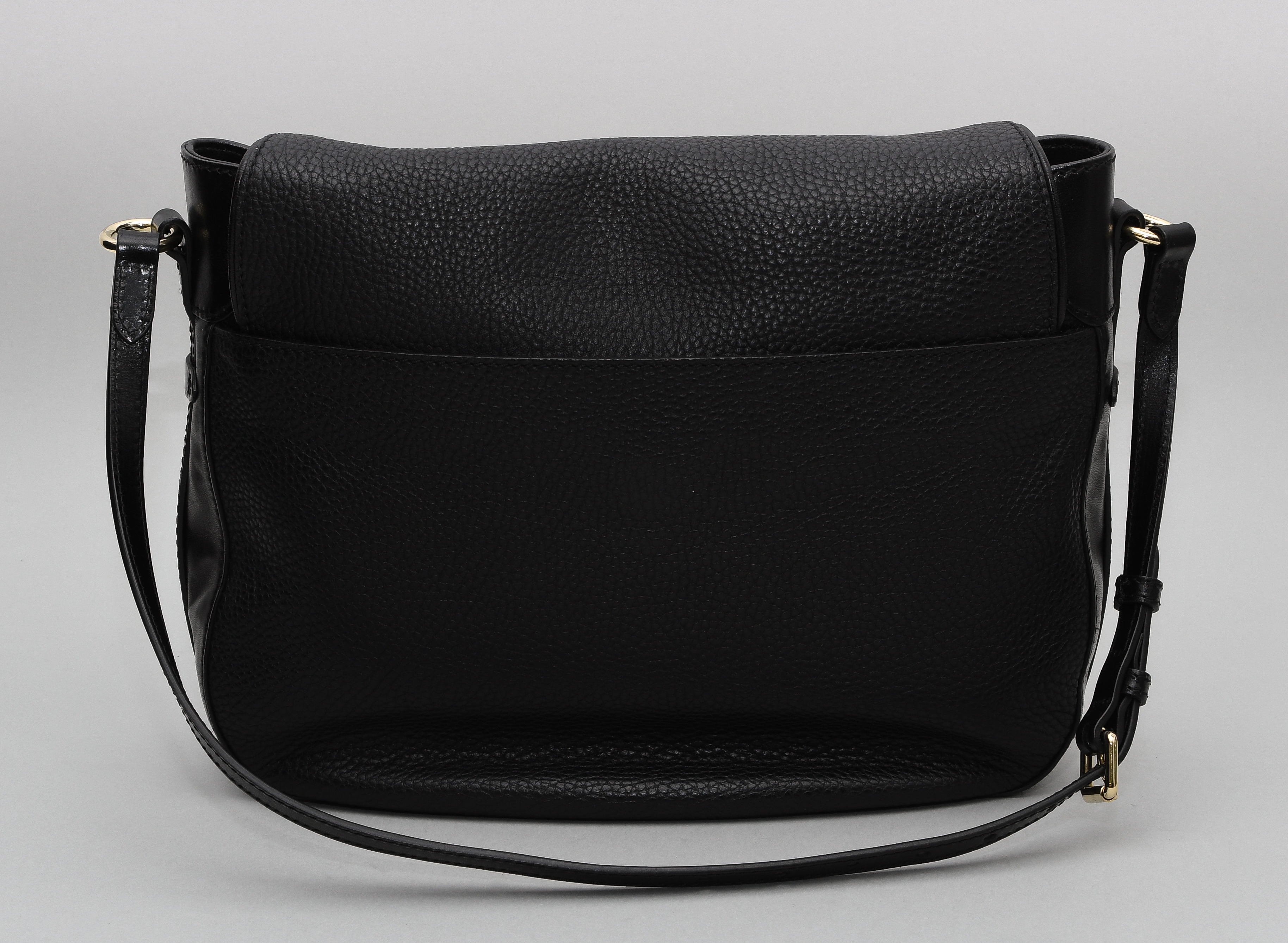 Aus schwarzem Leder. Verstellbarer Schulterriemen. Goldfarbene Metallapplikationen. Magnetverschluss. 31x24x8,5 cm. In Original-Schutzbeutel. Innen kleine Kugelschreiberflecken, sonst sehr guter Zustand.