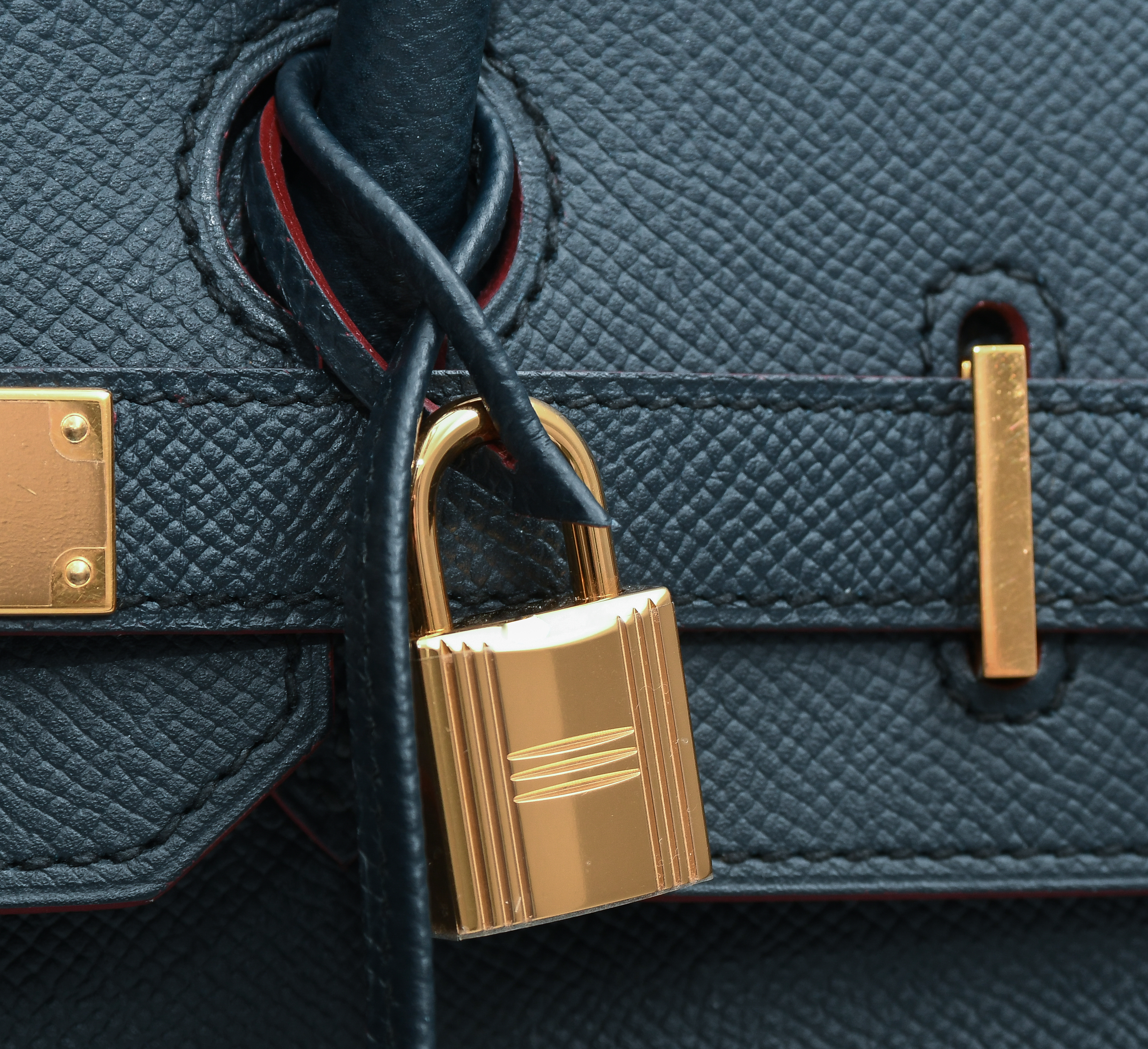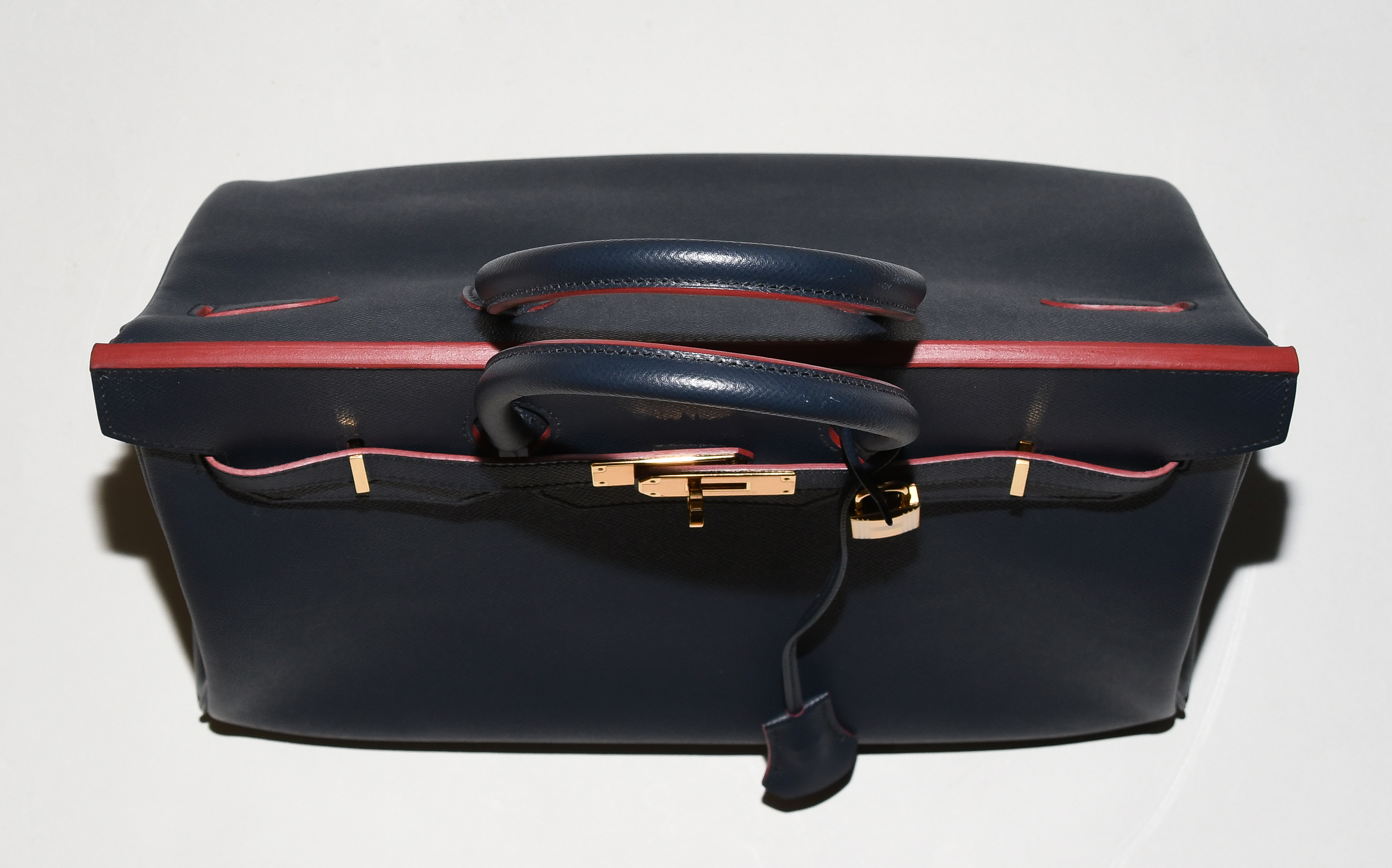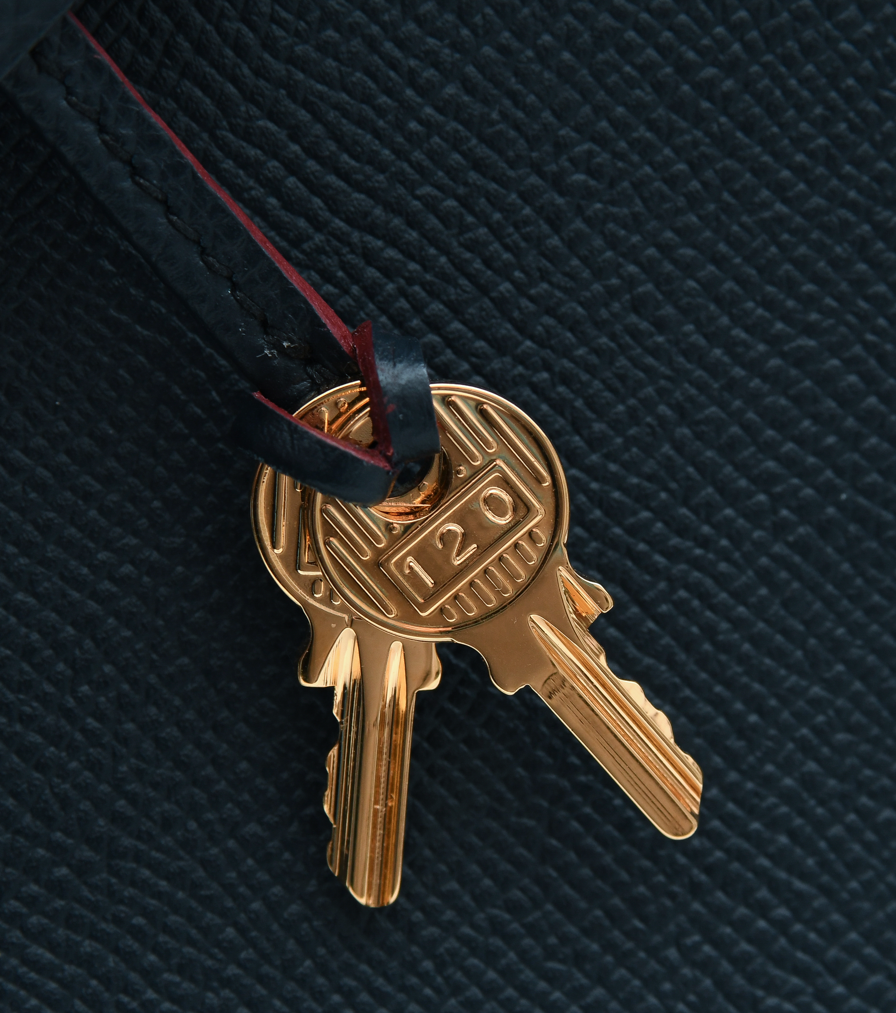 Aus dem Jahr 2016. Indigoblaues Epsom-Leder mit roten Verbindungsstellen. Zwei Henkel. Verschluss aus vergoldetem Metall. Schloss, Clochette und zwei Schlüssel. 35x26x18,5 cm. In Original-Schutzbeutel. Sehr guter Zustand.