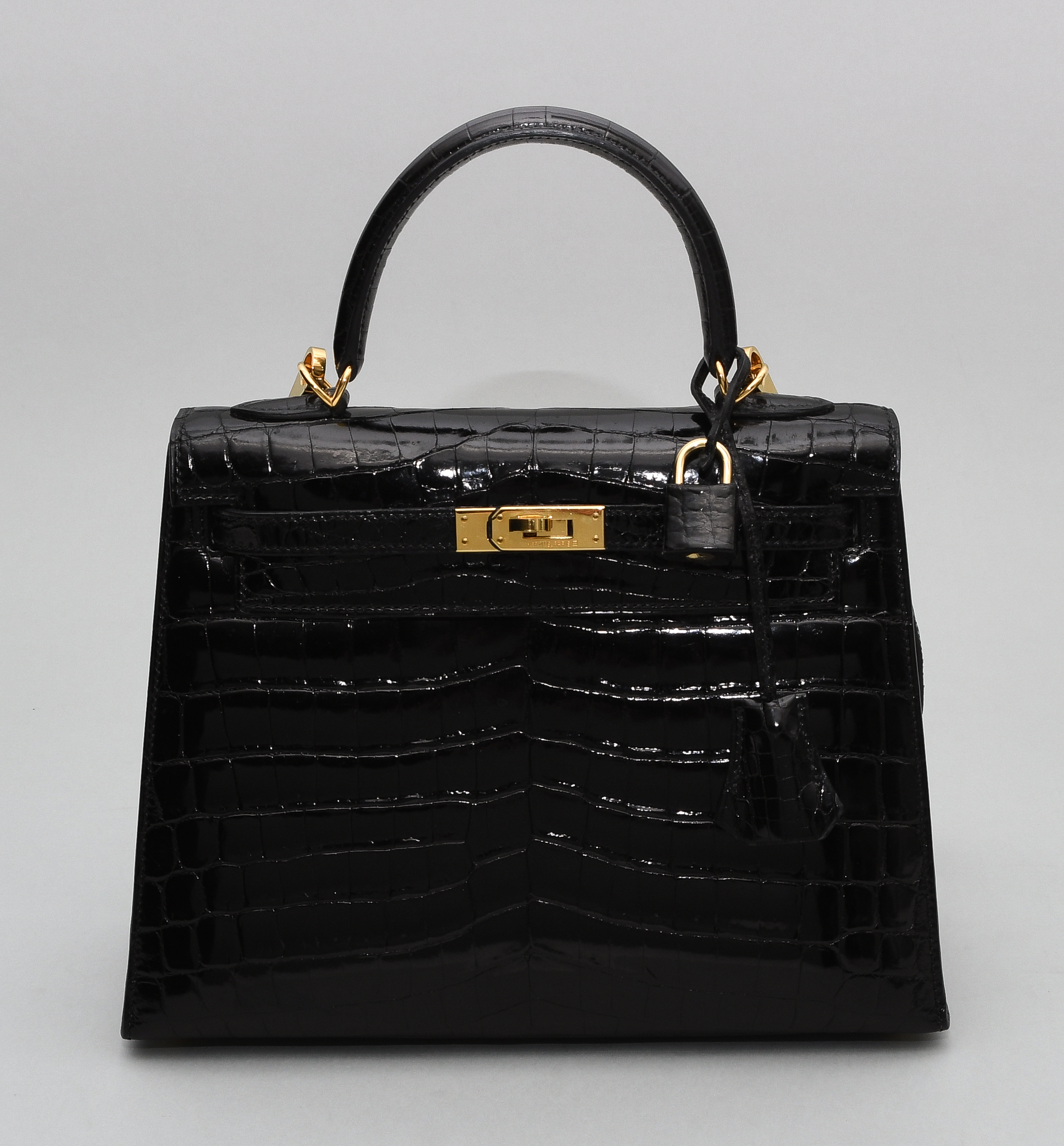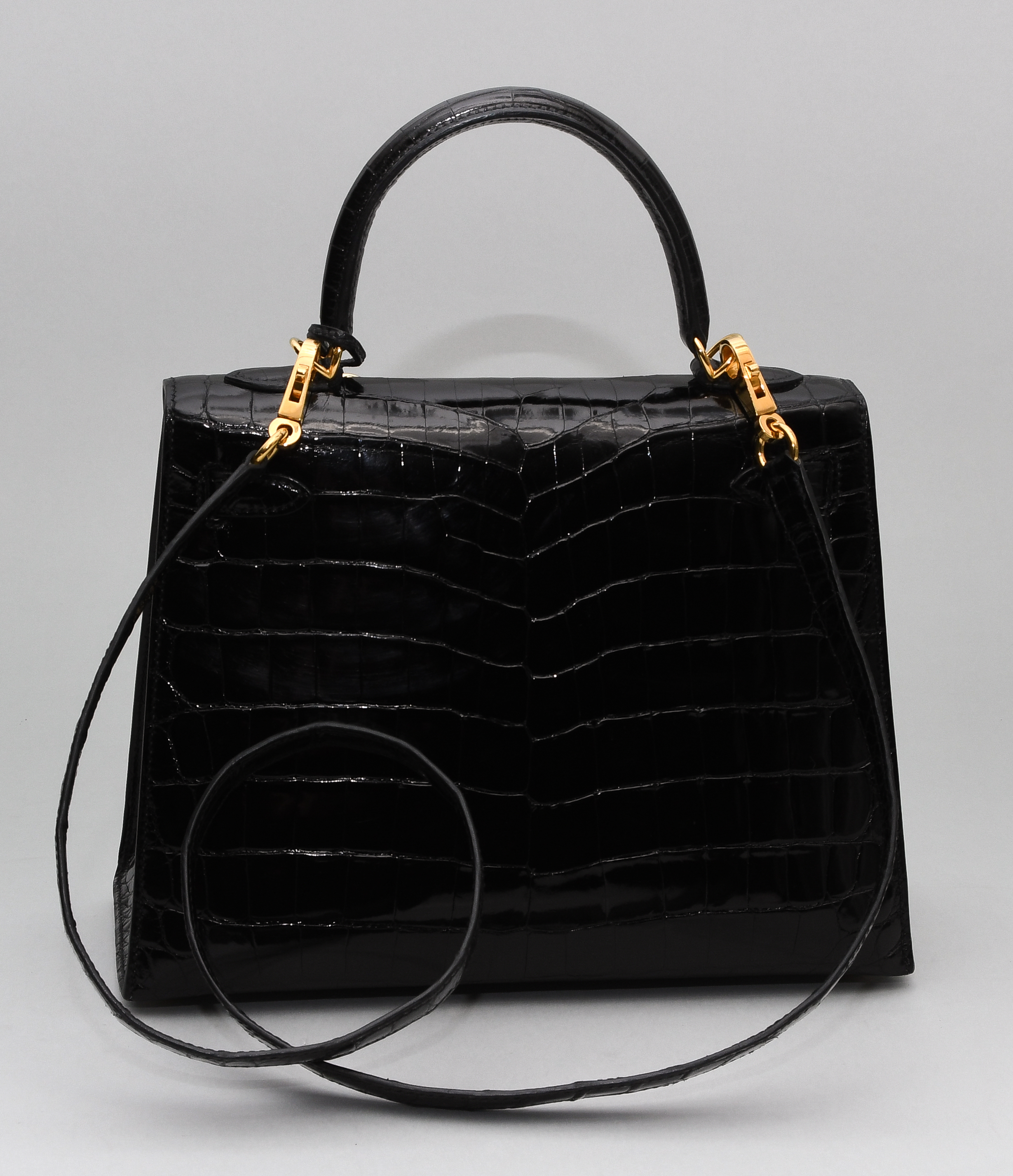 Aus dem Jahr 2002. Schwarzes Krokodilleder. Vergoldete Metallapplikationen. Langer, abnehmbarer Schulterriemen. Clochette mit zwei Schlüsseln und Schloss. 25x18x10 cm. In Original-Schutzbeutel. Regenschutzhülle. Sehr guter Zustand.