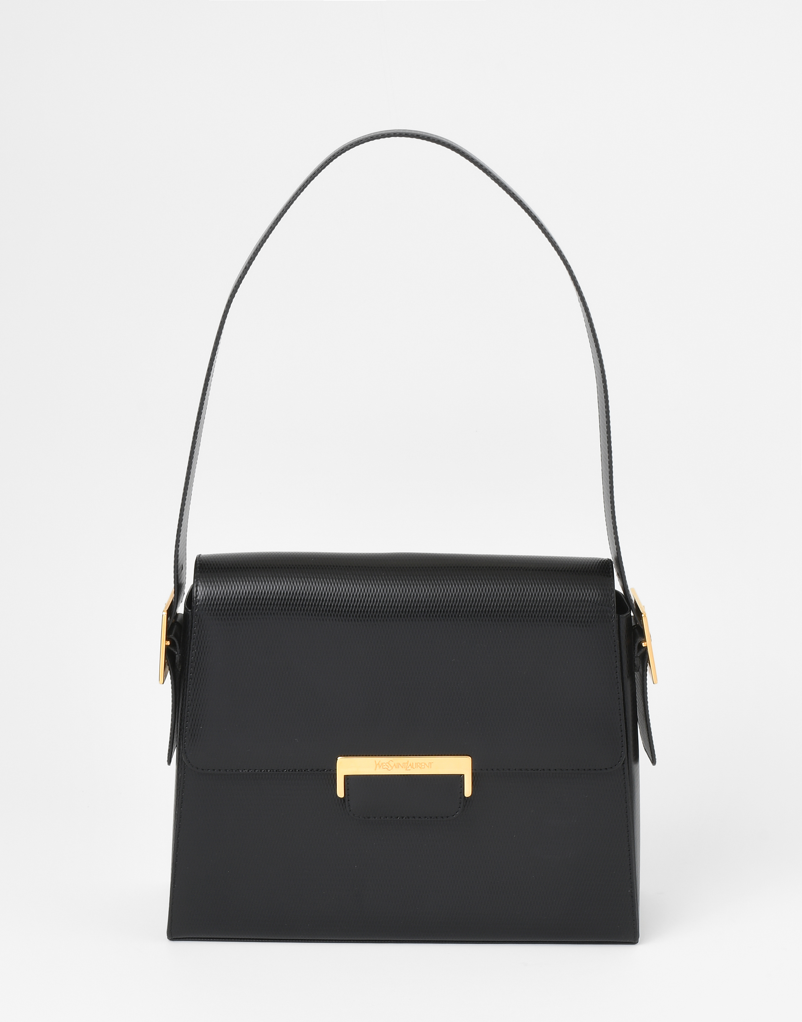 Wohl aus dem Jahr 1998. Aus schwarzem PVC-Stoff. Henkel. Goldfarbene Metallapplikationen. Magnetverschluss. 28x24x6 cm. Leichte Gebrauchsspuren, sonst guter Zustand.