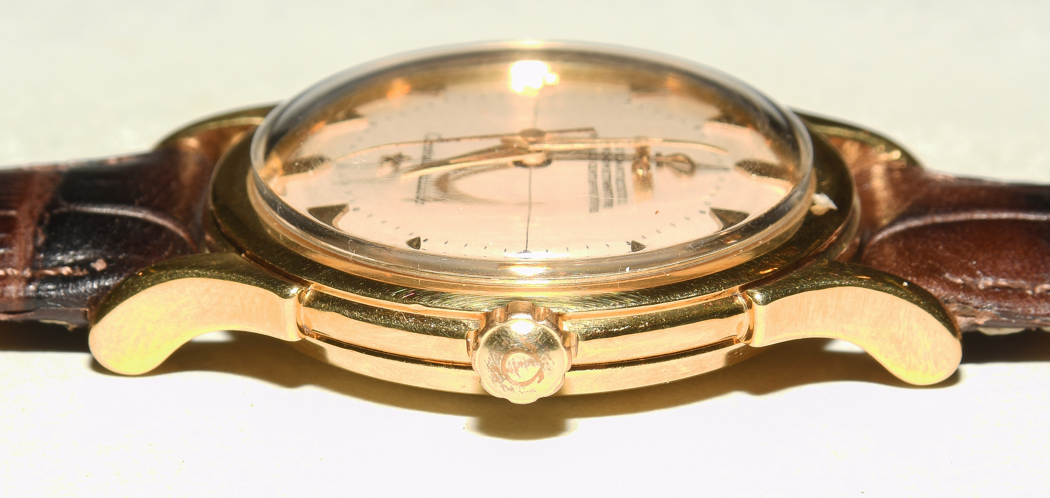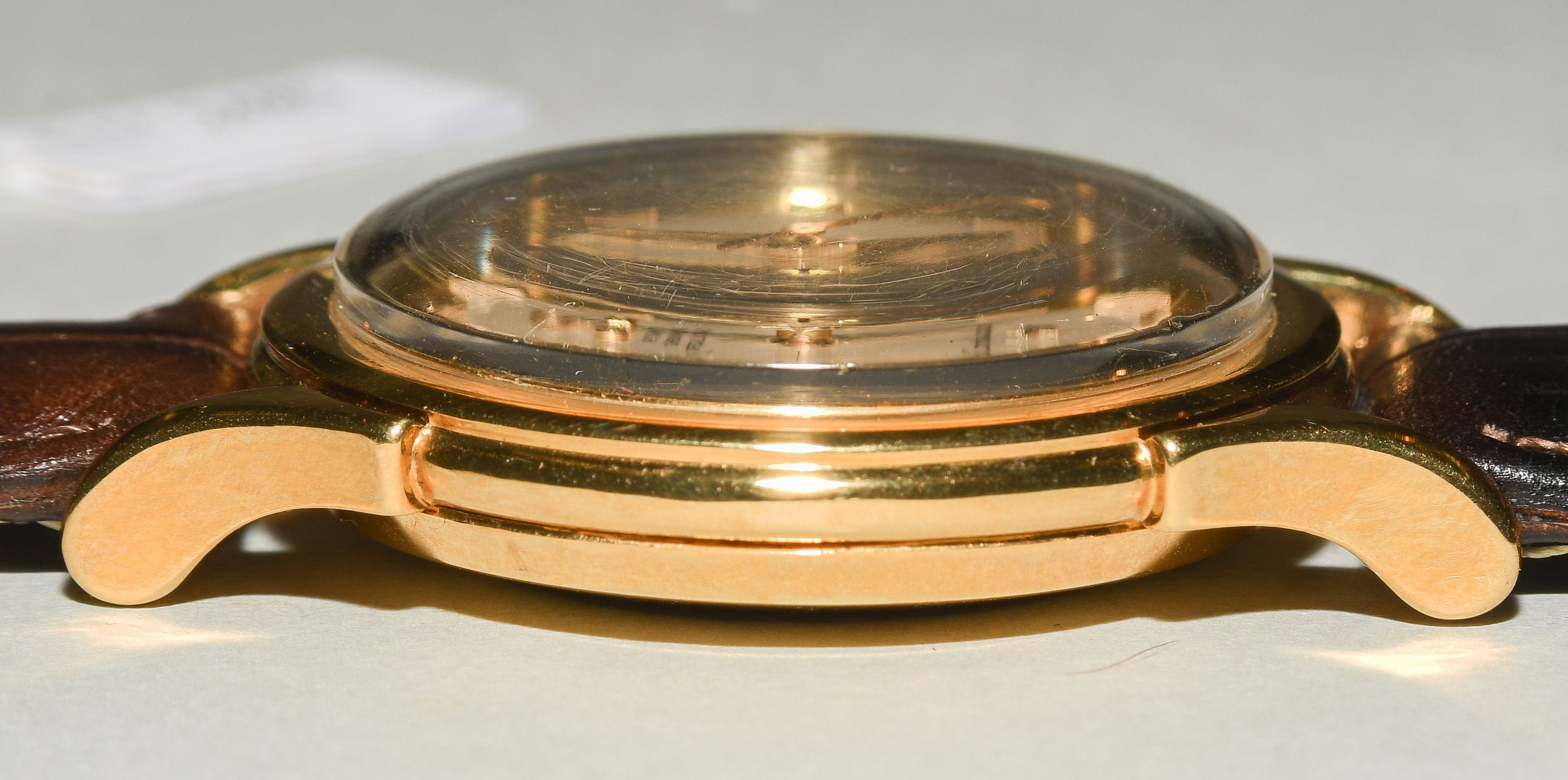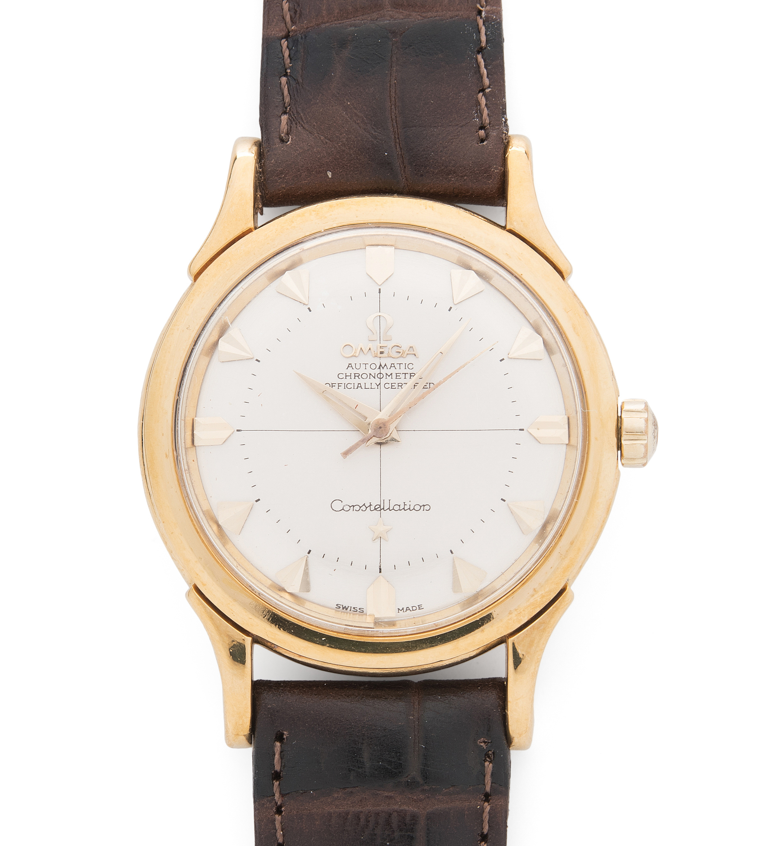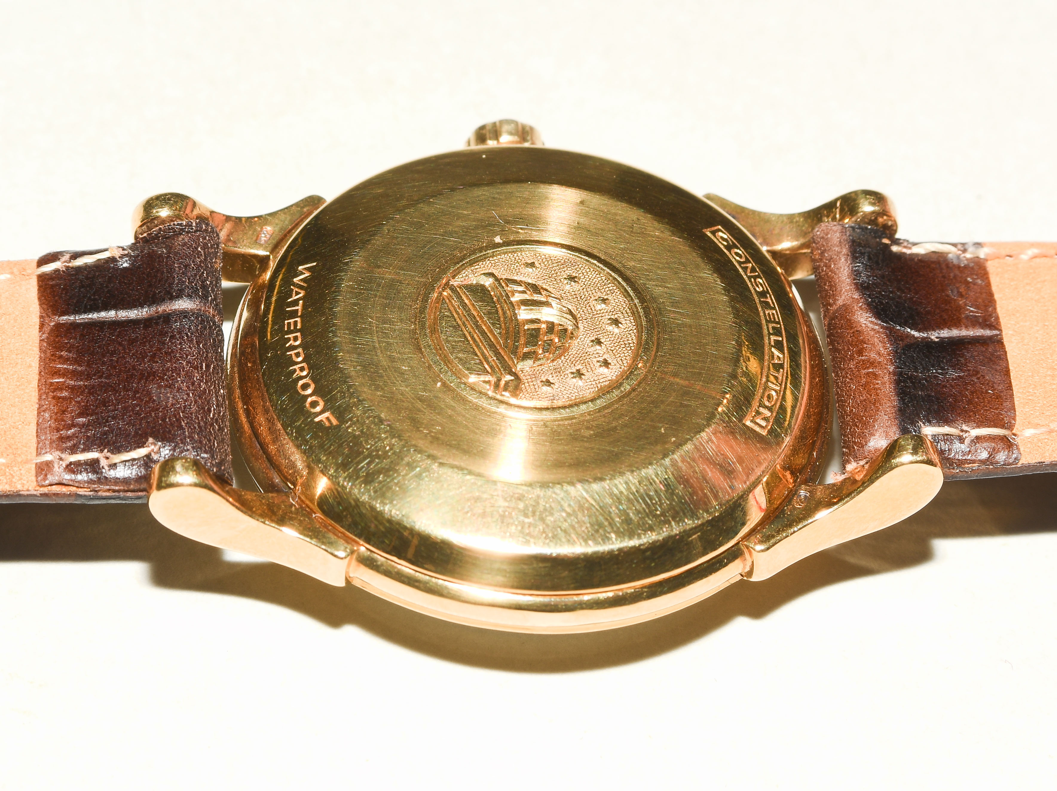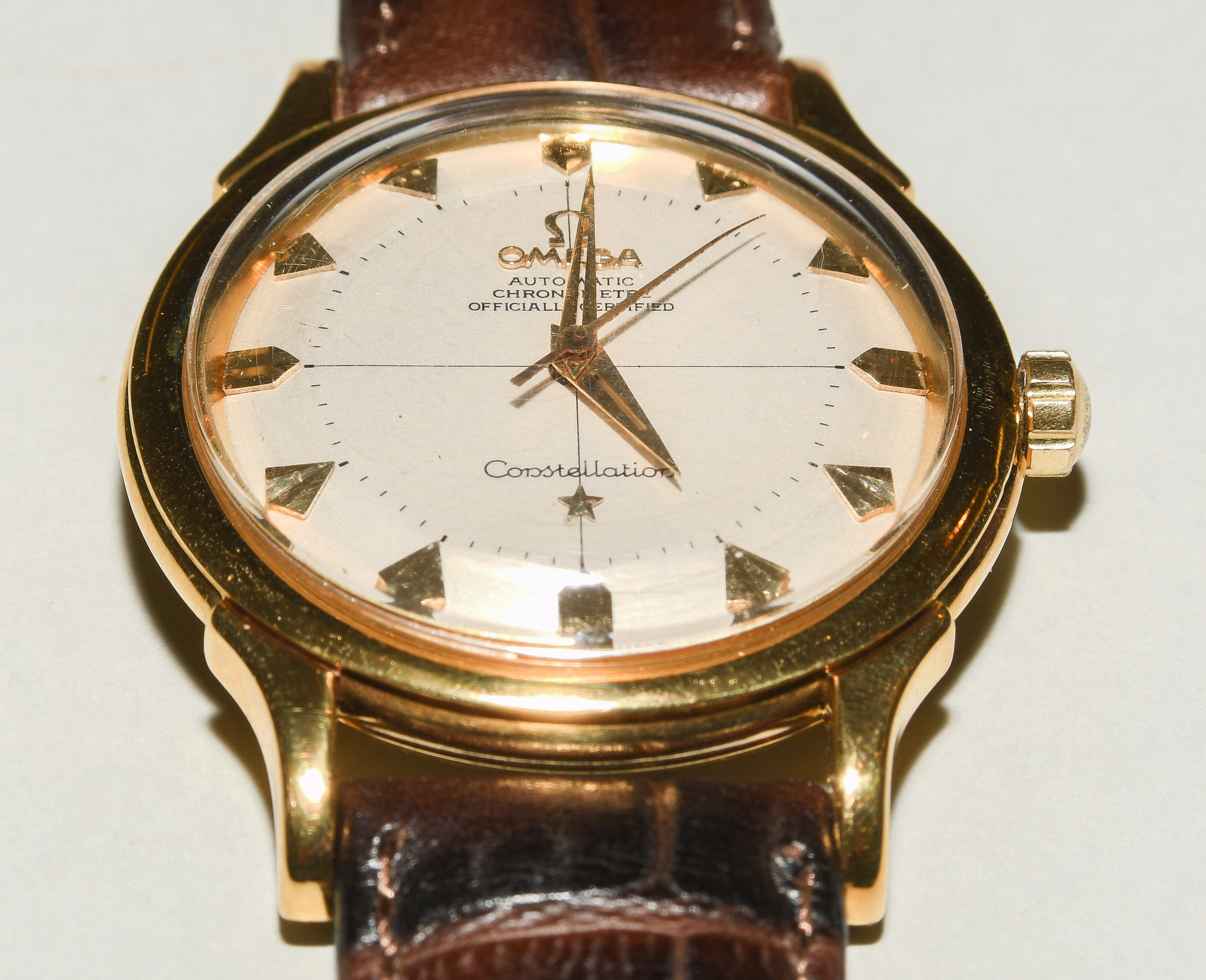 Runder, automatischer Chronometer 1956 in 750 Gelbgoldgehäuse ca 22 g. Boden gedrückt mit Constellationgravur, Werknummer 15347257, Kaliber 505, Gehäusenummer 155207, D 35 mm. Silberfarbenes Zifferblatt mit aufgesetzten Stundenindizes, Dauphine-Zeiger, zentraler Sekundenzeiger. Dunkelbraunes Lederarmband mit Dornschliesse. Box beigegeben. Gebrauchsspuren.