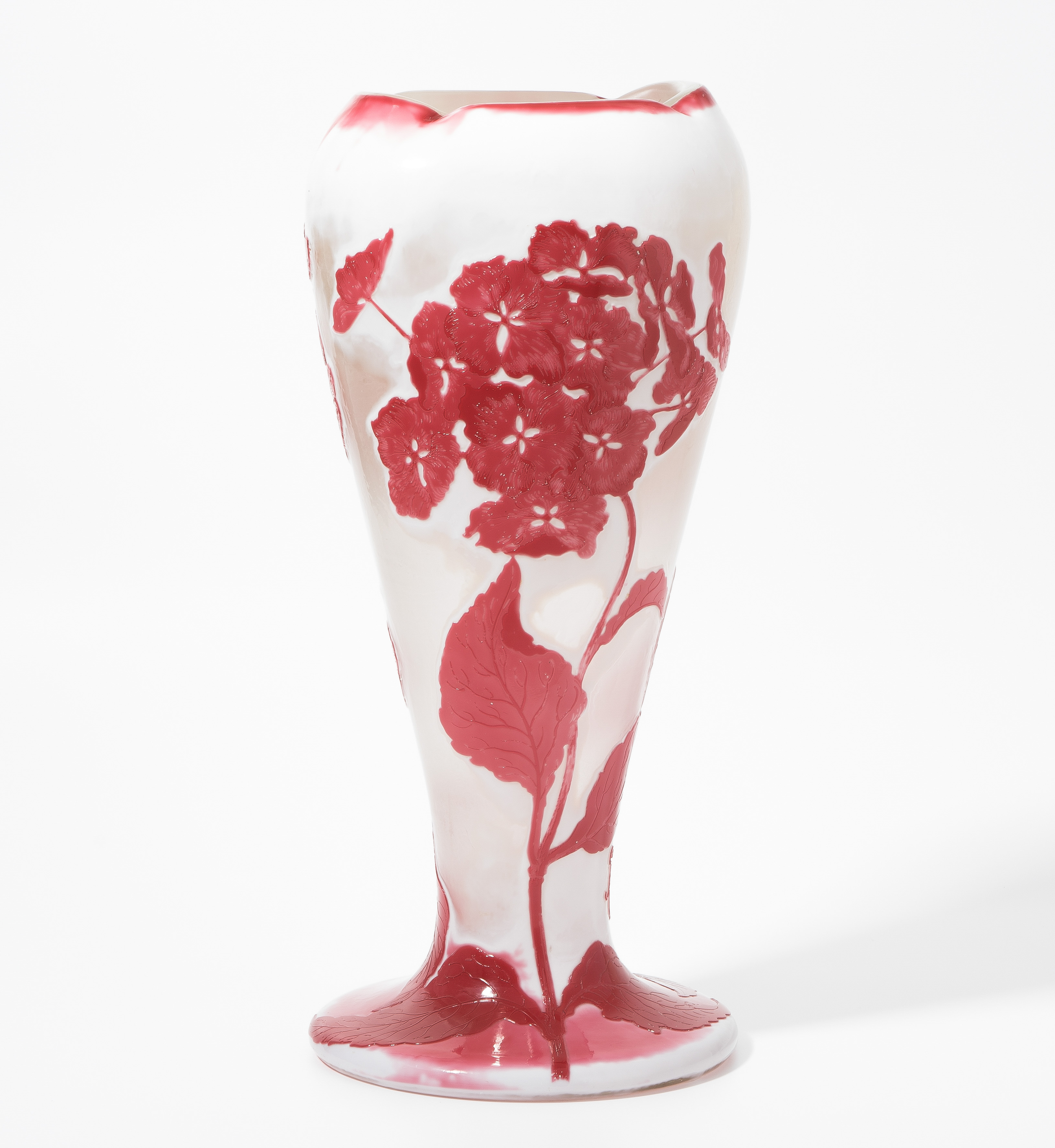 Nancy, um 1900. Vase. Farbloses Glas mit milchigweissen Pulvereinschmelzungen, aussen weiss und rot überfangen, umlaufend reliefiert geätzter Dekor mit Hortensien, feuerpoliert. Bezeichnet: Gallé (hochgeätzt). H 36,5 cm.